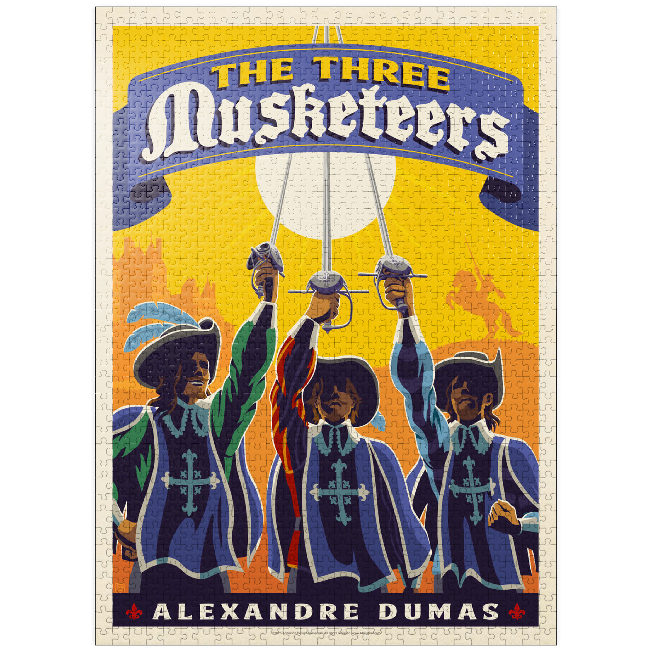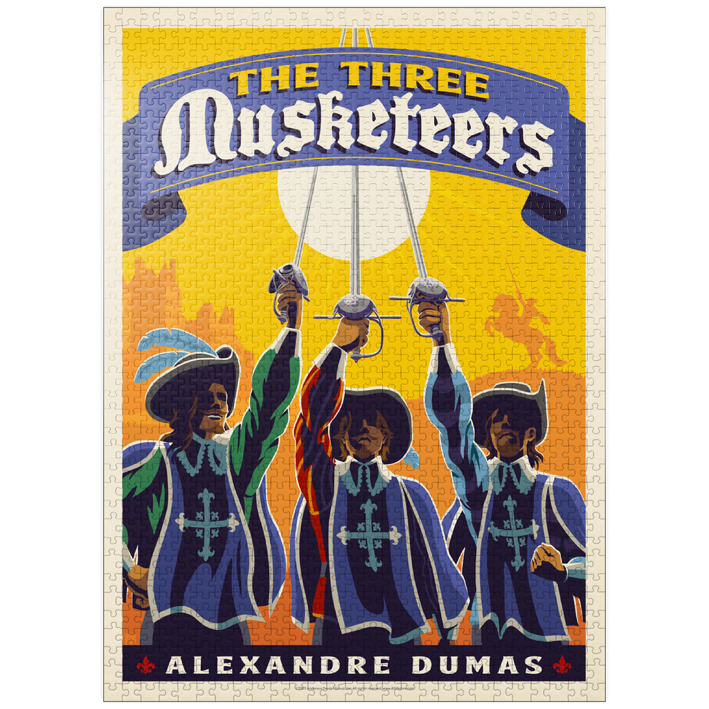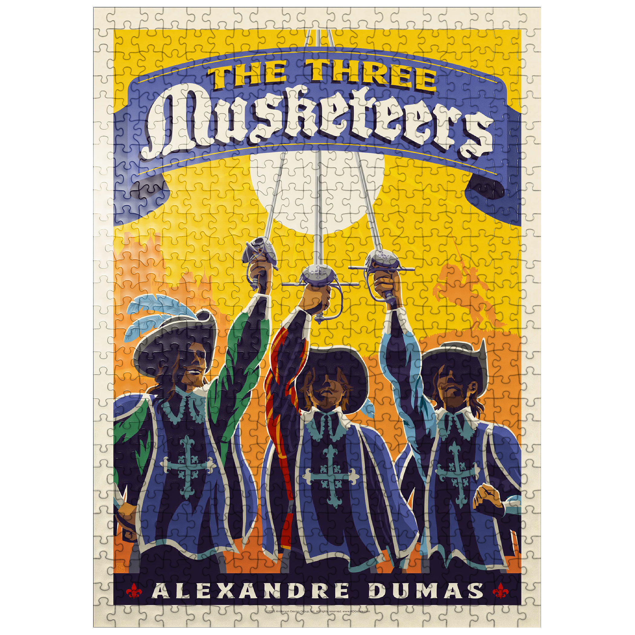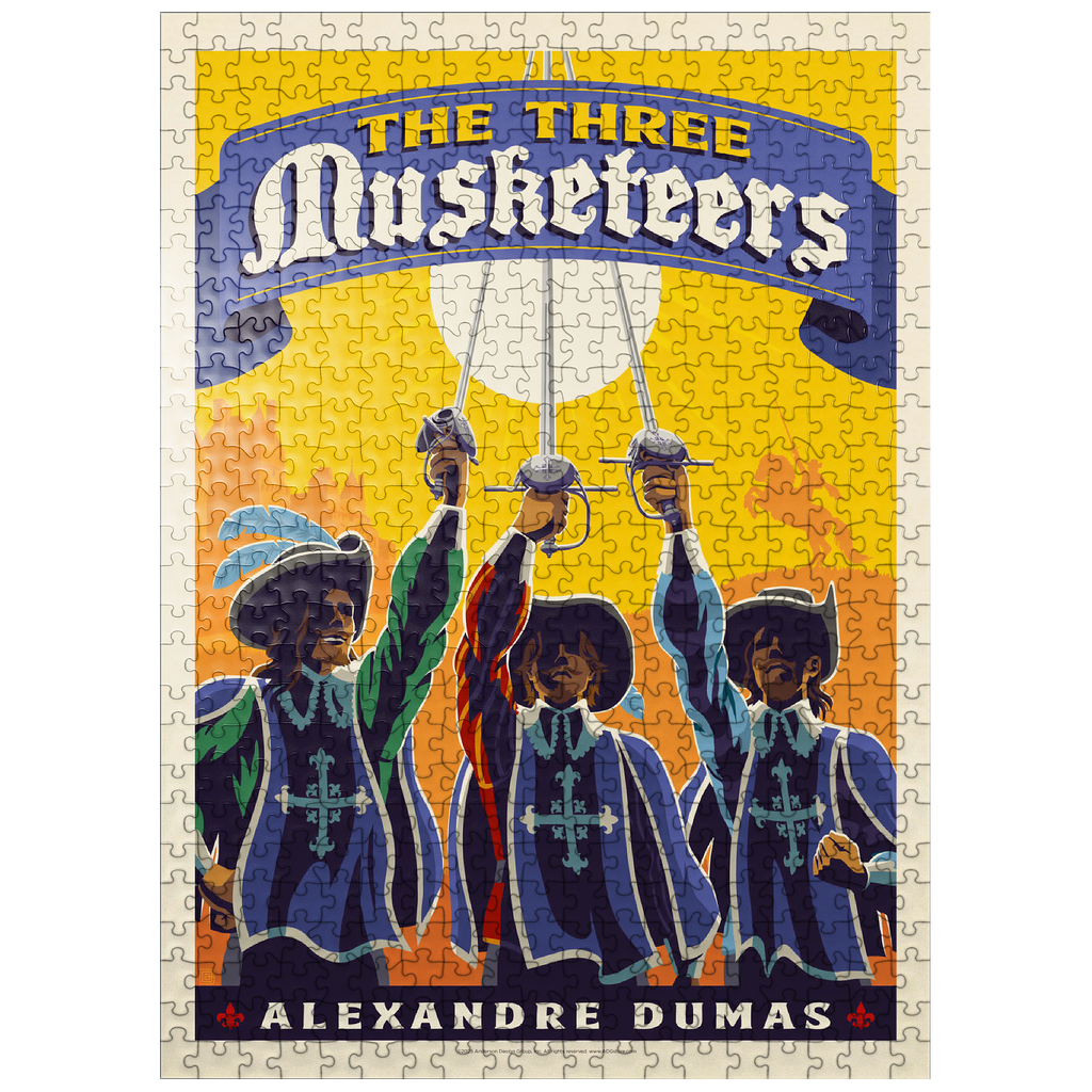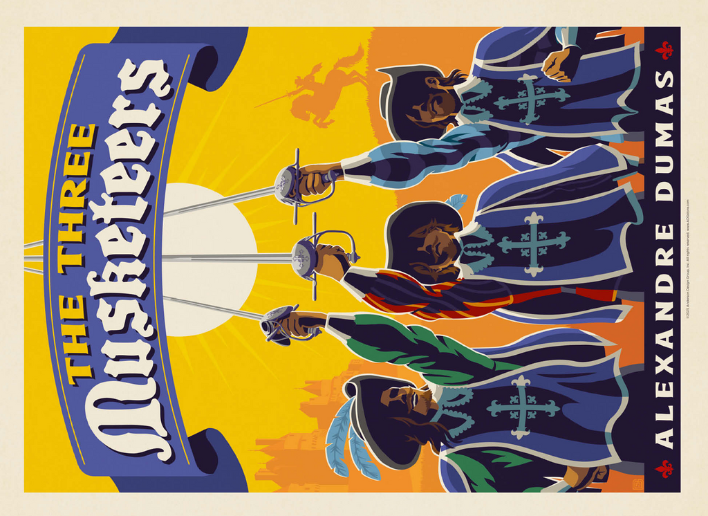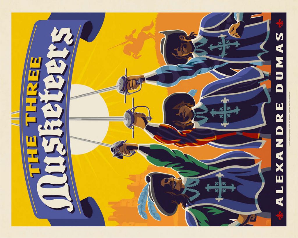 This bold illustration celebrates The Three Musketeers by Alexandre Dumas, depicting the legendary trio with swords raised in unity against a vibrant backdrop. Dressed in classic 17th-century musketeer attire, complete with feathered hats and tabards emblazoned with crosses, the figures represent the spirit of loyalty, bravery, and brotherhood. A radiant sunburst and silhouette of a castle and rider enhance the heroic atmosphere. This dynamic scene captures the timeless call of "All for one, and one for all," making it a perfect tribute for fans of historical adventure and classic literature.
