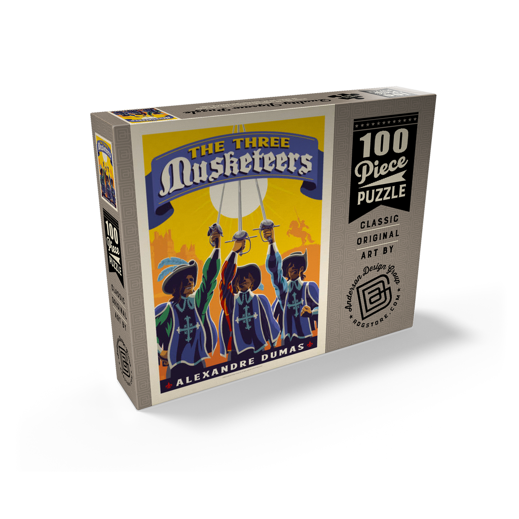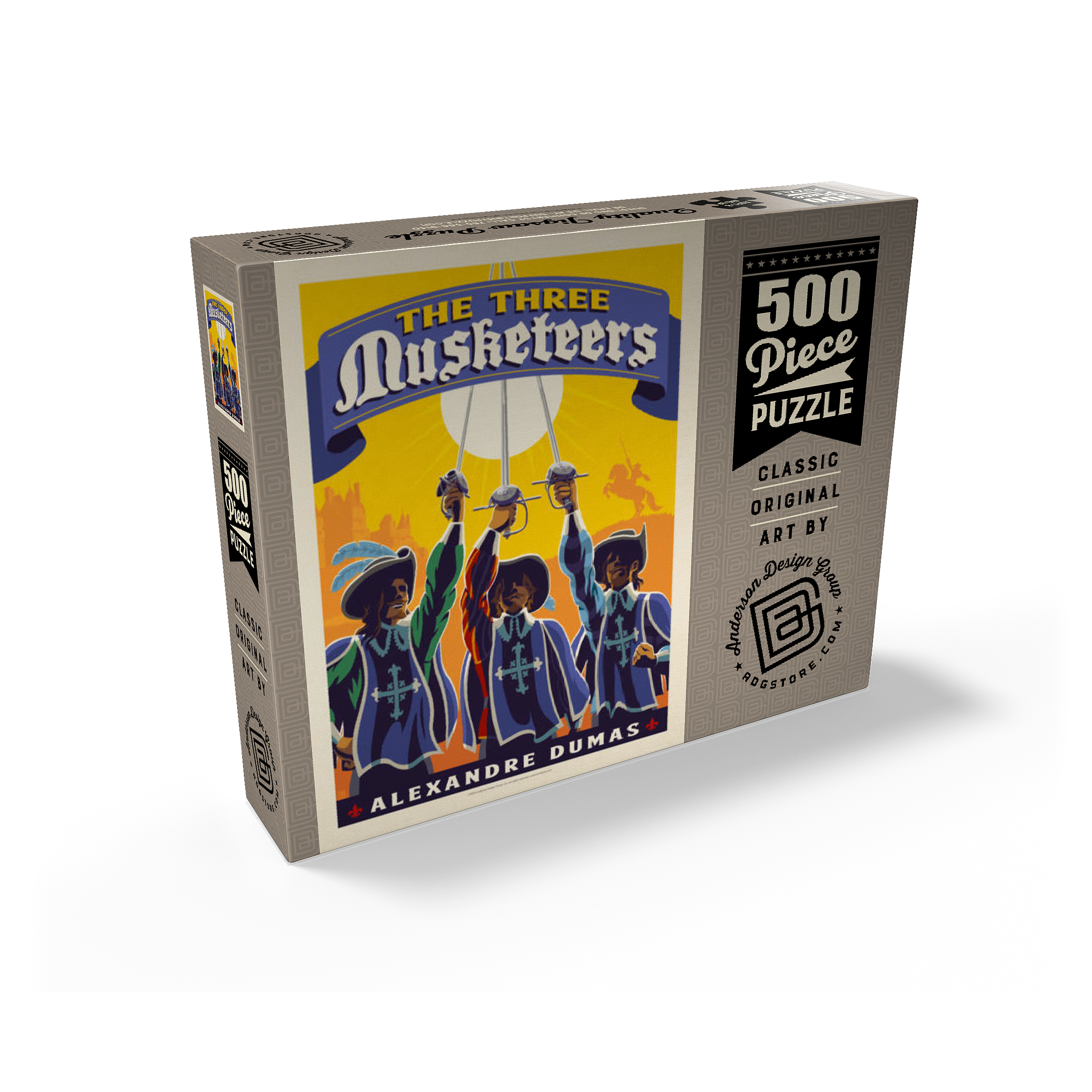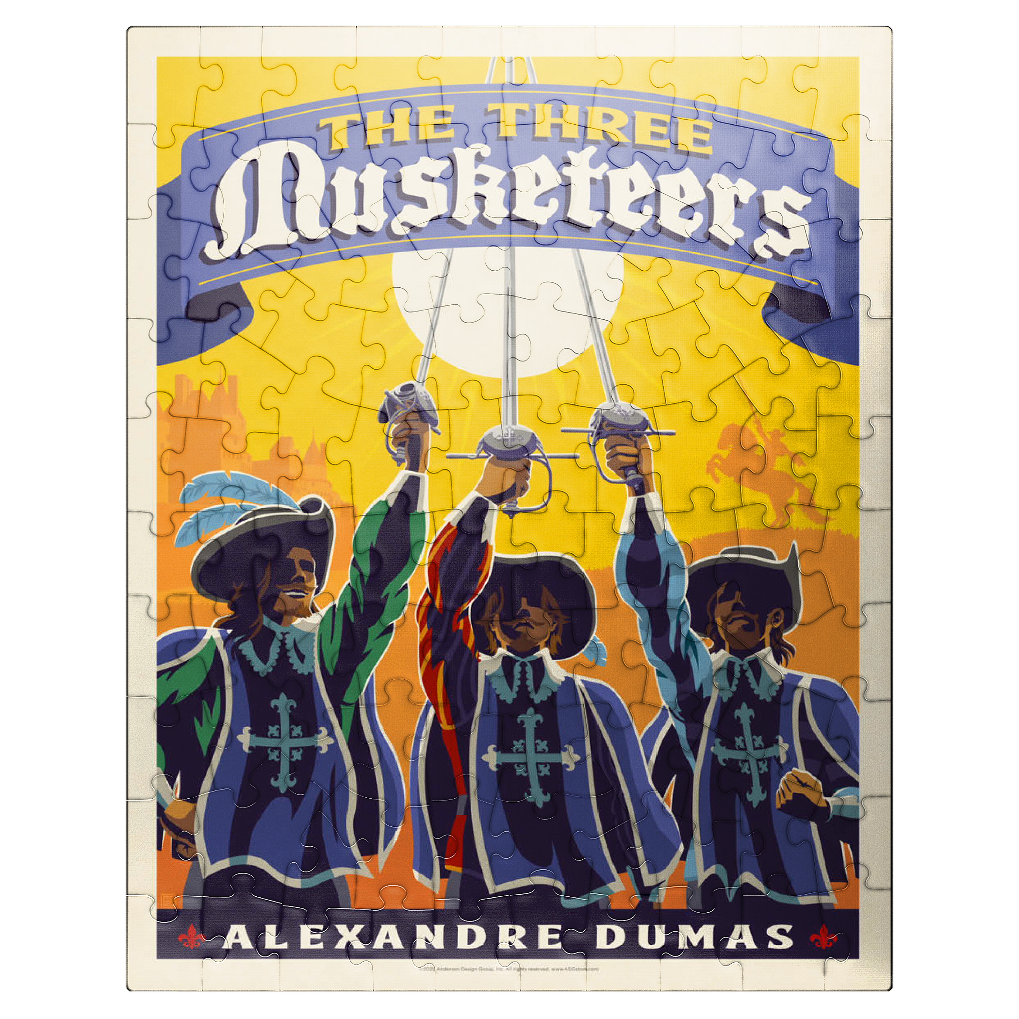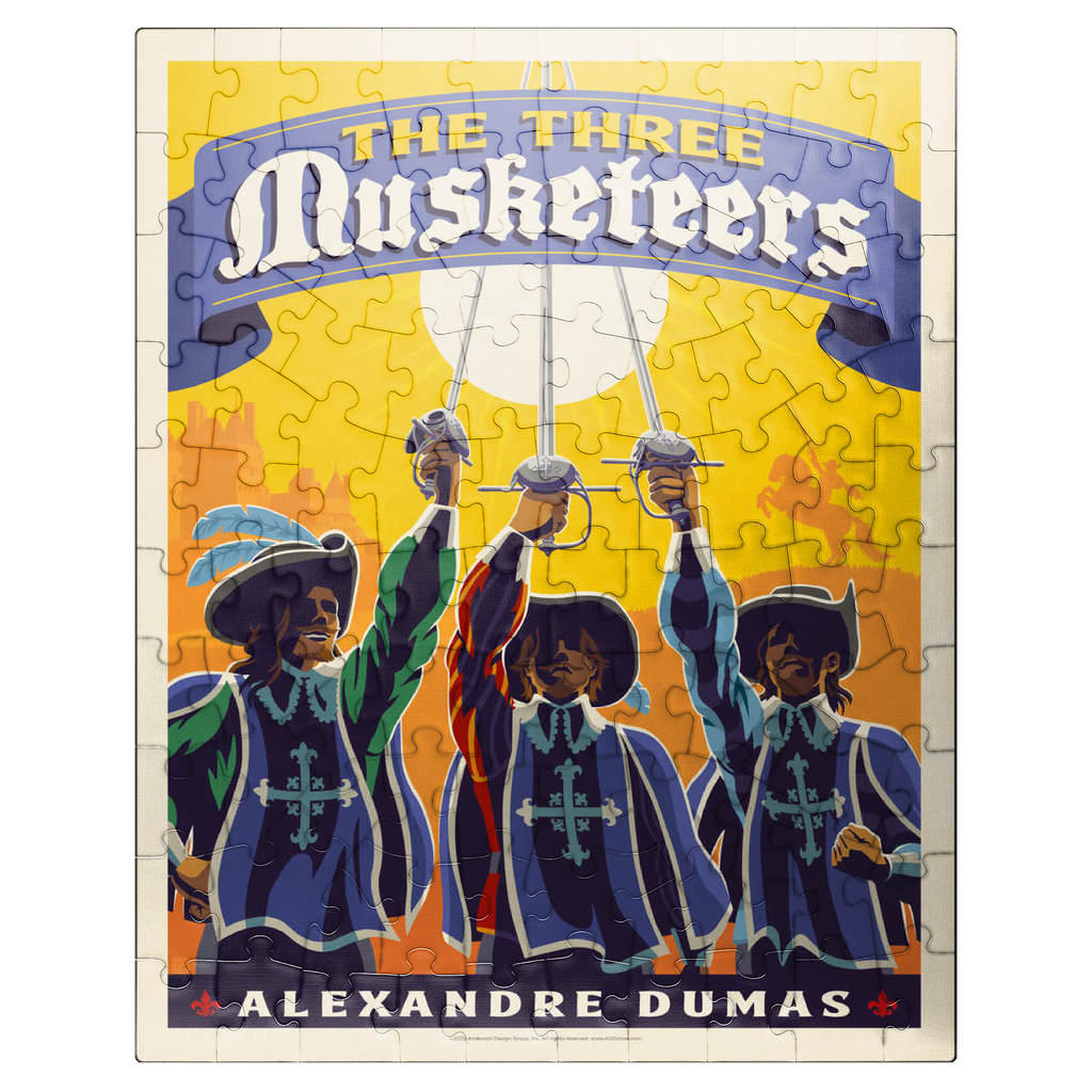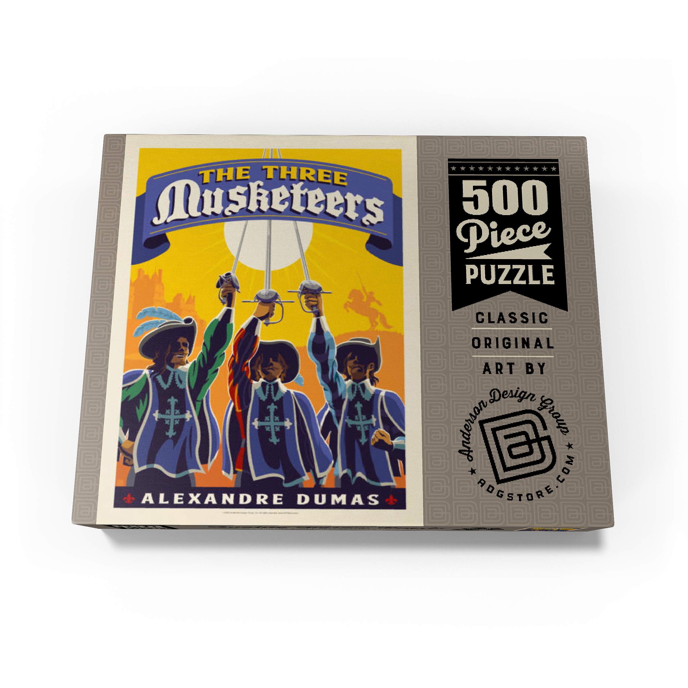 This bold illustration celebrates The Three Musketeers by Alexandre Dumas, depicting the legendary trio with swords raised in unity against a vibrant backdrop. Dressed in classic 17th-century musketeer attire, complete with feathered hats and tabards emblazoned with crosses, the figures represent the spirit of loyalty, bravery, and brotherhood. A radiant sunburst and silhouette of a castle and rider enhance the heroic atmosphere. This dynamic scene captures the timeless call of "All for one, and one for all," making it a perfect tribute for fans of historical adventure and classic literature.