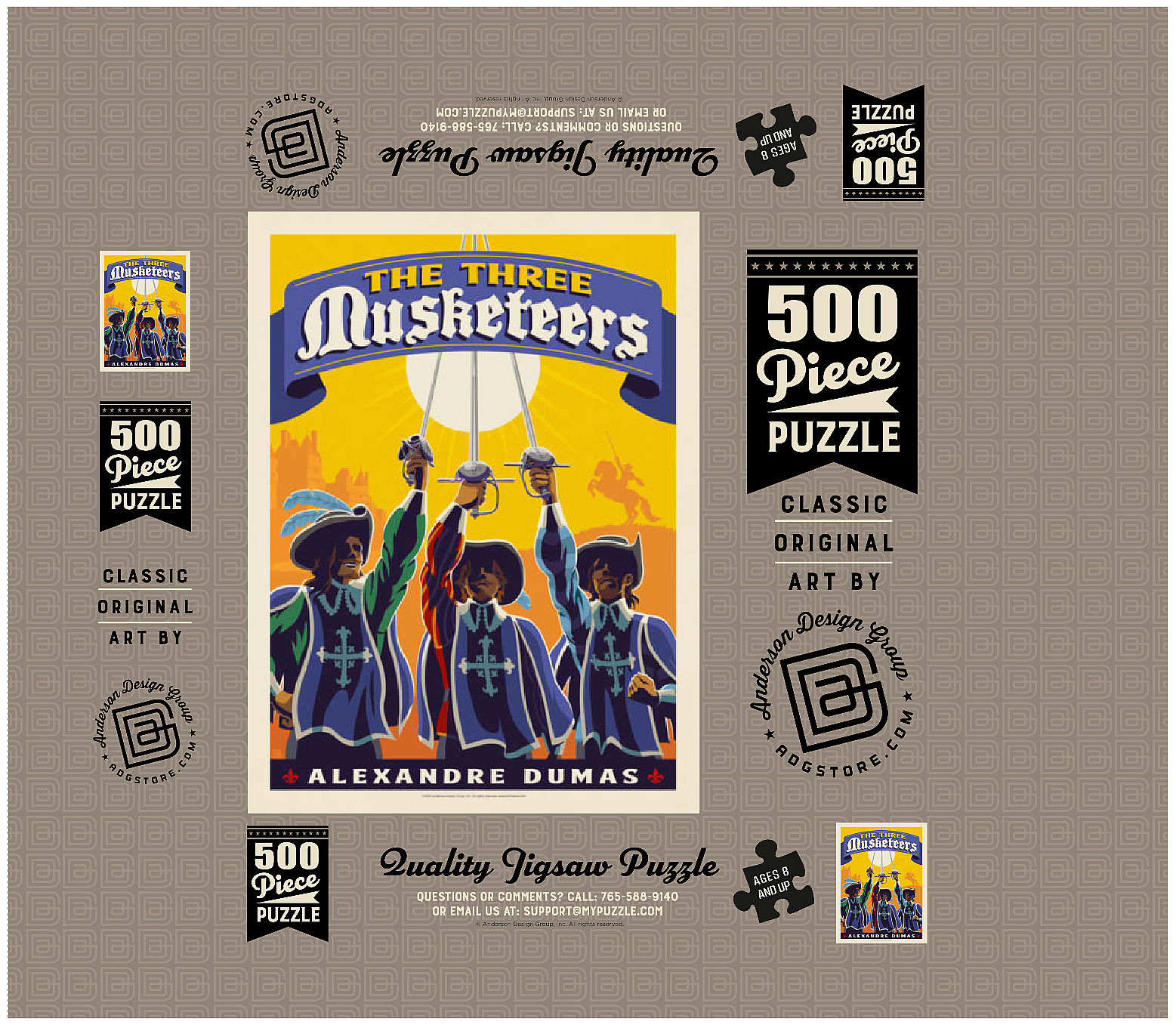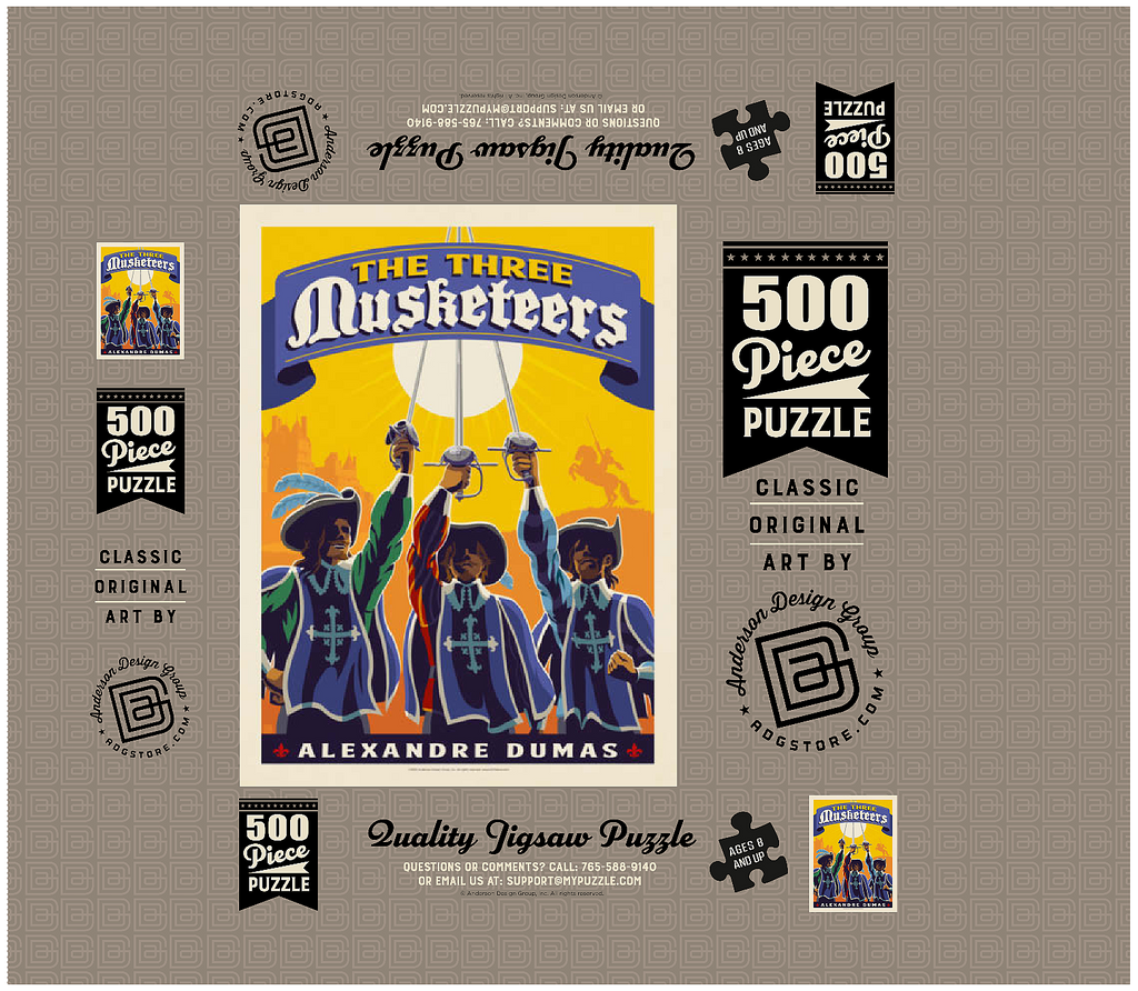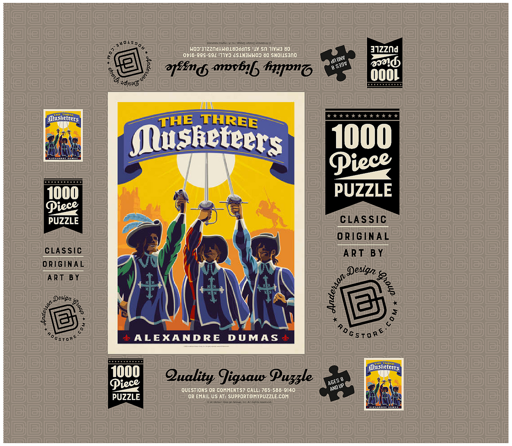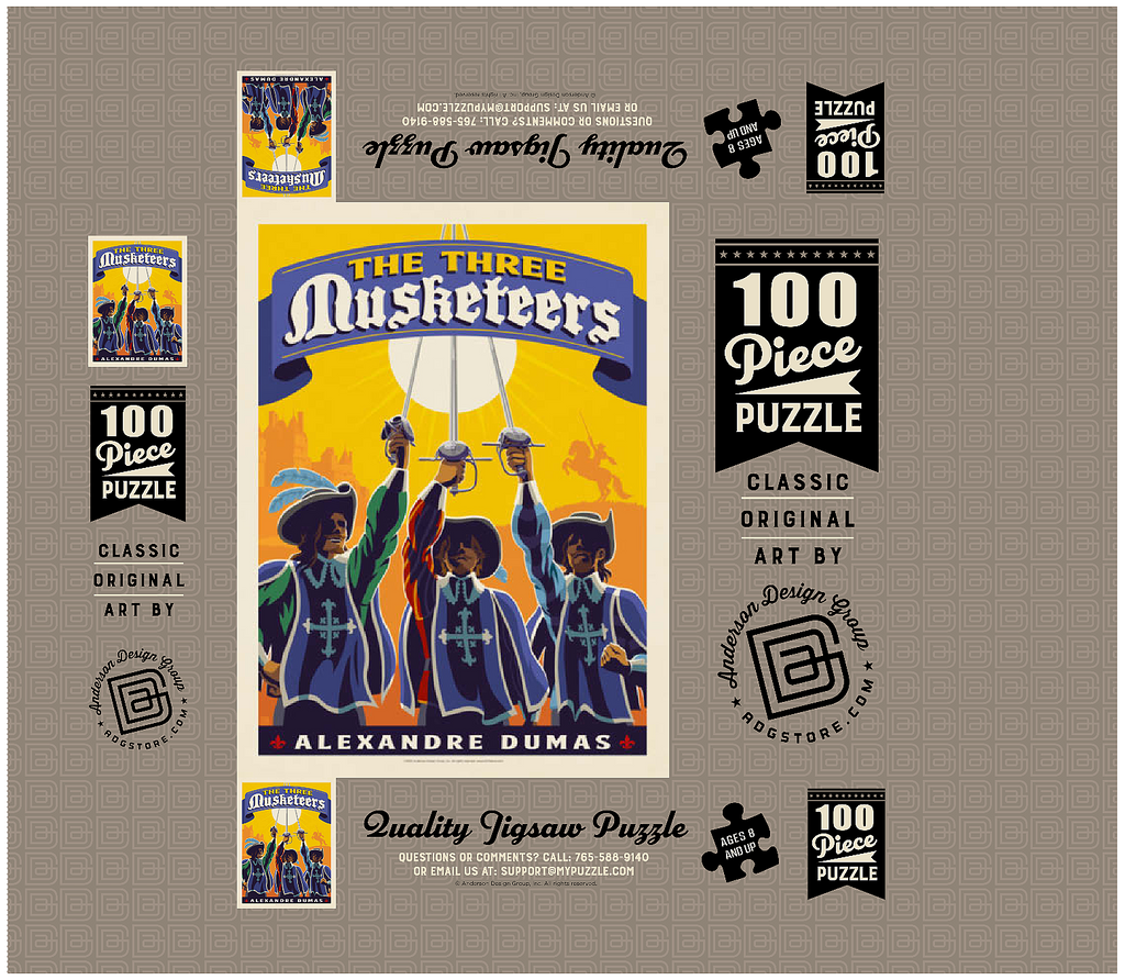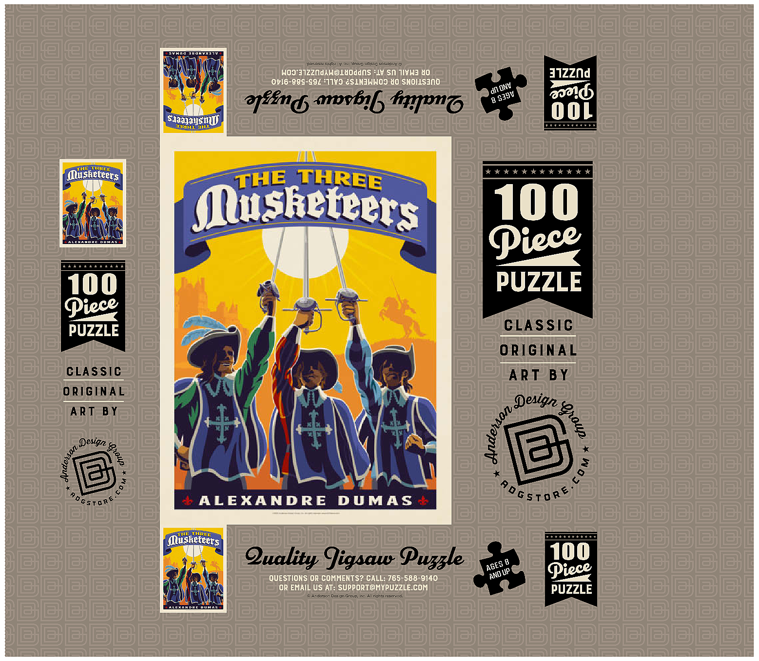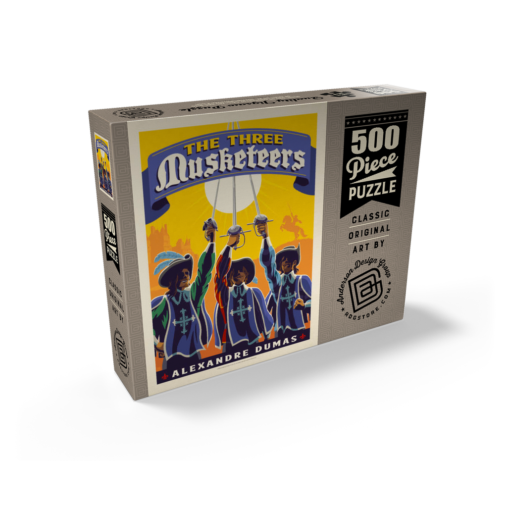 This bold illustration celebrates The Three Musketeers by Alexandre Dumas, depicting the legendary trio with swords raised in unity against a vibrant backdrop. Dressed in classic 17th-century musketeer attire, complete with feathered hats and tabards emblazoned with crosses, the figures represent the spirit of loyalty, bravery, and brotherhood. A radiant sunburst and silhouette of a castle and rider enhance the heroic atmosphere. This dynamic scene captures the timeless call of "All for one, and one for all," making it a perfect tribute for fans of historical adventure and classic literature.