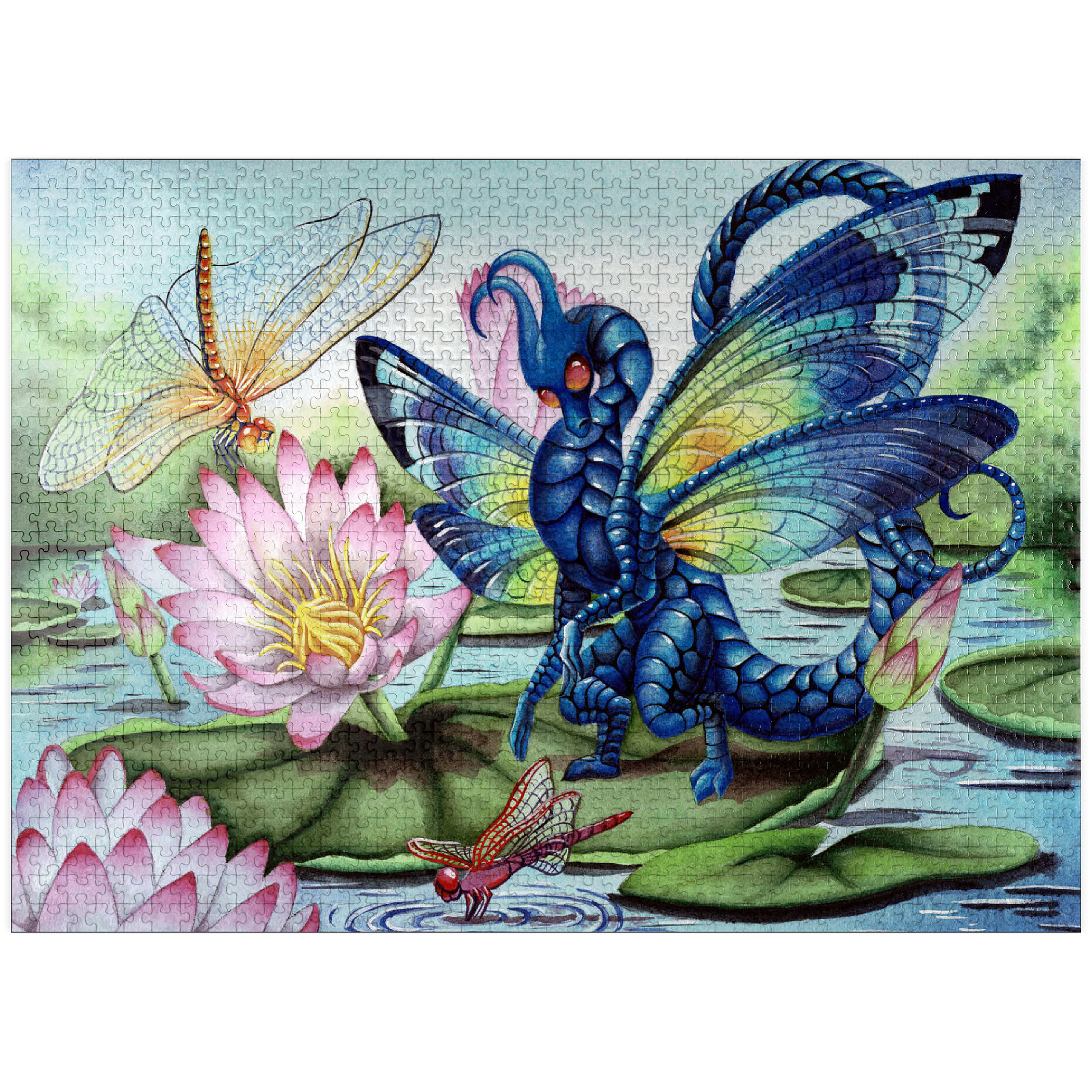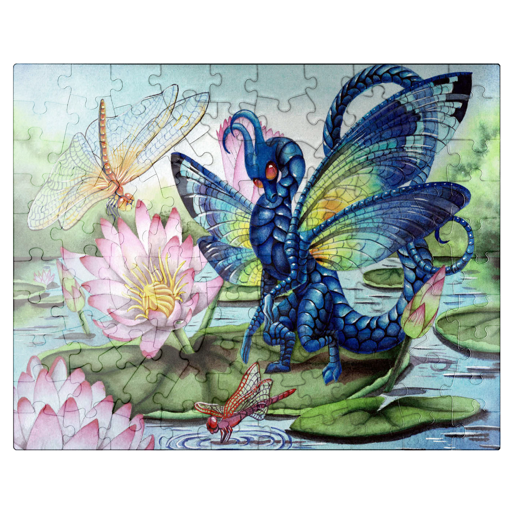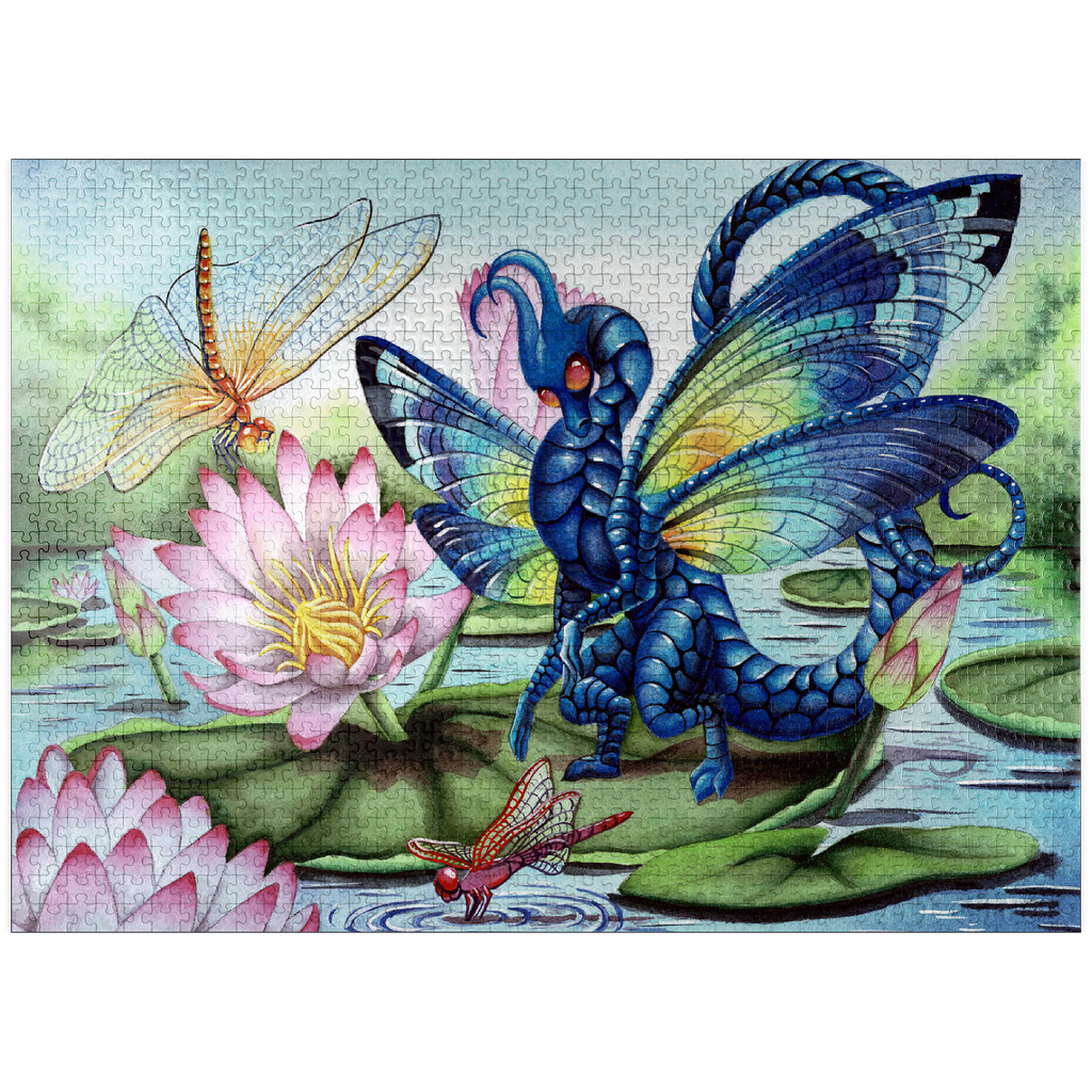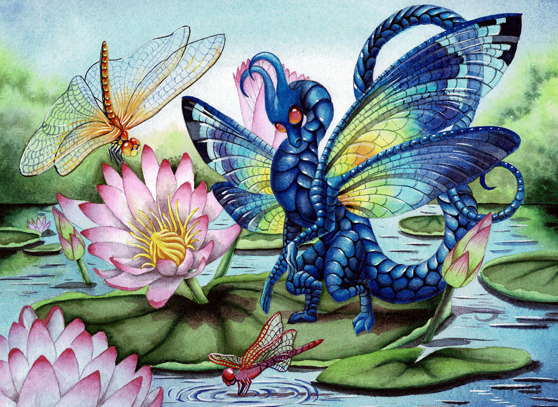 A fae dragon lands on a lily pad, its dragonfly wings gleaming with luminescent with a rainbow of hues, catching the light like precious gemstones. Beneath it, the water gently ripples in the breeze and the air is filled with the buzzing of dragon and mayflies, flitting around like living jewels. The entire scene glows with a quiet, magical beauty-capturing a moment of peace, grace, and the gentle majesty of nature touched by myth.