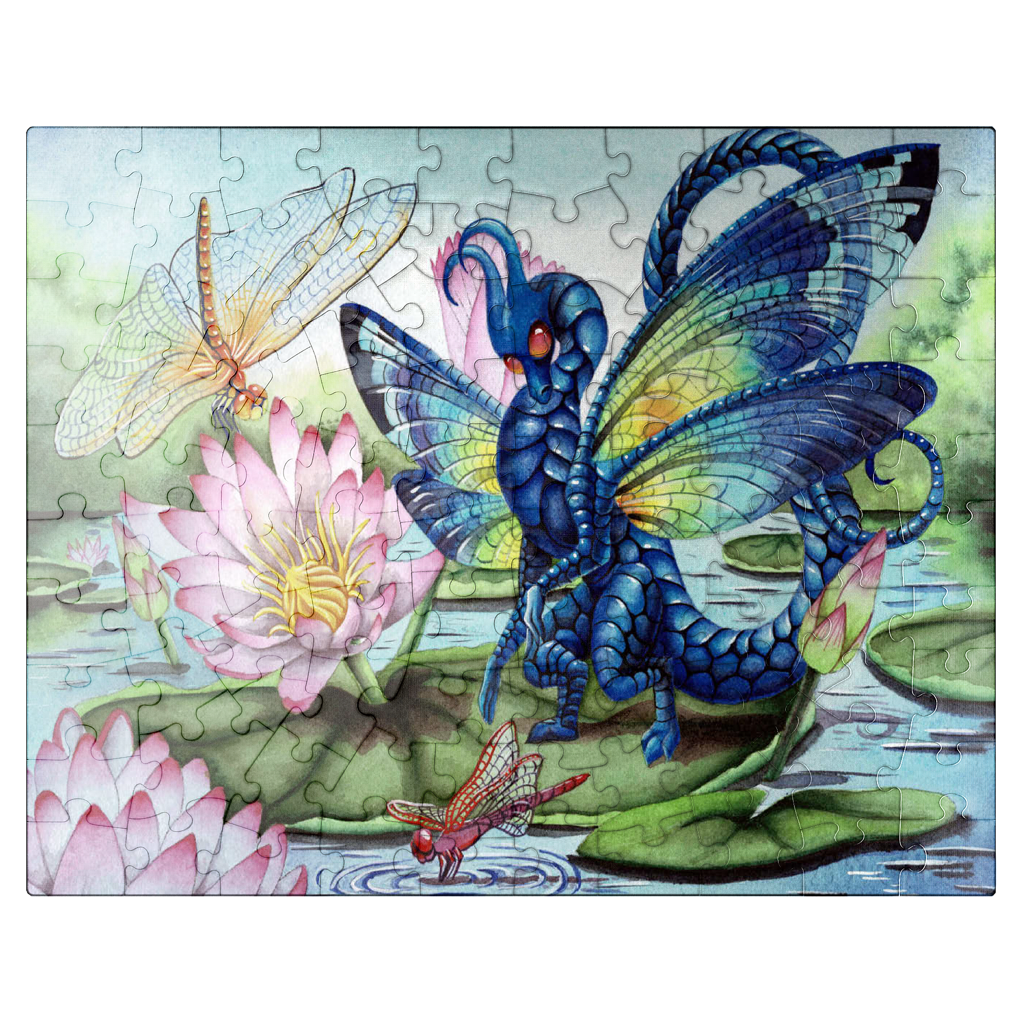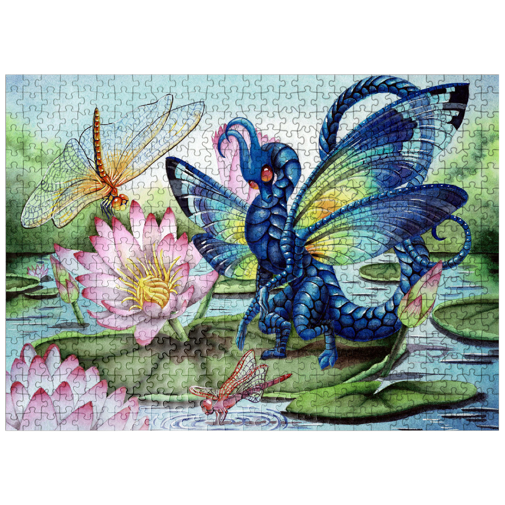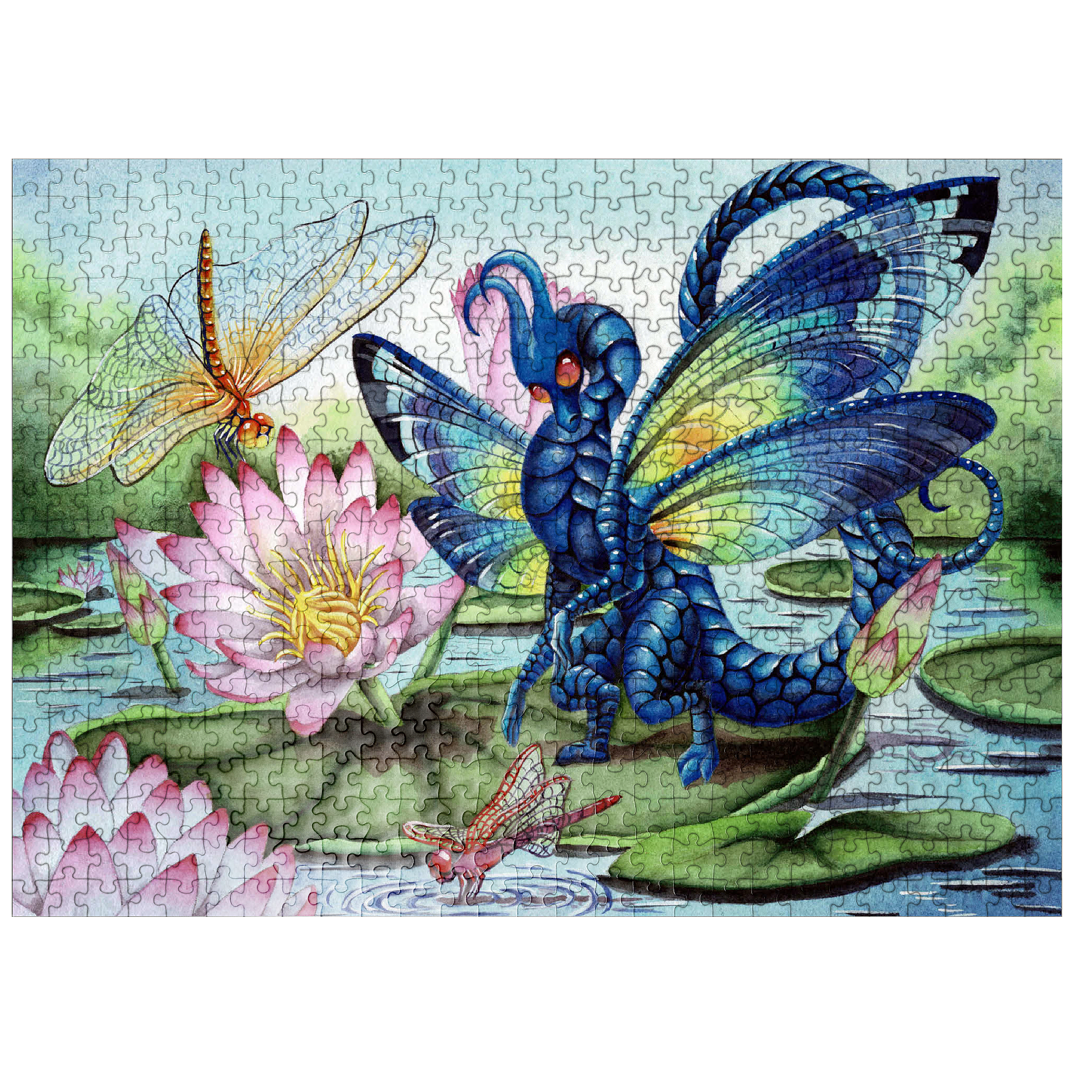 A fae dragon lands on a lily pad, its dragonfly wings gleaming with luminescent with a rainbow of hues, catching the light like precious gemstones. Beneath it, the water gently ripples in the breeze and the air is filled with the buzzing of dragon and mayflies, flitting around like living jewels. The entire scene glows with a quiet, magical beauty-capturing a moment of peace, grace, and the gentle majesty of nature touched by myth.