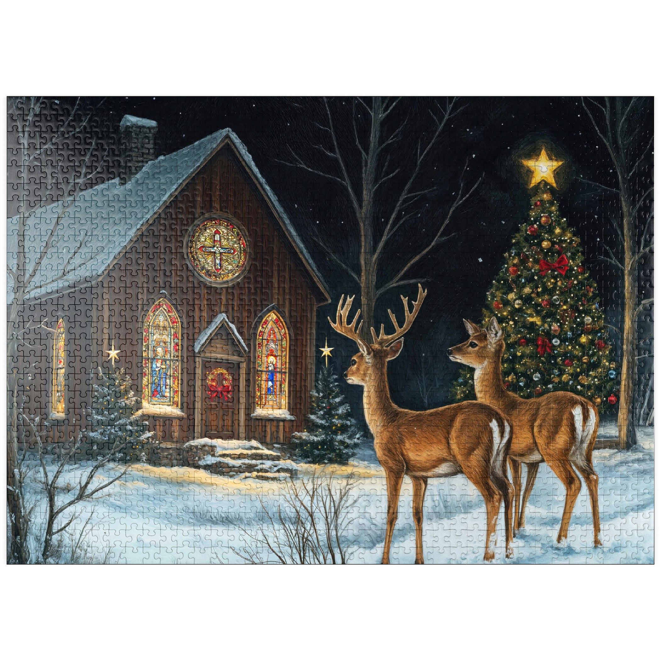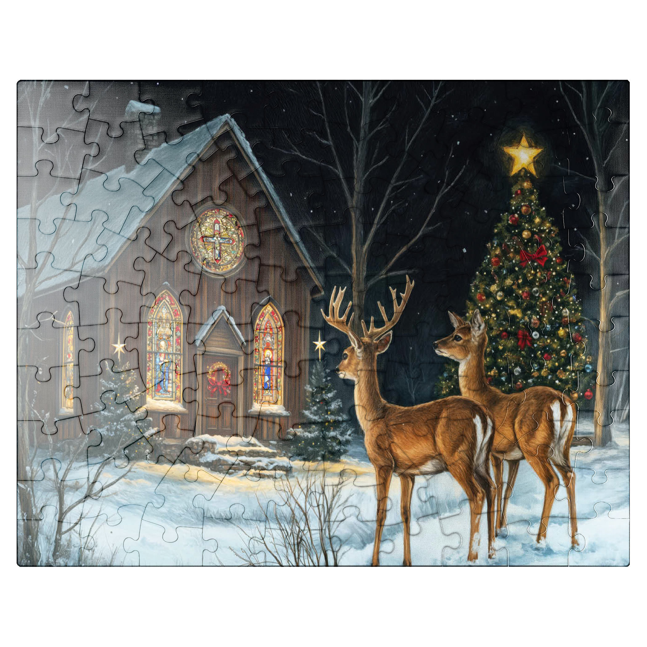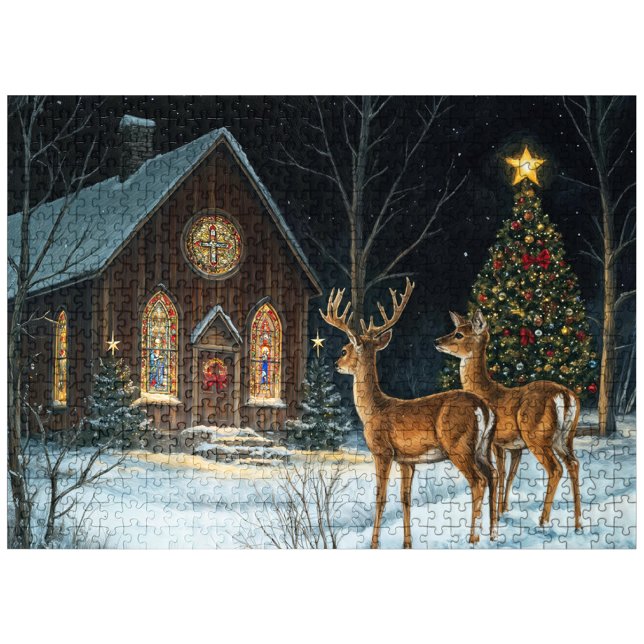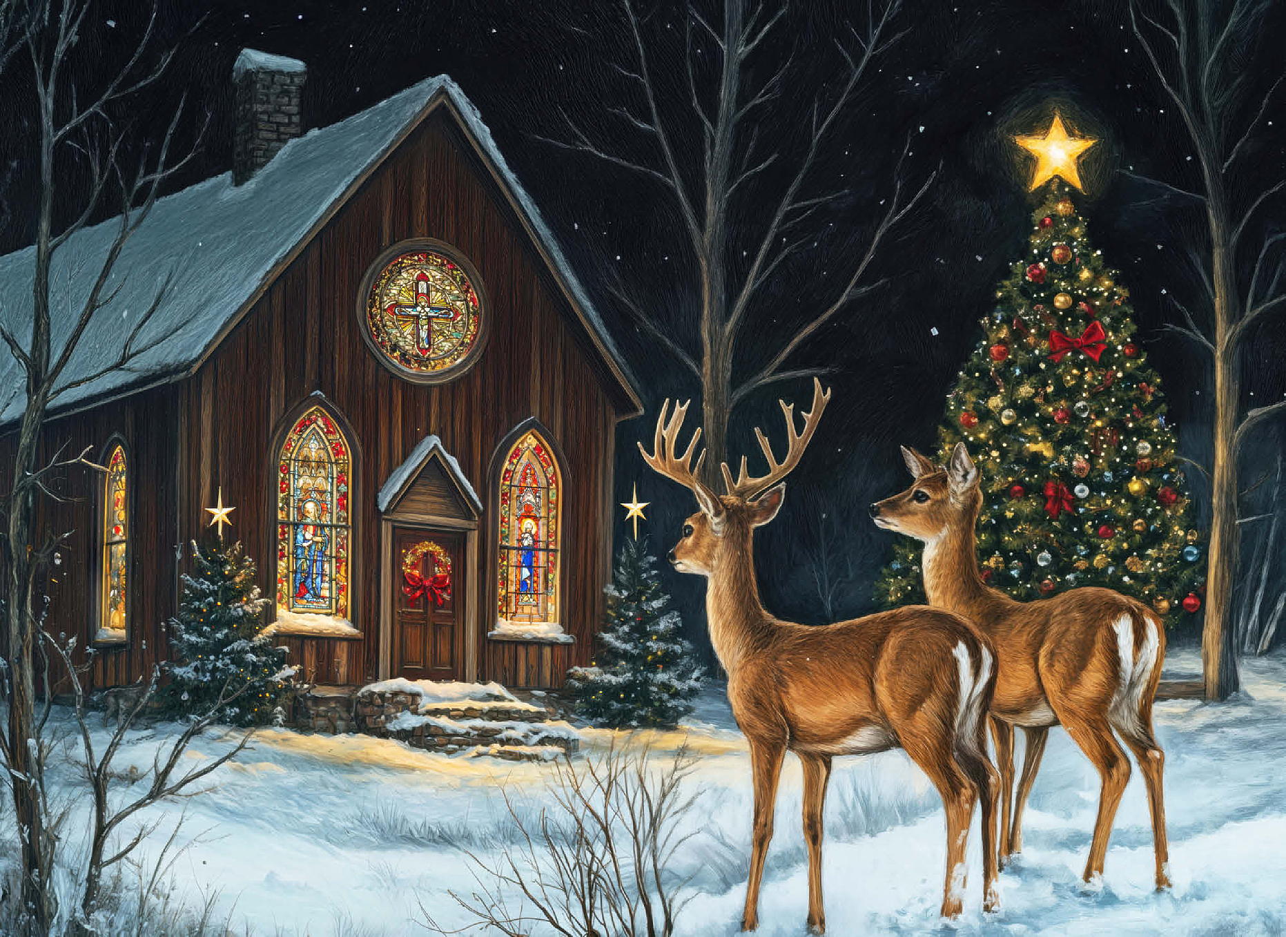 This serene winter scene features two elegant deer standing in the snow outside a beautifully decorated church. The warm glow of the stained glass windows and the twinkling lights of a Christmas tree adorned with ornaments create a peaceful, festive ambiance. The snow-covered ground and starry night sky complete the enchanting holiday atmosphere, capturing the quiet beauty of Christmas in nature.
