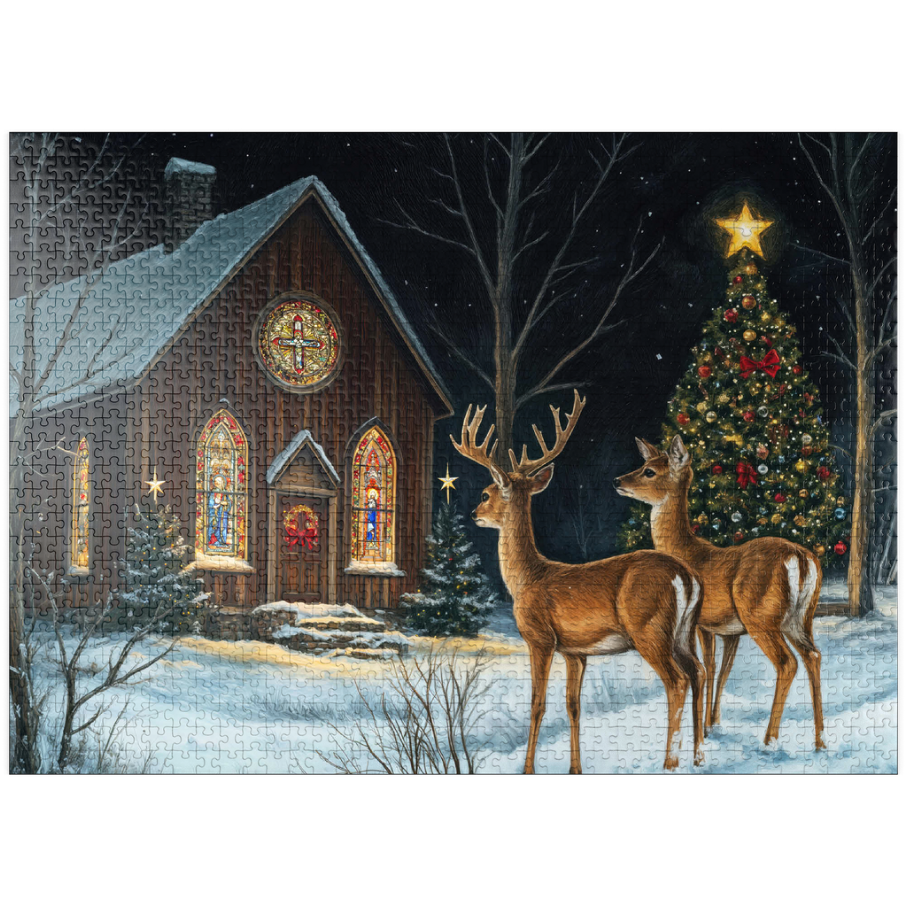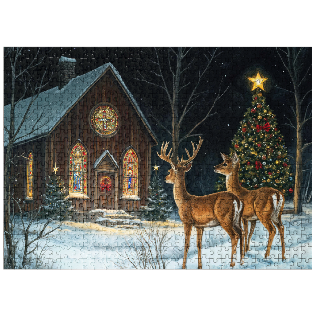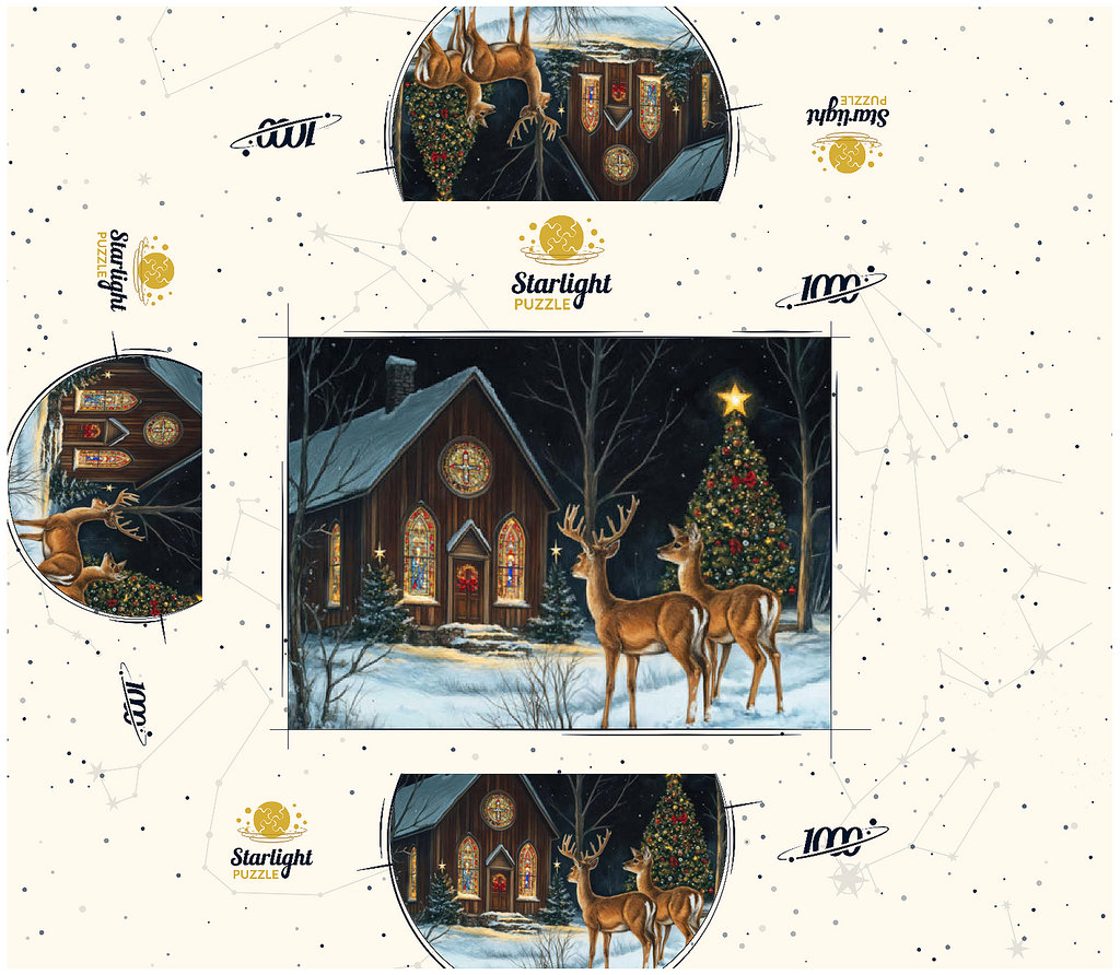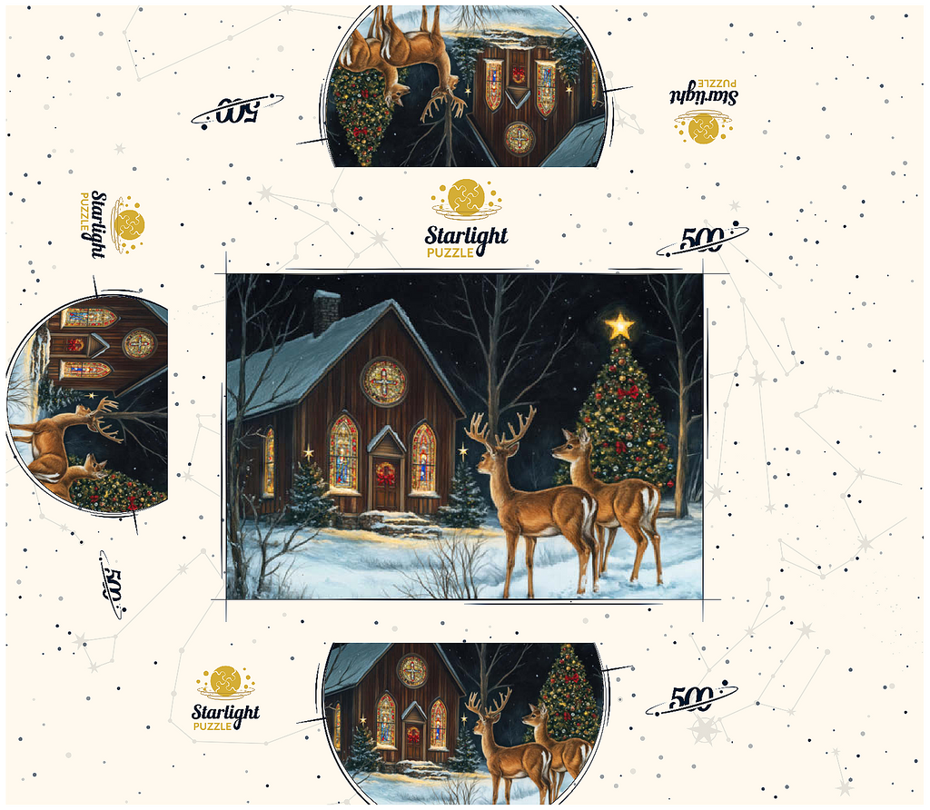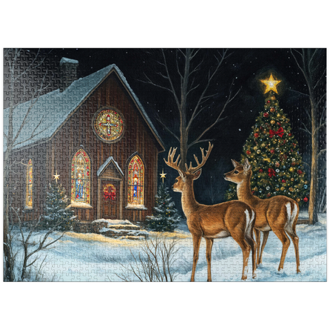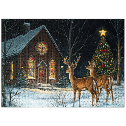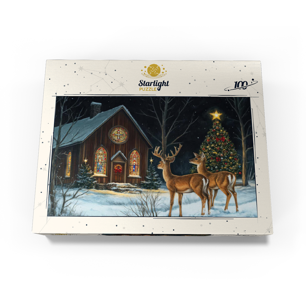 This serene winter scene features two elegant deer standing in the snow outside a beautifully decorated church. The warm glow of the stained glass windows and the twinkling lights of a Christmas tree adorned with ornaments create a peaceful, festive ambiance. The snow-covered ground and starry night sky complete the enchanting holiday atmosphere, capturing the quiet beauty of Christmas in nature.