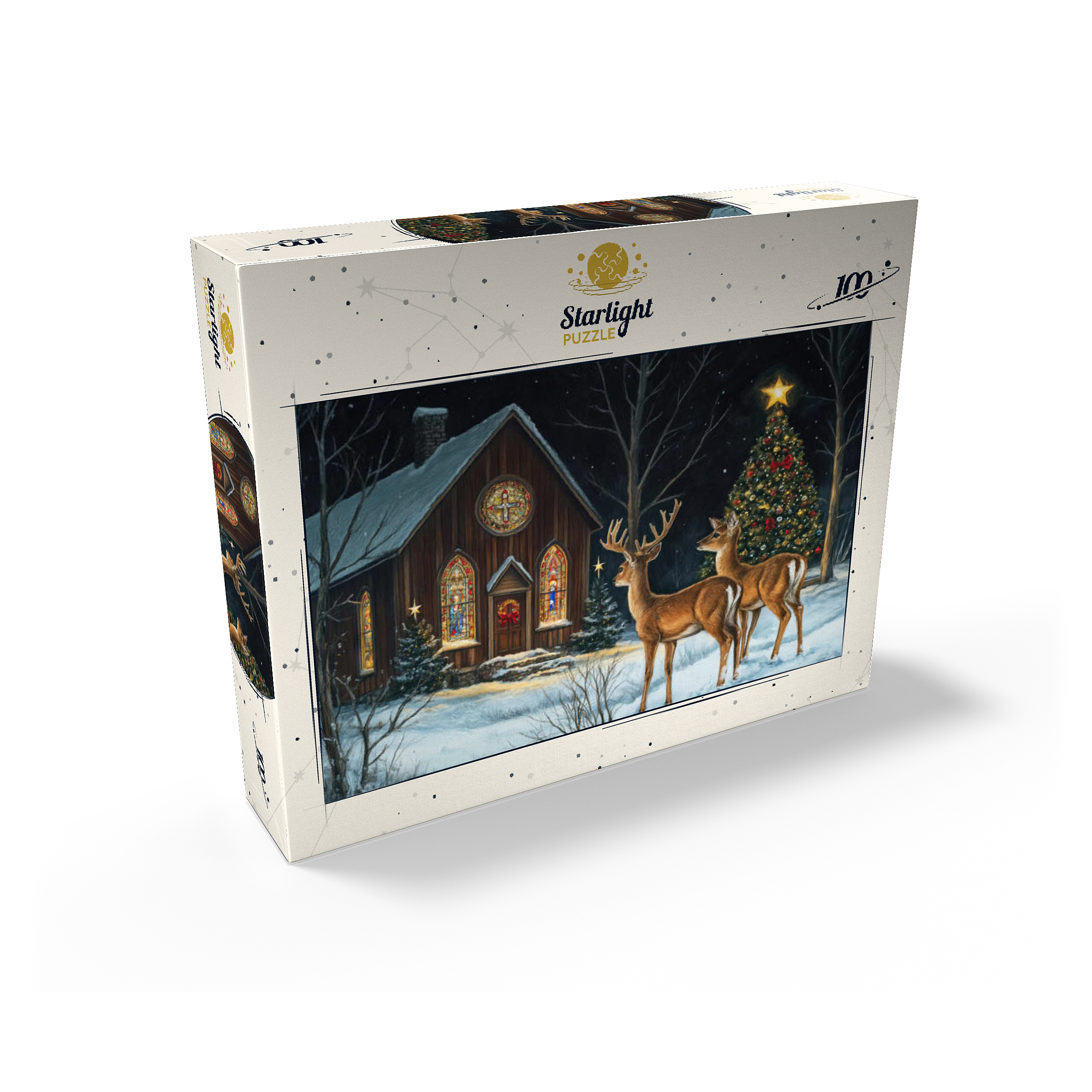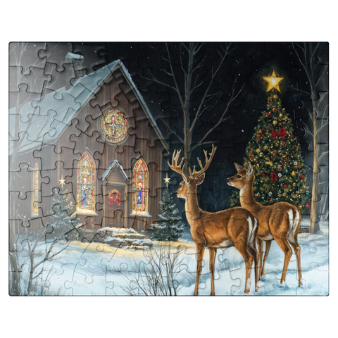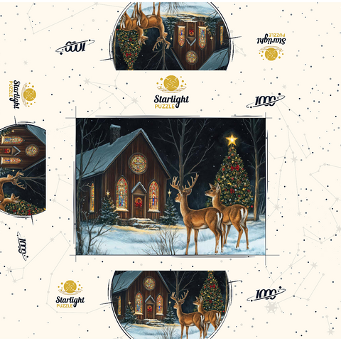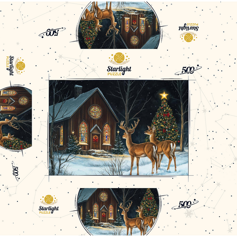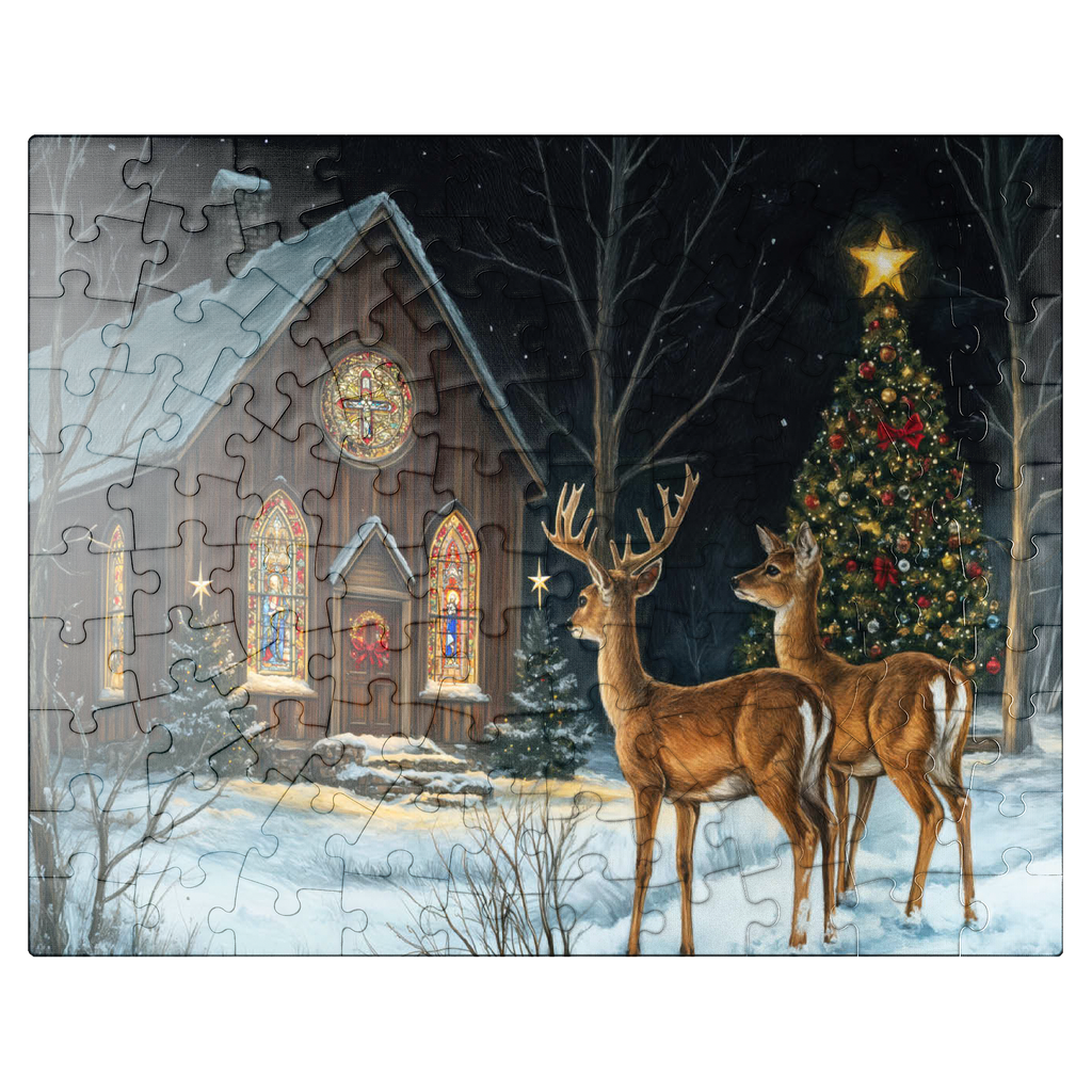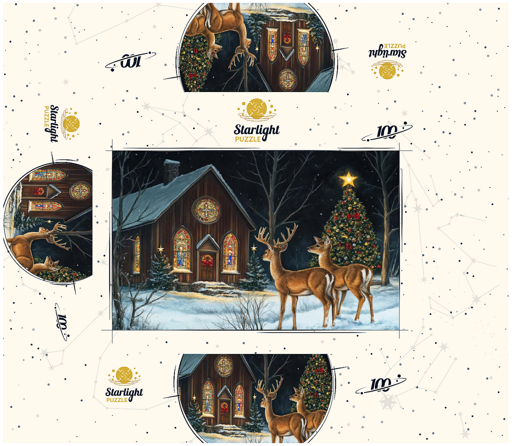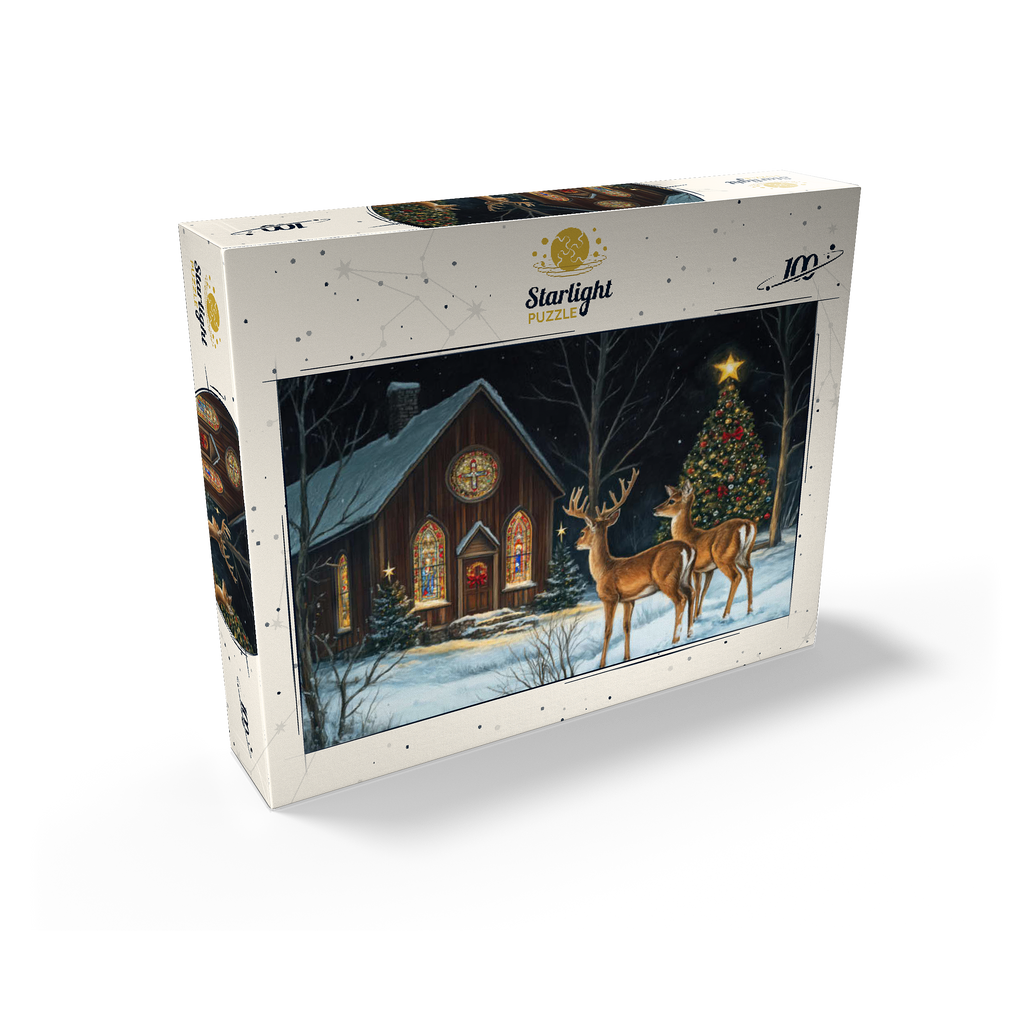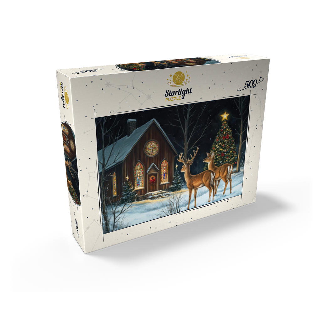 This serene winter scene features two elegant deer standing in the snow outside a beautifully decorated church. The warm glow of the stained glass windows and the twinkling lights of a Christmas tree adorned with ornaments create a peaceful, festive ambiance. The snow-covered ground and starry night sky complete the enchanting holiday atmosphere, capturing the quiet beauty of Christmas in nature.