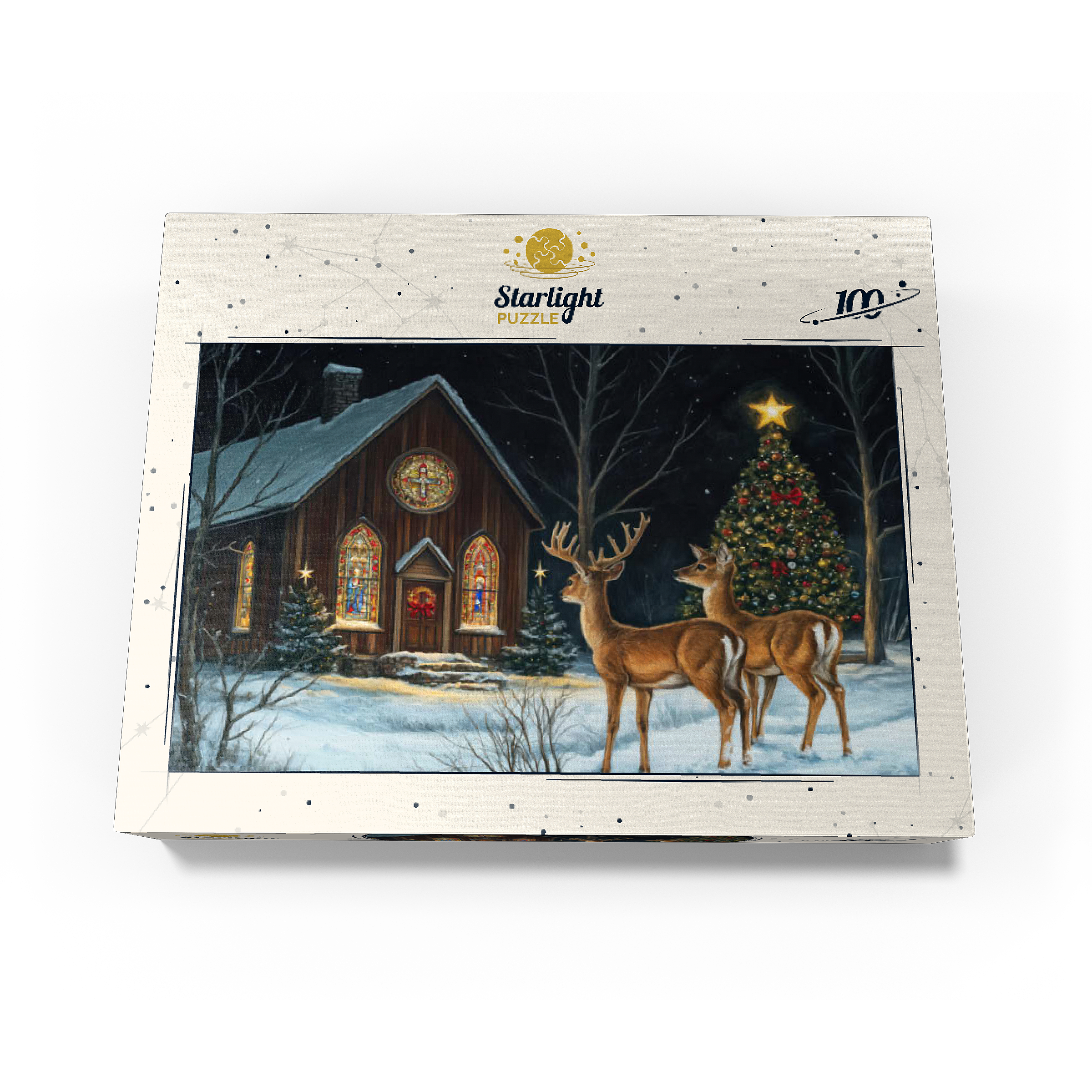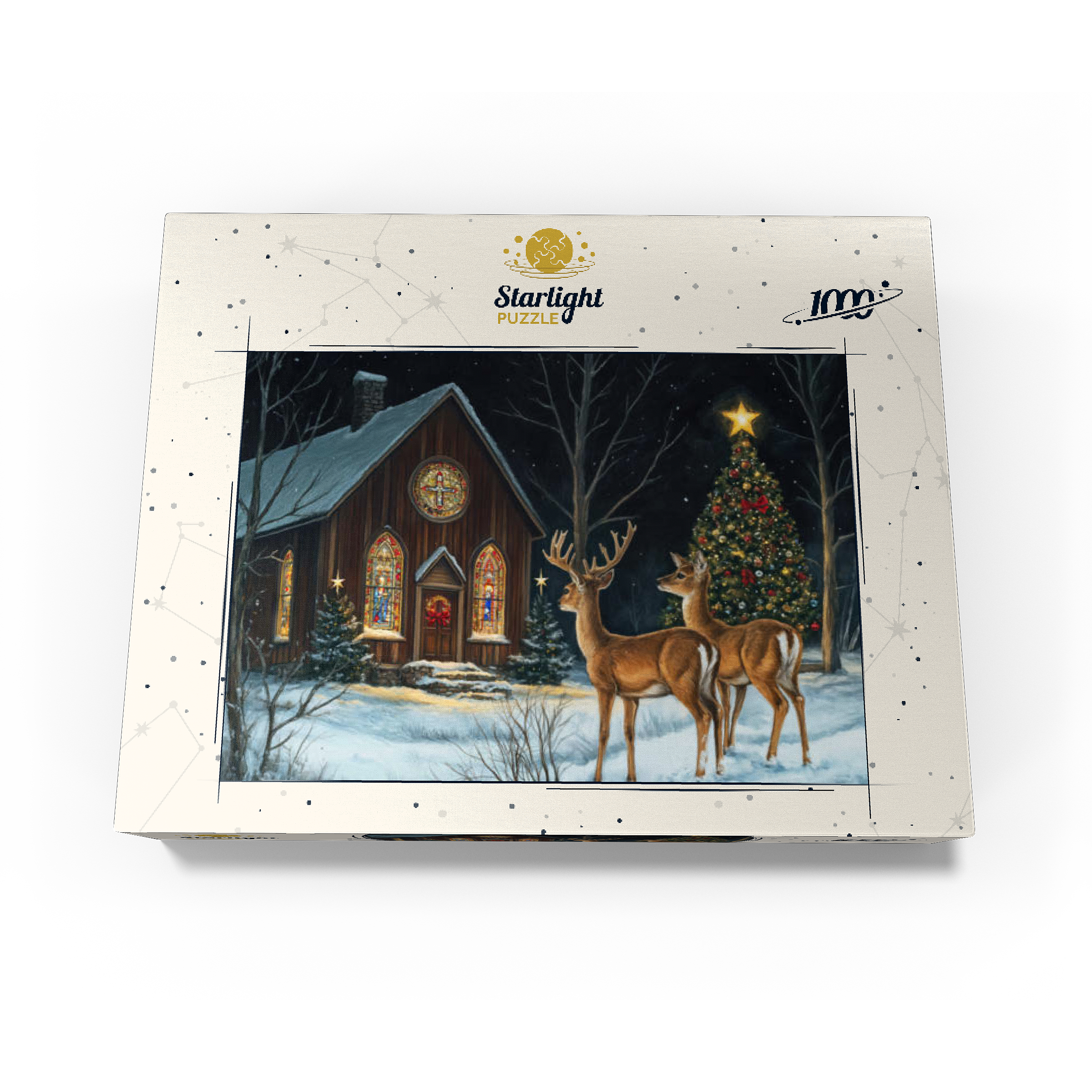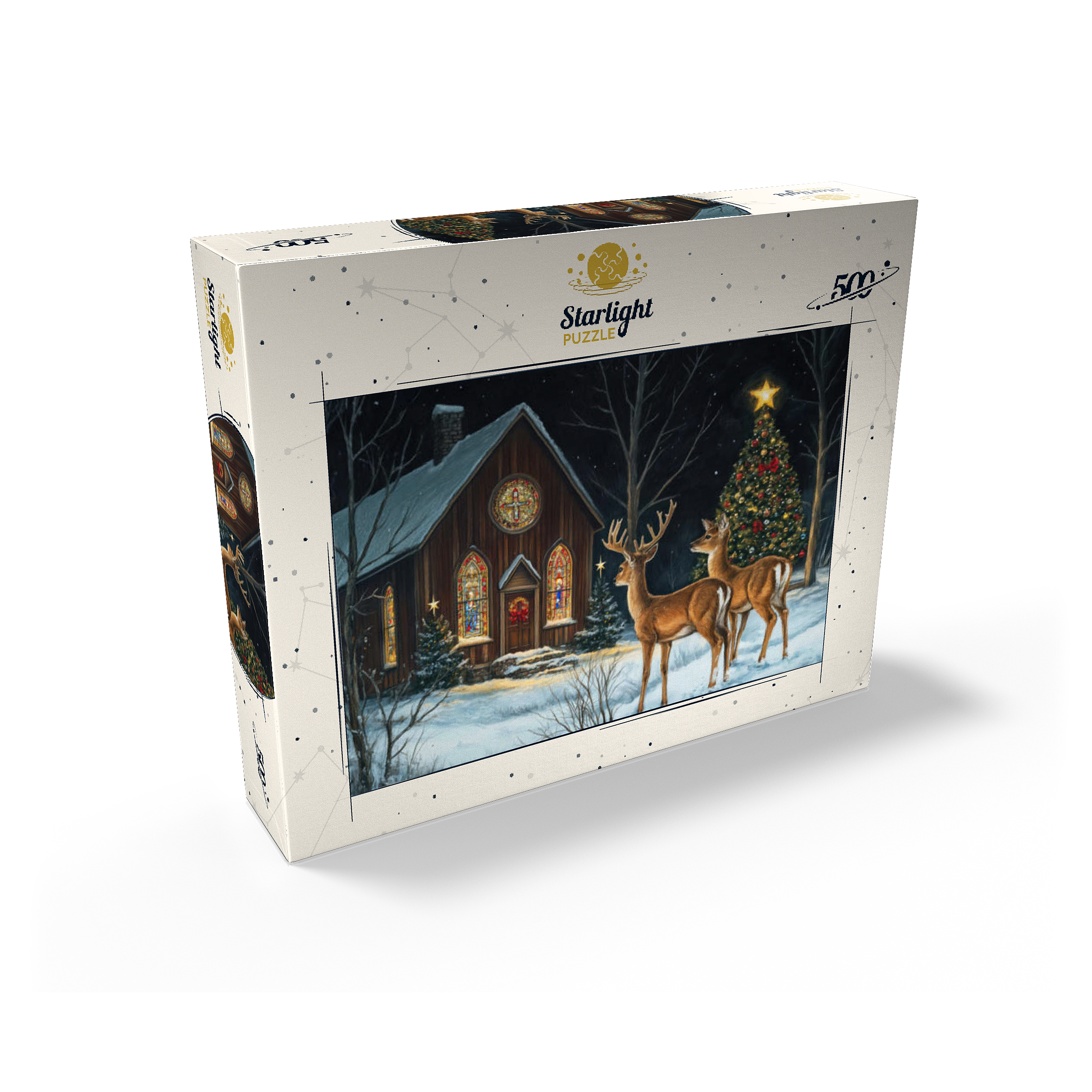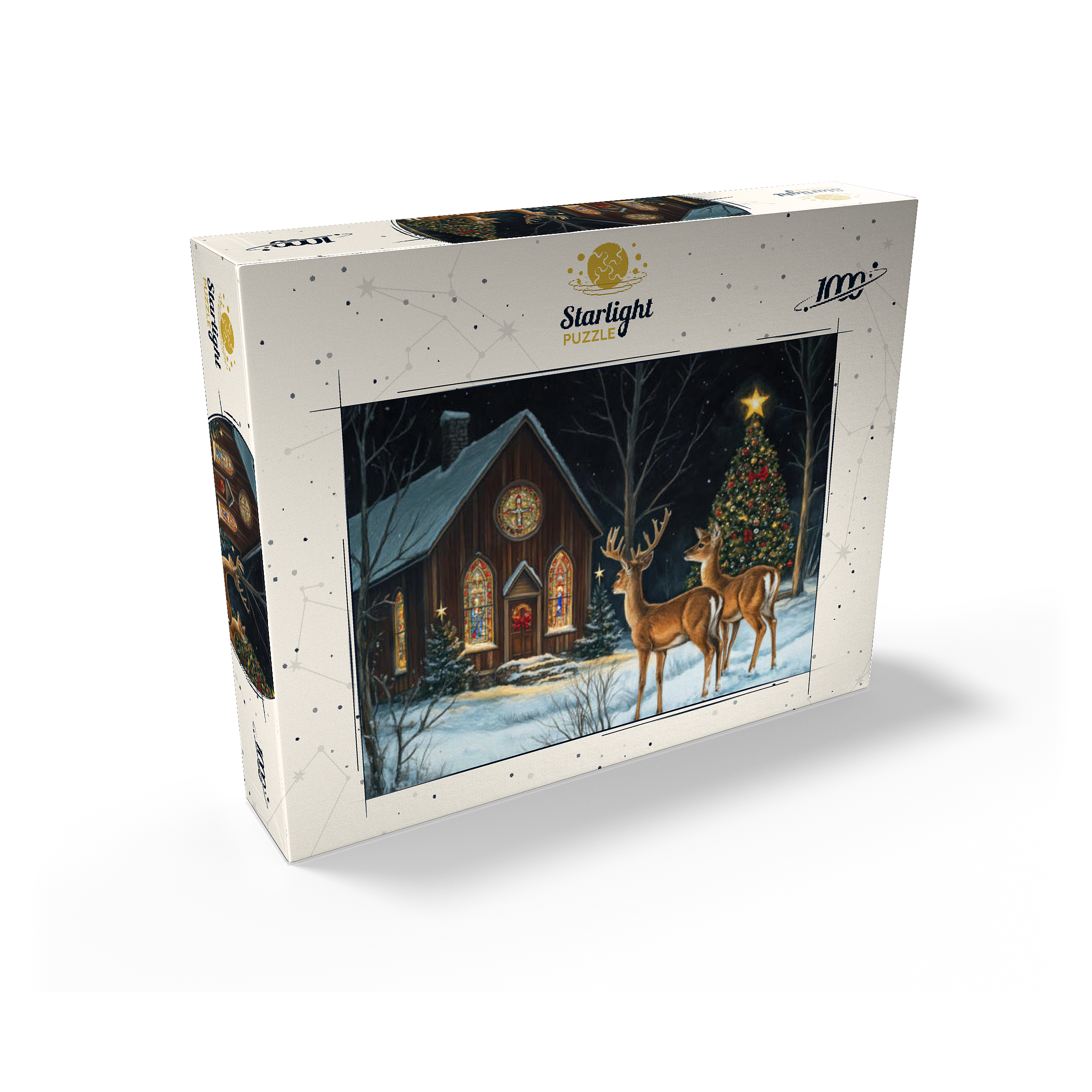 This serene winter scene features two elegant deer standing in the snow outside a beautifully decorated church. The warm glow of the stained glass windows and the twinkling lights of a Christmas tree adorned with ornaments create a peaceful, festive ambiance. The snow-covered ground and starry night sky complete the enchanting holiday atmosphere, capturing the quiet beauty of Christmas in nature.