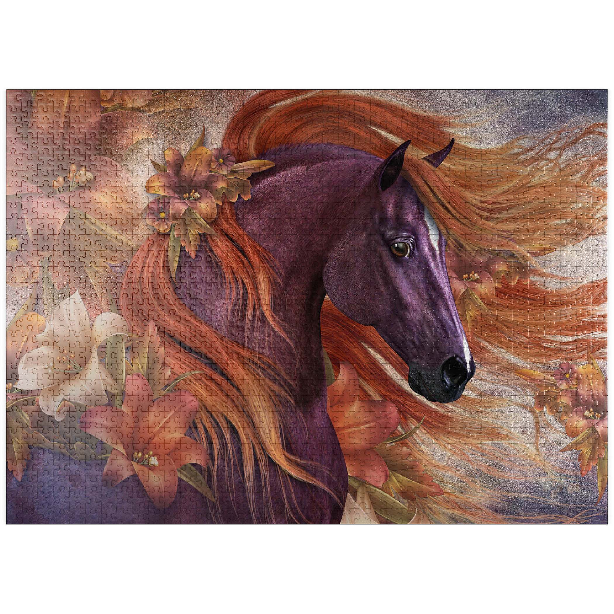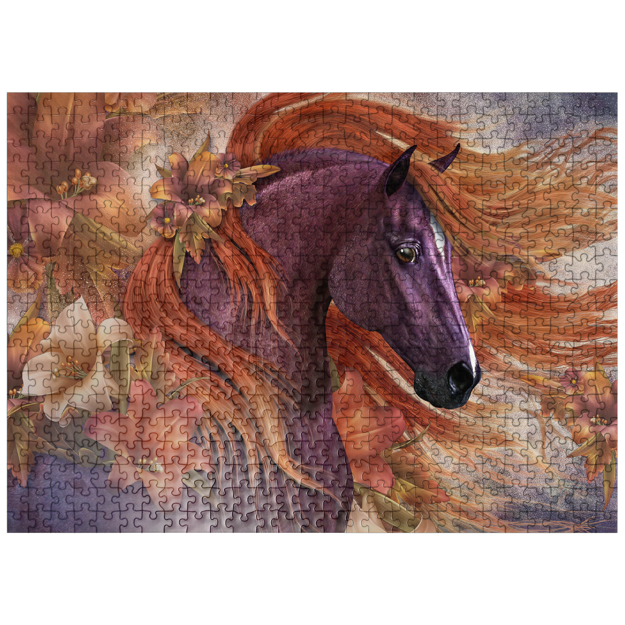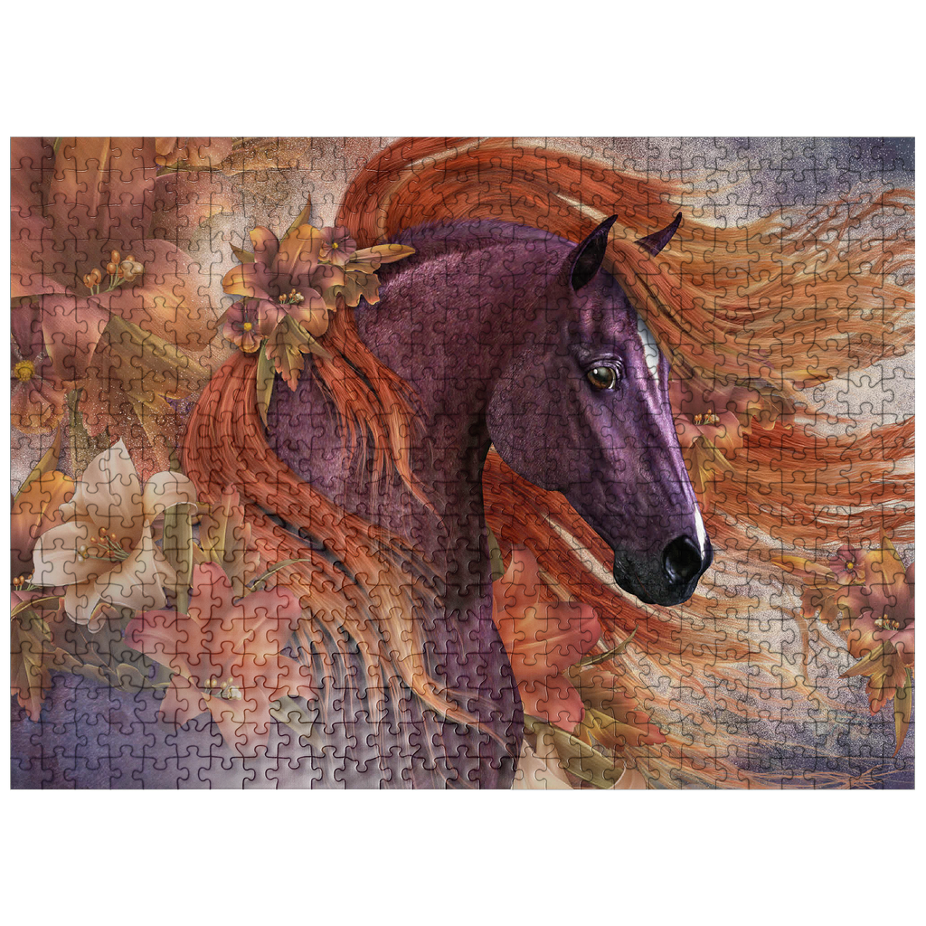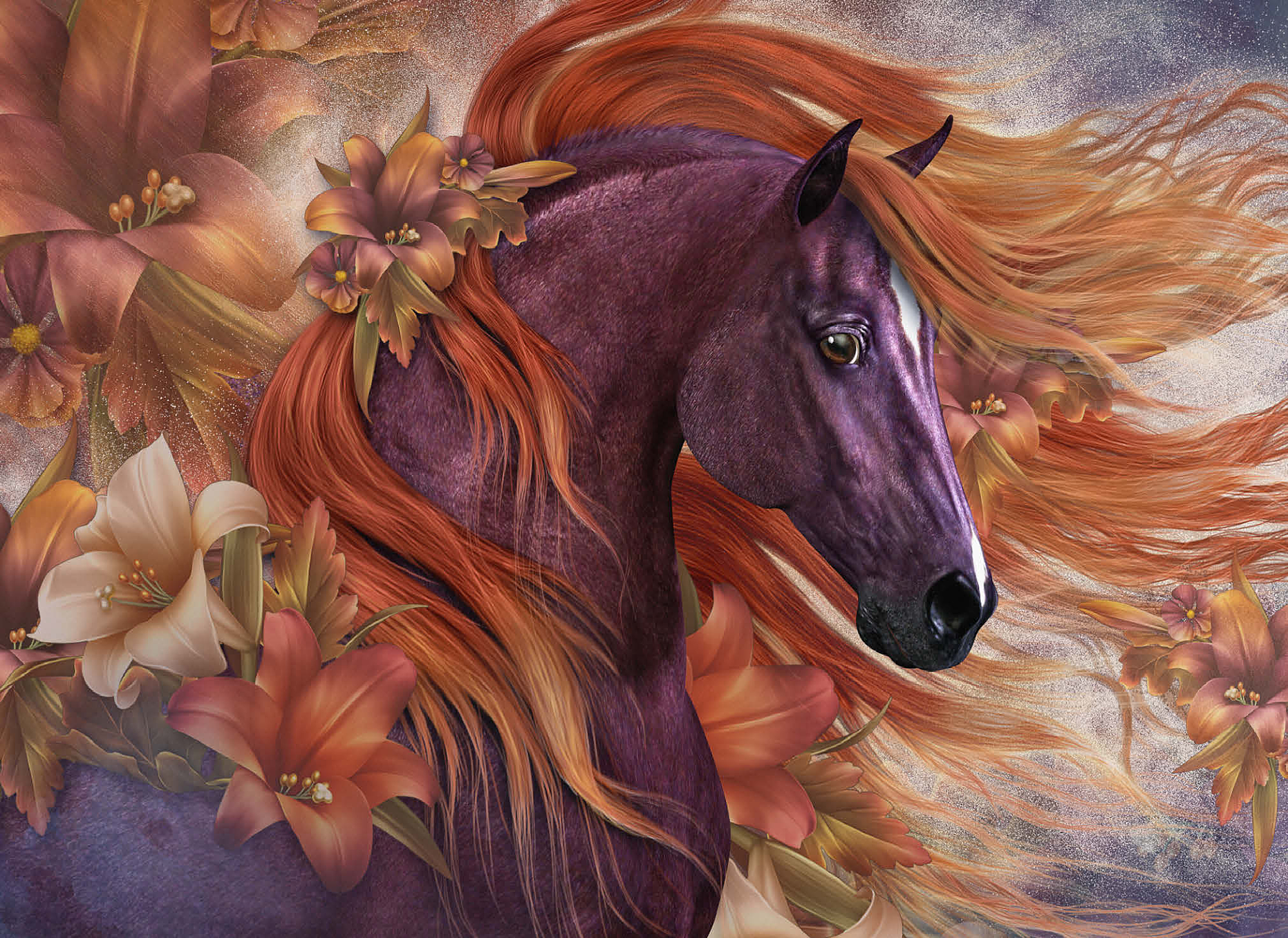 A majestic horse, with a striking liver chestnut coat and a magnificent, long and flowing flaxen mane in fiery shades of orange and red, is adorned with elegant autumn lilies and delicate foliage. The background is full of a soft, ethereal blend of warm oranges, purples, and hints of white, with subtle floral shapes enhancing the magical atmosphere. This fantasy art piece by Laurie Prindle evokes themes of autumn, fire, beauty, and mythical equines, creating a captivating and warm autumnal scene.