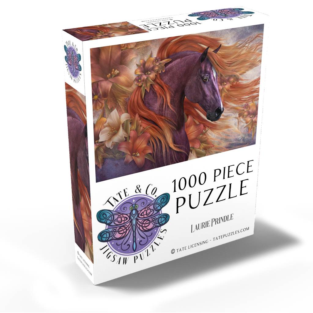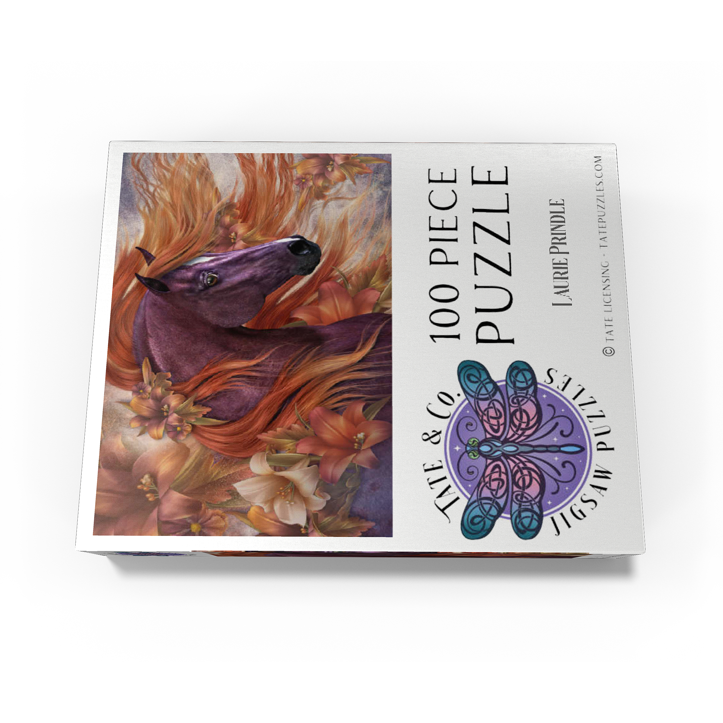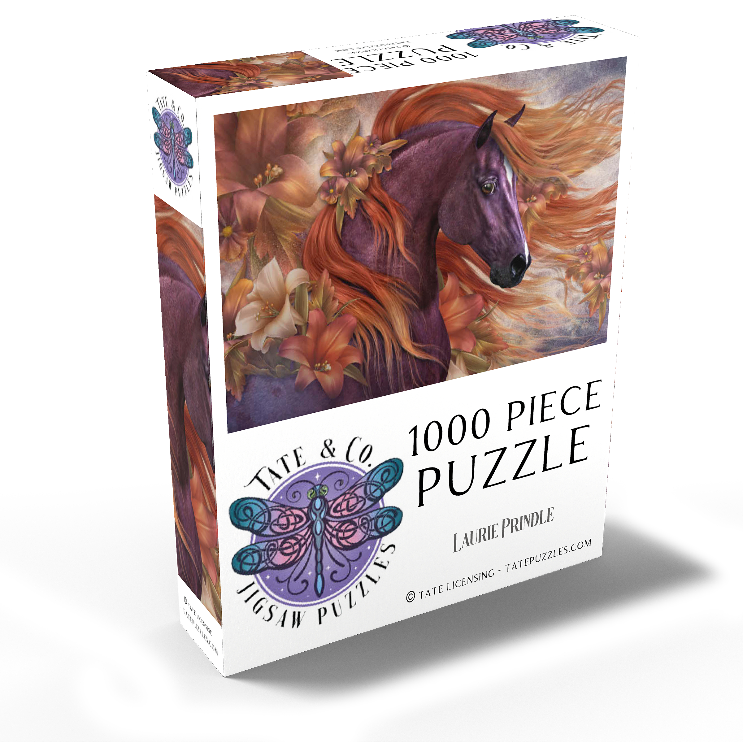 A majestic horse, with a striking liver chestnut coat and a magnificent, long and flowing flaxen mane in fiery shades of orange and red, is adorned with elegant autumn lilies and delicate foliage. The background is full of a soft, ethereal blend of warm oranges, purples, and hints of white, with subtle floral shapes enhancing the magical atmosphere. This fantasy art piece by Laurie Prindle evokes themes of autumn, fire, beauty, and mythical equines, creating a captivating and warm autumnal scene.