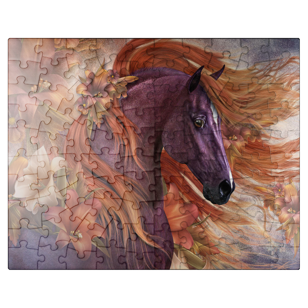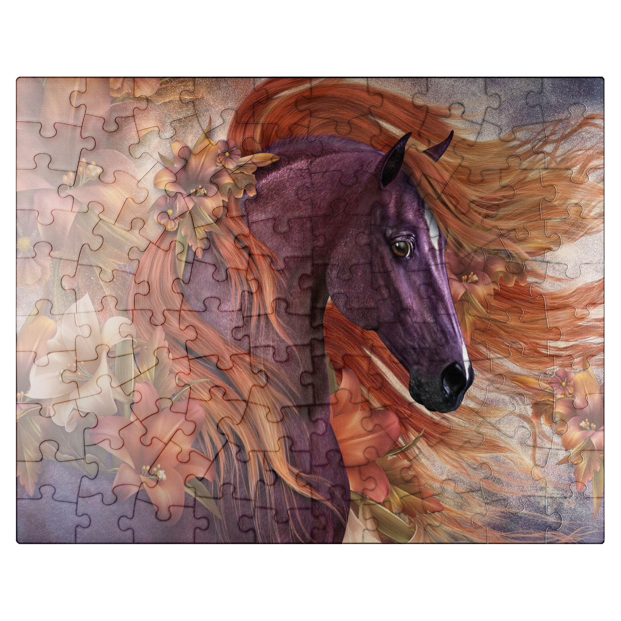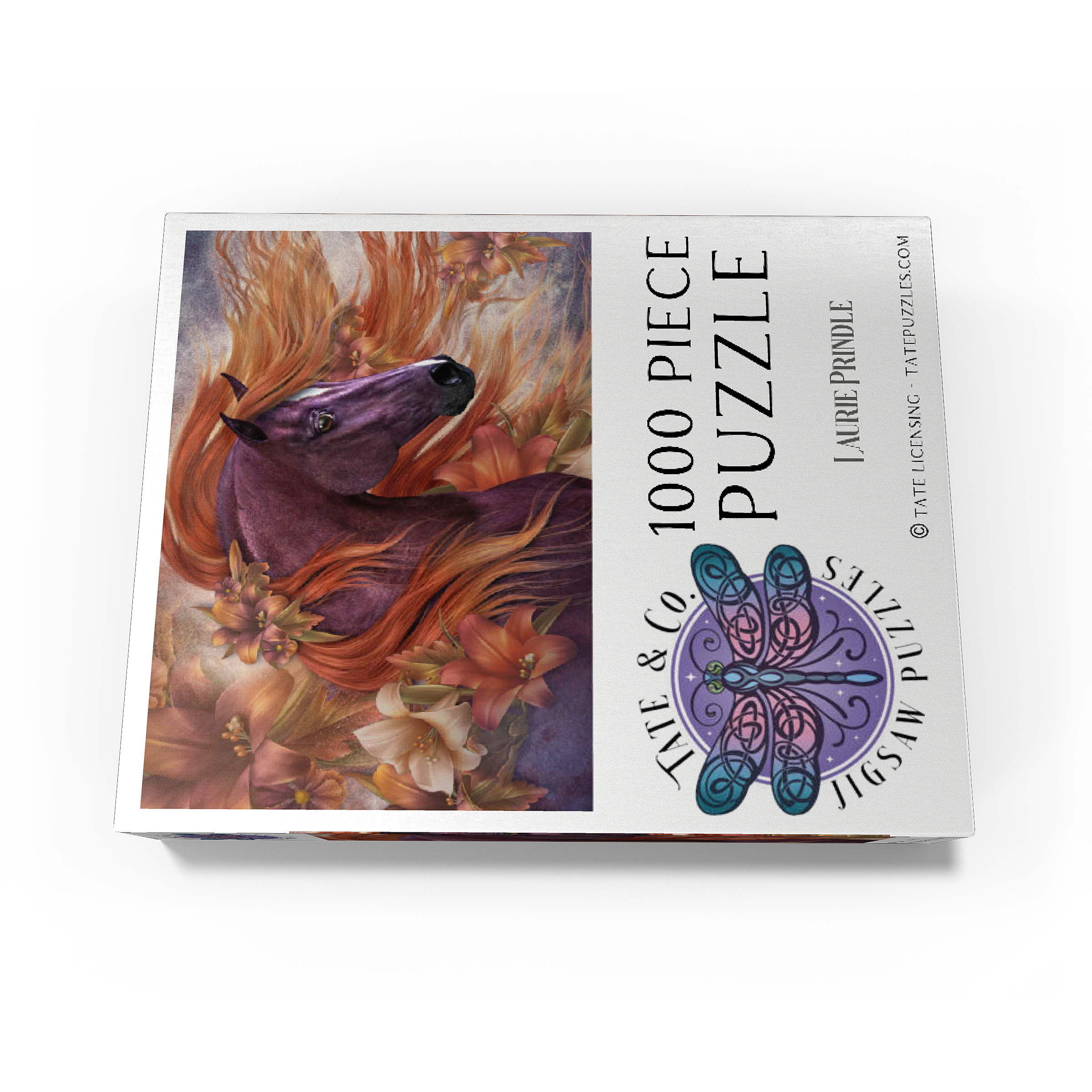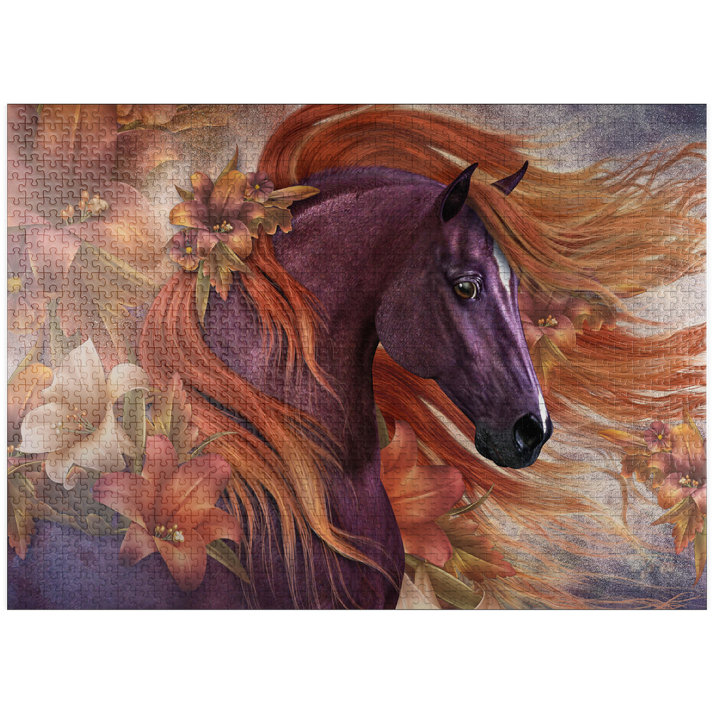 A majestic horse, with a striking liver chestnut coat and a magnificent, long and flowing flaxen mane in fiery shades of orange and red, is adorned with elegant autumn lilies and delicate foliage. The background is full of a soft, ethereal blend of warm oranges, purples, and hints of white, with subtle floral shapes enhancing the magical atmosphere. This fantasy art piece by Laurie Prindle evokes themes of autumn, fire, beauty, and mythical equines, creating a captivating and warm autumnal scene.