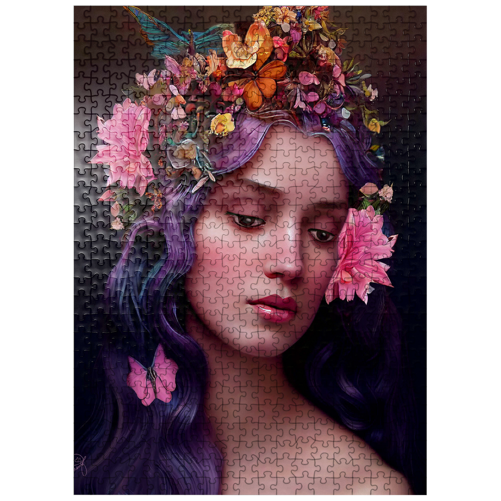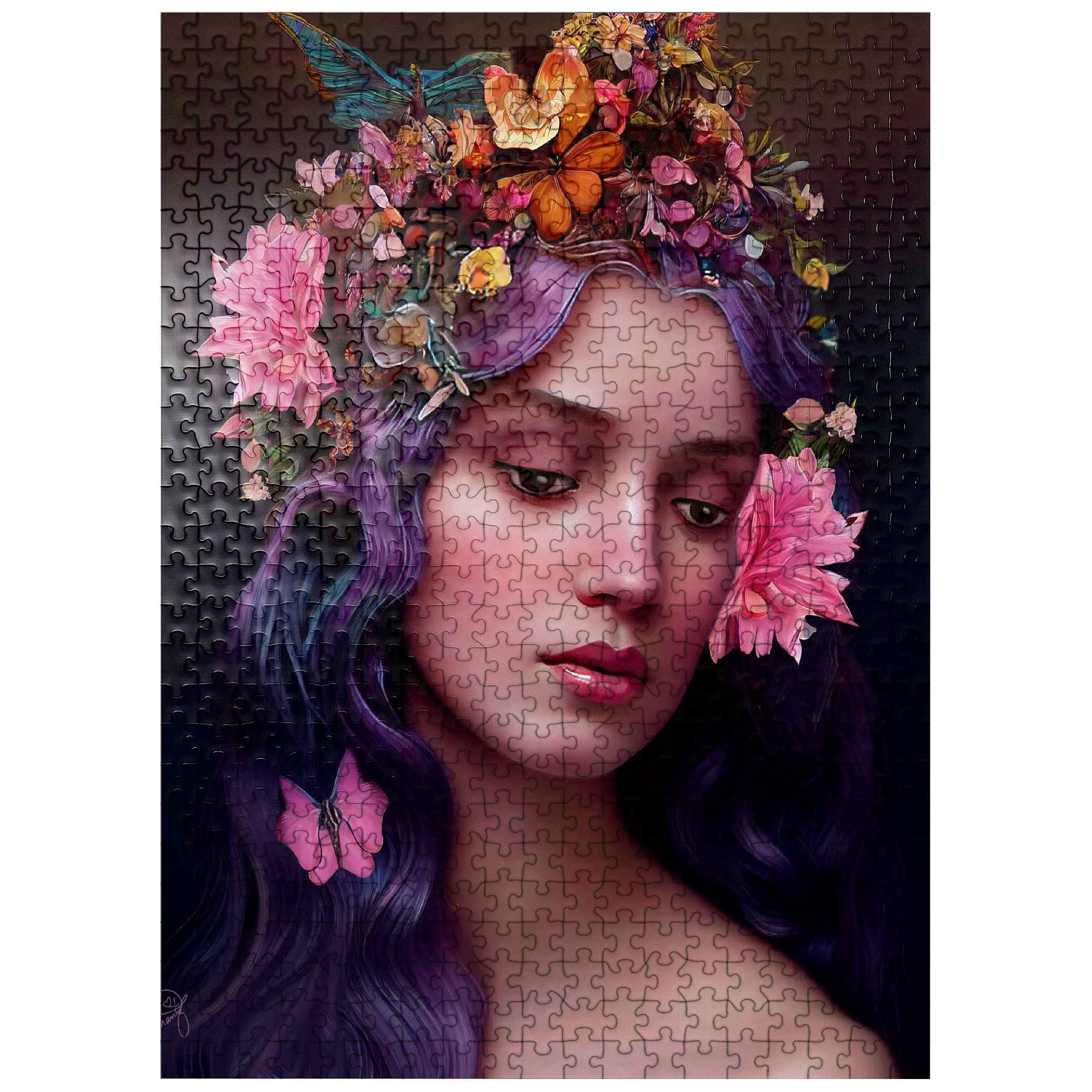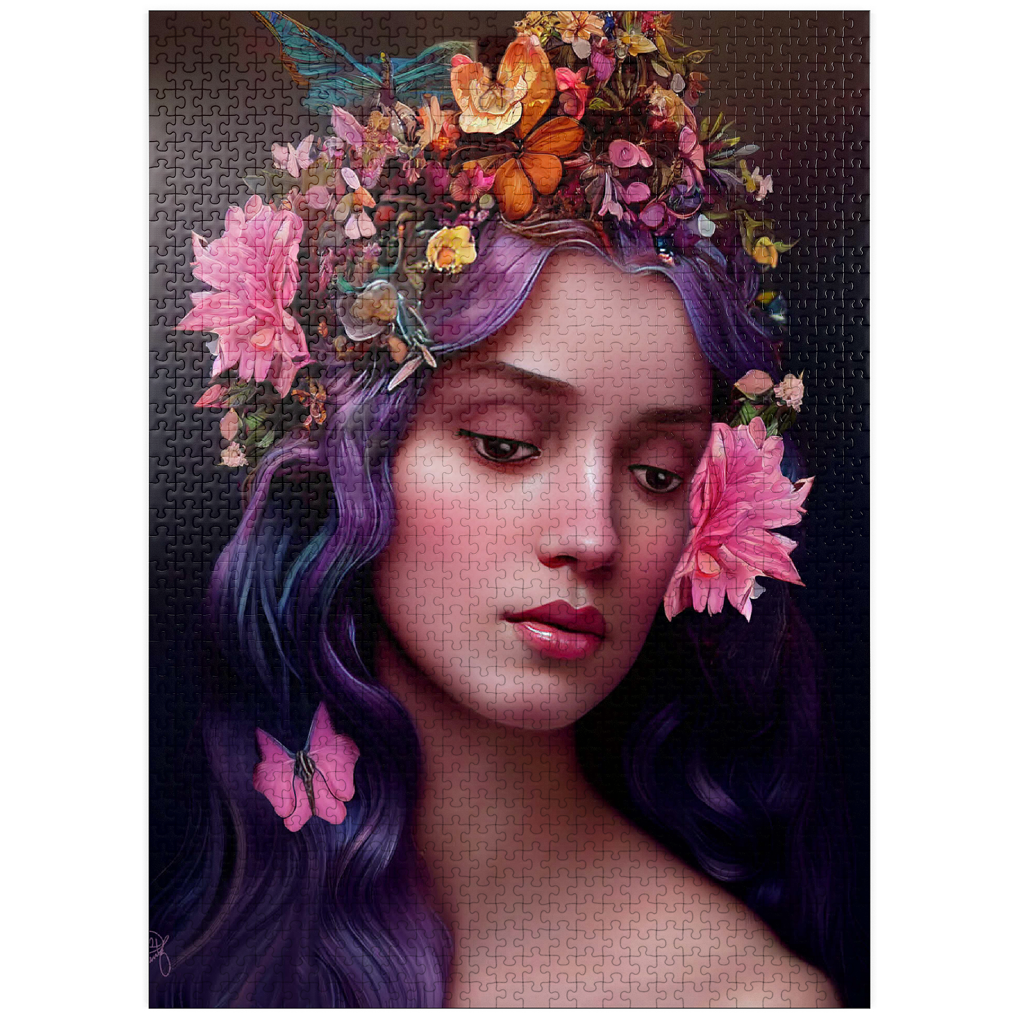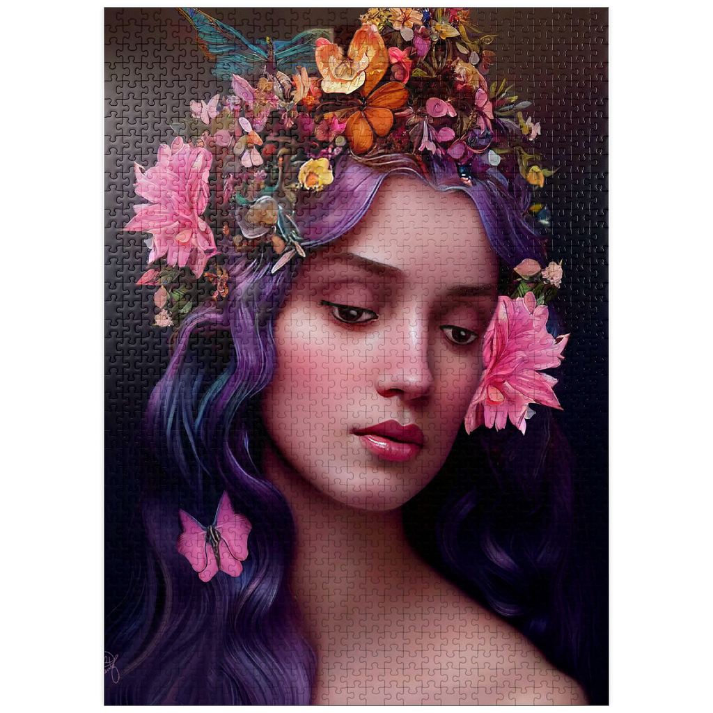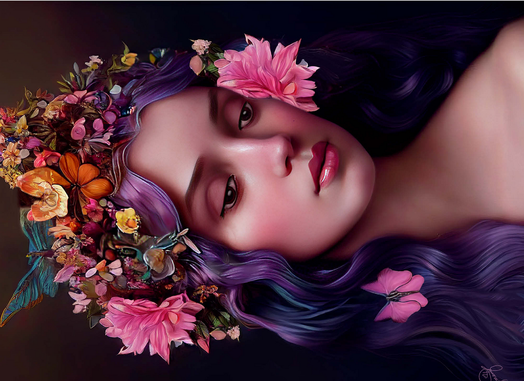 A breathtaking digital artwork of a serene woman with flowing violet hair, adorned with an intricate crown of vibrant flowers and delicate butterflies. her gentle expression and soft, glowing complexion evoke an ethereal beauty, complemented by the pink blossoms woven into her hair. the realistic textures and harmonious color palette of purples, pinks, and oranges create a striking visual experience. this enchanting piece is ideal for lovers of fantasy art, floral portraits, and nature-inspired aesthetics. perfect as elegant wall art, this artwork adds a touch of romantic charm to any space.
