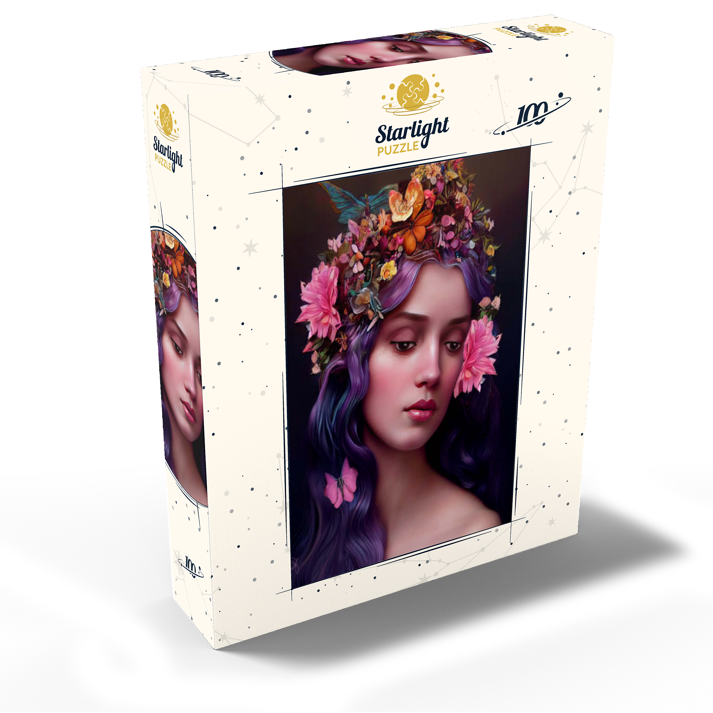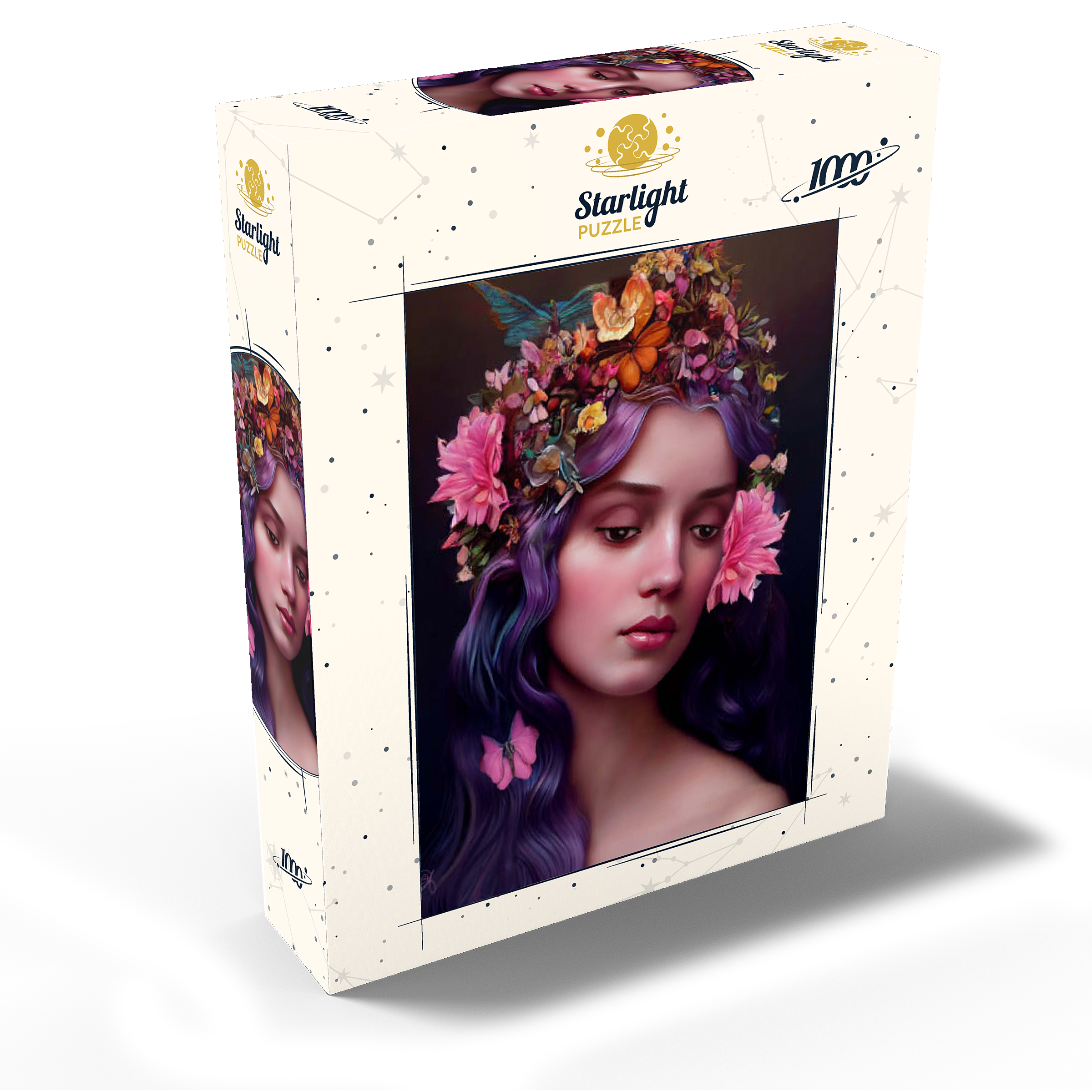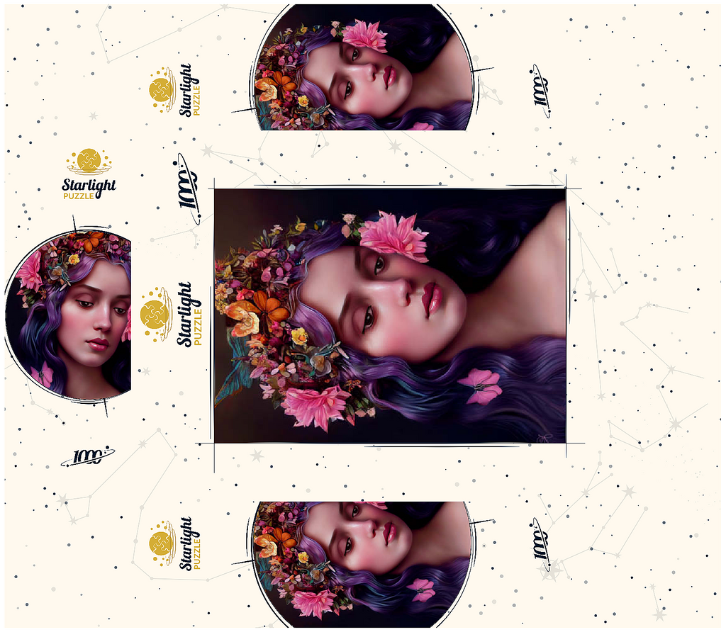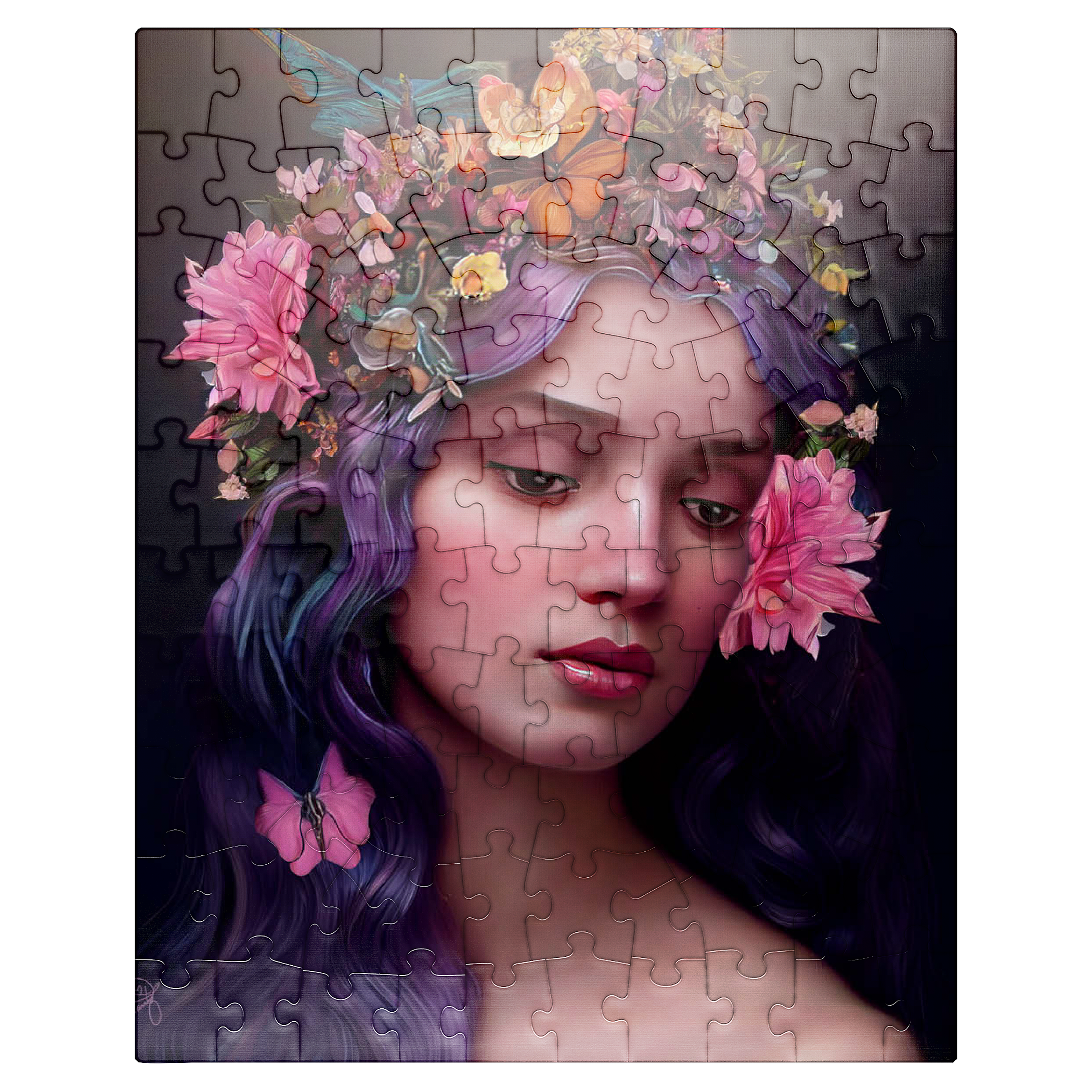 A breathtaking digital artwork of a serene woman with flowing violet hair, adorned with an intricate crown of vibrant flowers and delicate butterflies. her gentle expression and soft, glowing complexion evoke an ethereal beauty, complemented by the pink blossoms woven into her hair. the realistic textures and harmonious color palette of purples, pinks, and oranges create a striking visual experience. this enchanting piece is ideal for lovers of fantasy art, floral portraits, and nature-inspired aesthetics. perfect as elegant wall art, this artwork adds a touch of romantic charm to any space.
