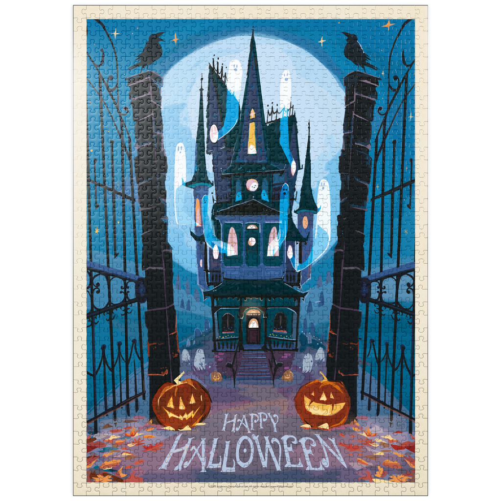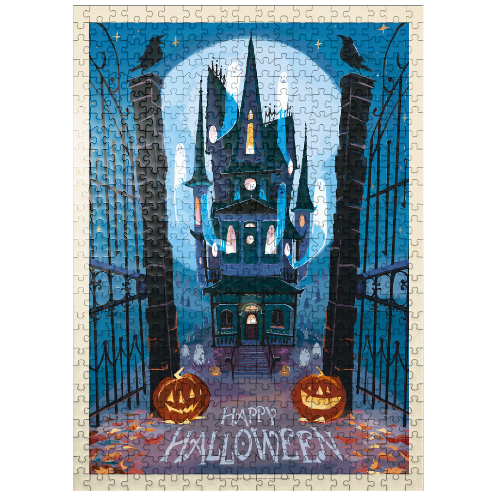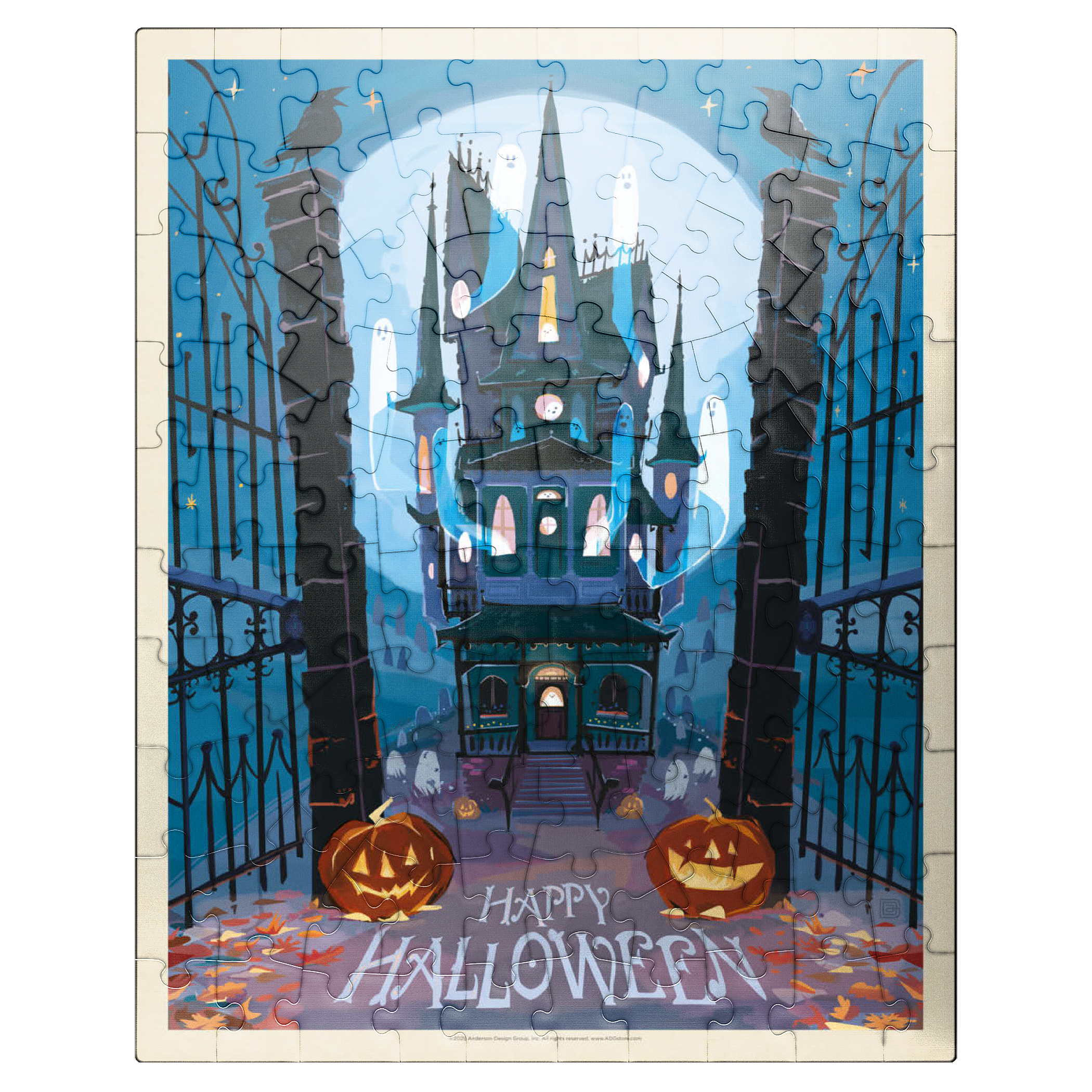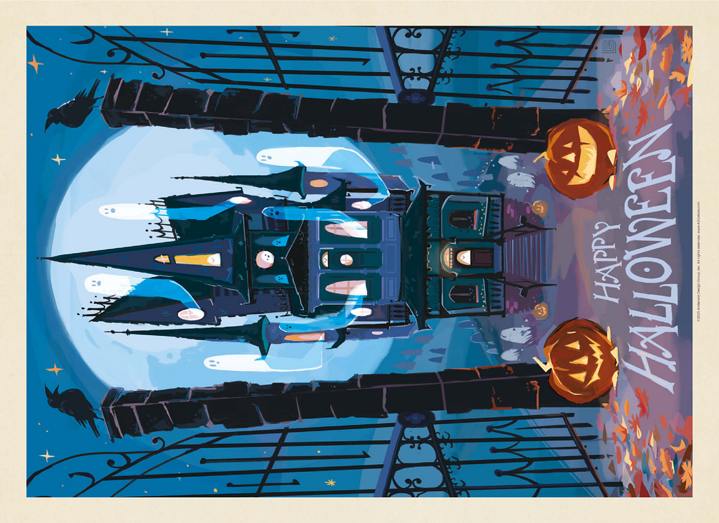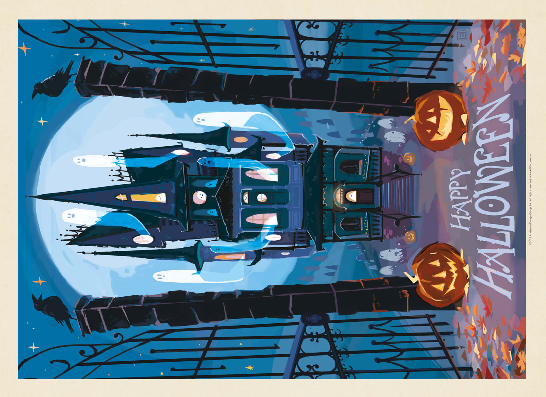 A spooky haunted mansion stands beneath a glowing full moon, surrounded by carved jack-o'-lanterns, playful ghosts, and eerie blue mist. Crows perch atop wrought-iron gates as autumn leaves scatter across the pathway leading to the towering, crooked house. The warm candlelight from the pumpkins contrasts with the cool night tones, creating a perfect balance of mystery and fun. This atmospheric depiction captures the festive spirit of Halloween with a whimsical, slightly gothic charm. It evokes the magic of trick-or-treat nights, haunted houses, and glowing lanterns that define the season's playful eeriness.