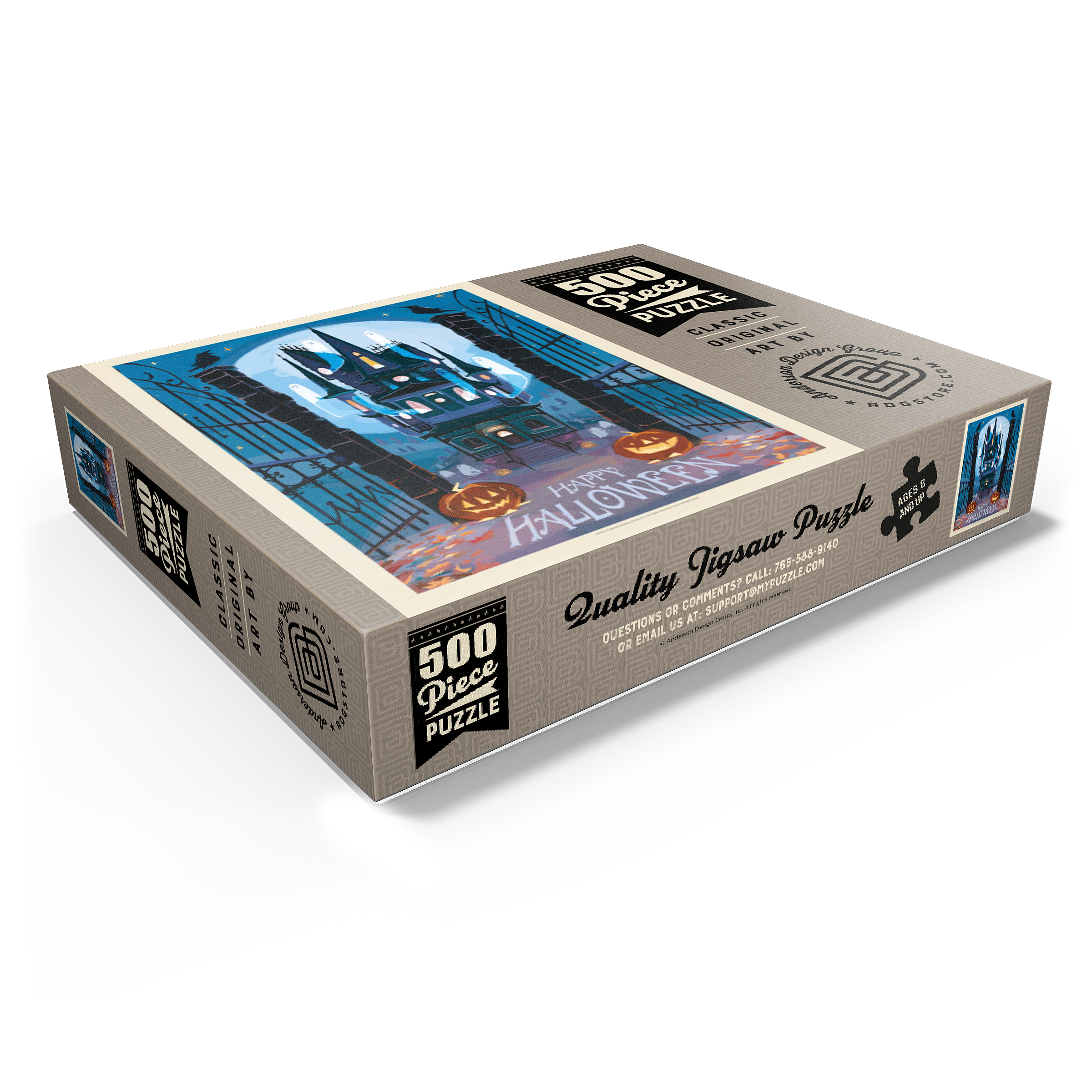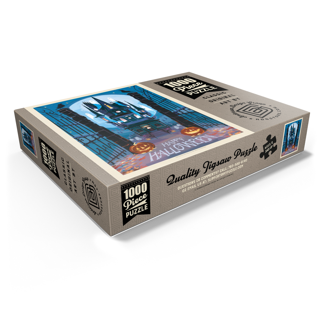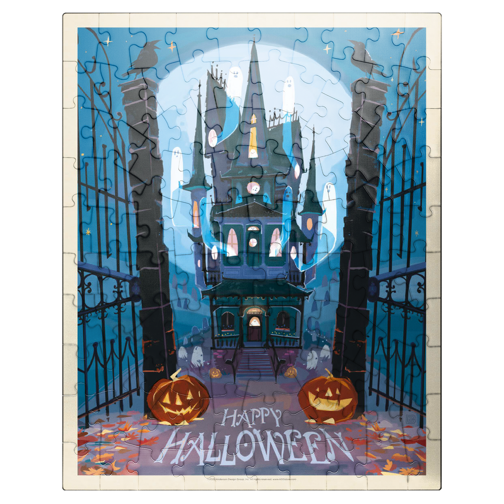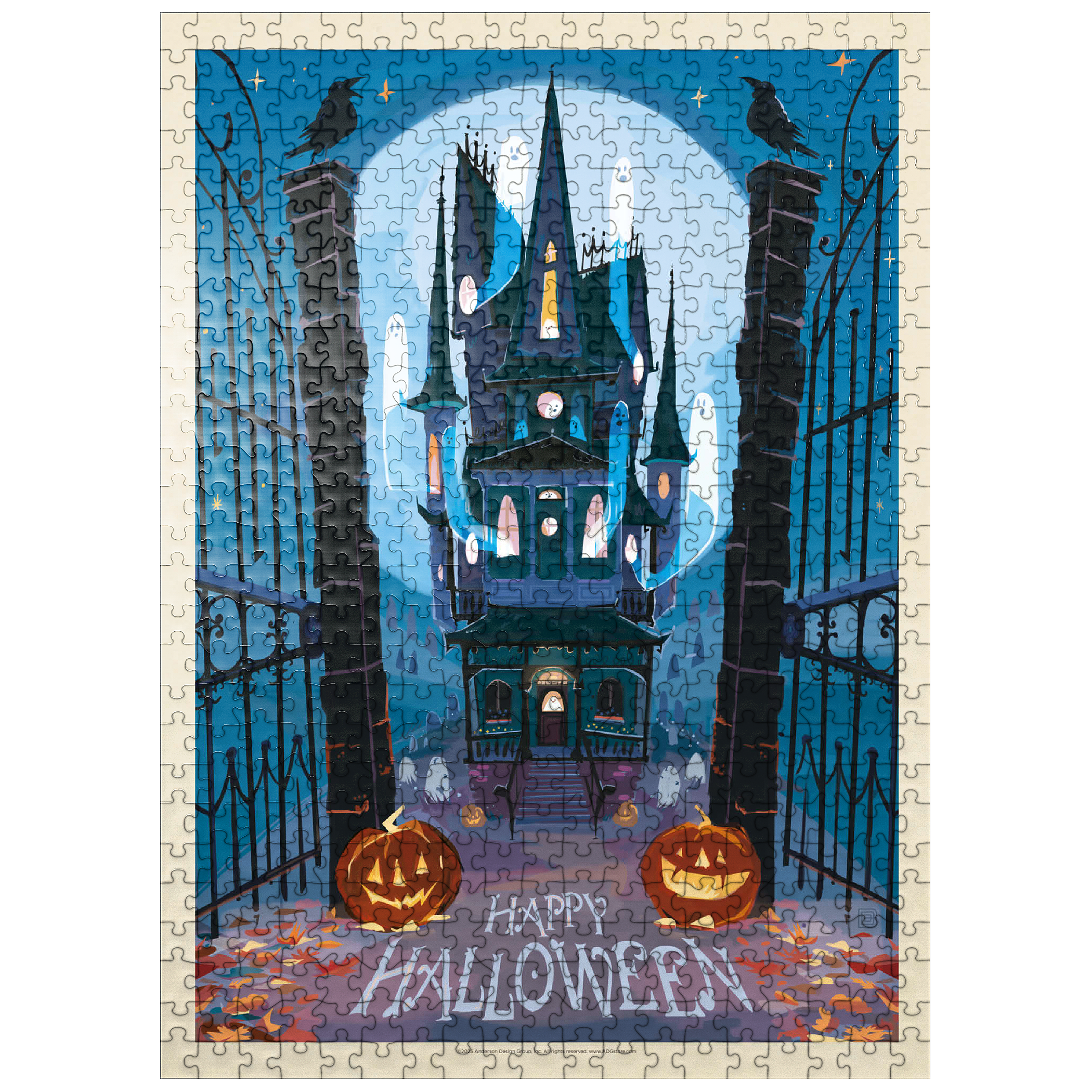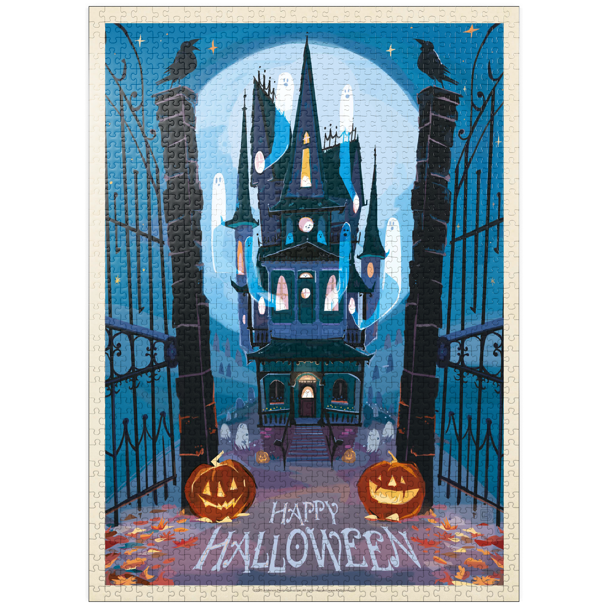 A spooky haunted mansion stands beneath a glowing full moon, surrounded by carved jack-o'-lanterns, playful ghosts, and eerie blue mist. Crows perch atop wrought-iron gates as autumn leaves scatter across the pathway leading to the towering, crooked house. The warm candlelight from the pumpkins contrasts with the cool night tones, creating a perfect balance of mystery and fun. This atmospheric depiction captures the festive spirit of Halloween with a whimsical, slightly gothic charm. It evokes the magic of trick-or-treat nights, haunted houses, and glowing lanterns that define the season's playful eeriness.