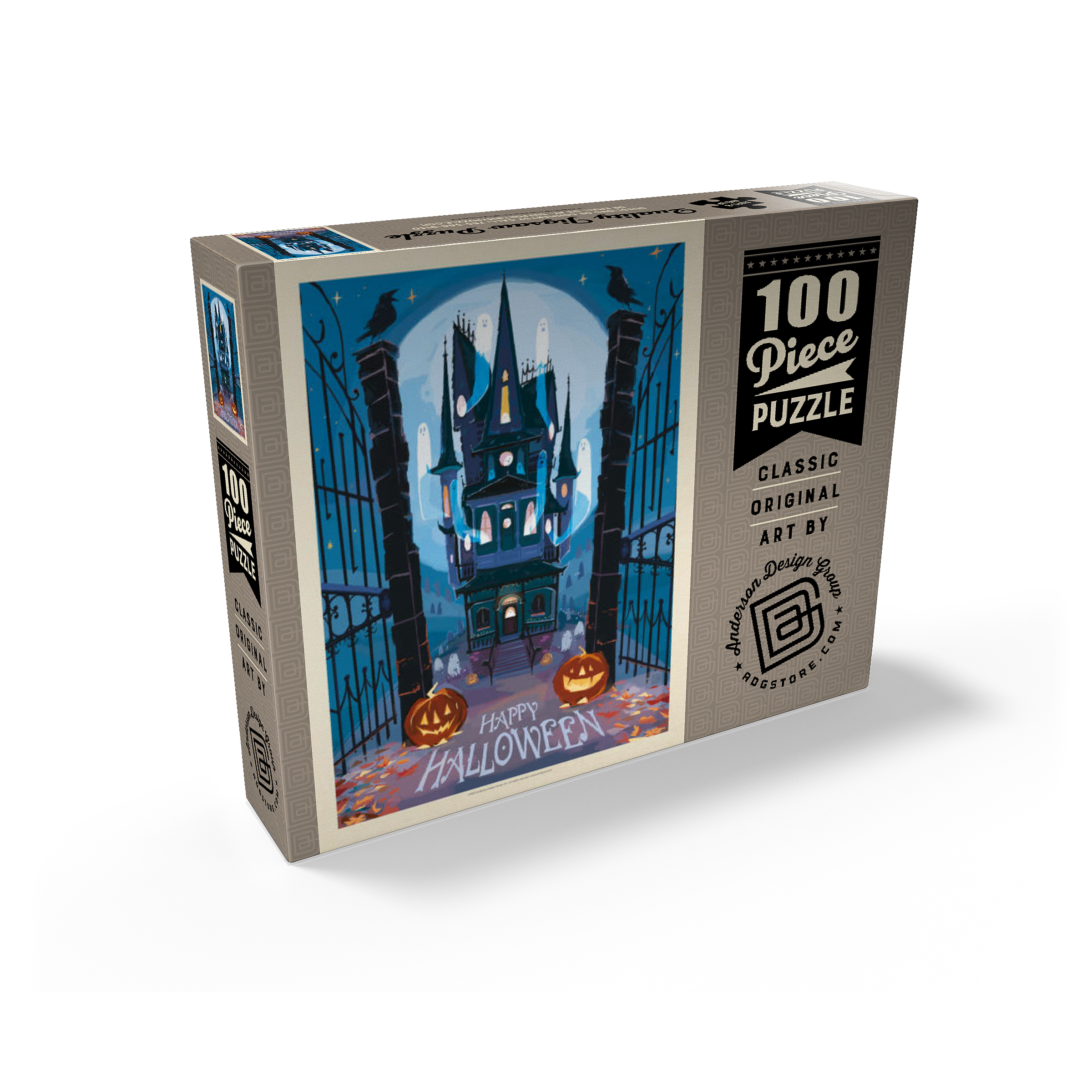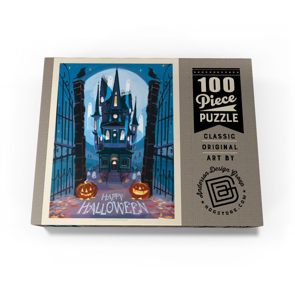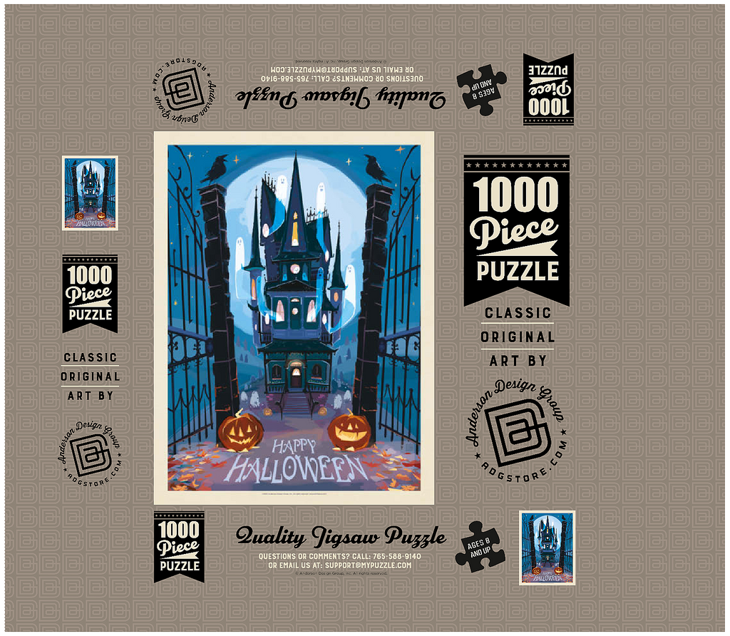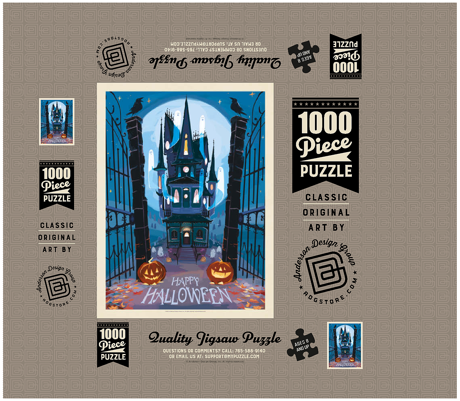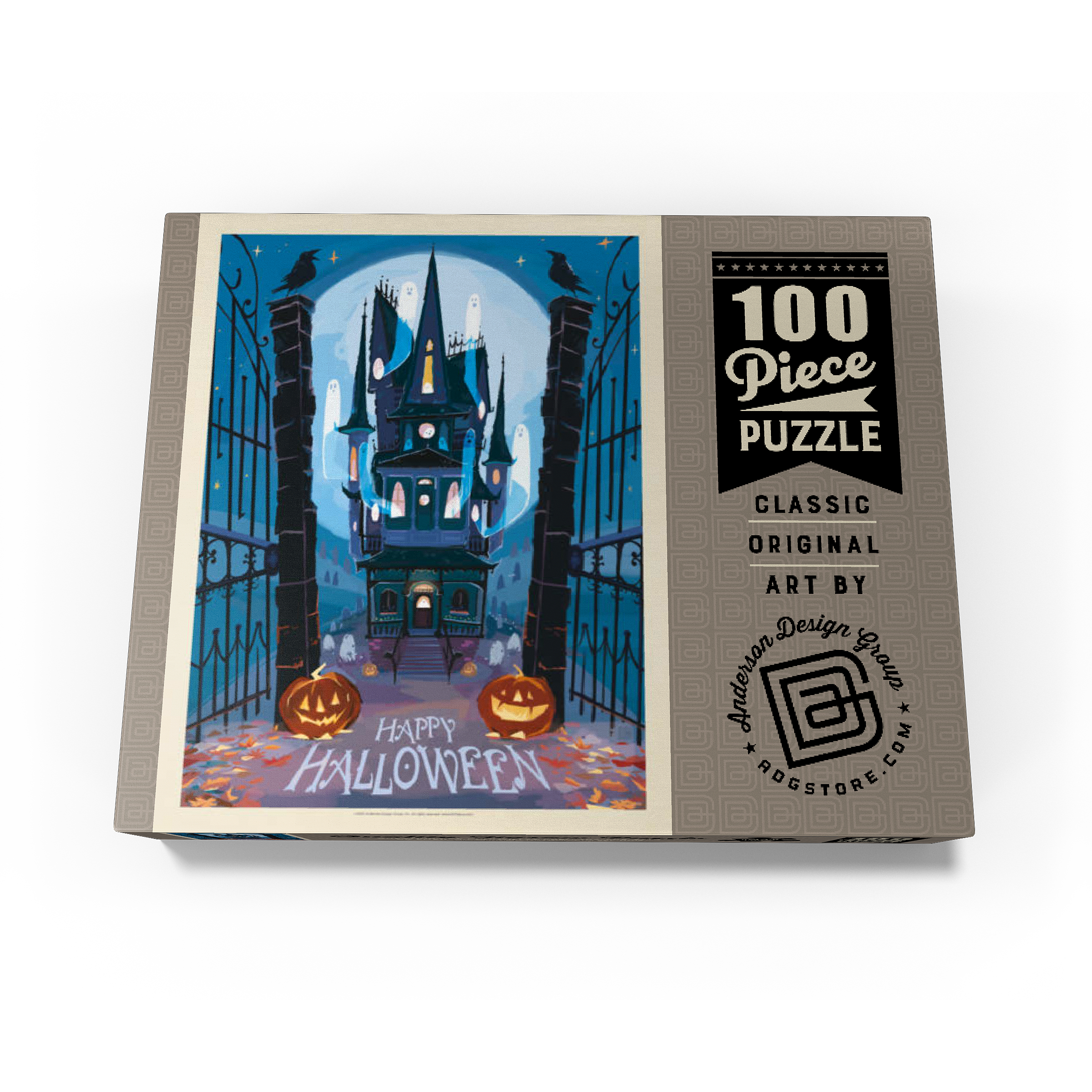 A spooky haunted mansion stands beneath a glowing full moon, surrounded by carved jack-o'-lanterns, playful ghosts, and eerie blue mist. Crows perch atop wrought-iron gates as autumn leaves scatter across the pathway leading to the towering, crooked house. The warm candlelight from the pumpkins contrasts with the cool night tones, creating a perfect balance of mystery and fun. This atmospheric depiction captures the festive spirit of Halloween with a whimsical, slightly gothic charm. It evokes the magic of trick-or-treat nights, haunted houses, and glowing lanterns that define the season's playful eeriness.