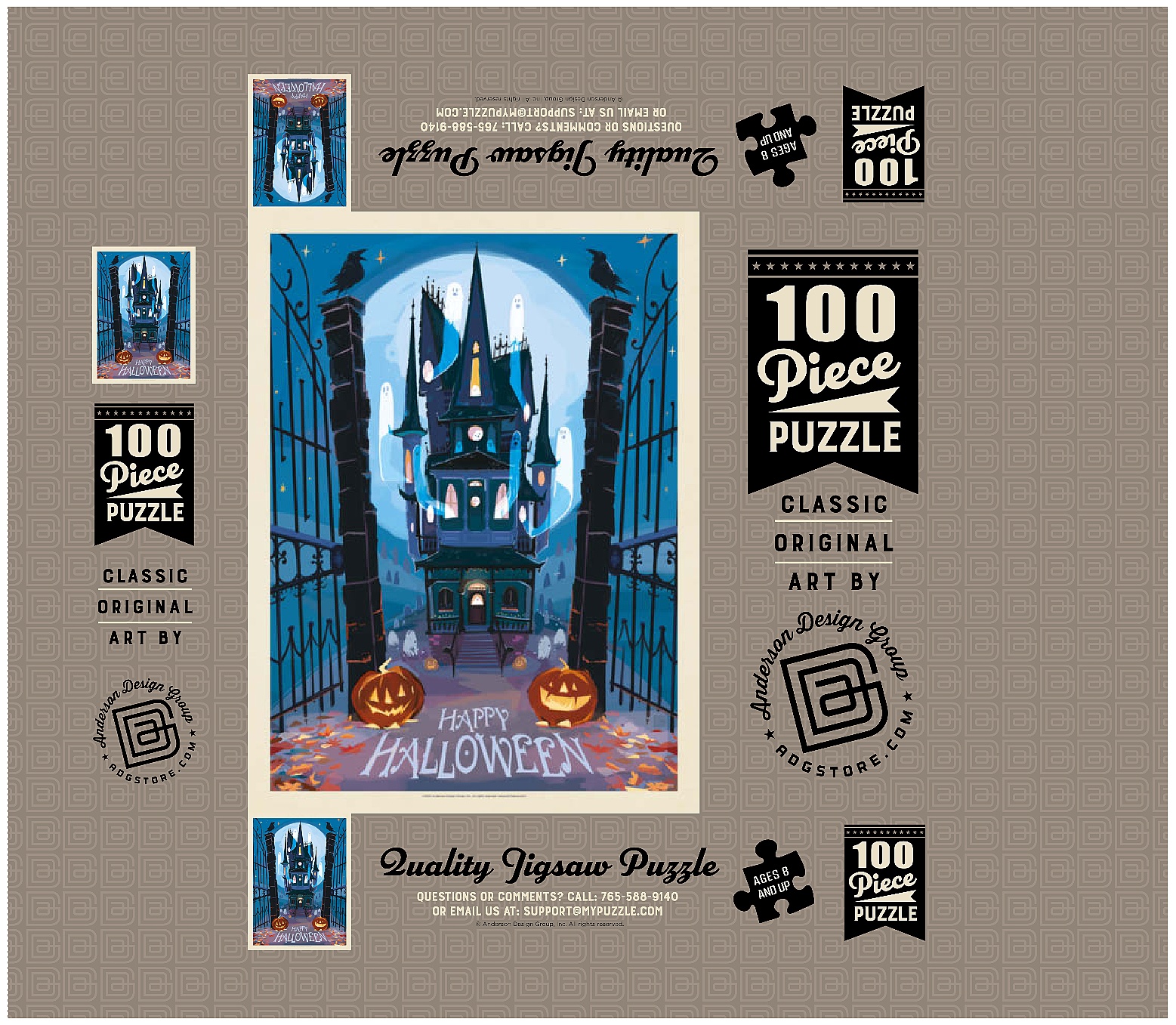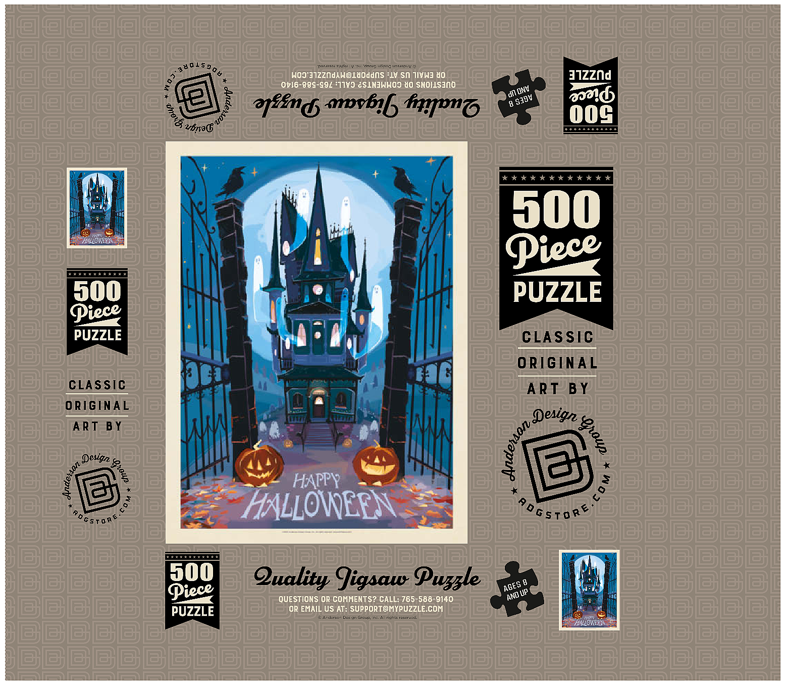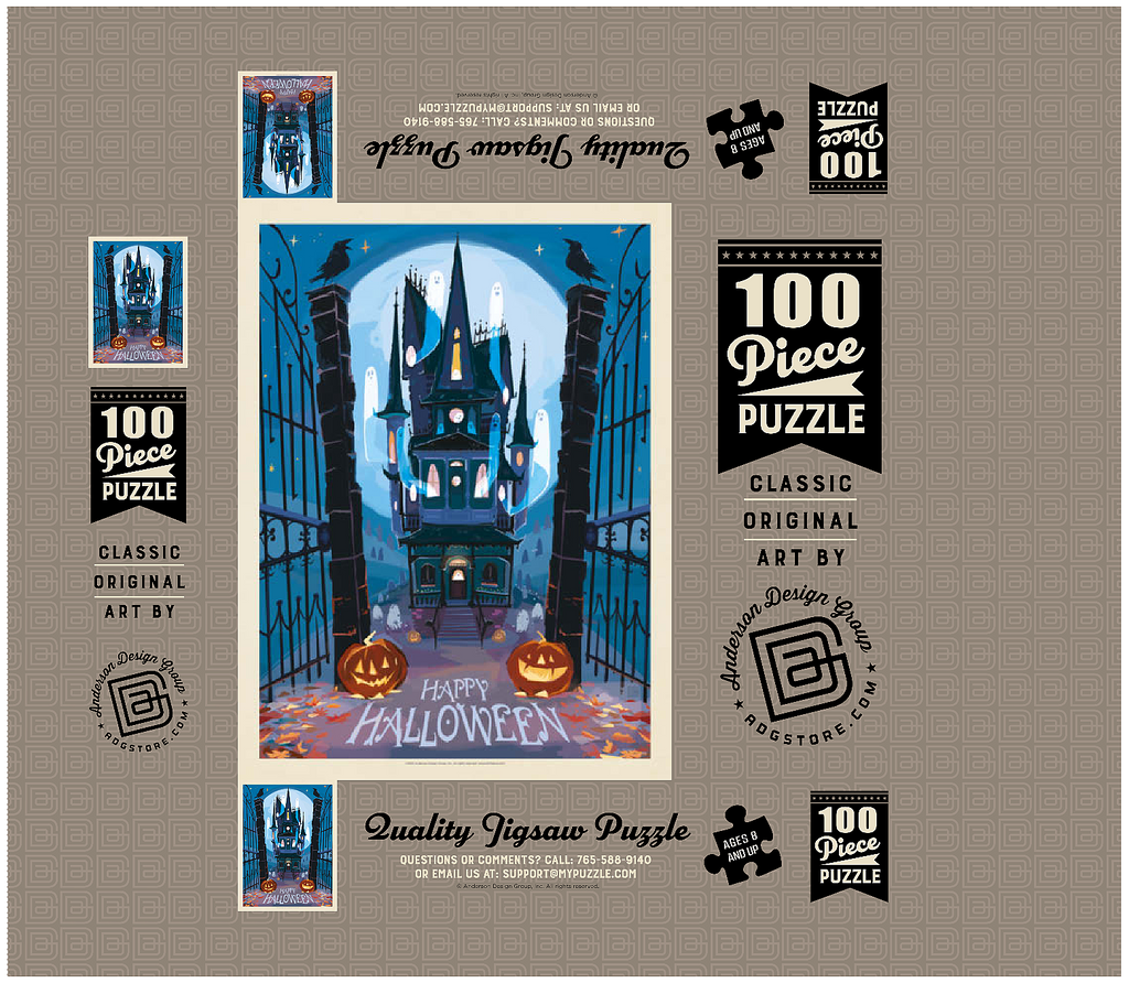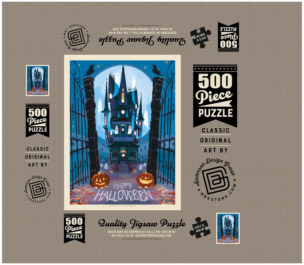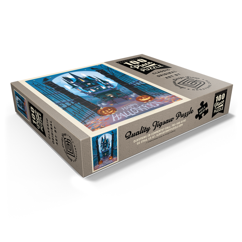 A spooky haunted mansion stands beneath a glowing full moon, surrounded by carved jack-o'-lanterns, playful ghosts, and eerie blue mist. Crows perch atop wrought-iron gates as autumn leaves scatter across the pathway leading to the towering, crooked house. The warm candlelight from the pumpkins contrasts with the cool night tones, creating a perfect balance of mystery and fun. This atmospheric depiction captures the festive spirit of Halloween with a whimsical, slightly gothic charm. It evokes the magic of trick-or-treat nights, haunted houses, and glowing lanterns that define the season's playful eeriness.
