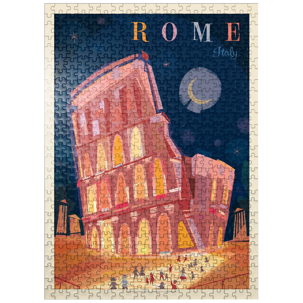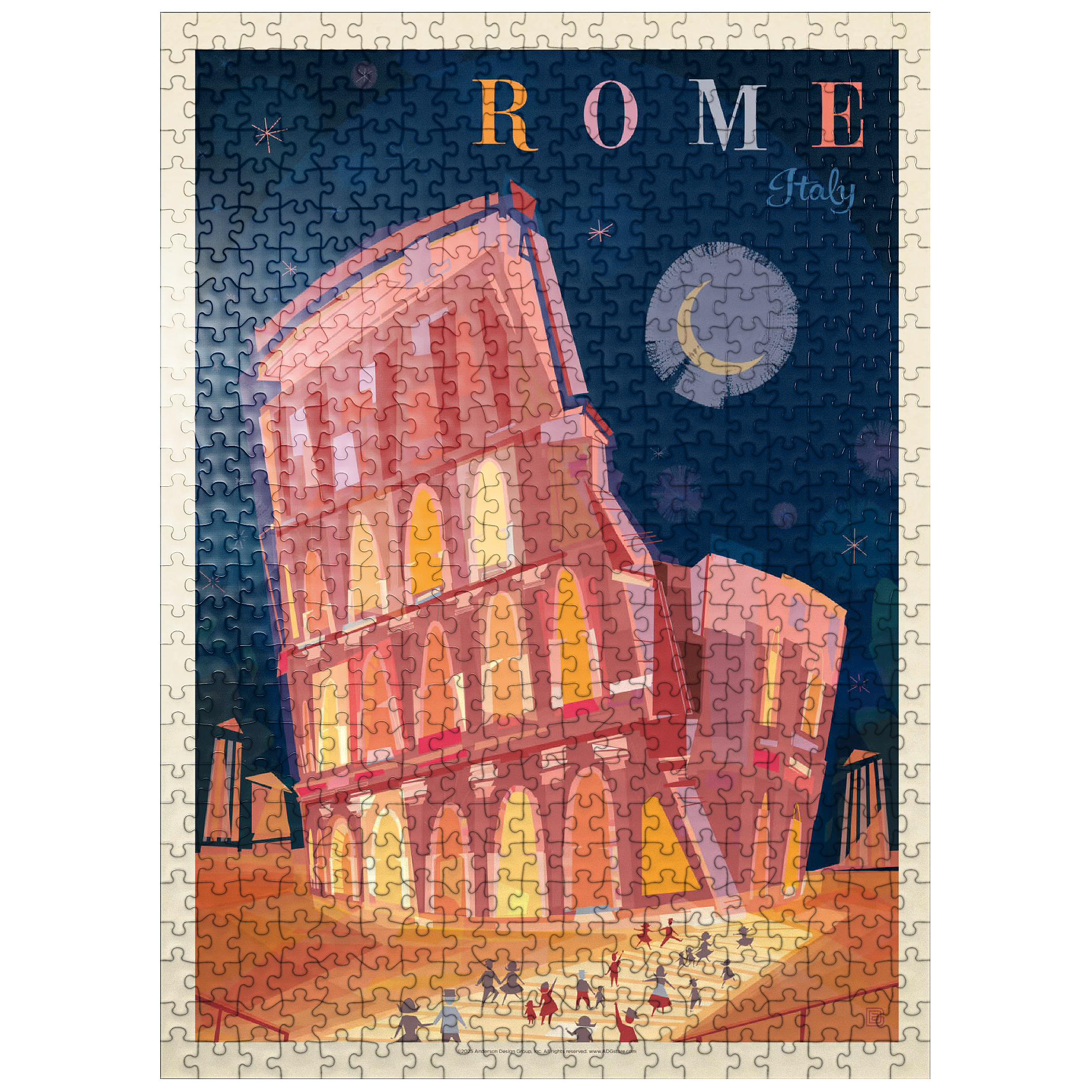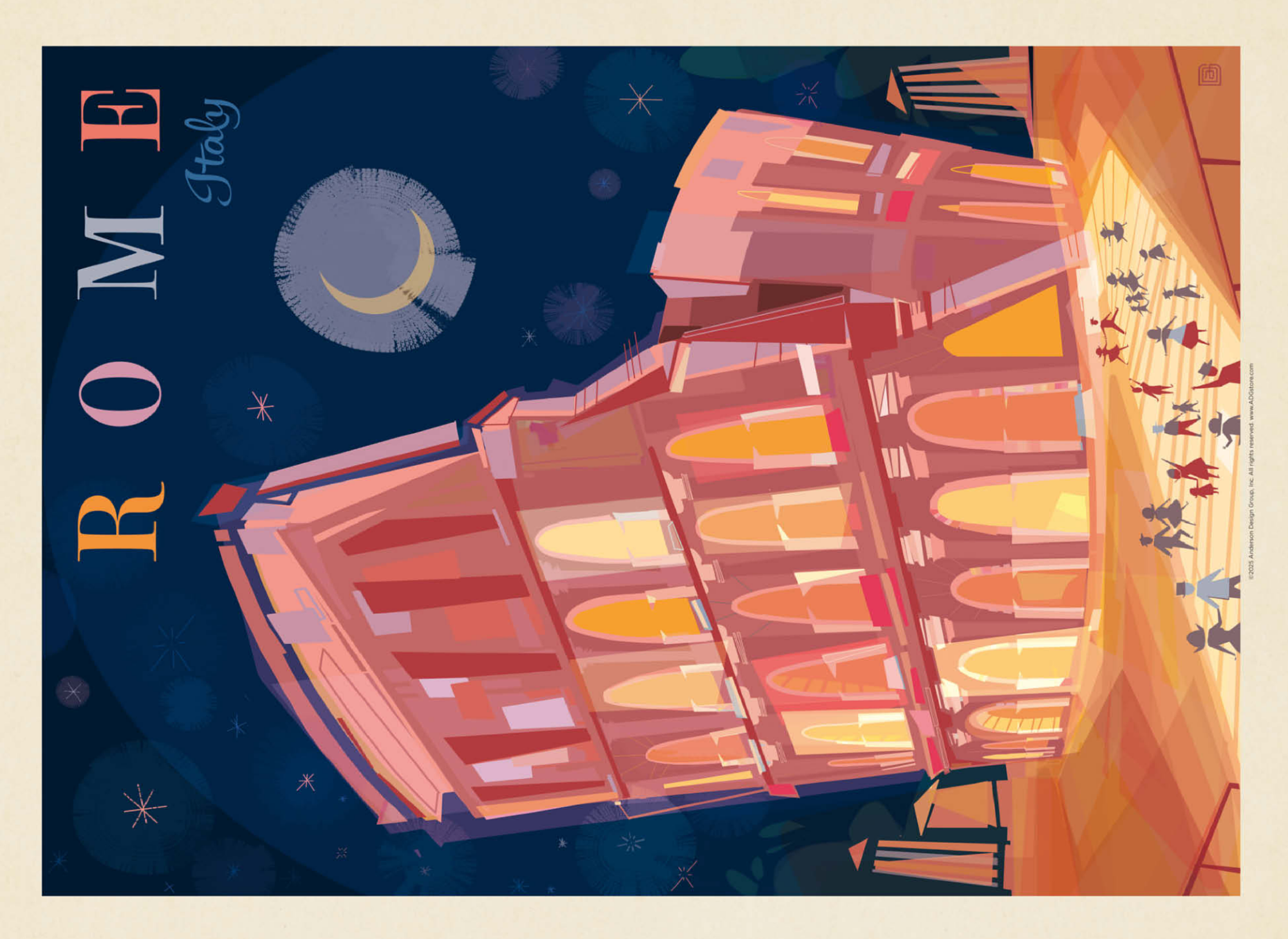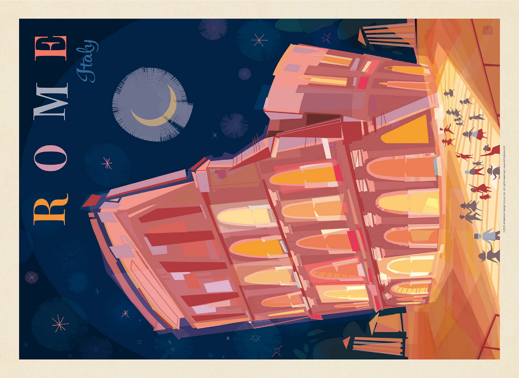 Step into the timeless grandeur of Rome, Italy, with this vibrant depiction of the iconic Colosseum under a starlit sky. The artwork captures the glowing arches of this ancient amphitheater, surrounded by lively crowds, celebrating the eternal city's rich history and culture.