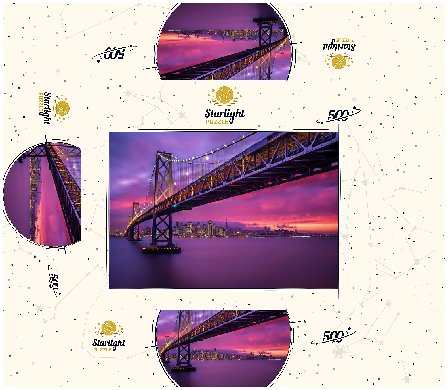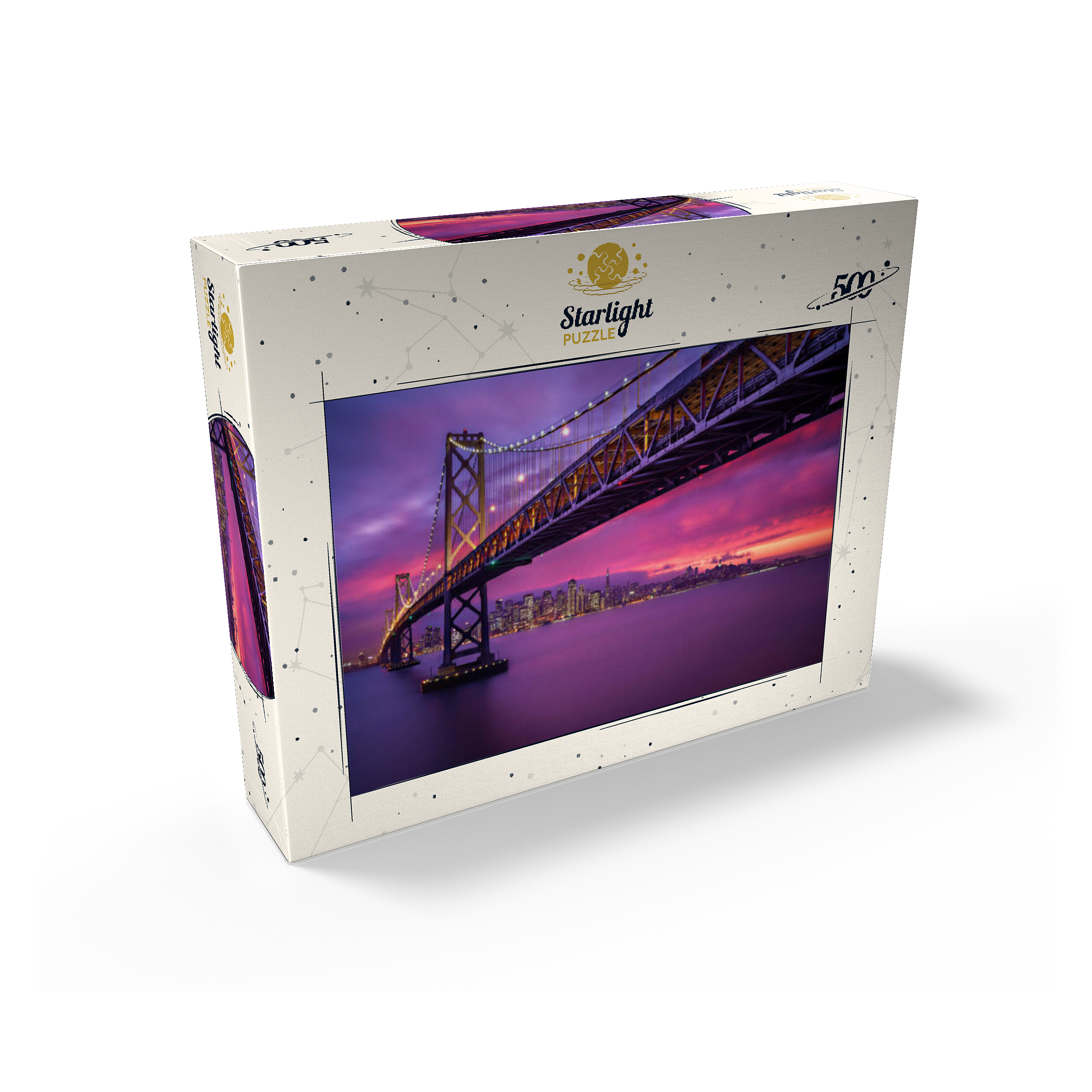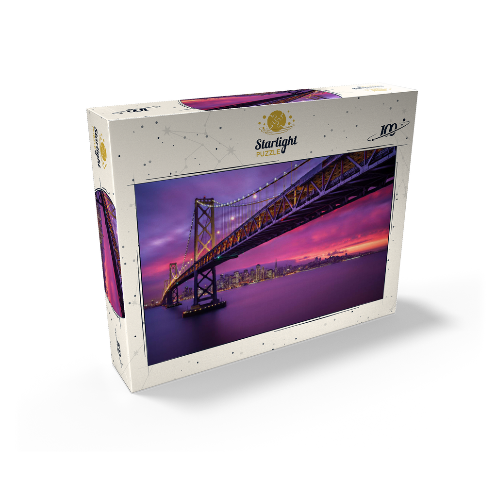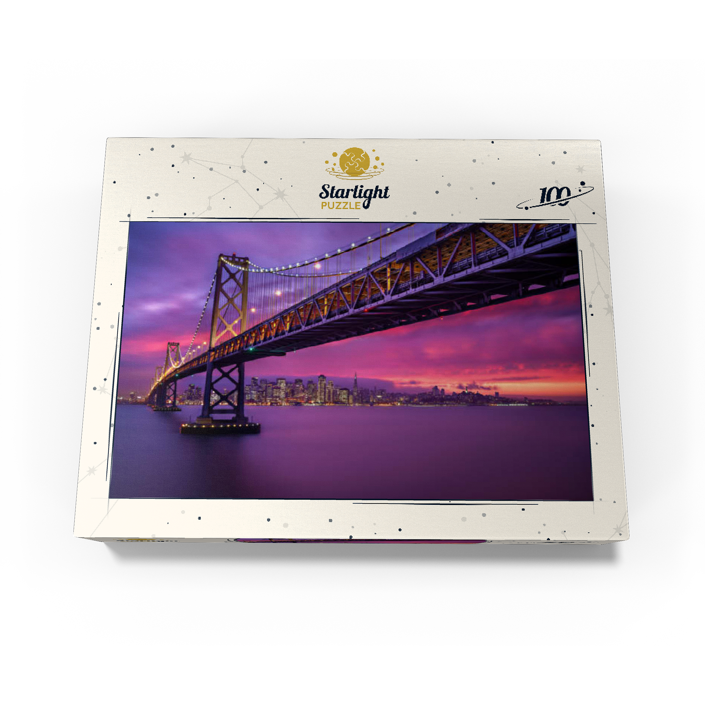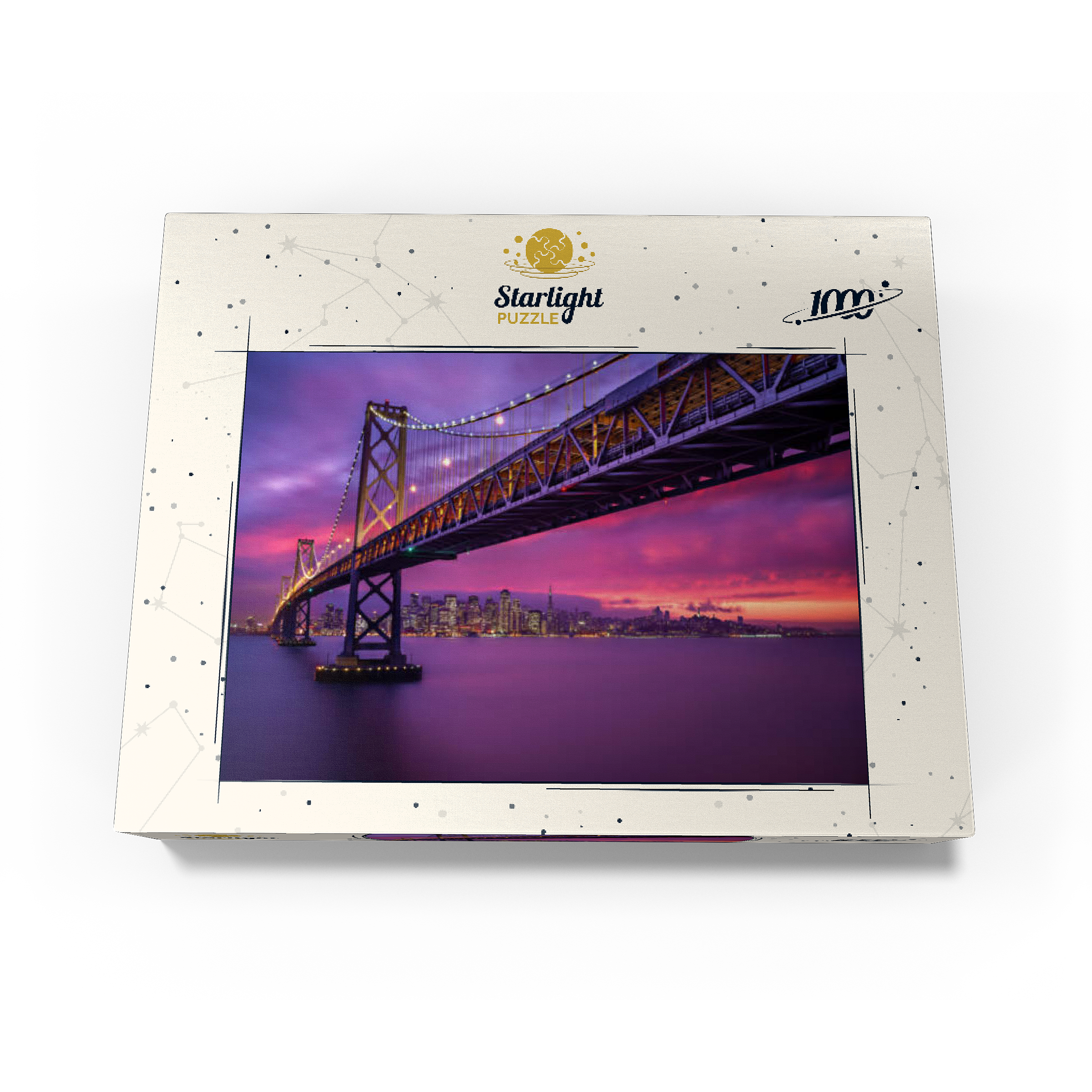 This stunning view showcases the iconic San Francisco-Oakland Bay Bridge stretching across the calm waters of the bay as vibrant city lights illuminate the skyline at dusk. Captured during a spectacular sunset, the sky glows with rich purple, magenta, and orange hues, enhancing the dramatic silhouette of the bridge and the city beyond. The Transamerica Pyramid and downtown San Francisco are visible in the background, making this image a perfect representation of California's architectural and urban charm. A favorite destination for travelers and photographers alike, this landmark is a symbol of connectivity and coastal beauty in the Bay Area.