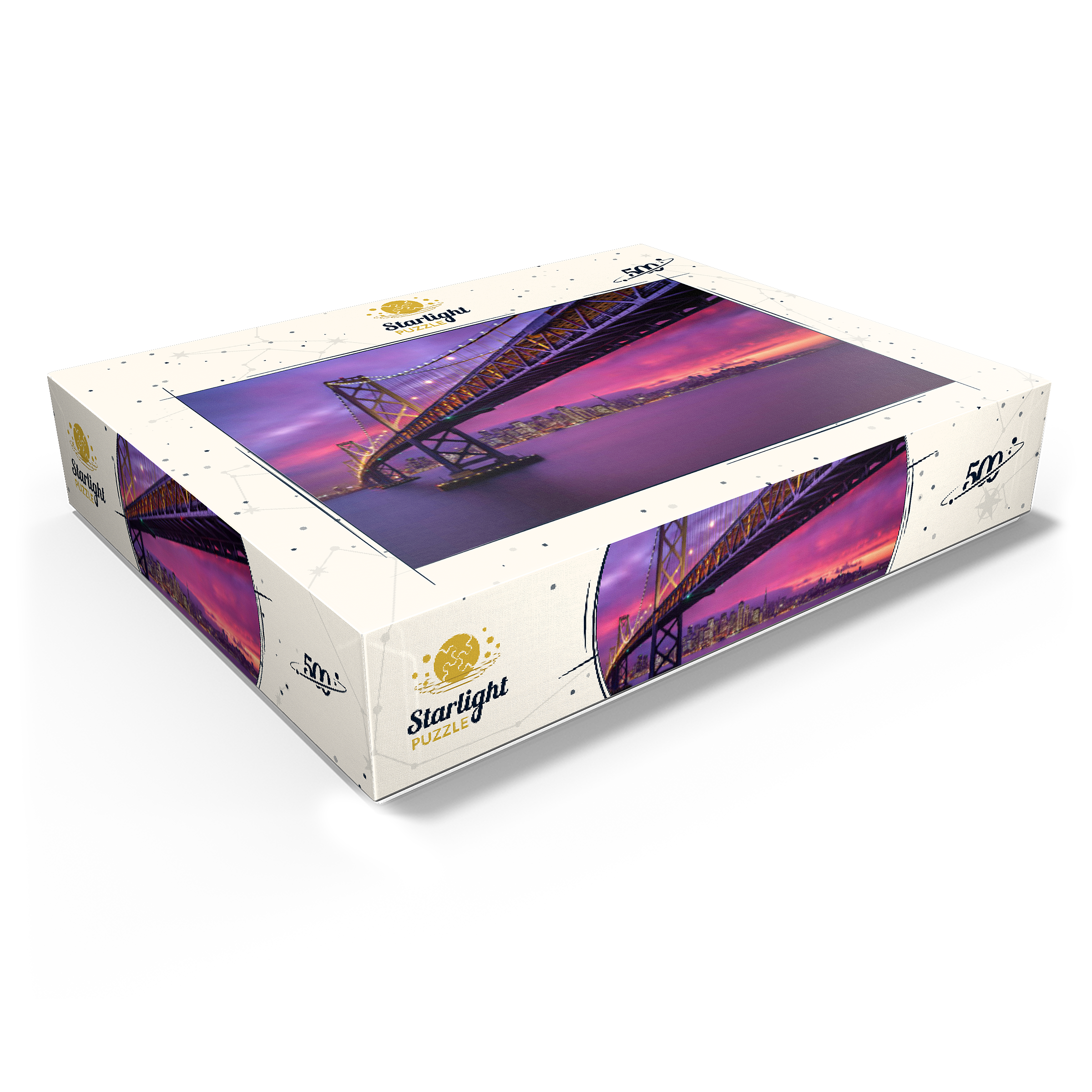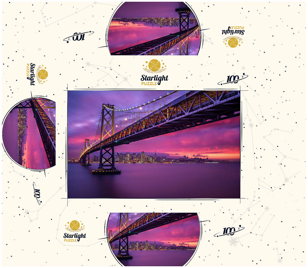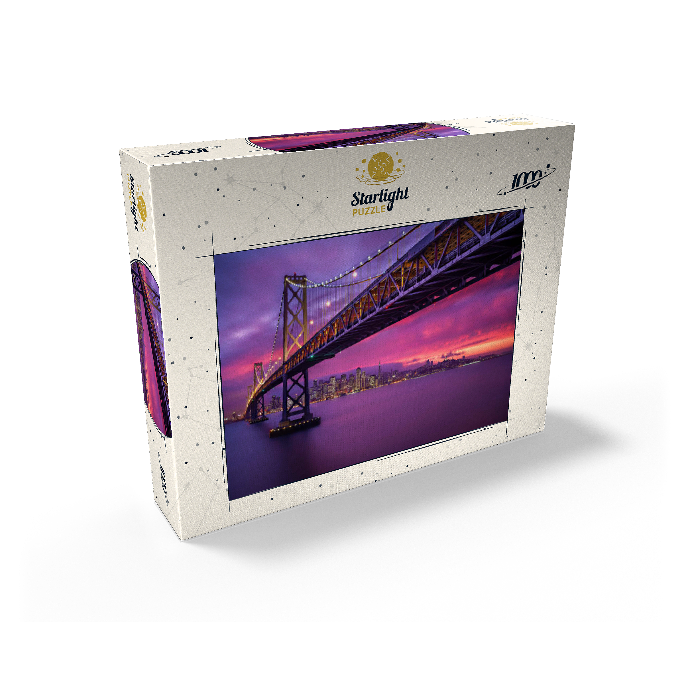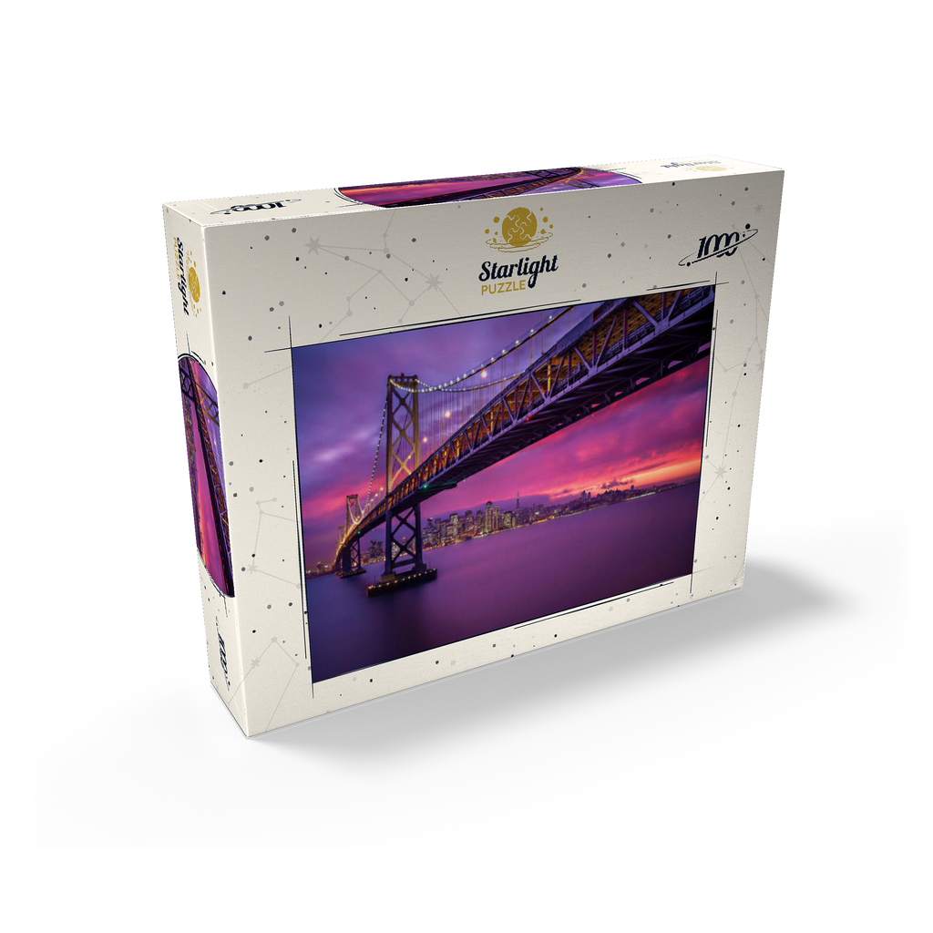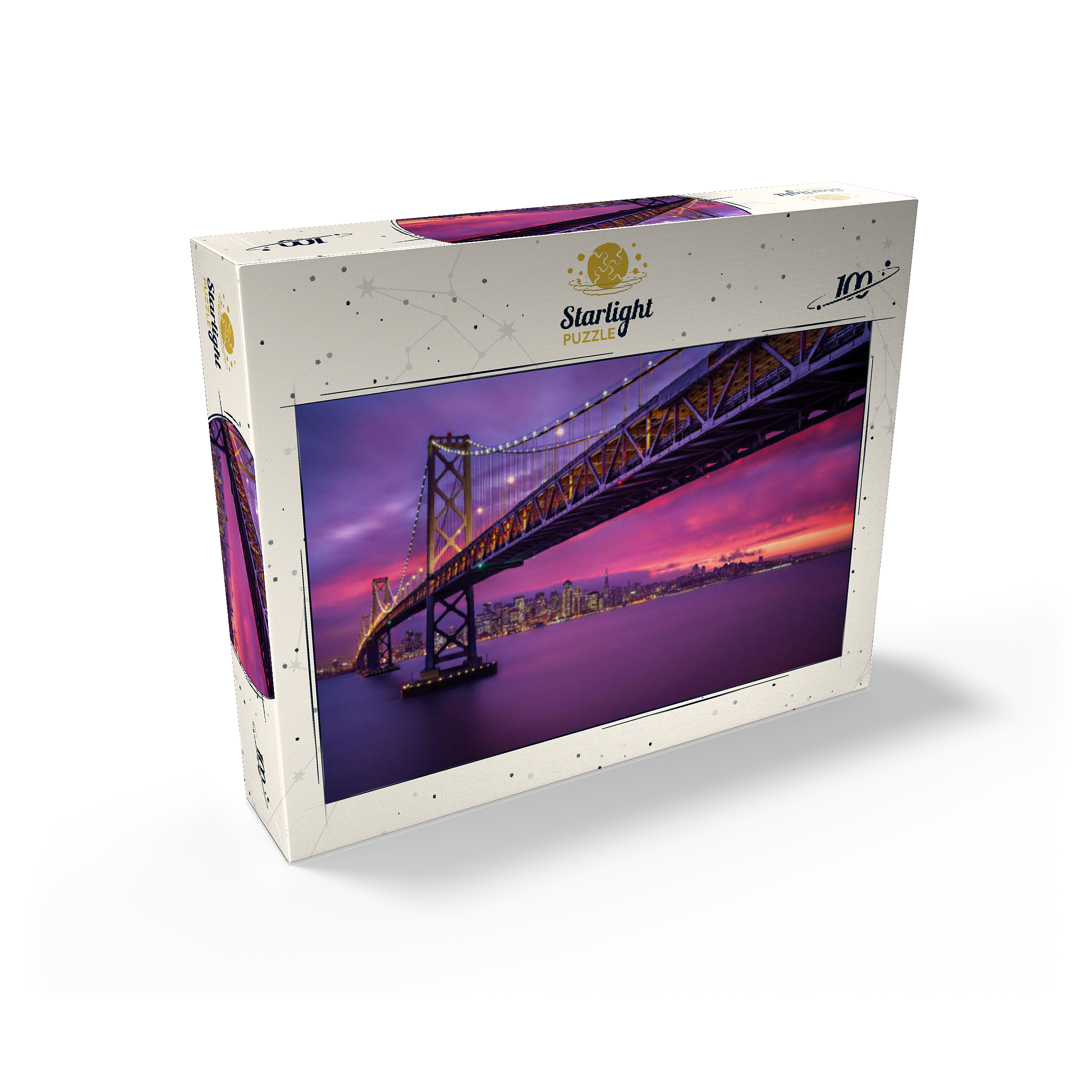 This stunning view showcases the iconic San Francisco-Oakland Bay Bridge stretching across the calm waters of the bay as vibrant city lights illuminate the skyline at dusk. Captured during a spectacular sunset, the sky glows with rich purple, magenta, and orange hues, enhancing the dramatic silhouette of the bridge and the city beyond. The Transamerica Pyramid and downtown San Francisco are visible in the background, making this image a perfect representation of California's architectural and urban charm. A favorite destination for travelers and photographers alike, this landmark is a symbol of connectivity and coastal beauty in the Bay Area.
