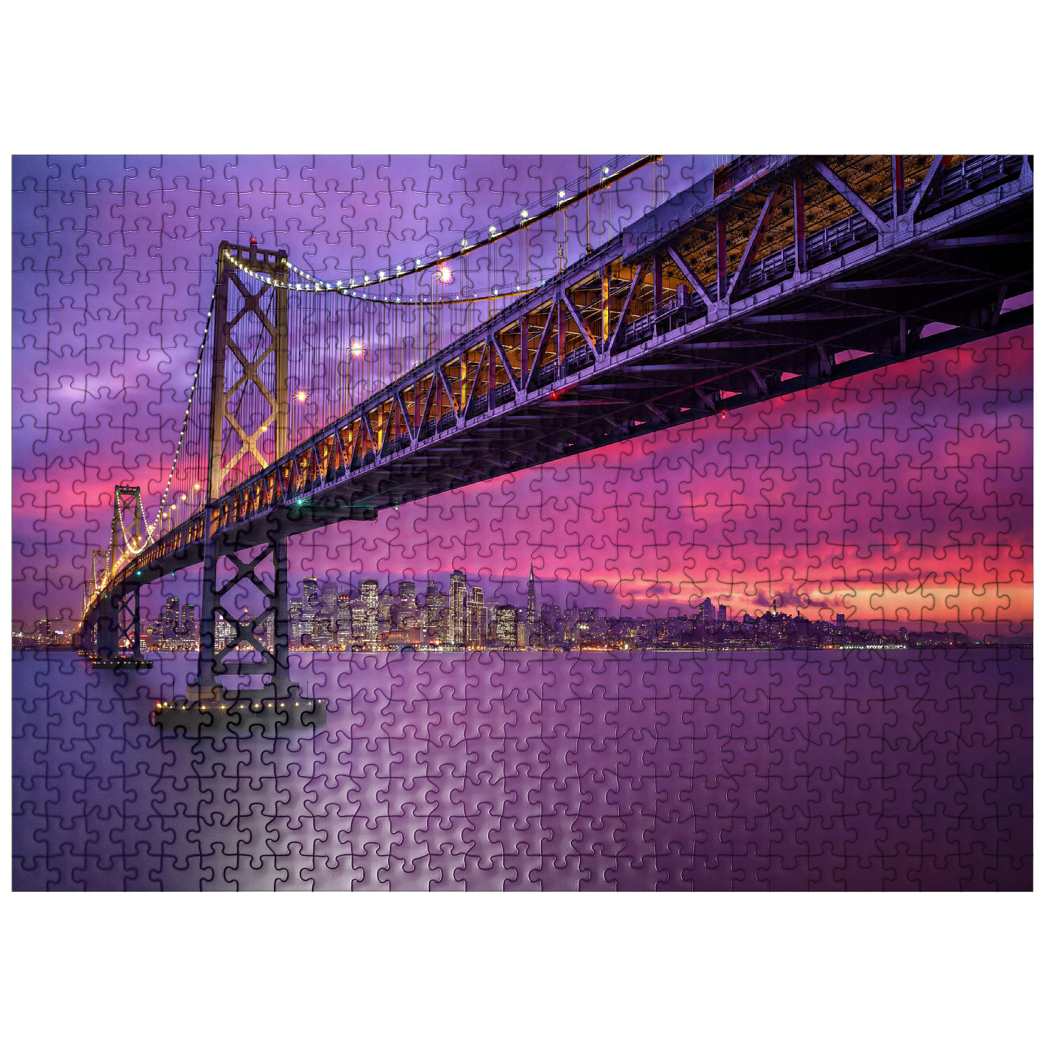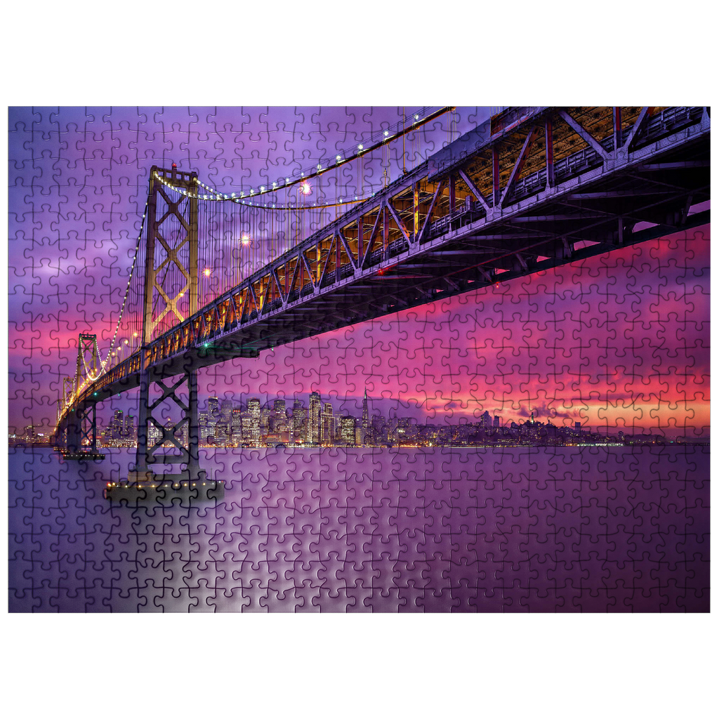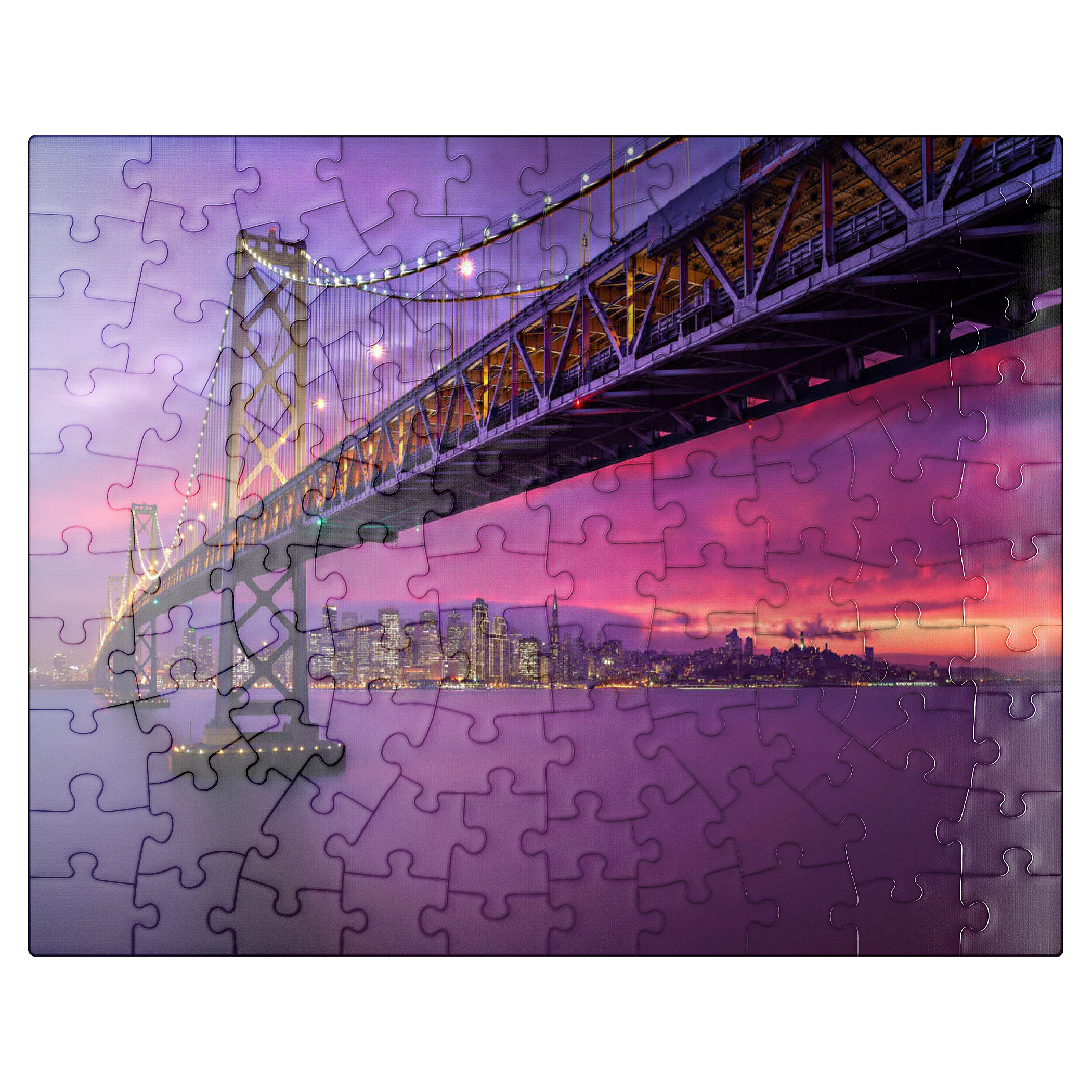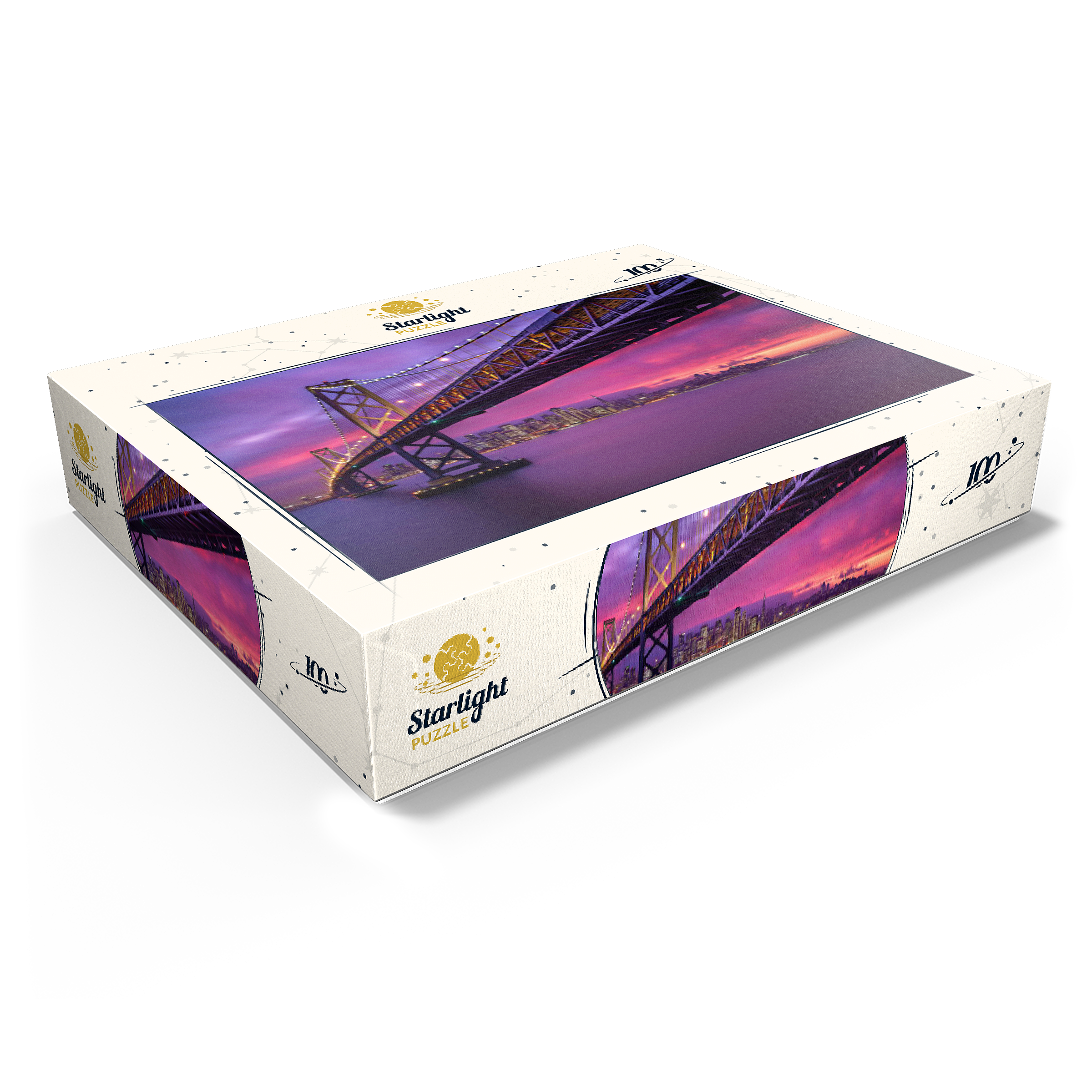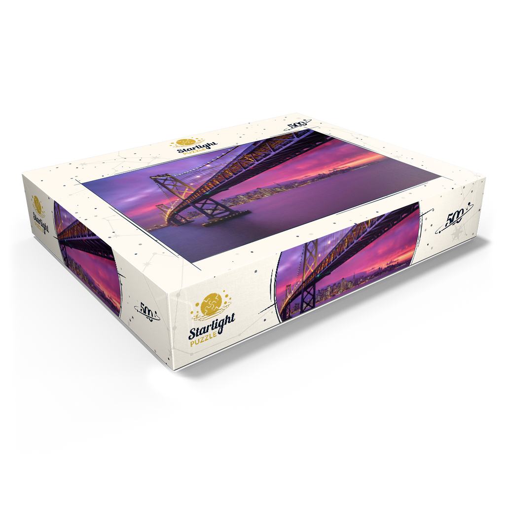 This stunning view showcases the iconic San Francisco-Oakland Bay Bridge stretching across the calm waters of the bay as vibrant city lights illuminate the skyline at dusk. Captured during a spectacular sunset, the sky glows with rich purple, magenta, and orange hues, enhancing the dramatic silhouette of the bridge and the city beyond. The Transamerica Pyramid and downtown San Francisco are visible in the background, making this image a perfect representation of California's architectural and urban charm. A favorite destination for travelers and photographers alike, this landmark is a symbol of connectivity and coastal beauty in the Bay Area.