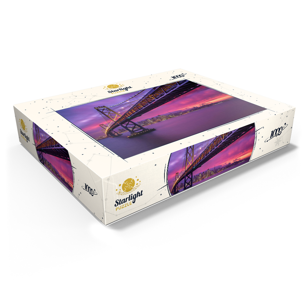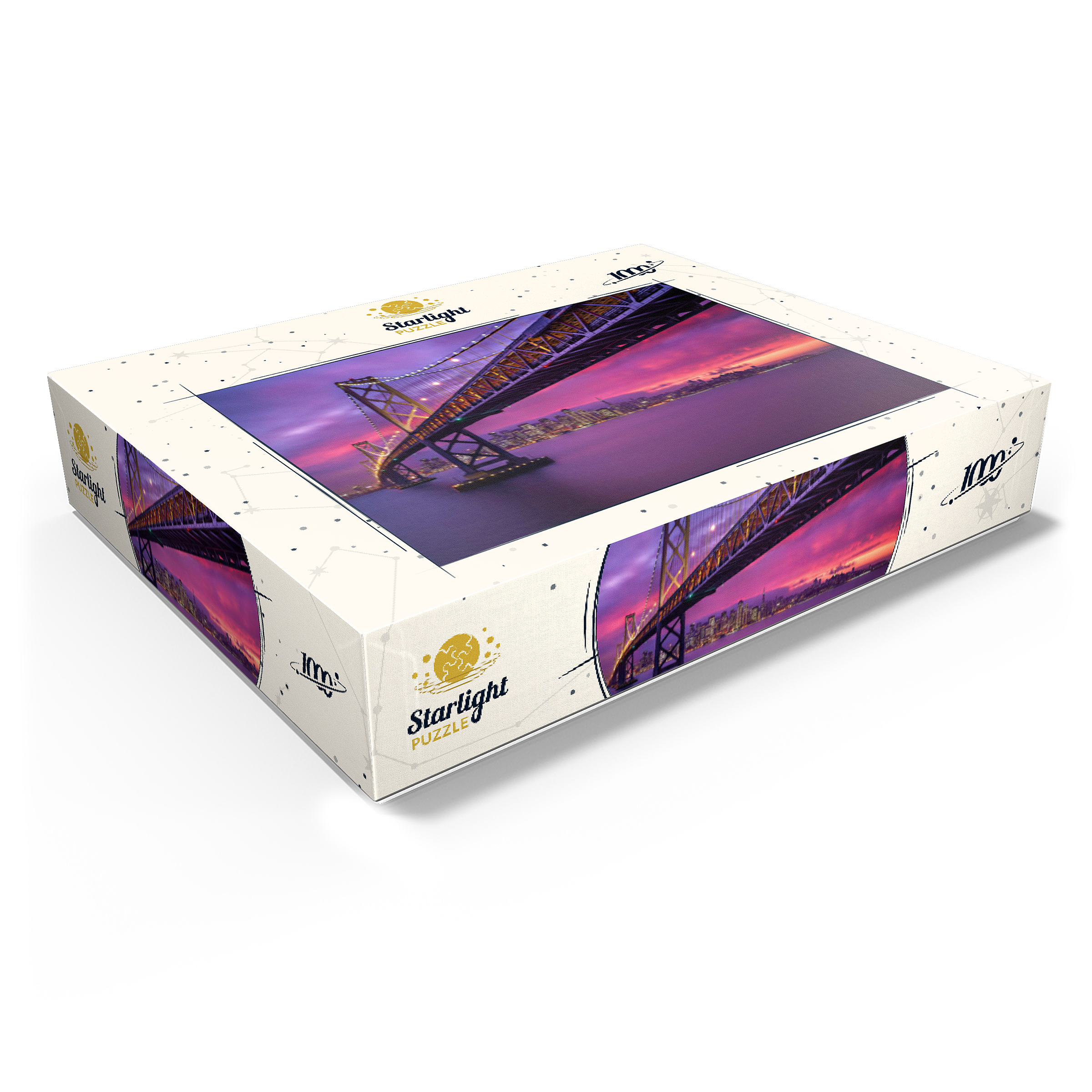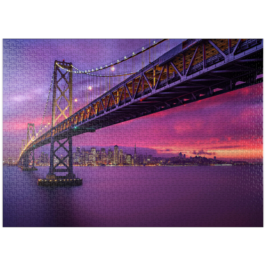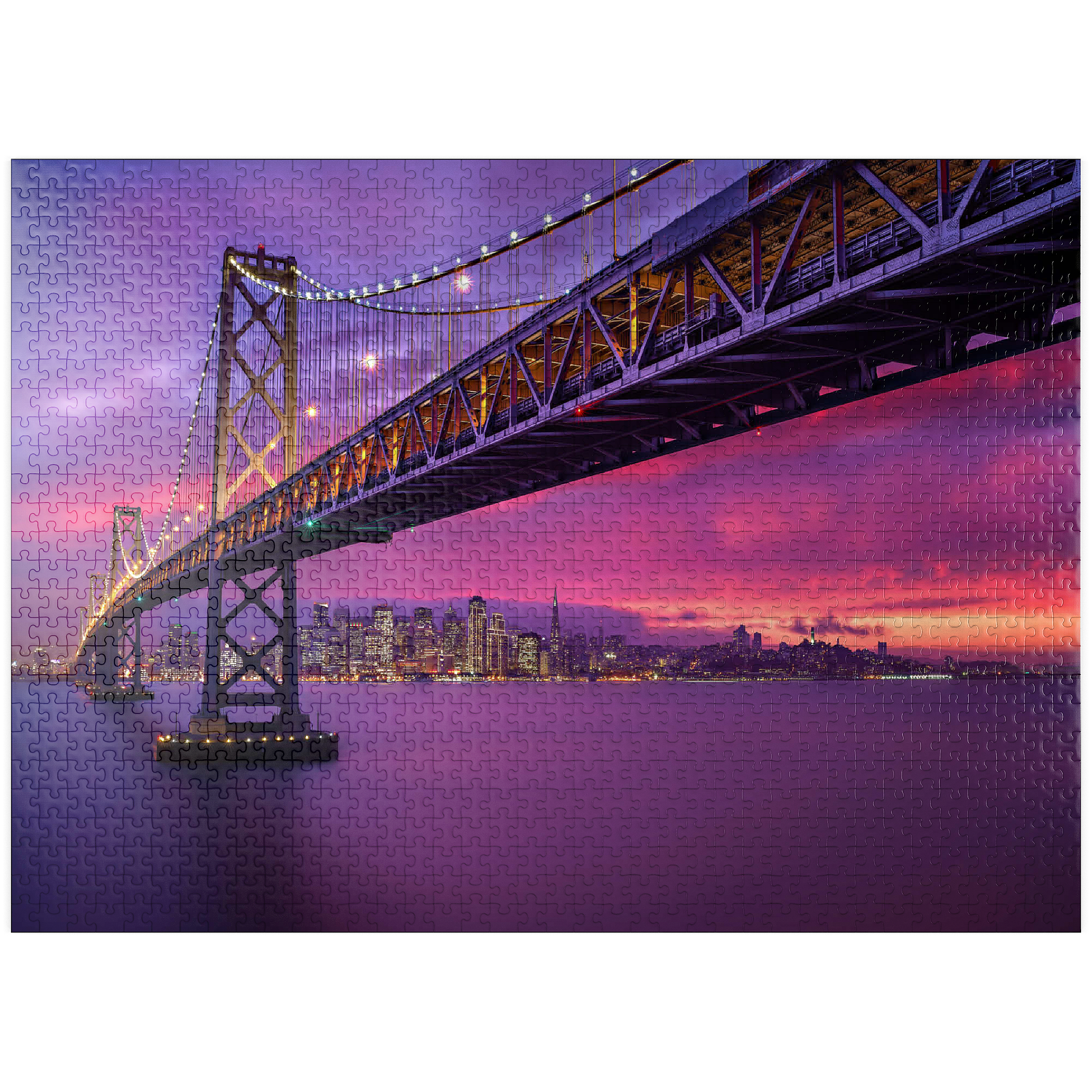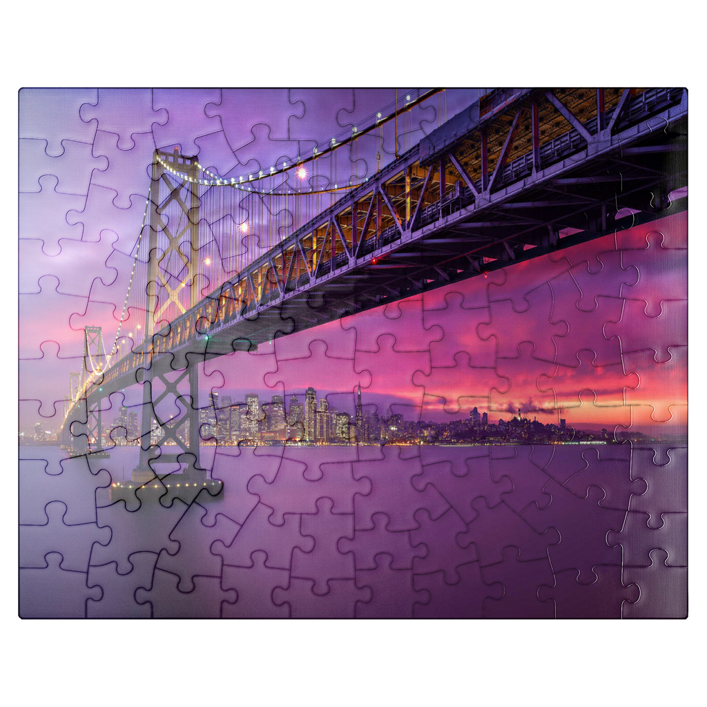 This stunning view showcases the iconic San Francisco-Oakland Bay Bridge stretching across the calm waters of the bay as vibrant city lights illuminate the skyline at dusk. Captured during a spectacular sunset, the sky glows with rich purple, magenta, and orange hues, enhancing the dramatic silhouette of the bridge and the city beyond. The Transamerica Pyramid and downtown San Francisco are visible in the background, making this image a perfect representation of California's architectural and urban charm. A favorite destination for travelers and photographers alike, this landmark is a symbol of connectivity and coastal beauty in the Bay Area.