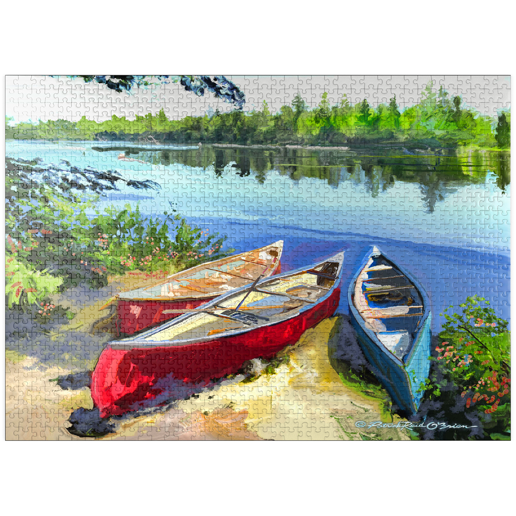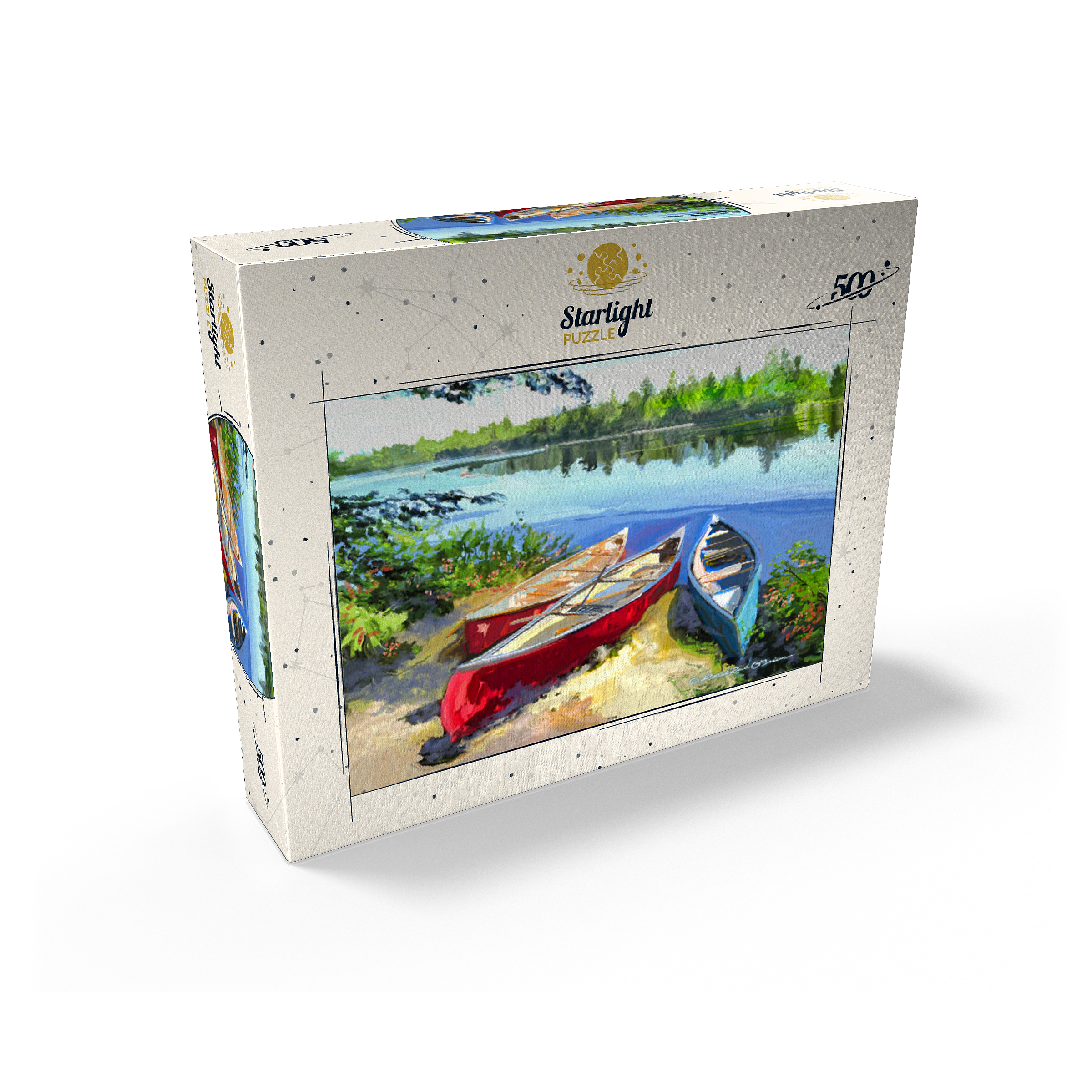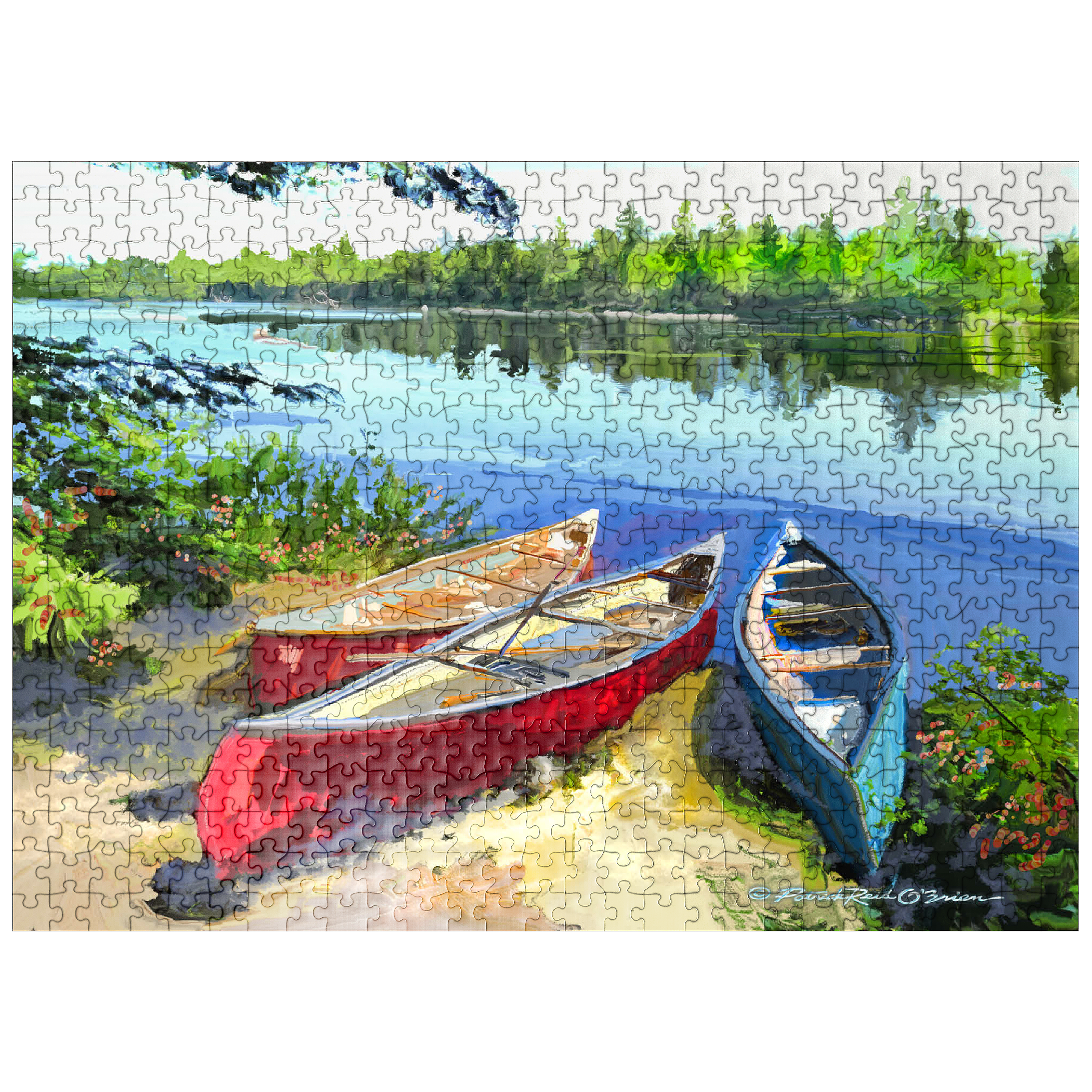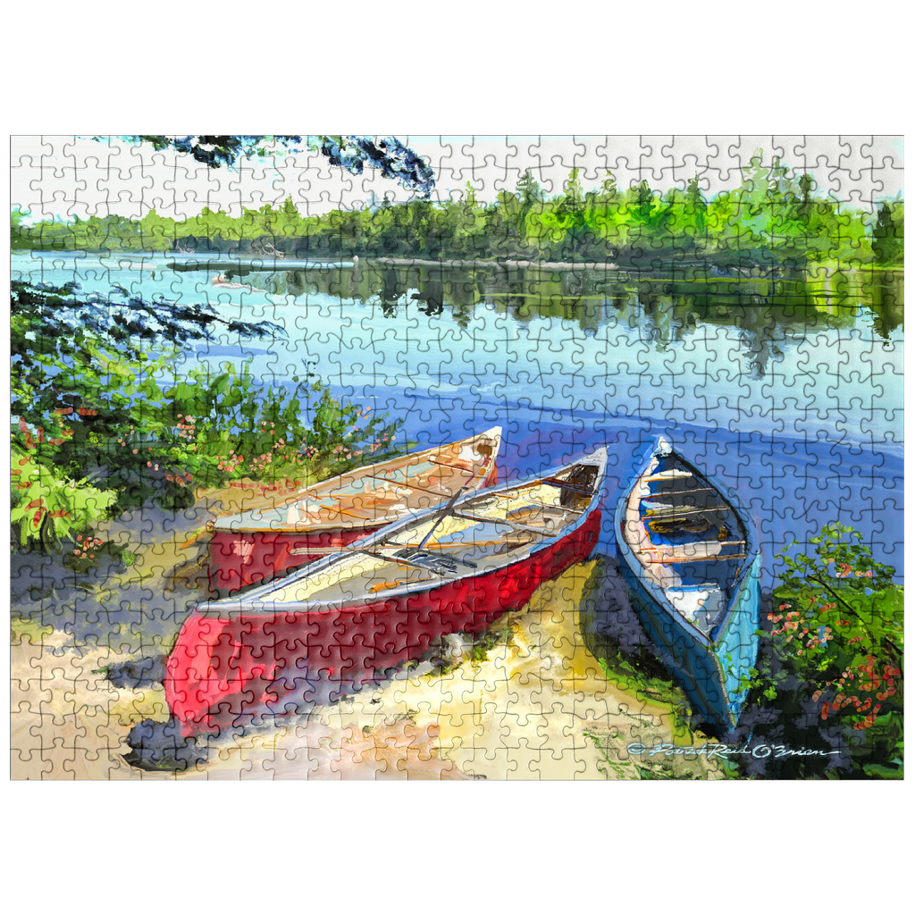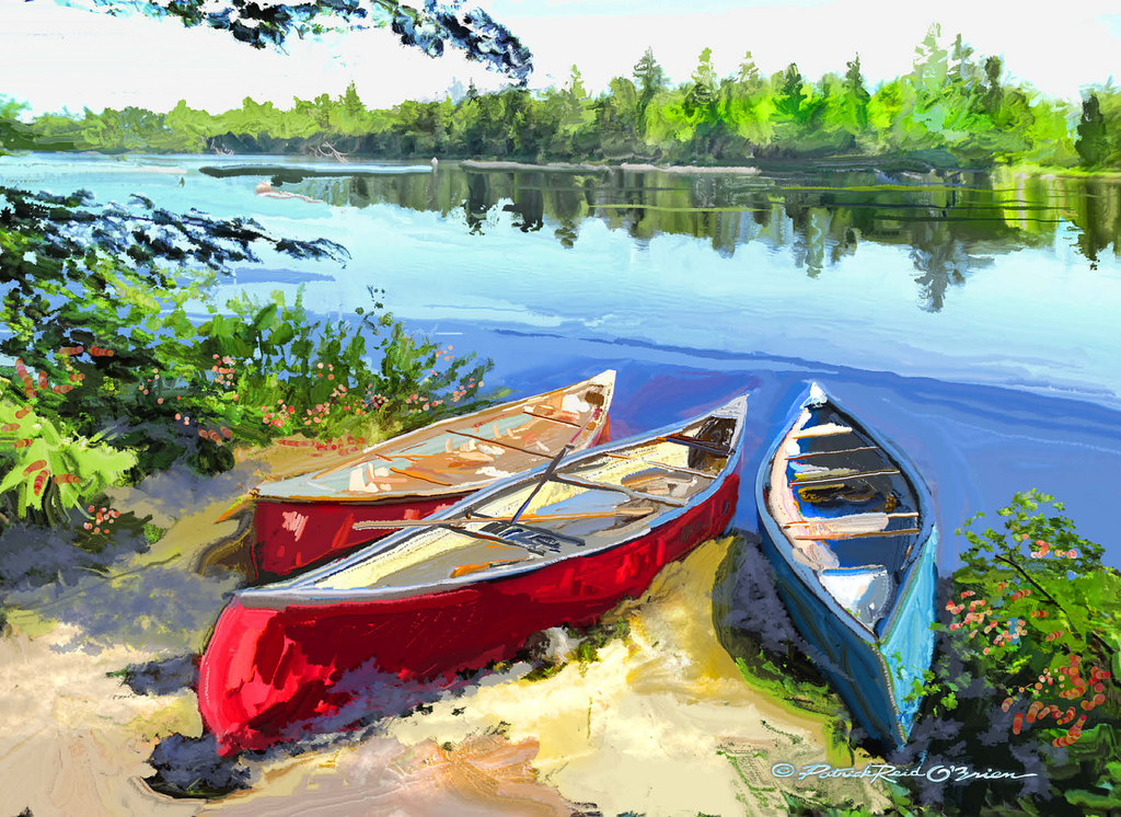 This beautifully detailed artwork captures a serene lakeside scene featuring three colorful canoes resting on the sandy shore. The calm, reflective water mirrors the lush green trees and bright blue sky, creating a peaceful and inviting atmosphere. Vibrant red and blue canoes add a striking contrast to the natural surroundings, evoking a sense of adventure and relaxation. With its impressionistic style and rich textures, this piece is perfect for nature lovers, outdoor enthusiasts, and those who appreciate the beauty of lakeside tranquility.