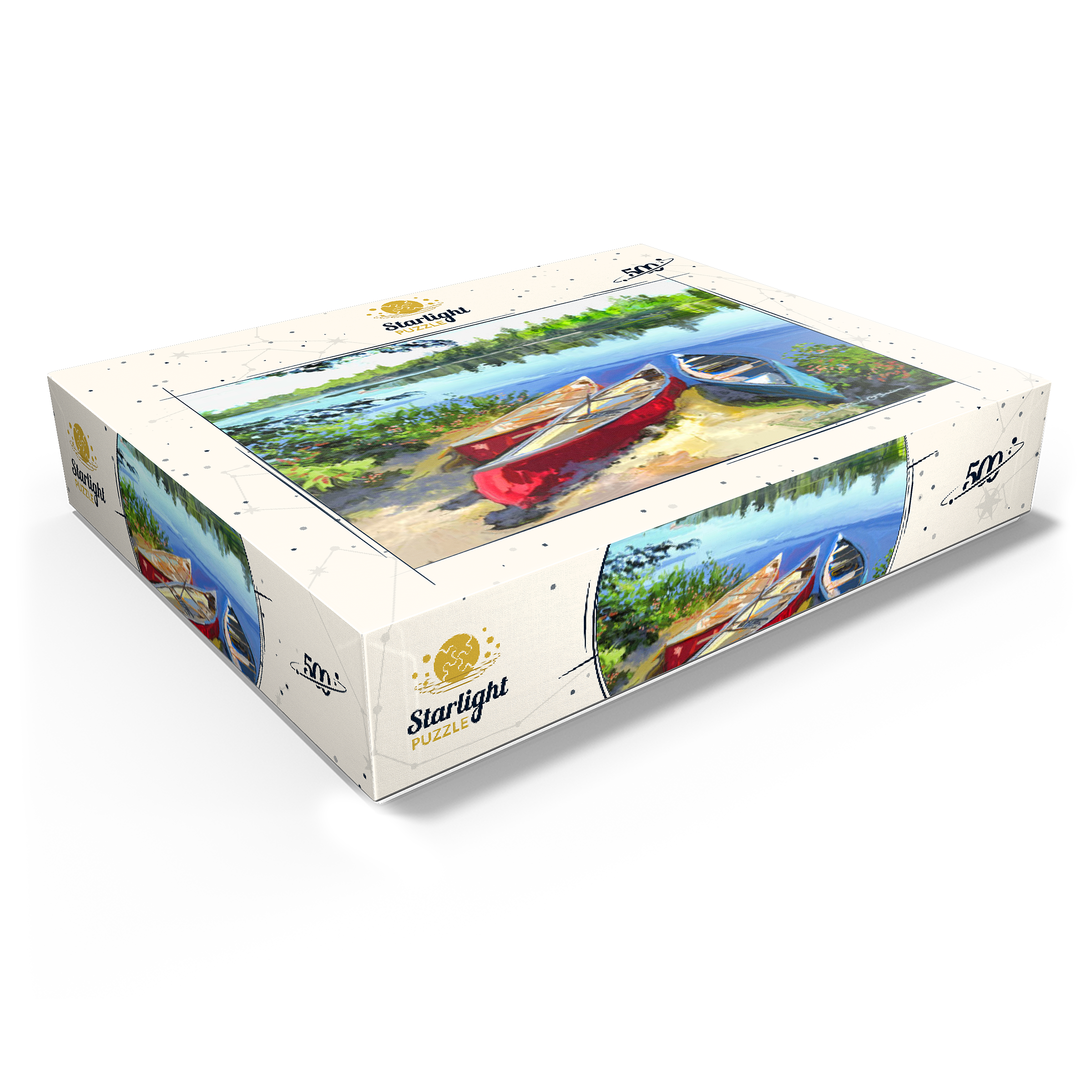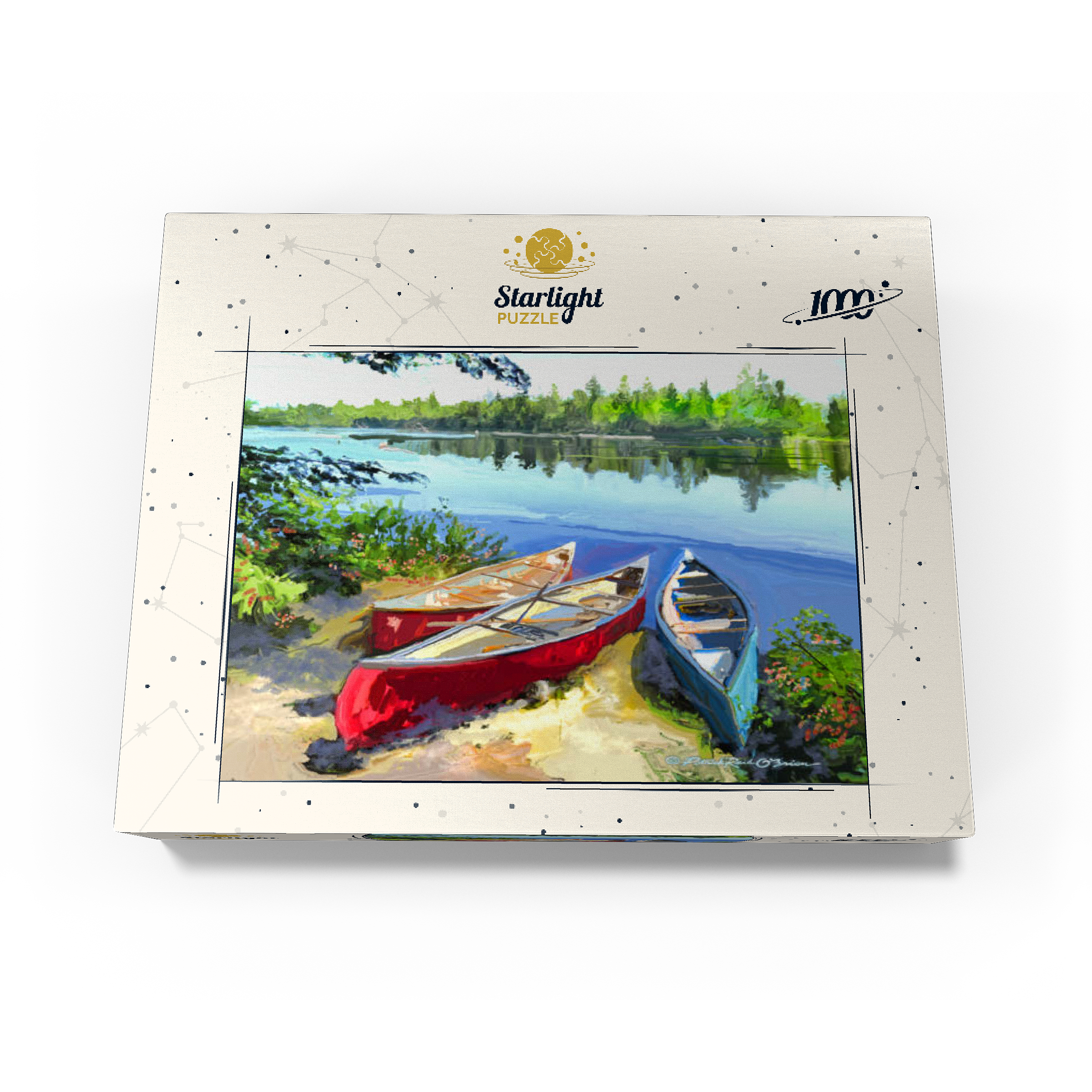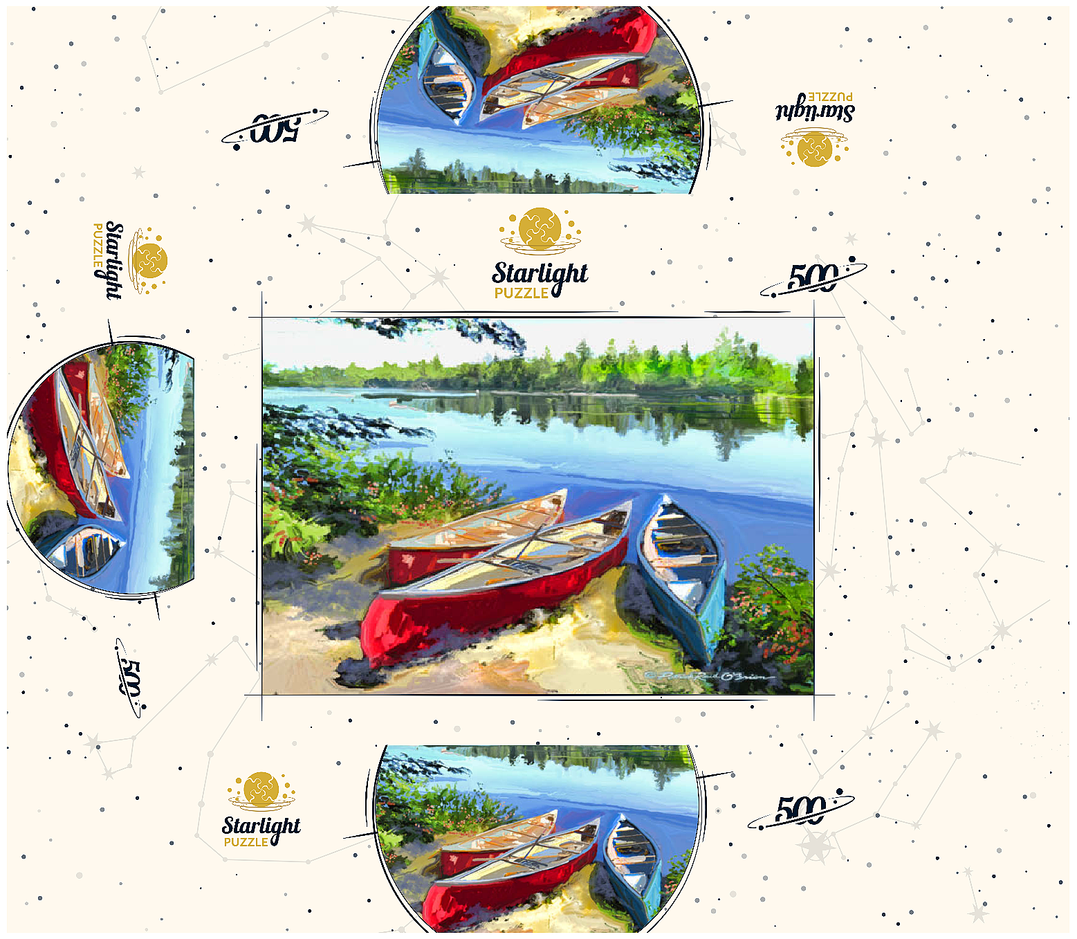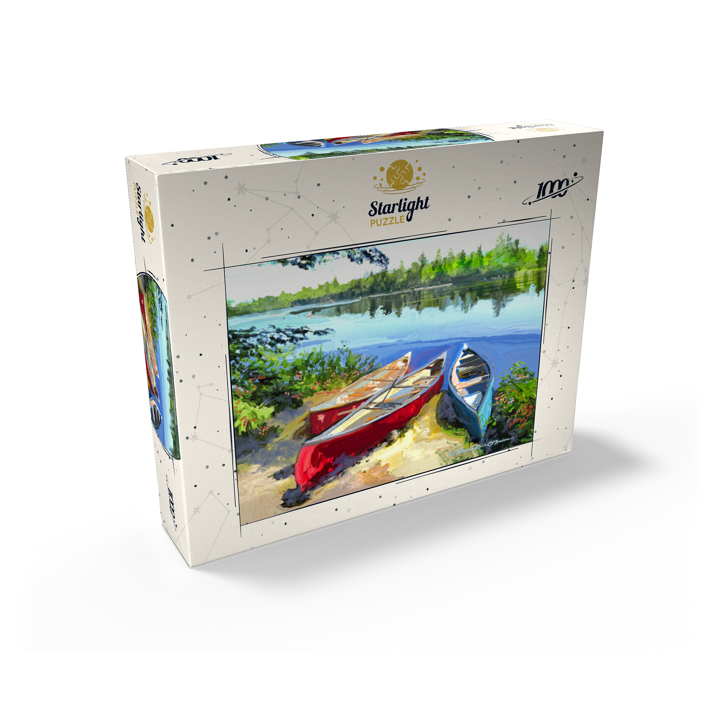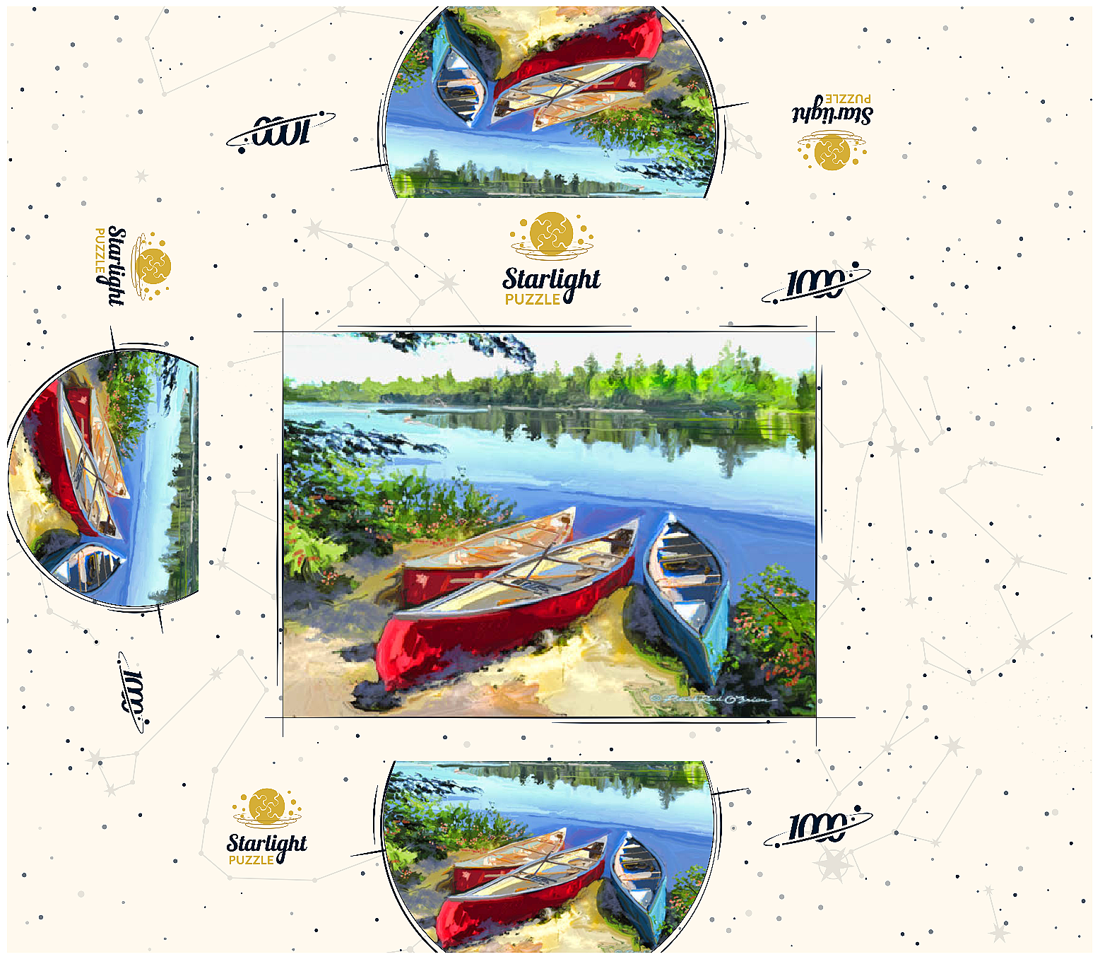 This beautifully detailed artwork captures a serene lakeside scene featuring three colorful canoes resting on the sandy shore. The calm, reflective water mirrors the lush green trees and bright blue sky, creating a peaceful and inviting atmosphere. Vibrant red and blue canoes add a striking contrast to the natural surroundings, evoking a sense of adventure and relaxation. With its impressionistic style and rich textures, this piece is perfect for nature lovers, outdoor enthusiasts, and those who appreciate the beauty of lakeside tranquility.