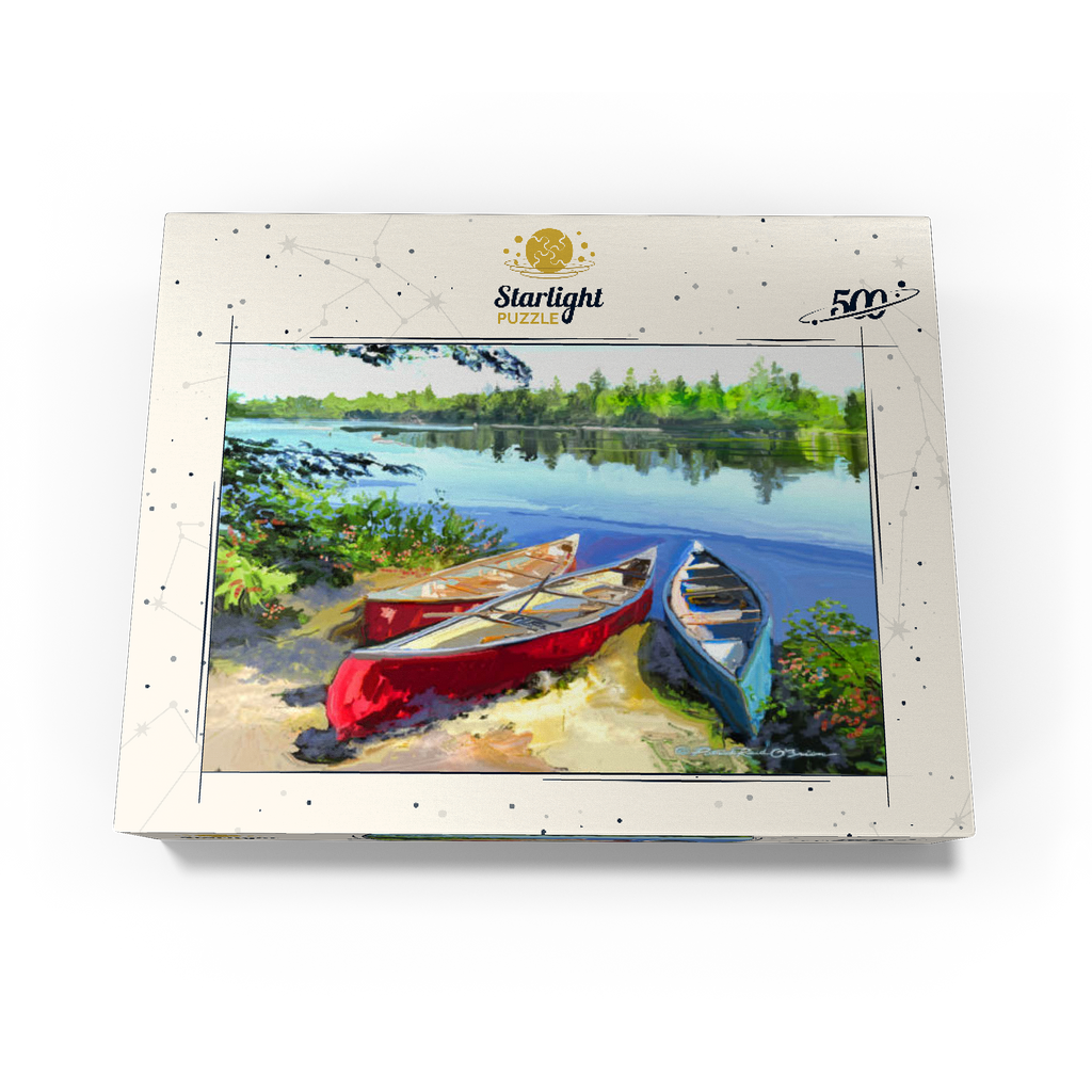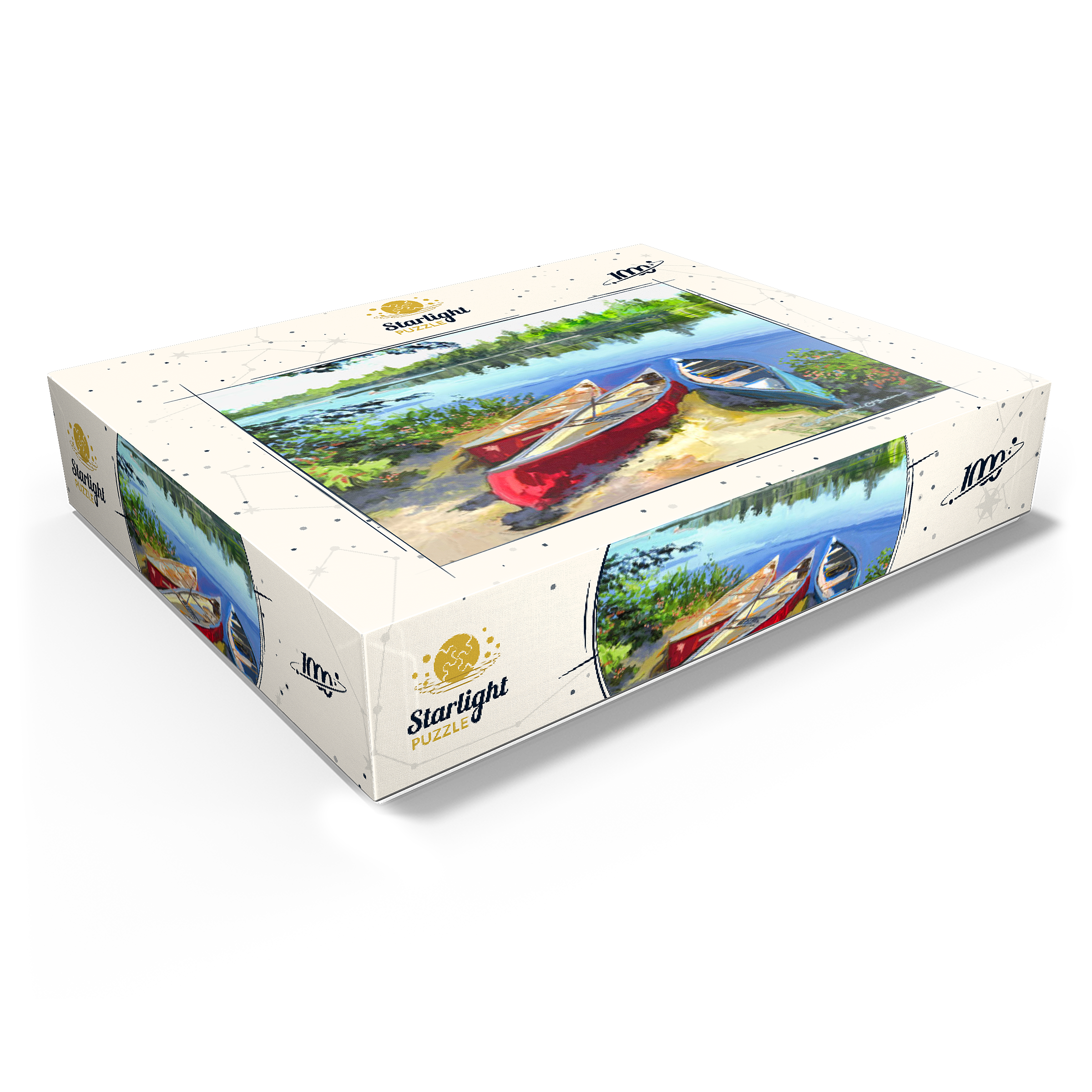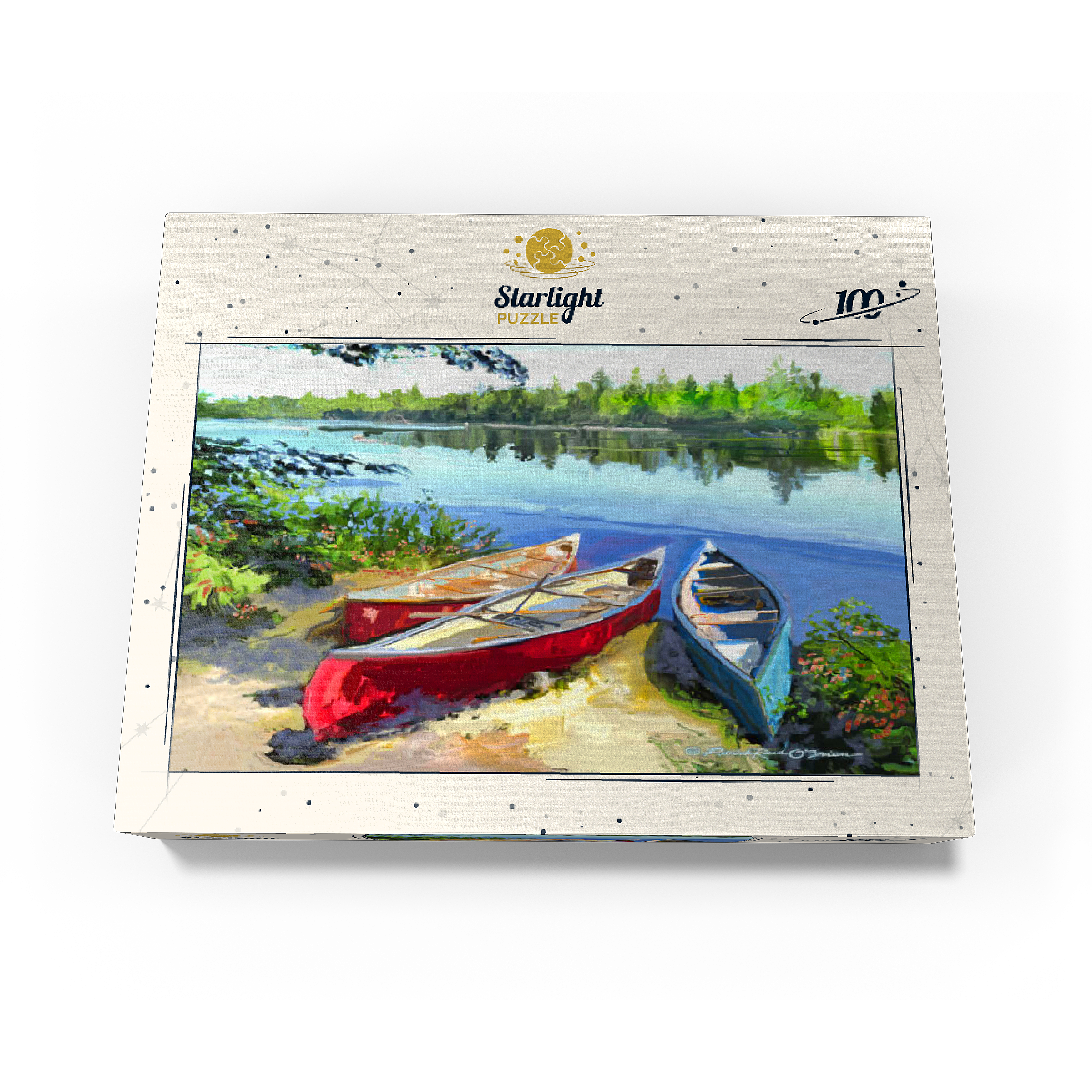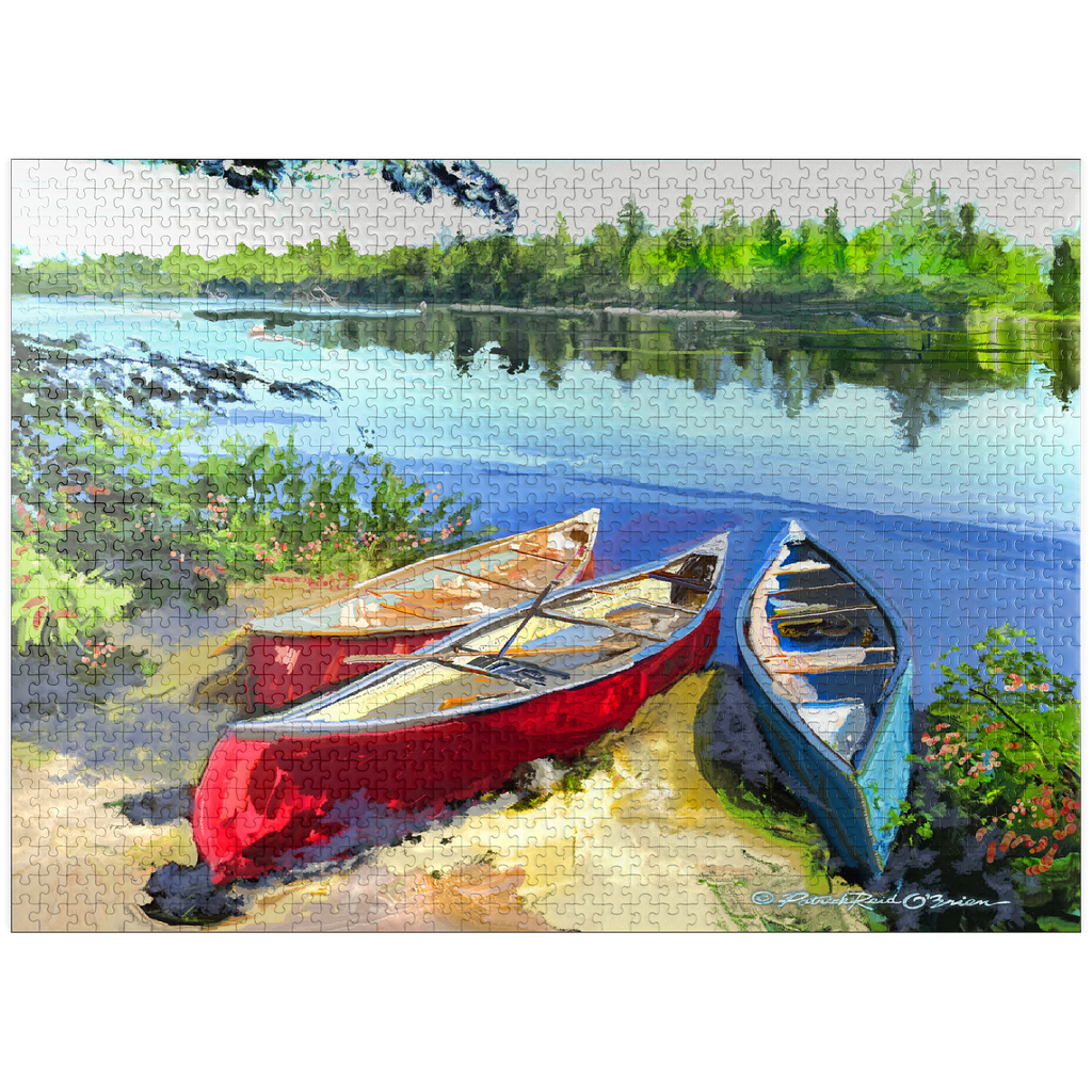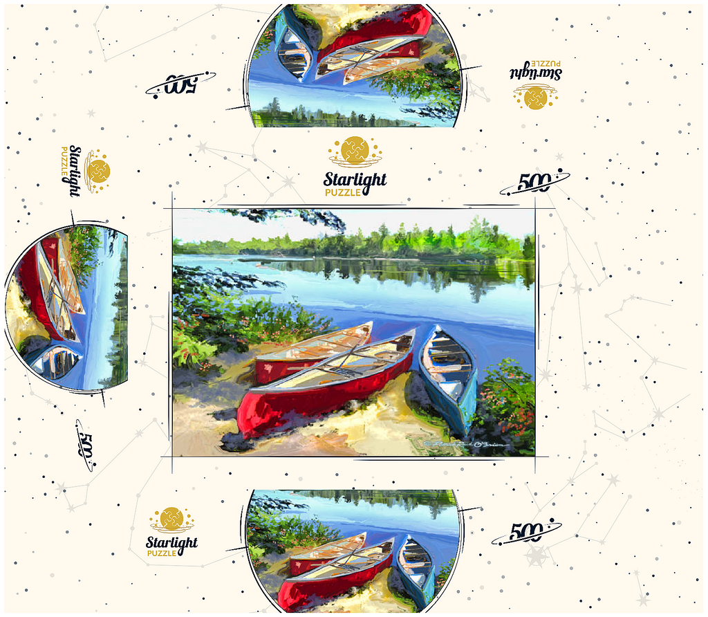 This beautifully detailed artwork captures a serene lakeside scene featuring three colorful canoes resting on the sandy shore. The calm, reflective water mirrors the lush green trees and bright blue sky, creating a peaceful and inviting atmosphere. Vibrant red and blue canoes add a striking contrast to the natural surroundings, evoking a sense of adventure and relaxation. With its impressionistic style and rich textures, this piece is perfect for nature lovers, outdoor enthusiasts, and those who appreciate the beauty of lakeside tranquility.