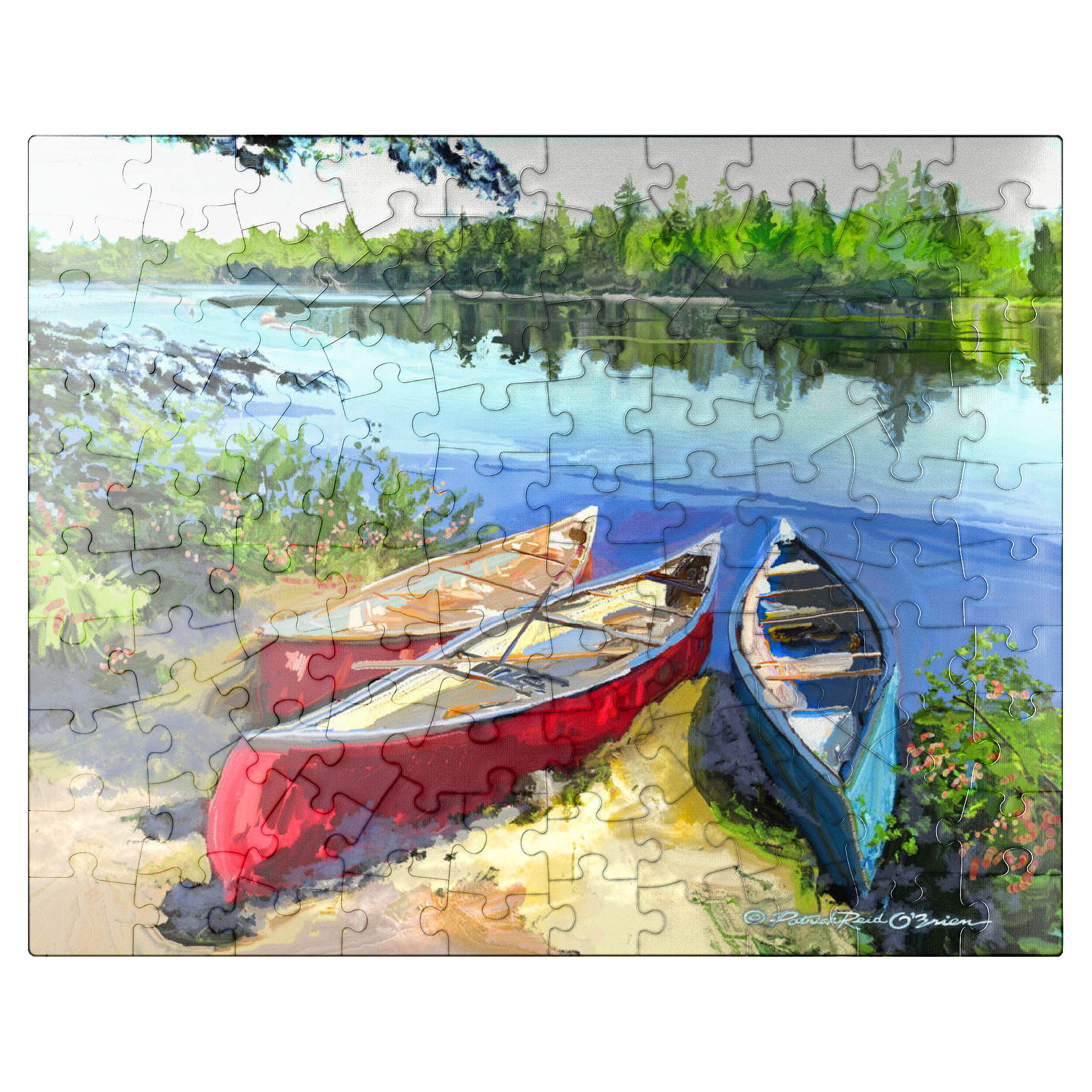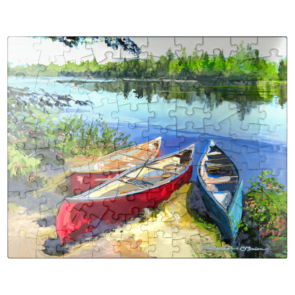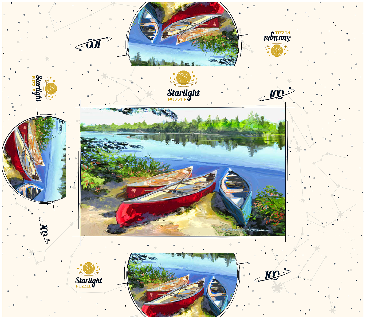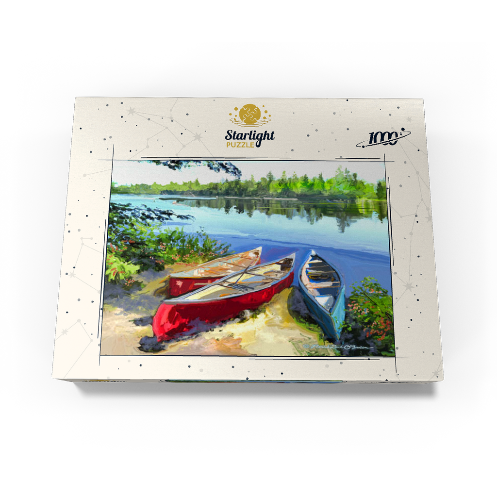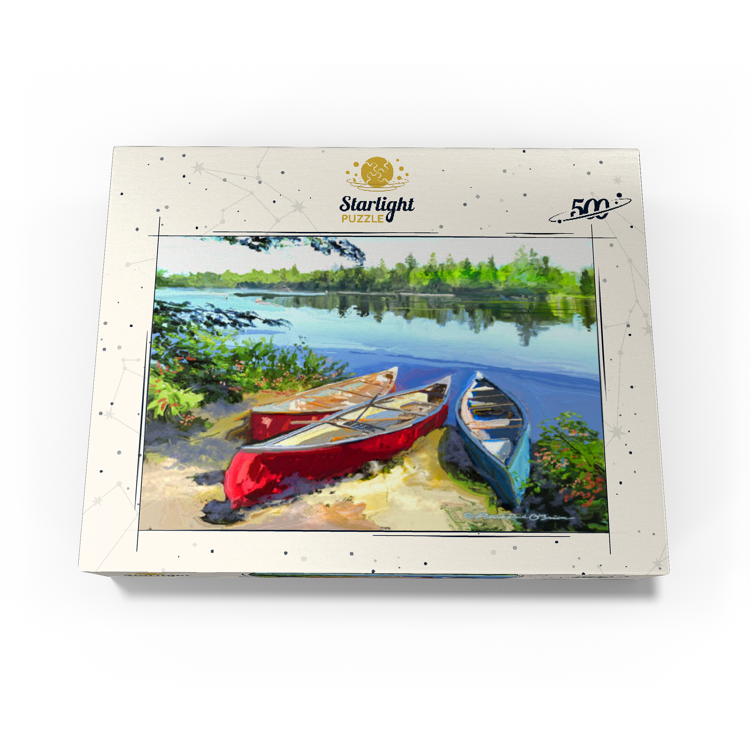This beautifully detailed artwork captures a serene lakeside scene featuring three colorful canoes resting on the sandy shore. The calm, reflective water mirrors the lush green trees and bright blue sky, creating a peaceful and inviting atmosphere. Vibrant red and blue canoes add a striking contrast to the natural surroundings, evoking a sense of adventure and relaxation. With its impressionistic style and rich textures, this piece is perfect for nature lovers, outdoor enthusiasts, and those who appreciate the beauty of lakeside tranquility.