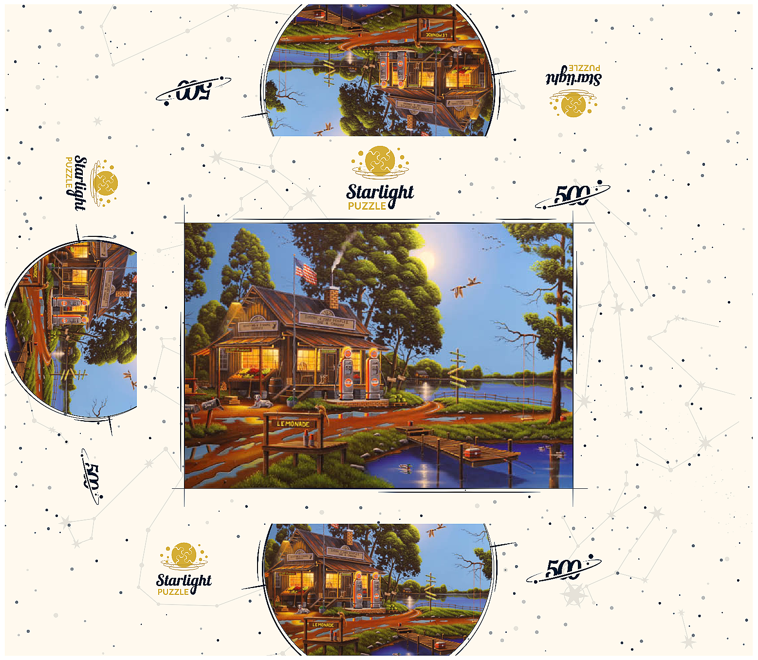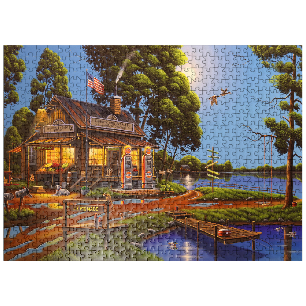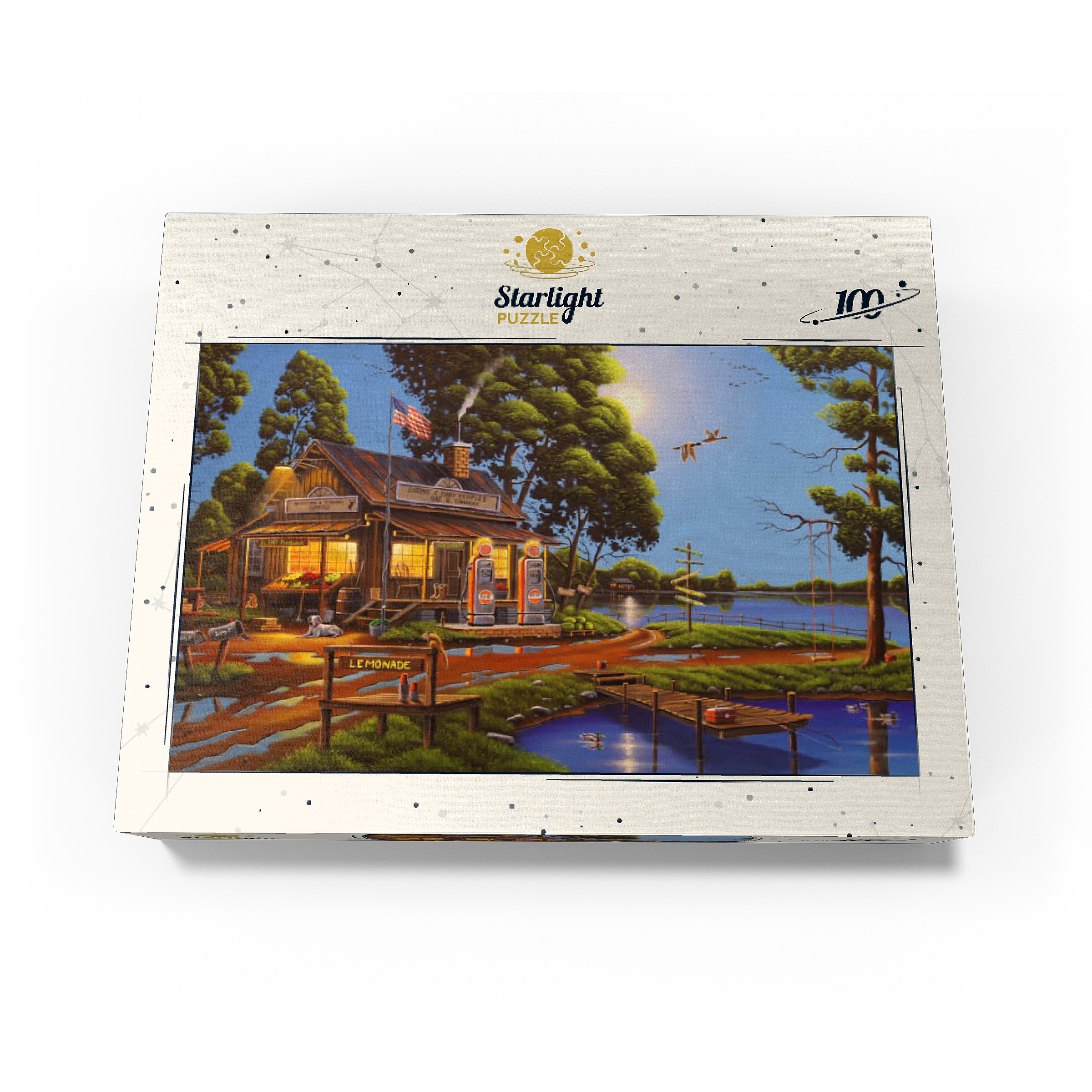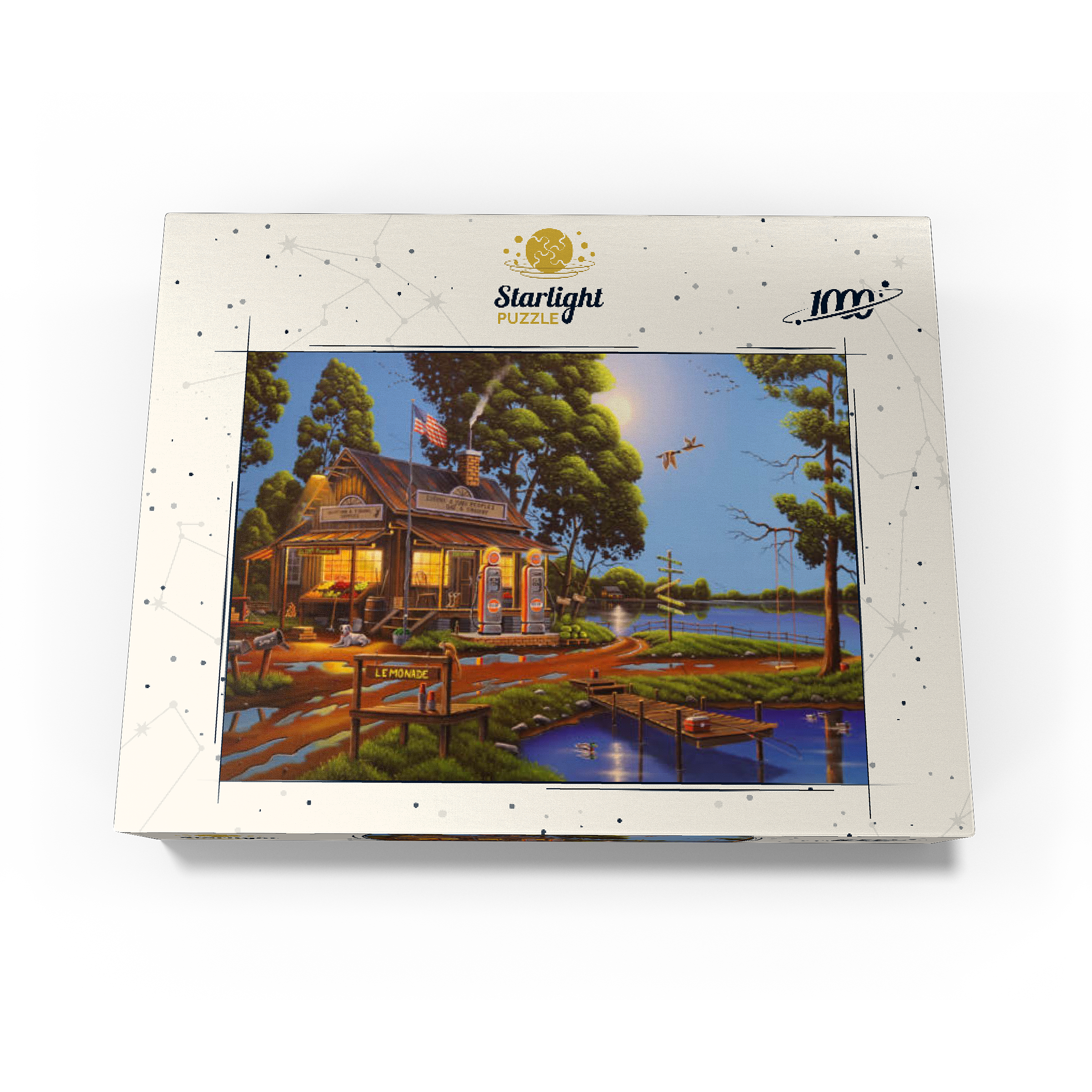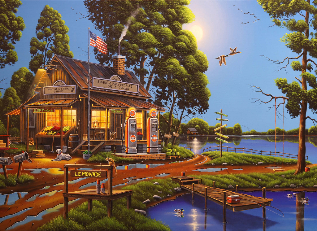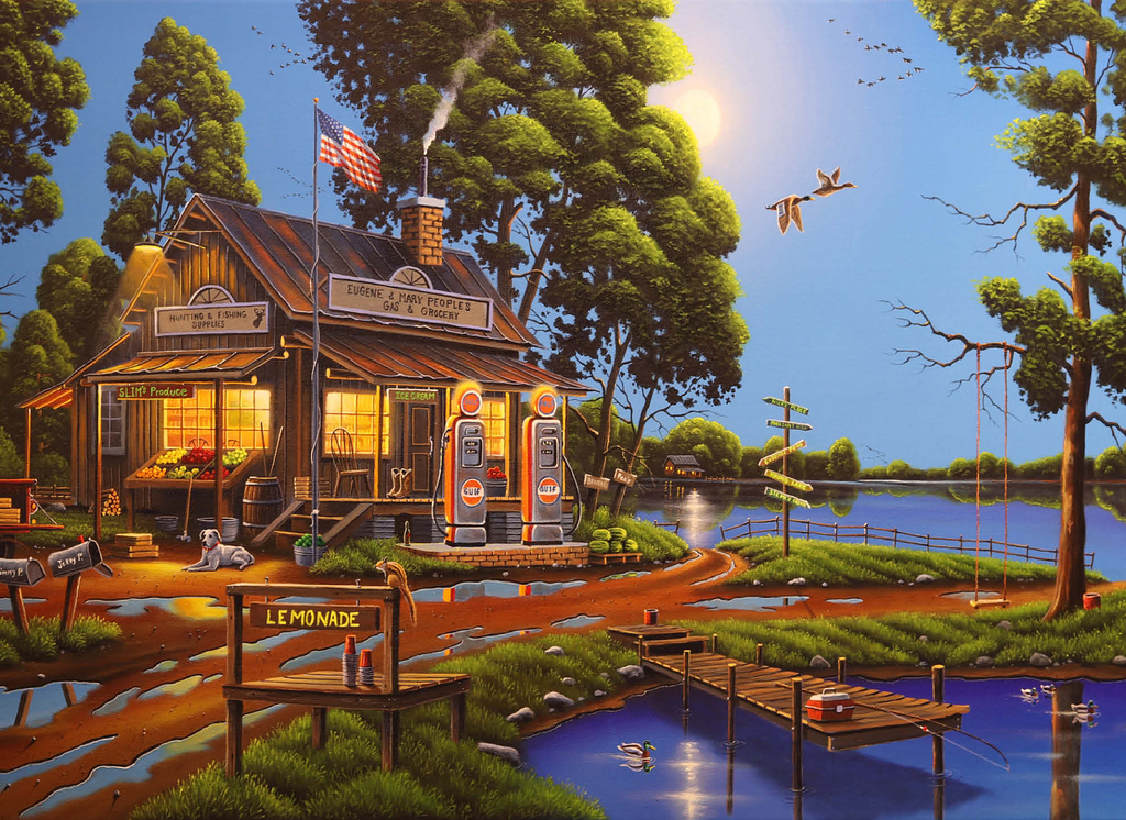 This charming lakeside scene features a nostalgic country gas station and grocery store under the soft light of the moon. The store, labeled Eugene & Mary People's Gas & Grocery, offers produce, hunting supplies, and ice cream, all illuminated with a welcoming glow. Two vintage gas pumps stand out in front, while a classic red truck and friendly dog complete the down-home atmosphere. A lemonade stand and wooden dock overlook the tranquil lake, where ducks paddle and a fishing rod waits for a bite. Tall trees, a rope swing, and an American flag waving above enhance the timeless, peaceful setting of small-town Americana.