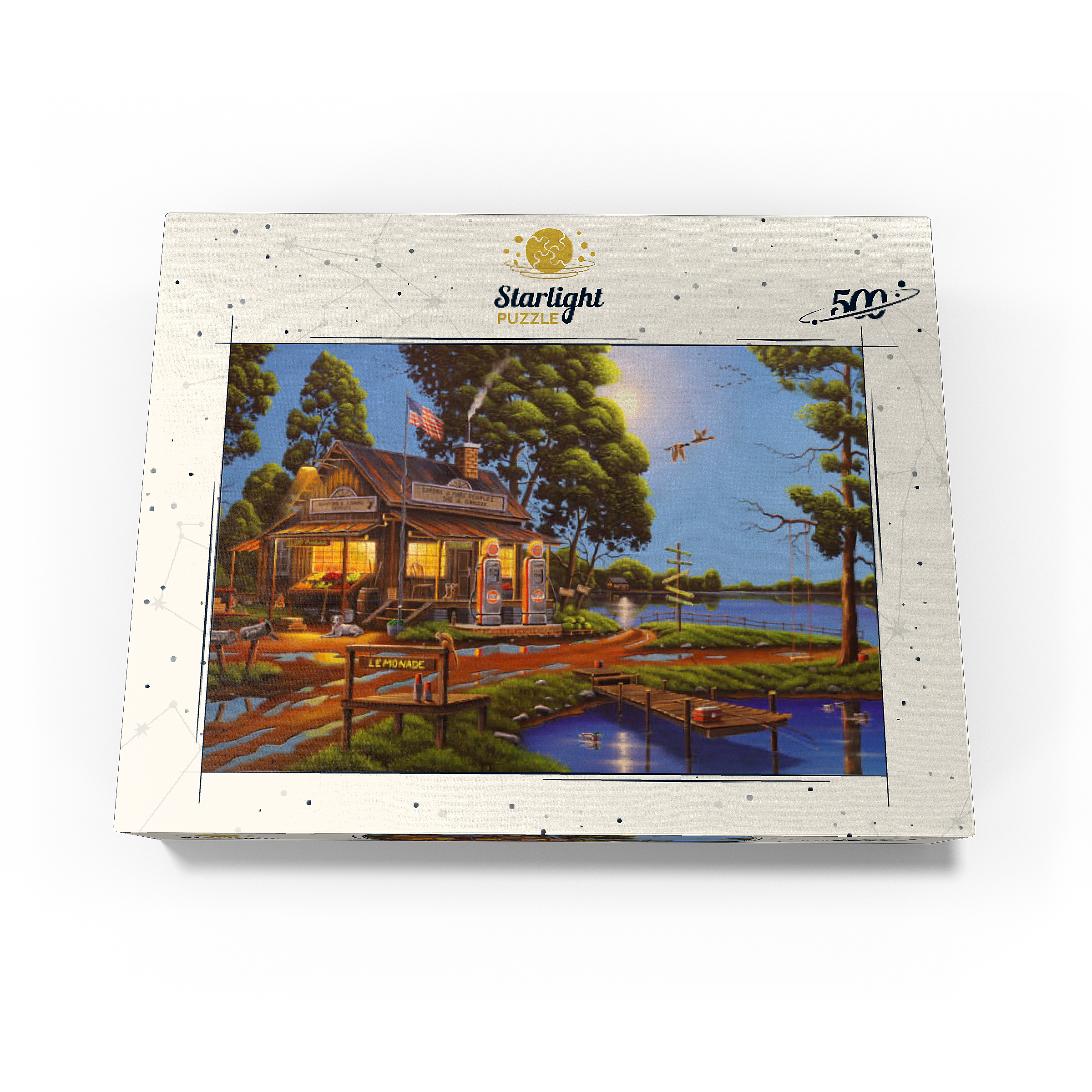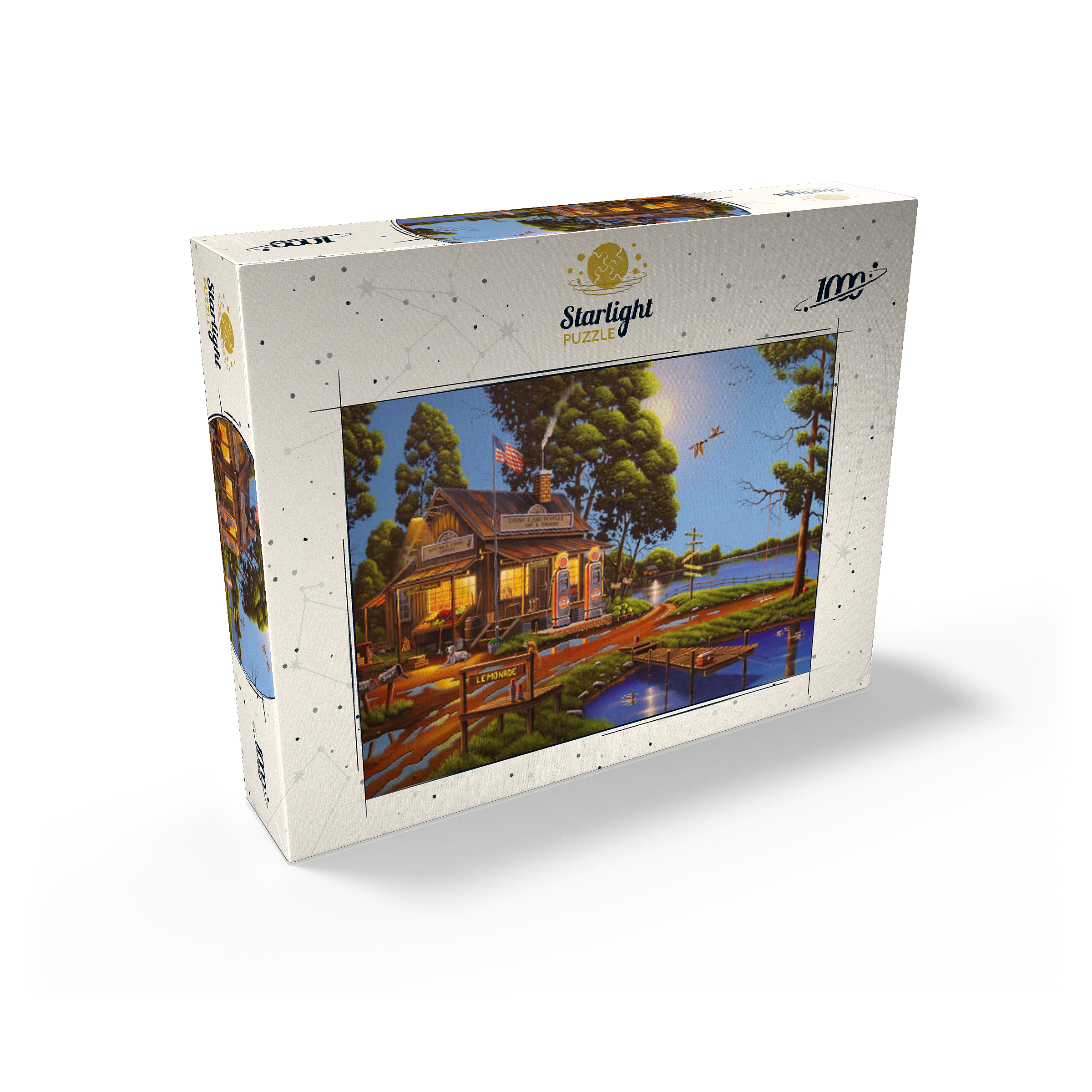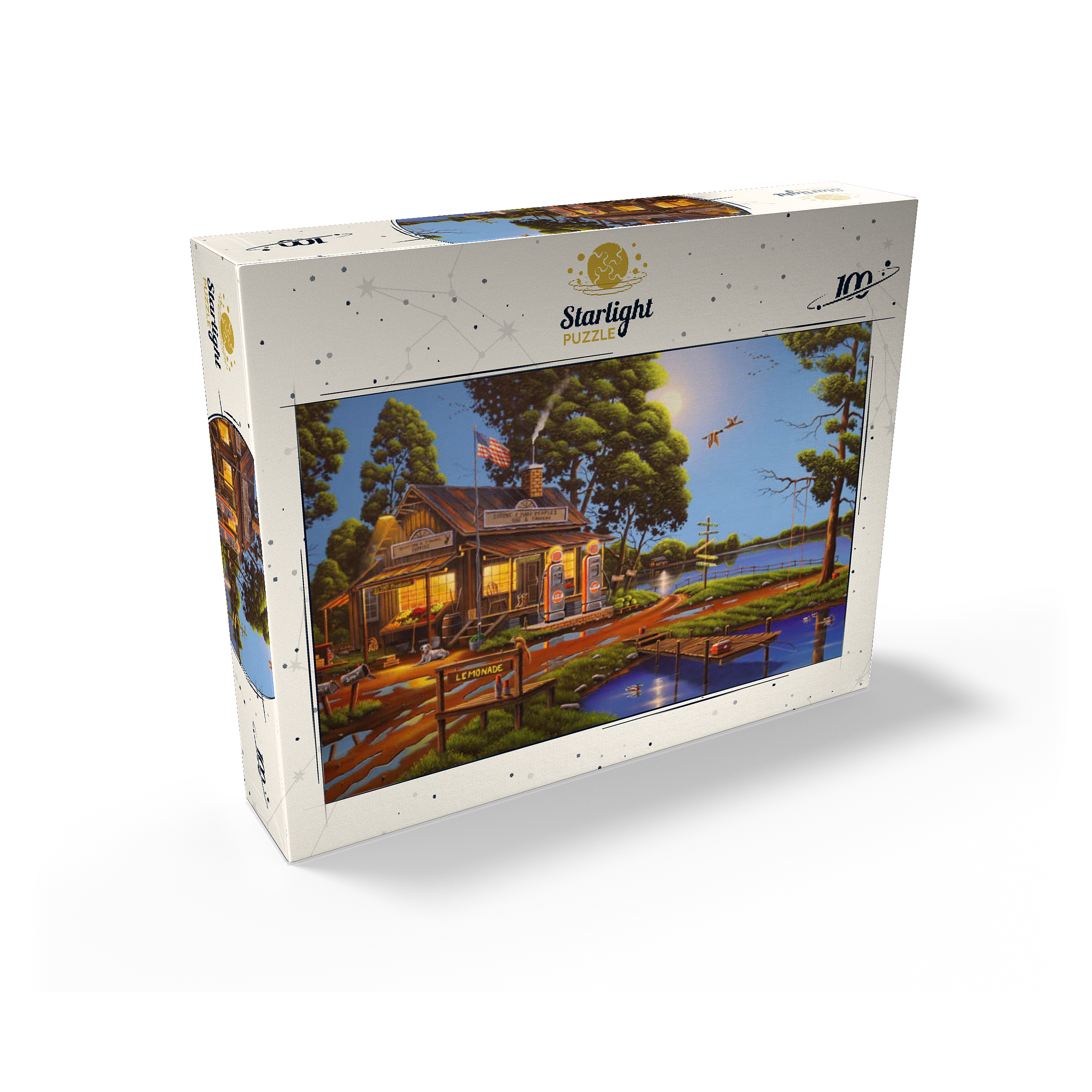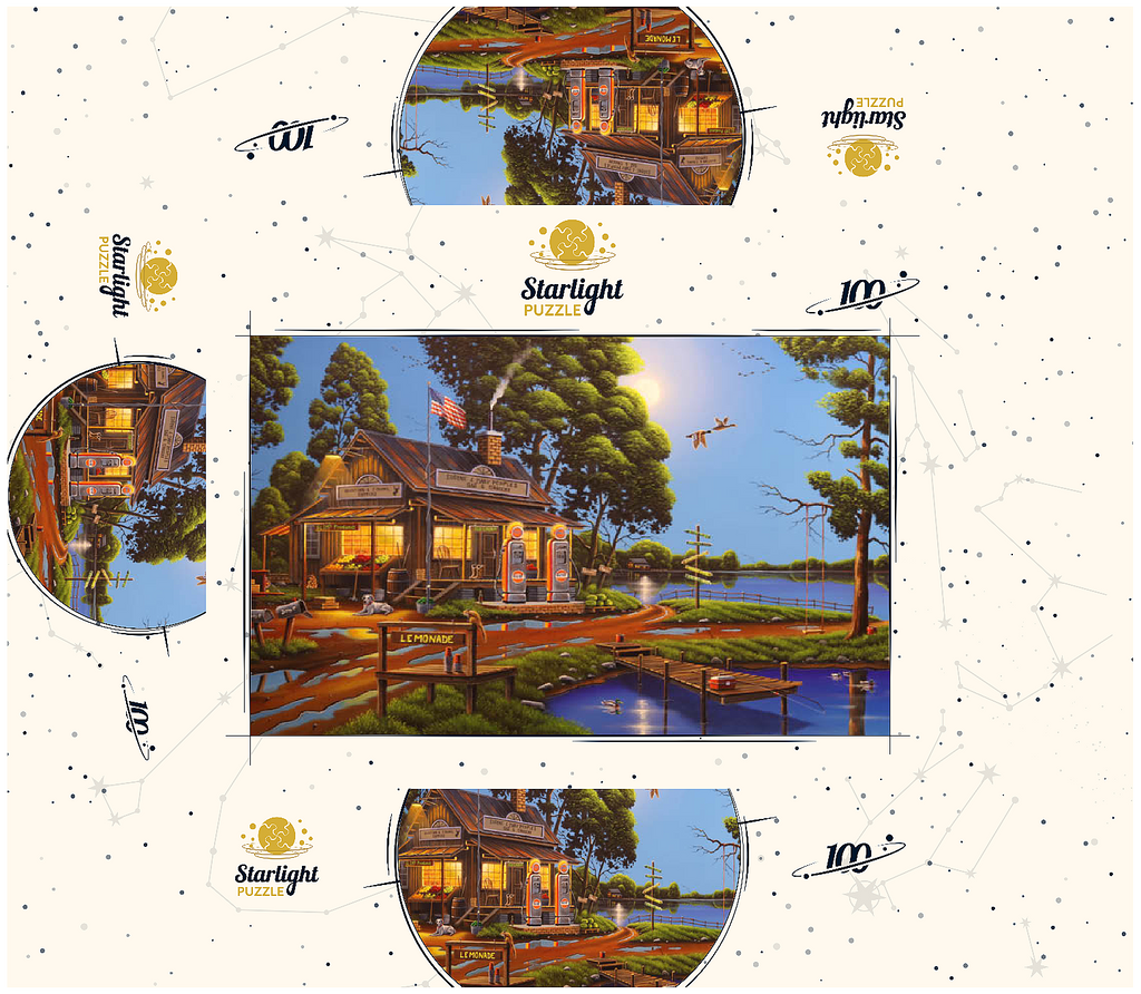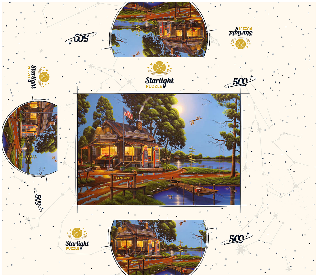 This charming lakeside scene features a nostalgic country gas station and grocery store under the soft light of the moon. The store, labeled Eugene & Mary People's Gas & Grocery, offers produce, hunting supplies, and ice cream, all illuminated with a welcoming glow. Two vintage gas pumps stand out in front, while a classic red truck and friendly dog complete the down-home atmosphere. A lemonade stand and wooden dock overlook the tranquil lake, where ducks paddle and a fishing rod waits for a bite. Tall trees, a rope swing, and an American flag waving above enhance the timeless, peaceful setting of small-town Americana.