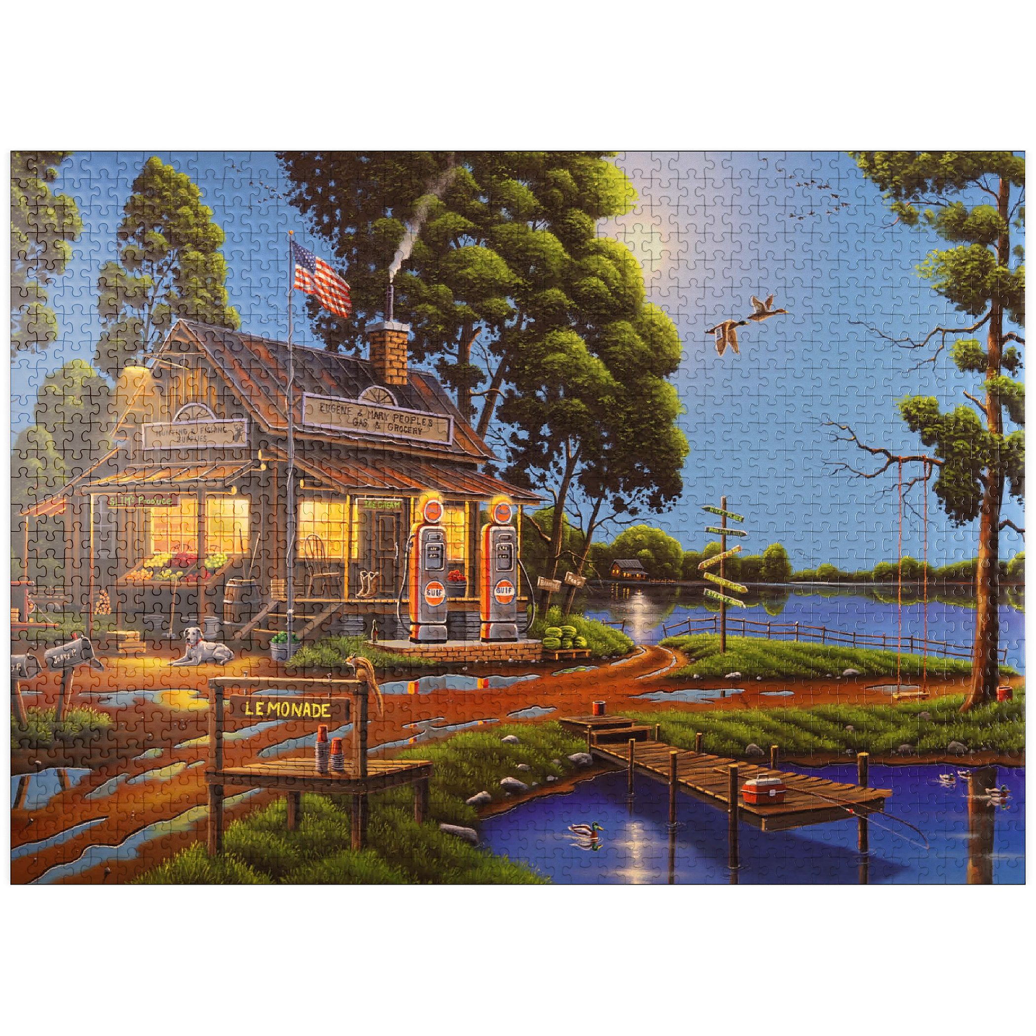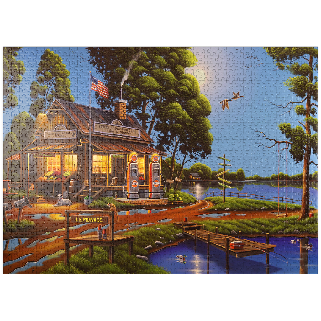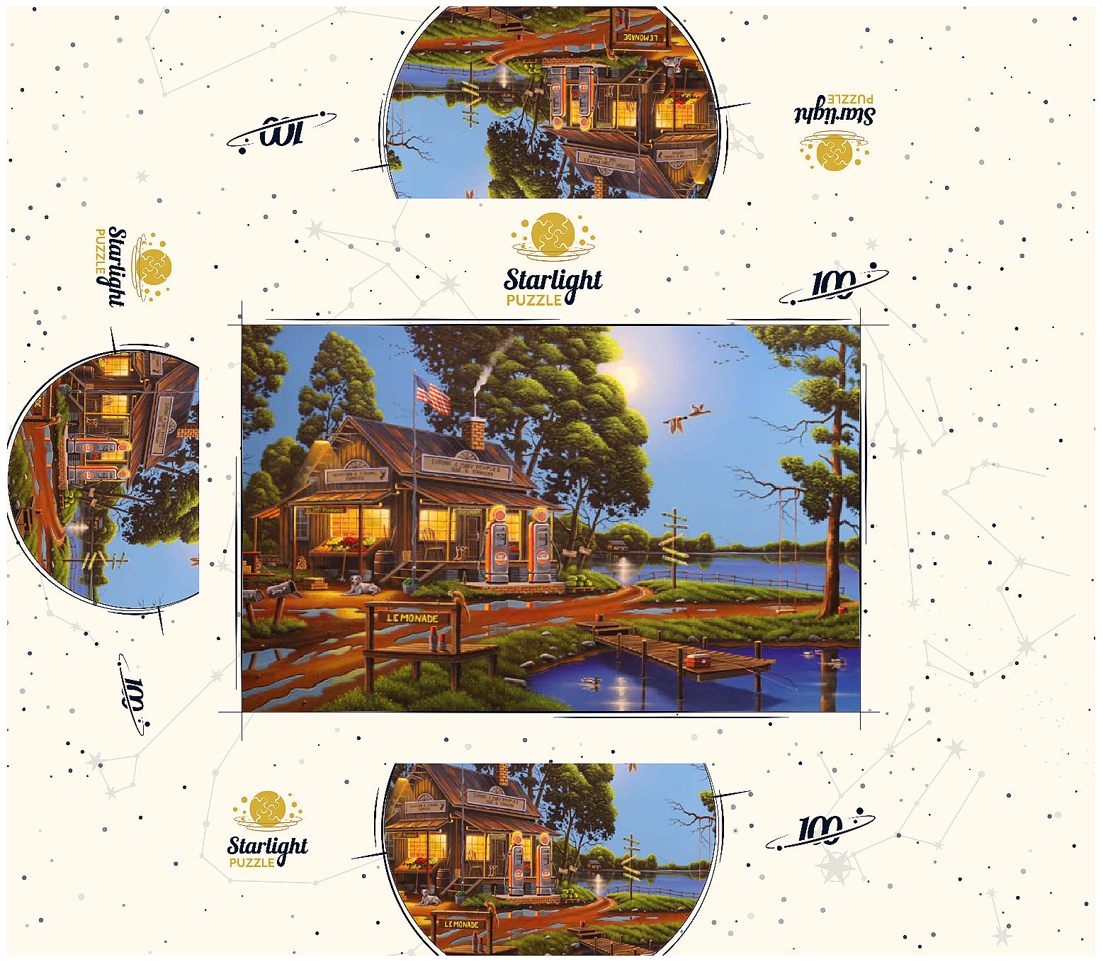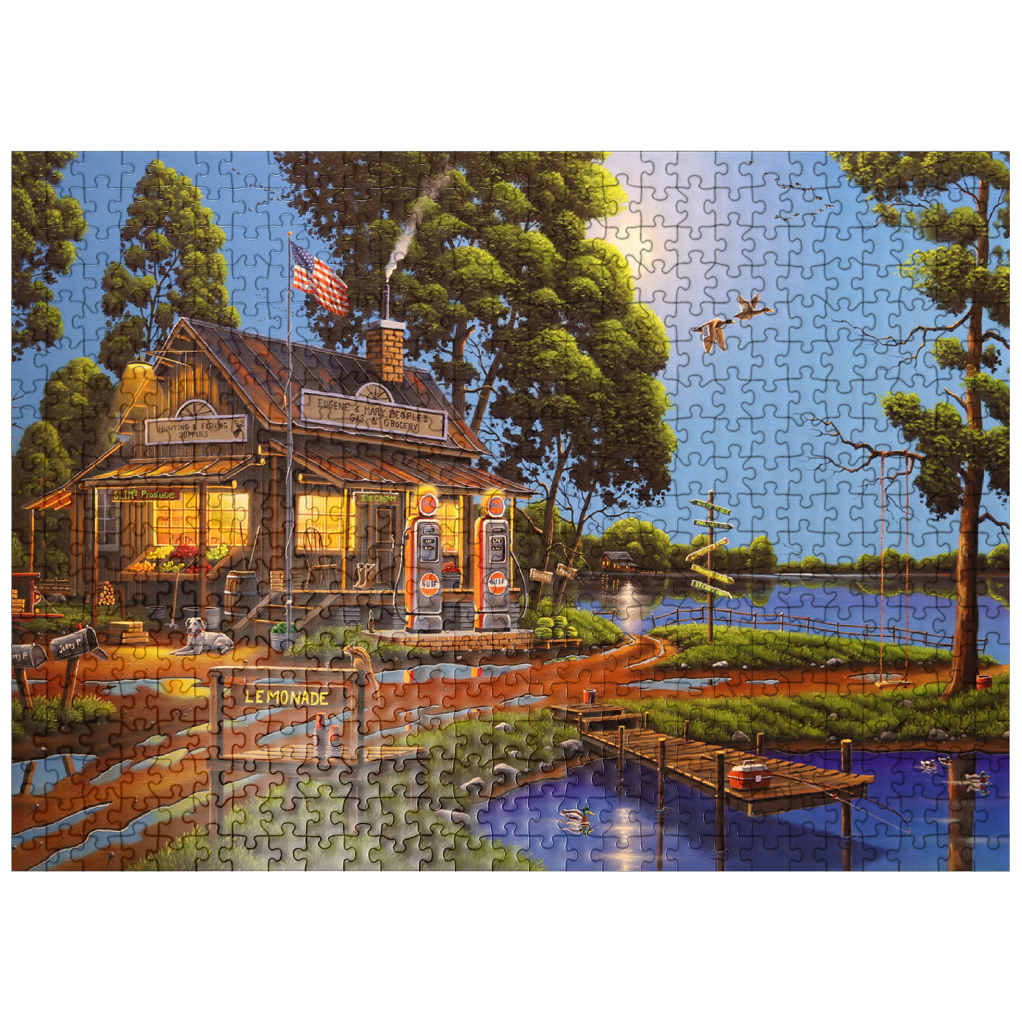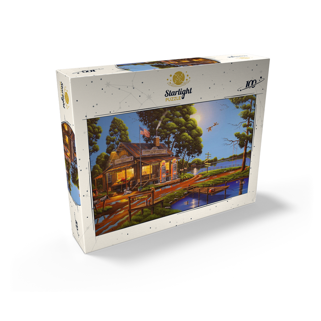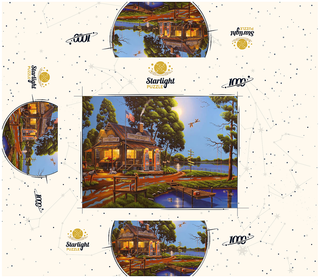 This charming lakeside scene features a nostalgic country gas station and grocery store under the soft light of the moon. The store, labeled Eugene & Mary People's Gas & Grocery, offers produce, hunting supplies, and ice cream, all illuminated with a welcoming glow. Two vintage gas pumps stand out in front, while a classic red truck and friendly dog complete the down-home atmosphere. A lemonade stand and wooden dock overlook the tranquil lake, where ducks paddle and a fishing rod waits for a bite. Tall trees, a rope swing, and an American flag waving above enhance the timeless, peaceful setting of small-town Americana.