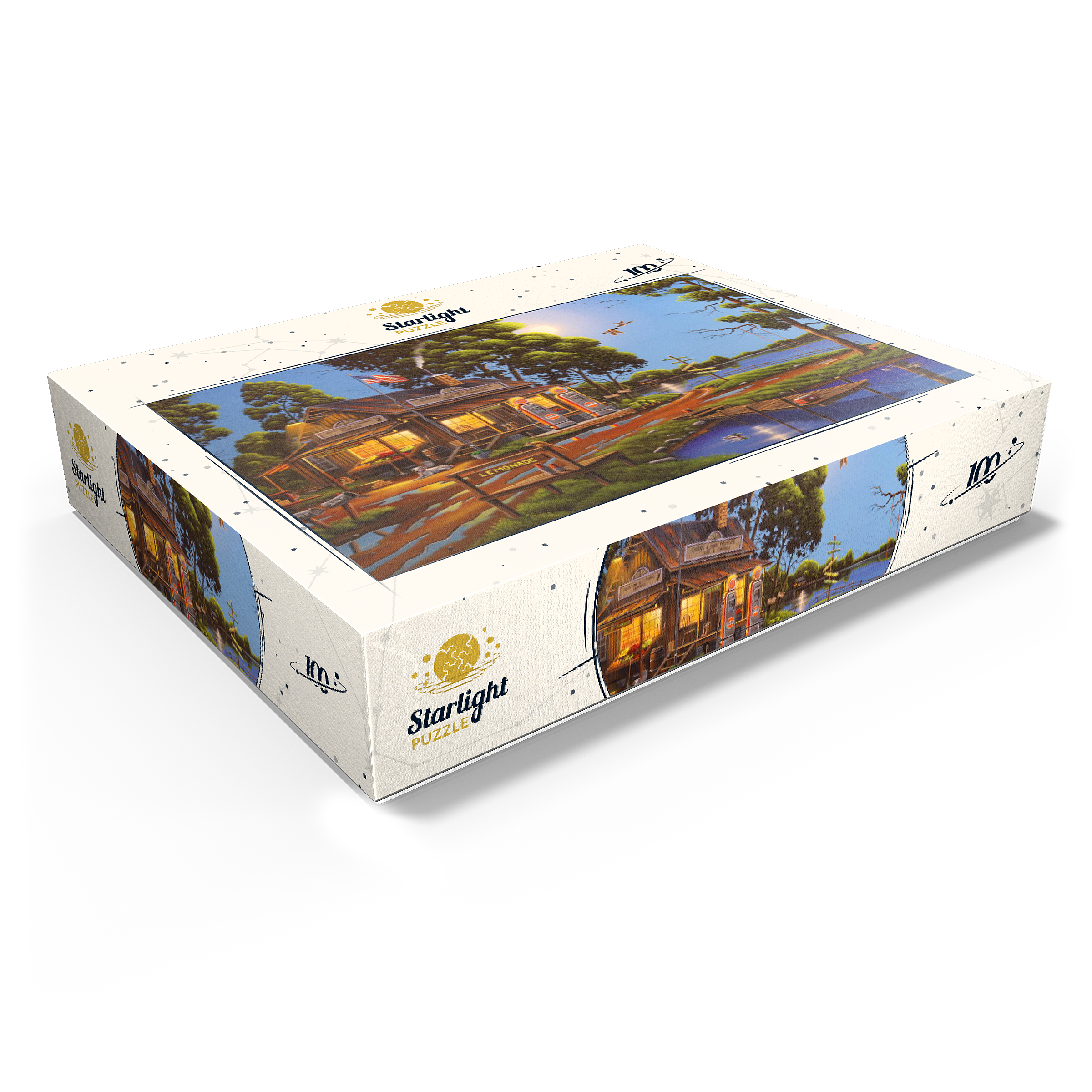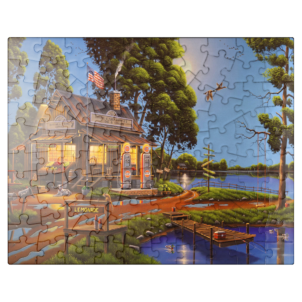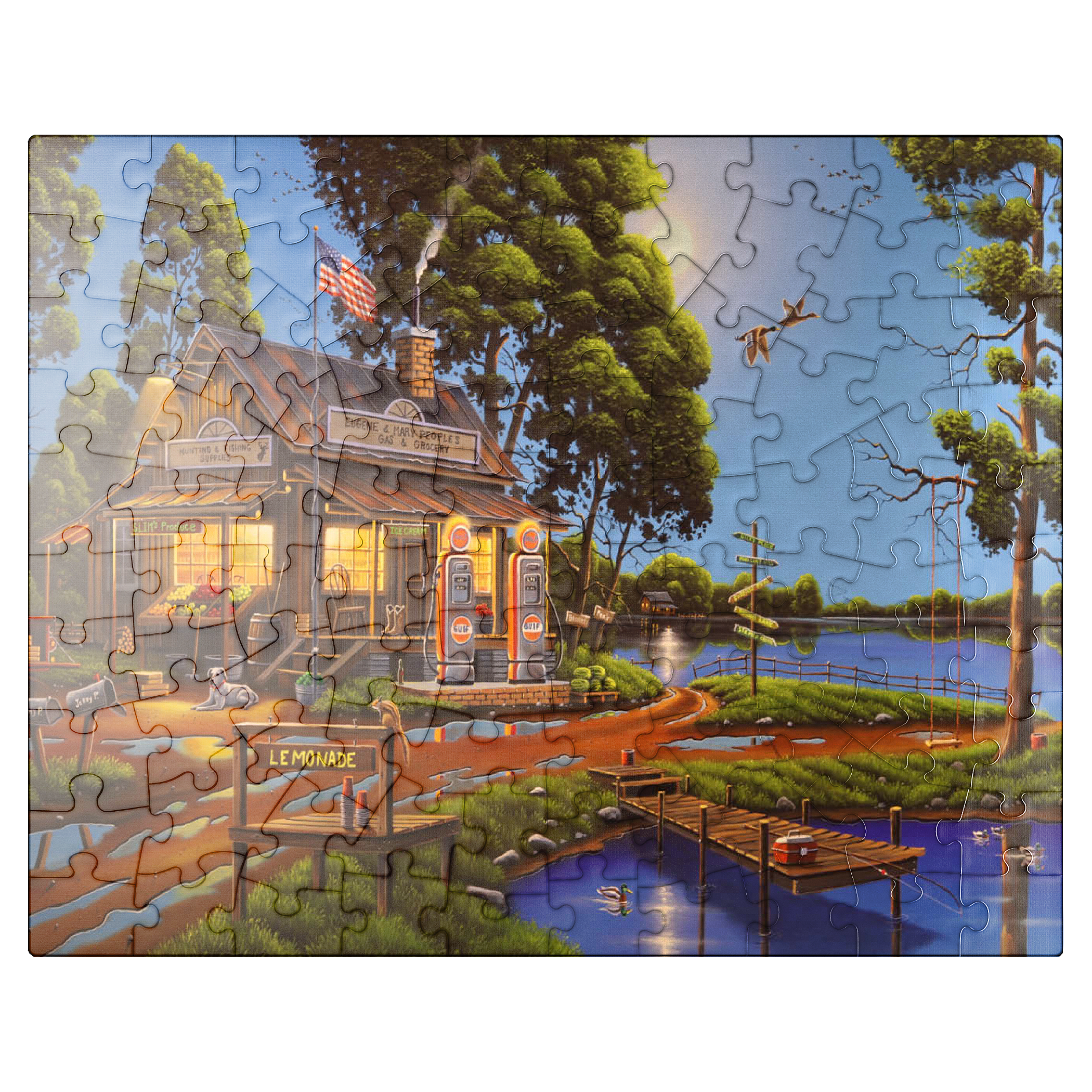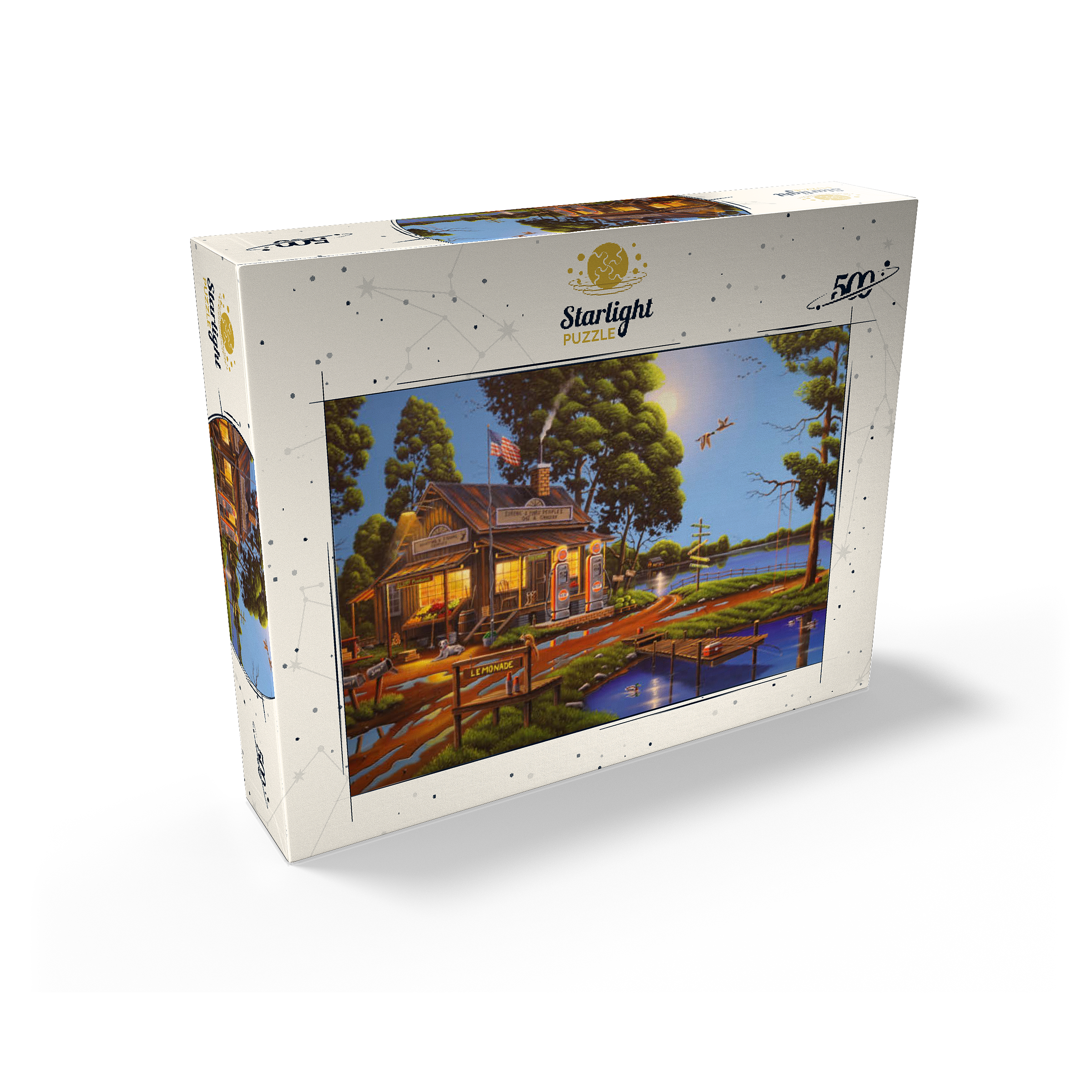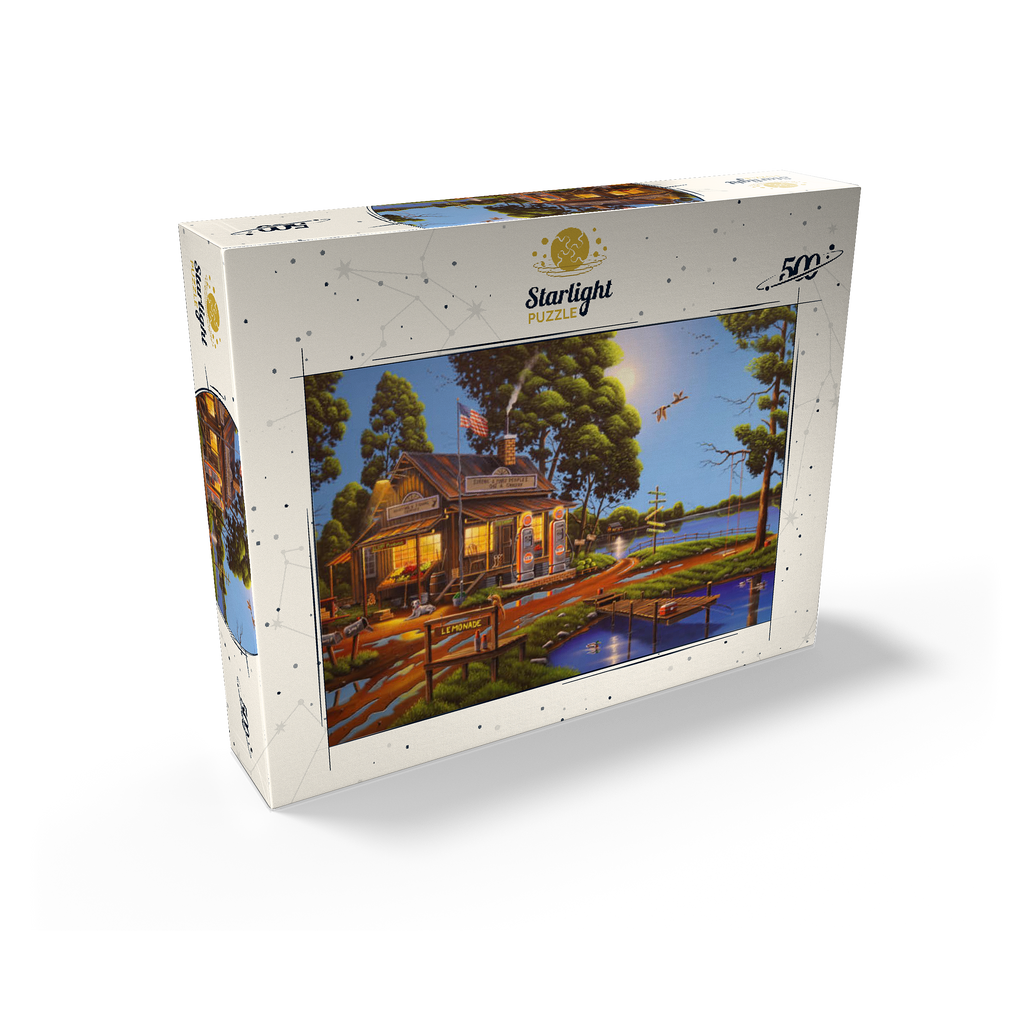 This charming lakeside scene features a nostalgic country gas station and grocery store under the soft light of the moon. The store, labeled Eugene & Mary People's Gas & Grocery, offers produce, hunting supplies, and ice cream, all illuminated with a welcoming glow. Two vintage gas pumps stand out in front, while a classic red truck and friendly dog complete the down-home atmosphere. A lemonade stand and wooden dock overlook the tranquil lake, where ducks paddle and a fishing rod waits for a bite. Tall trees, a rope swing, and an American flag waving above enhance the timeless, peaceful setting of small-town Americana.