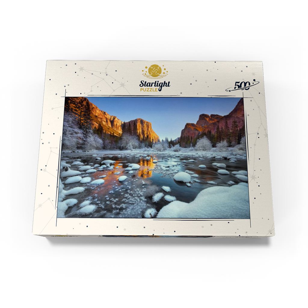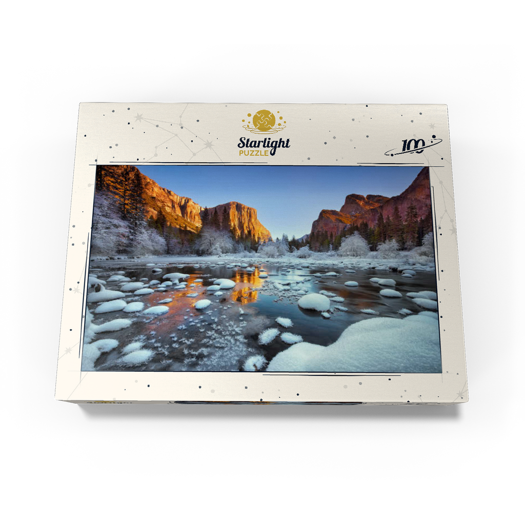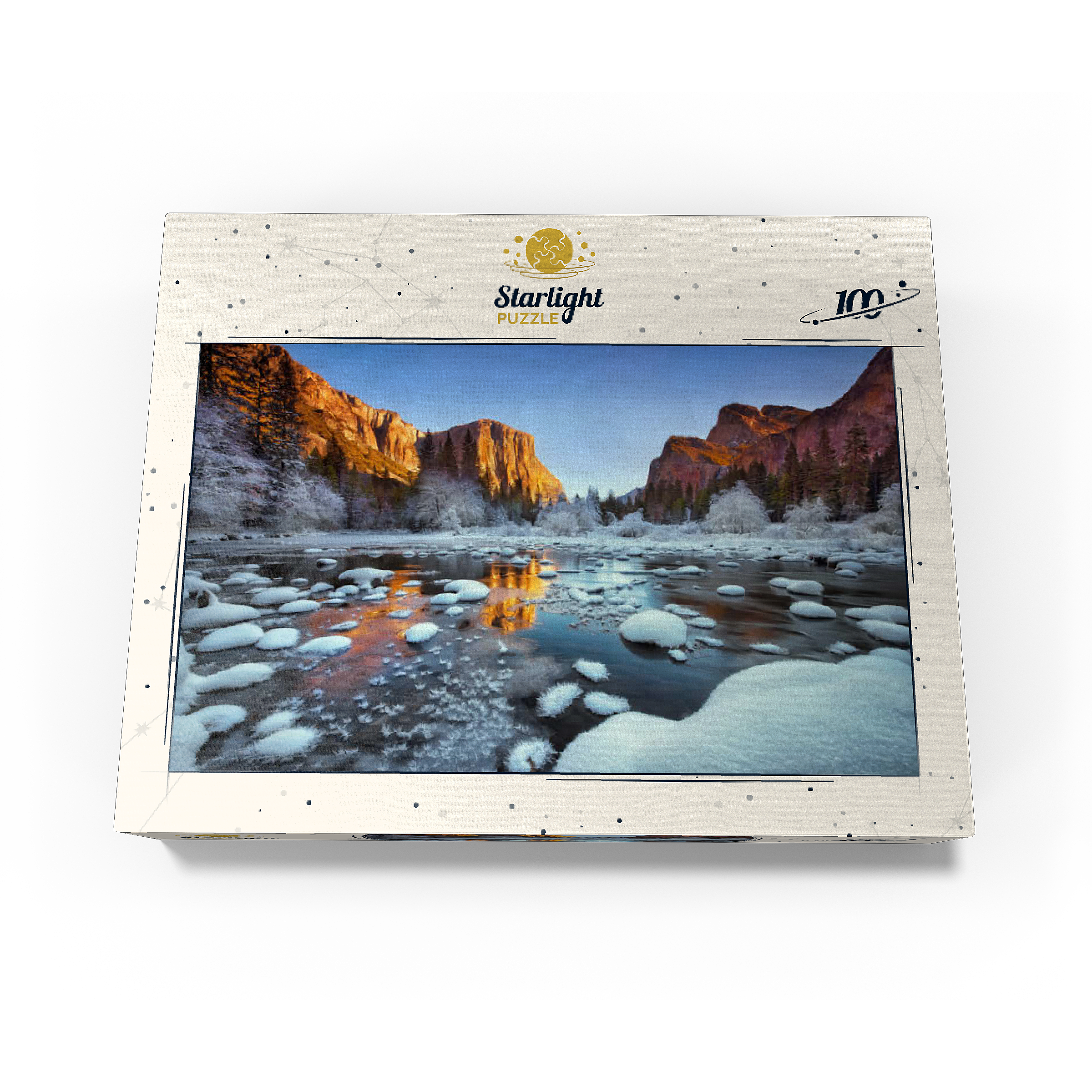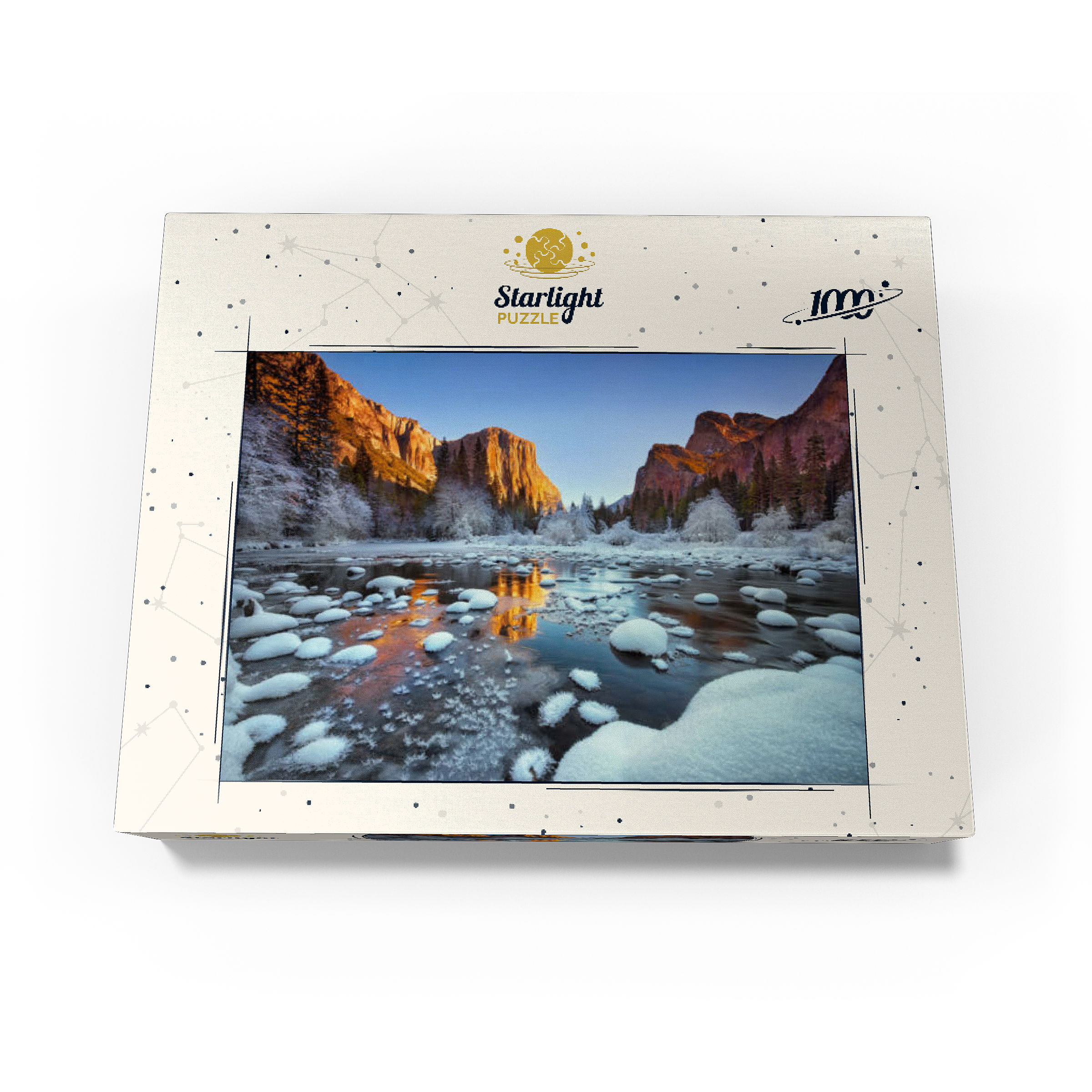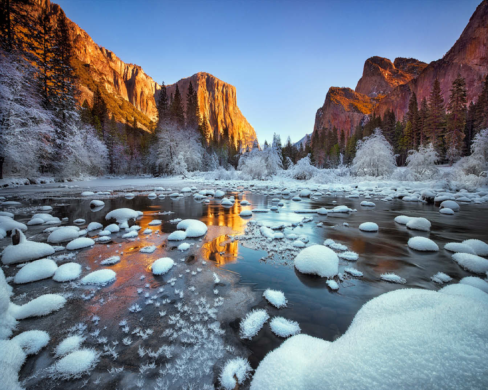 This breathtaking winter scene captures Yosemite National Park at sunrise, featuring the iconic El Capitan and Cathedral Rocks bathed in golden morning light. The Merced River, partially frozen and covered in delicate snow mounds, reflects the glowing cliffs and clear blue sky. Frost patterns and ice formations decorate the river's surface, creating a serene and magical atmosphere. Snow-dusted pine trees and a blanket of white across the valley enhance the majestic beauty of this natural wonder. Ideal for lovers of national parks, winter photography, and scenic landscapes from the American West.