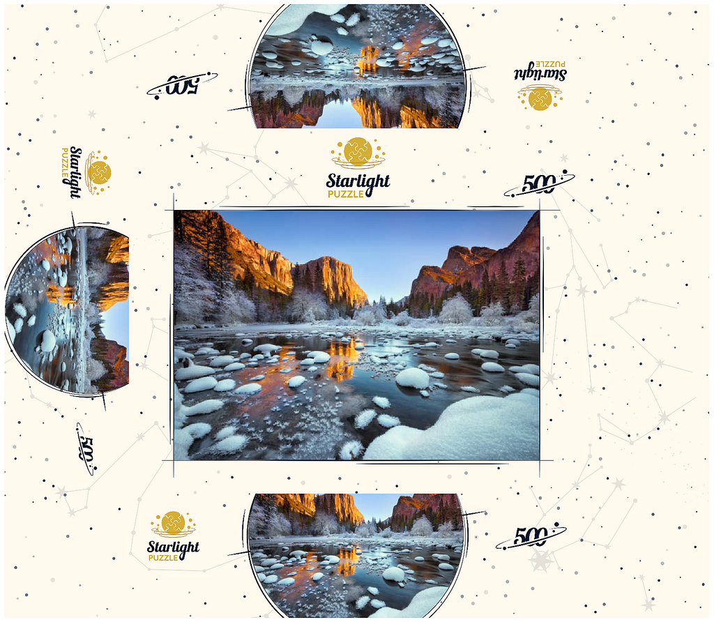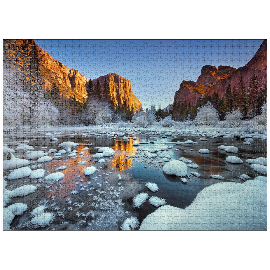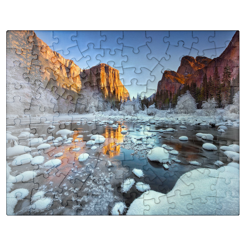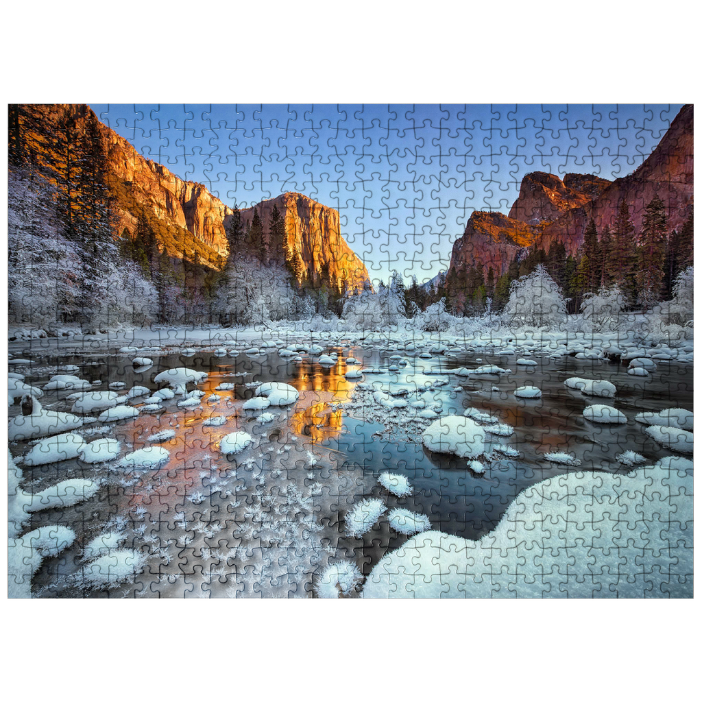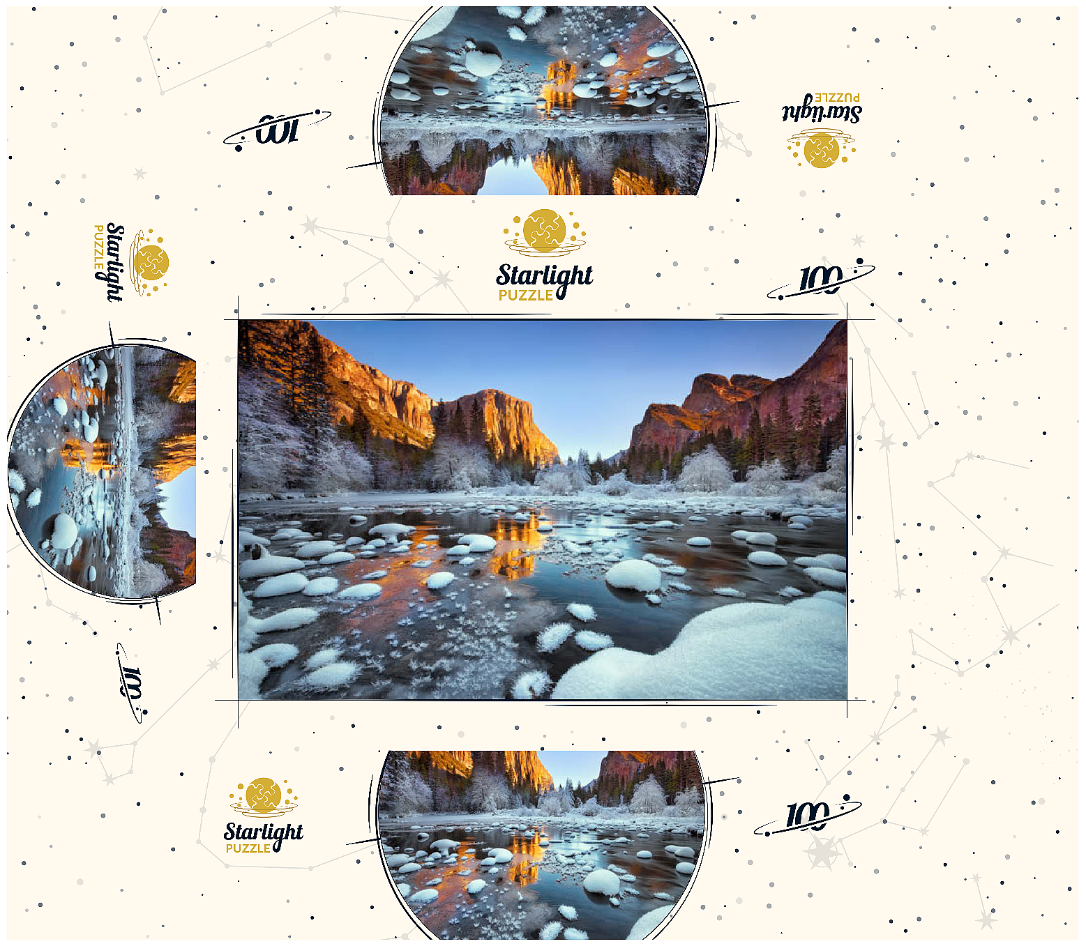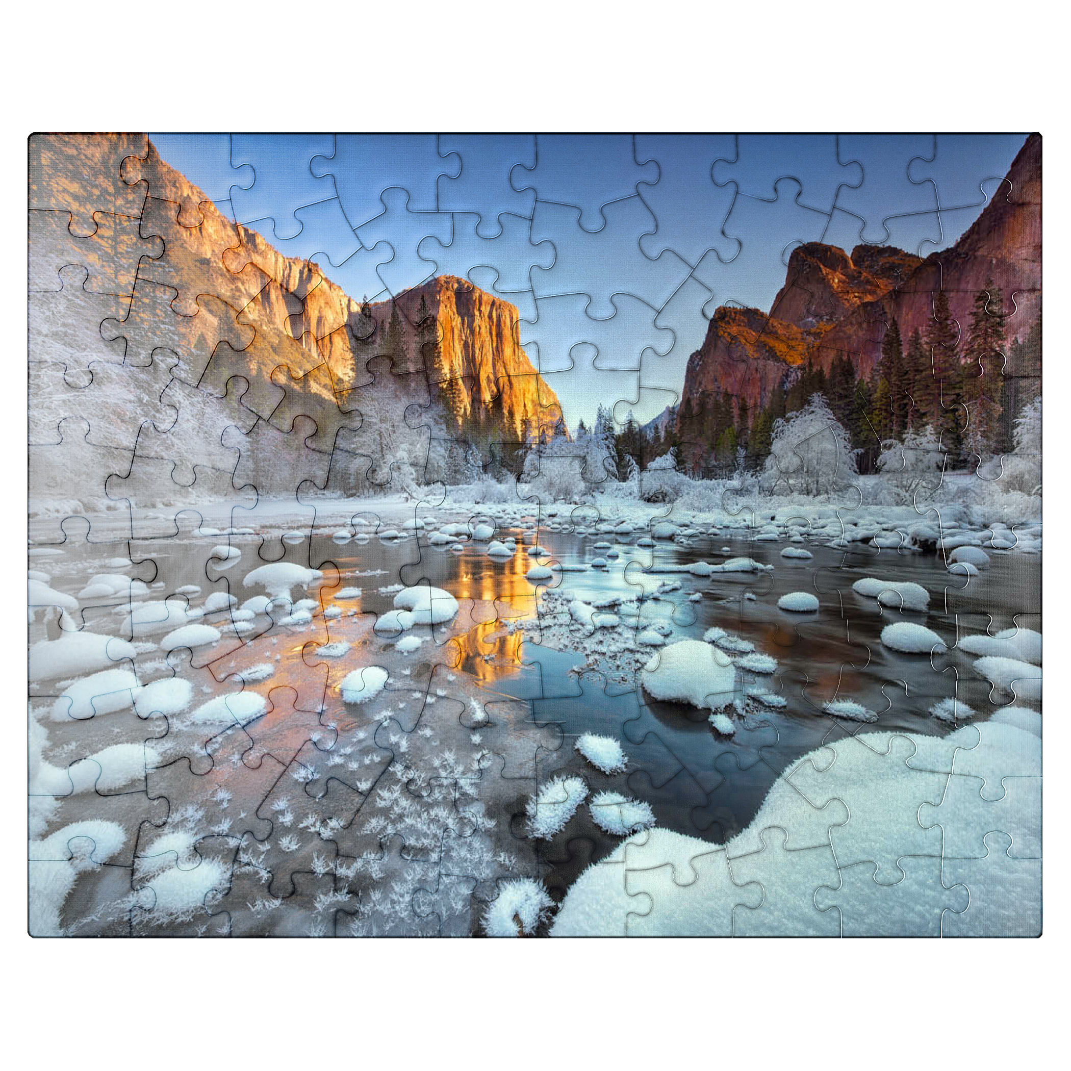 This breathtaking winter scene captures Yosemite National Park at sunrise, featuring the iconic El Capitan and Cathedral Rocks bathed in golden morning light. The Merced River, partially frozen and covered in delicate snow mounds, reflects the glowing cliffs and clear blue sky. Frost patterns and ice formations decorate the river's surface, creating a serene and magical atmosphere. Snow-dusted pine trees and a blanket of white across the valley enhance the majestic beauty of this natural wonder. Ideal for lovers of national parks, winter photography, and scenic landscapes from the American West.
