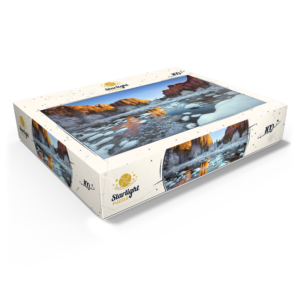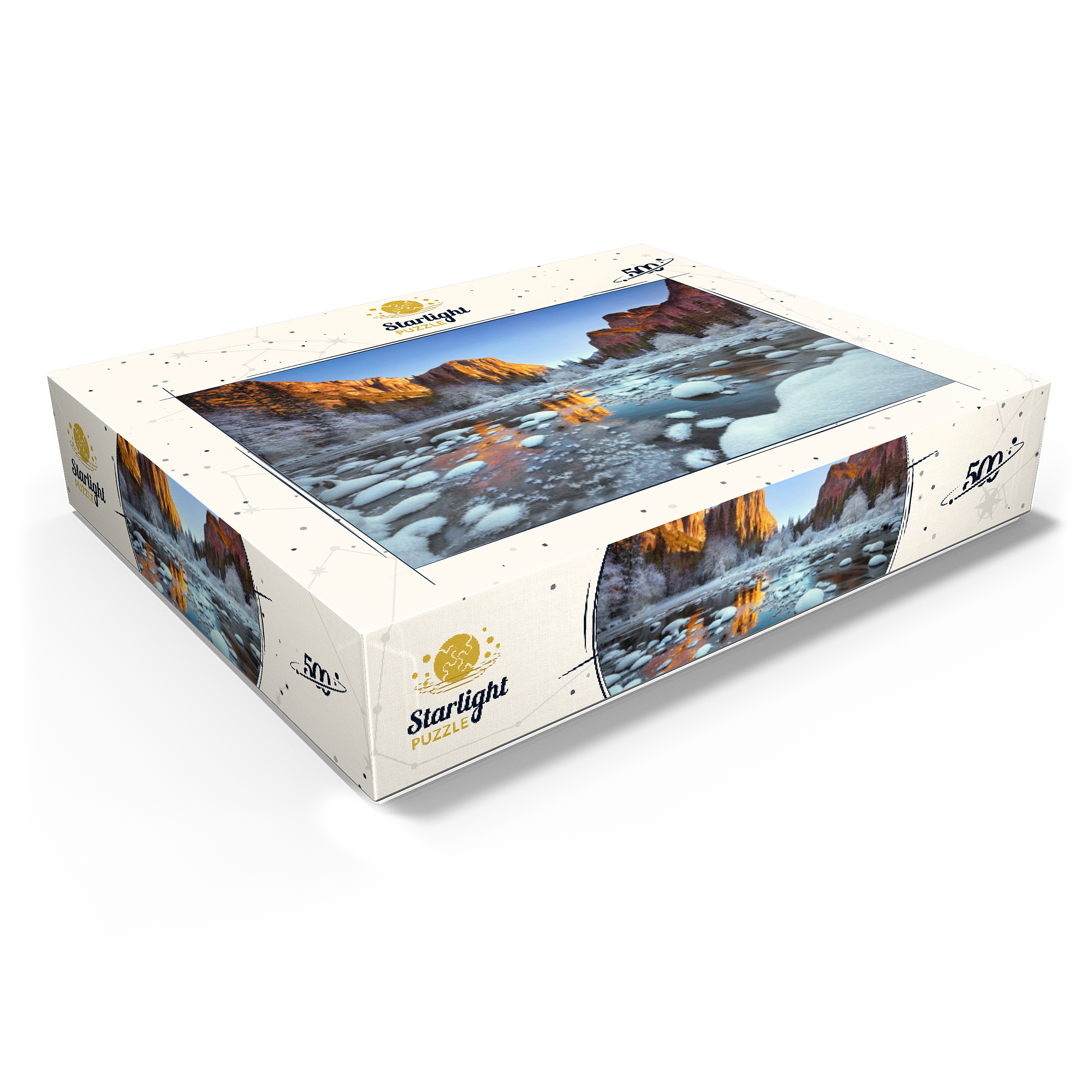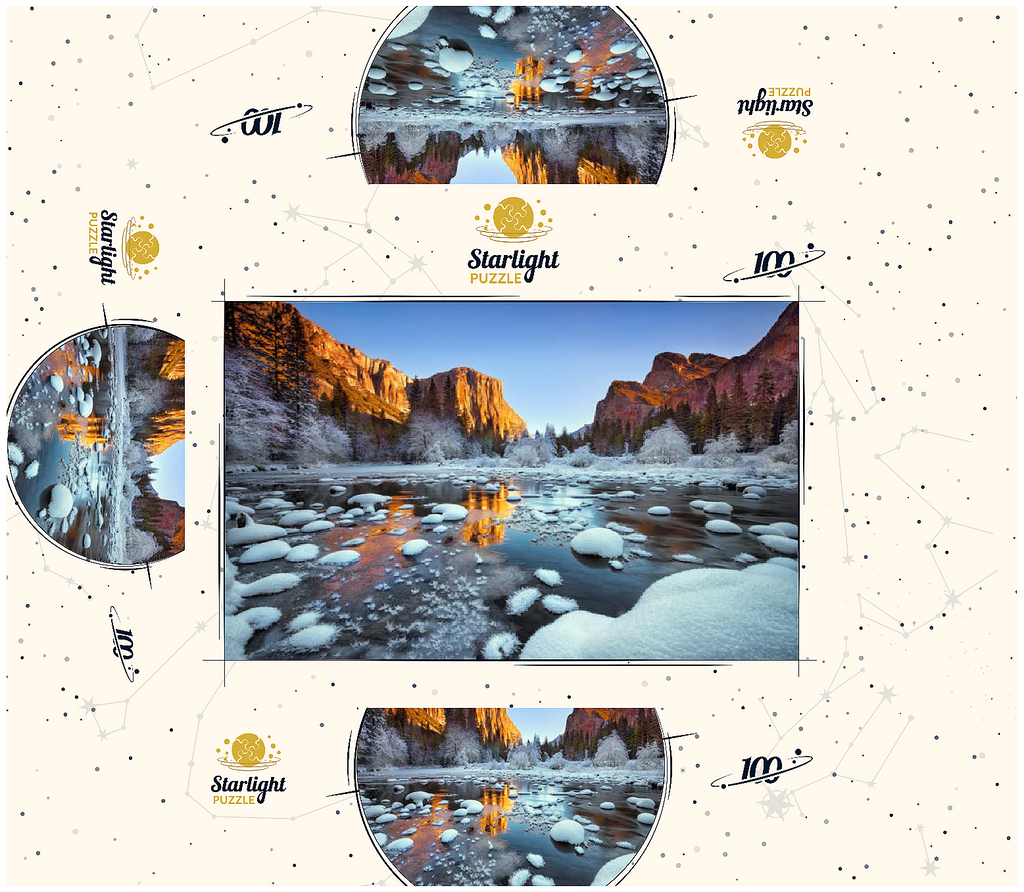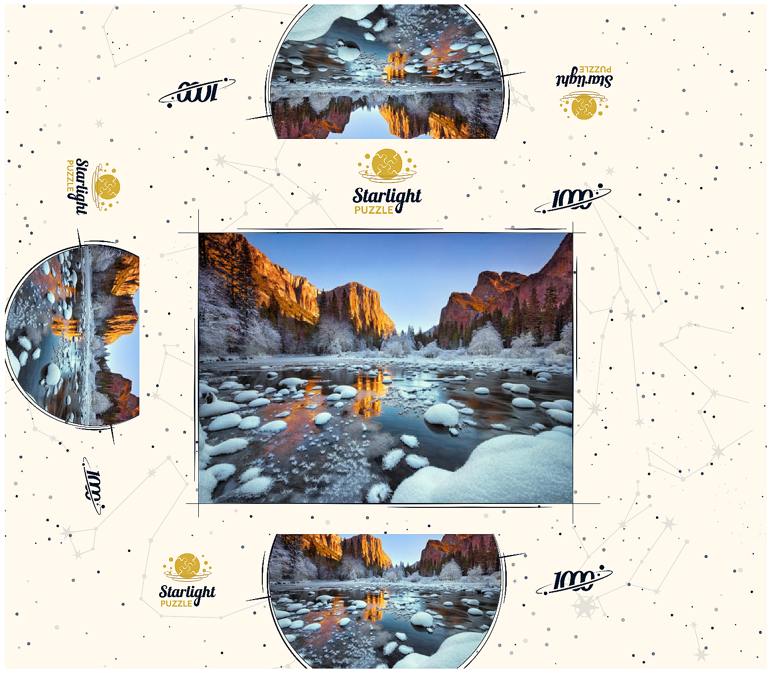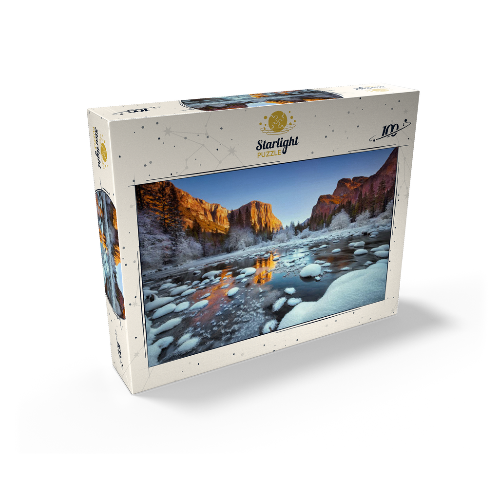 This breathtaking winter scene captures Yosemite National Park at sunrise, featuring the iconic El Capitan and Cathedral Rocks bathed in golden morning light. The Merced River, partially frozen and covered in delicate snow mounds, reflects the glowing cliffs and clear blue sky. Frost patterns and ice formations decorate the river's surface, creating a serene and magical atmosphere. Snow-dusted pine trees and a blanket of white across the valley enhance the majestic beauty of this natural wonder. Ideal for lovers of national parks, winter photography, and scenic landscapes from the American West.