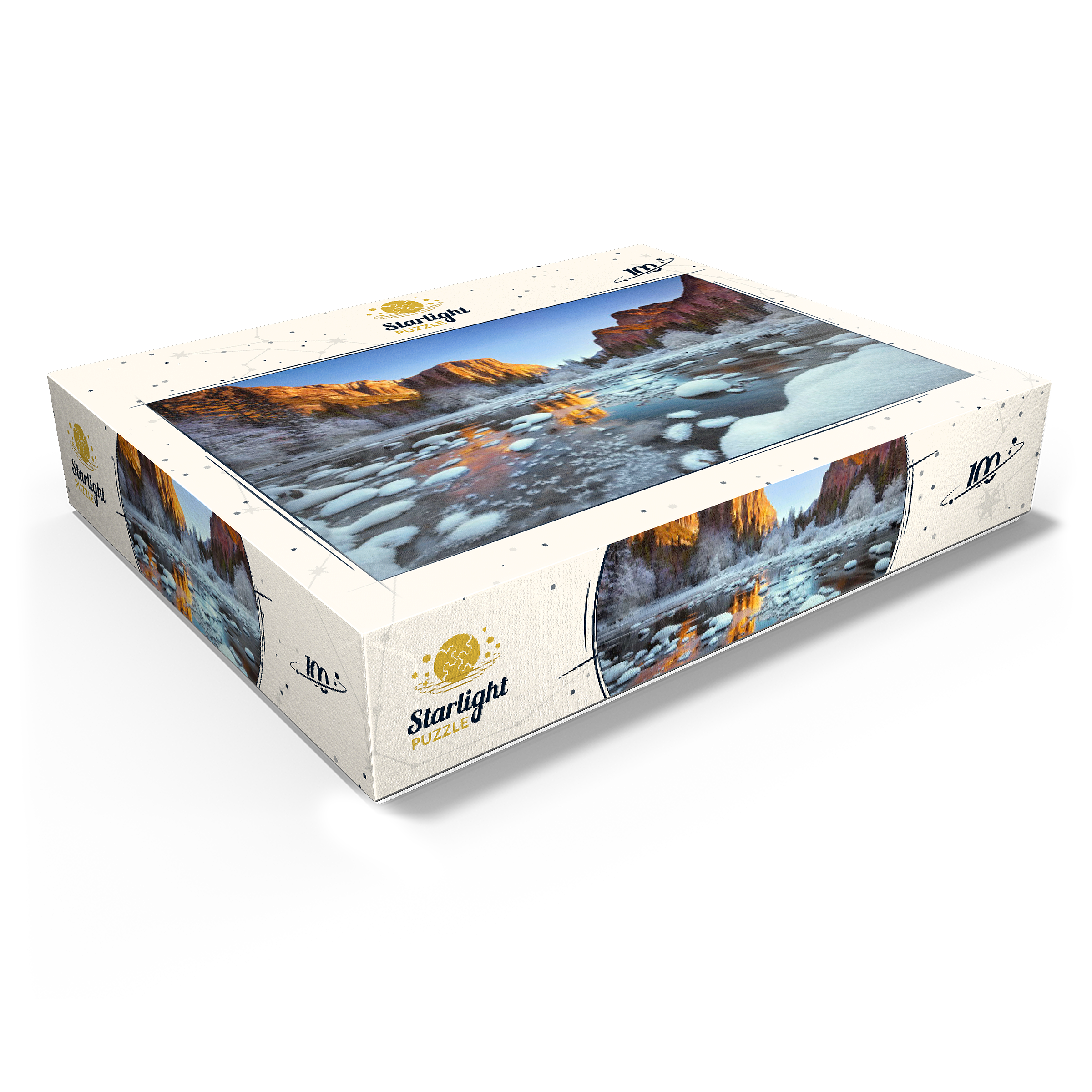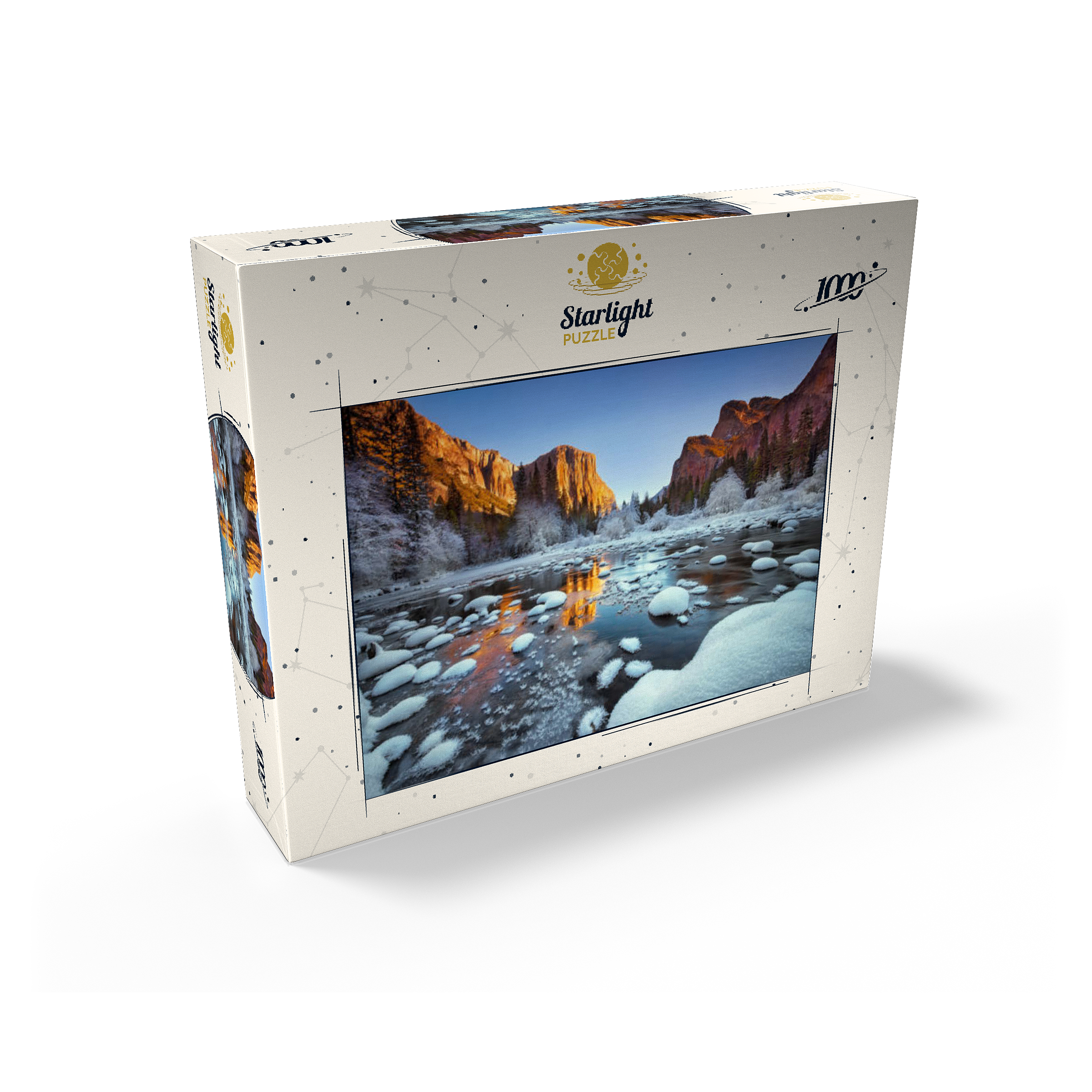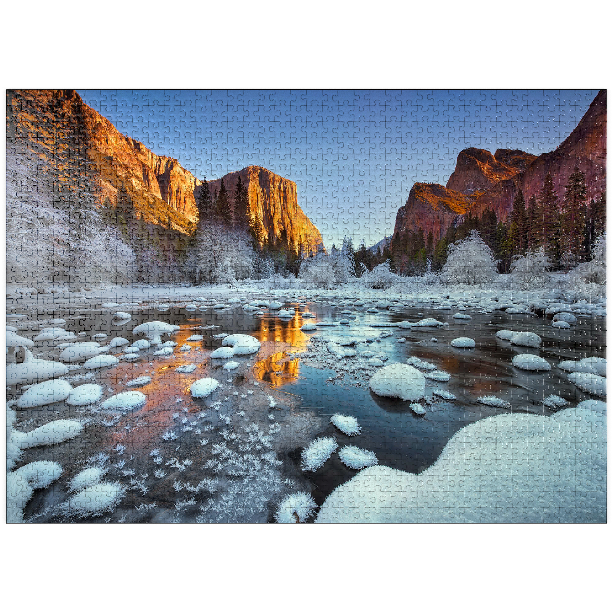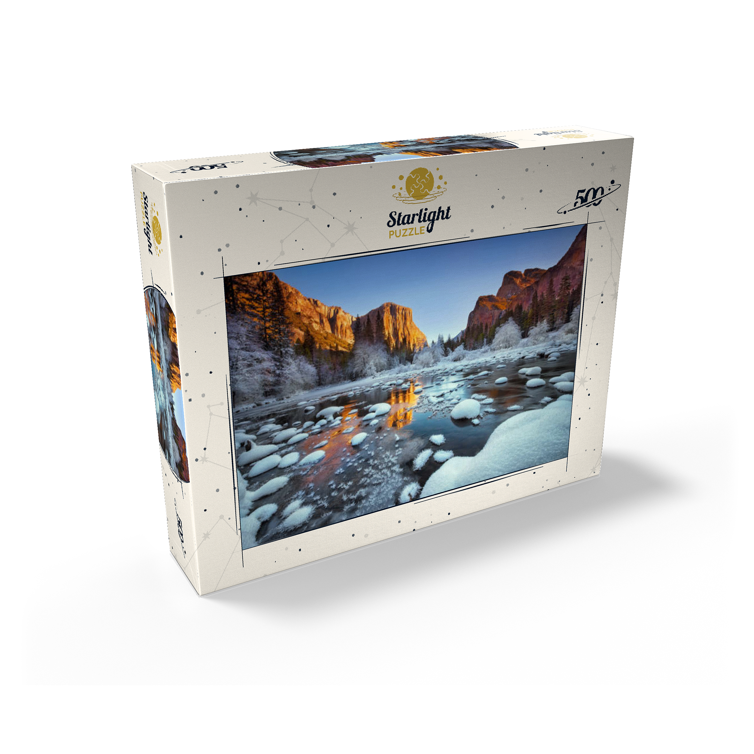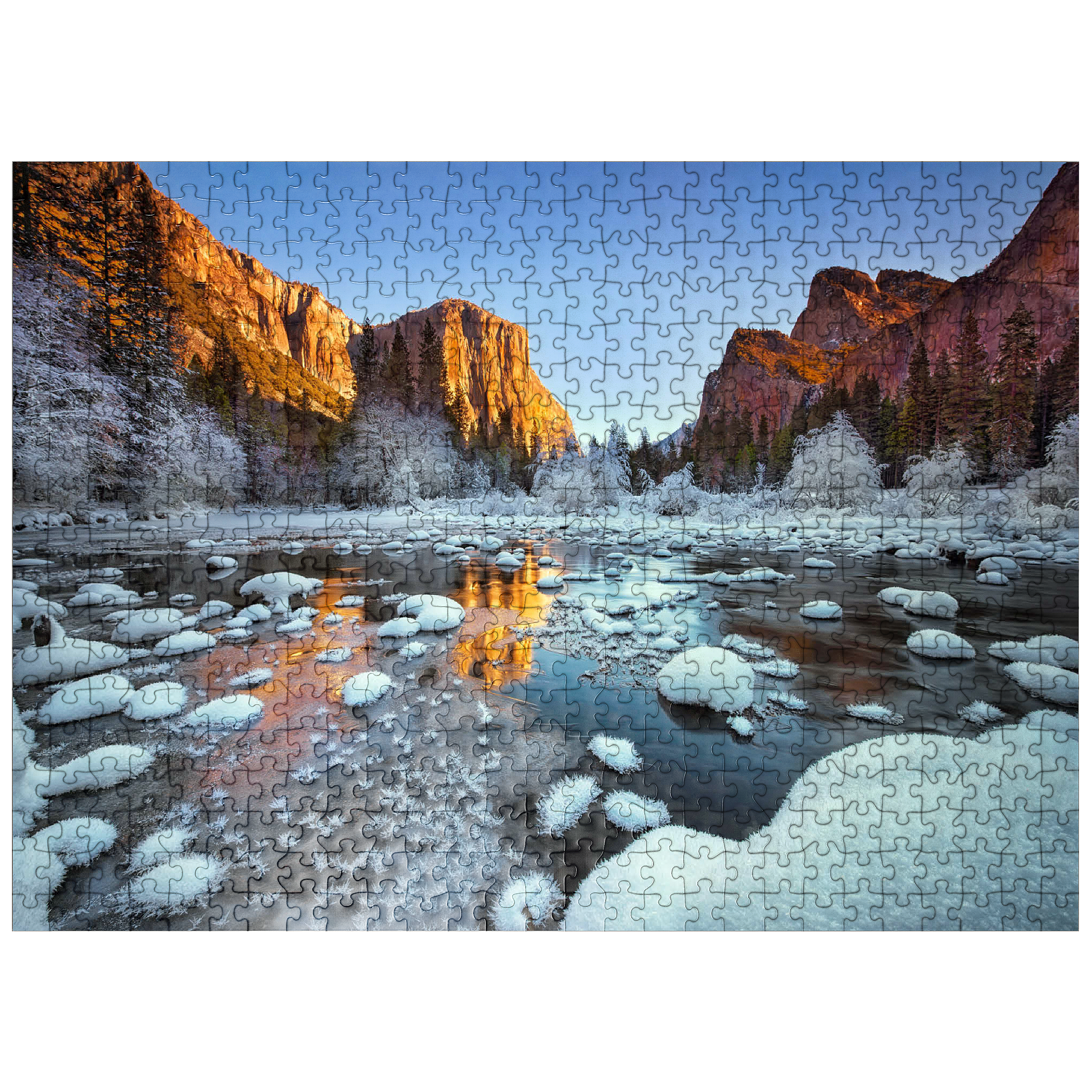 This breathtaking winter scene captures Yosemite National Park at sunrise, featuring the iconic El Capitan and Cathedral Rocks bathed in golden morning light. The Merced River, partially frozen and covered in delicate snow mounds, reflects the glowing cliffs and clear blue sky. Frost patterns and ice formations decorate the river's surface, creating a serene and magical atmosphere. Snow-dusted pine trees and a blanket of white across the valley enhance the majestic beauty of this natural wonder. Ideal for lovers of national parks, winter photography, and scenic landscapes from the American West.