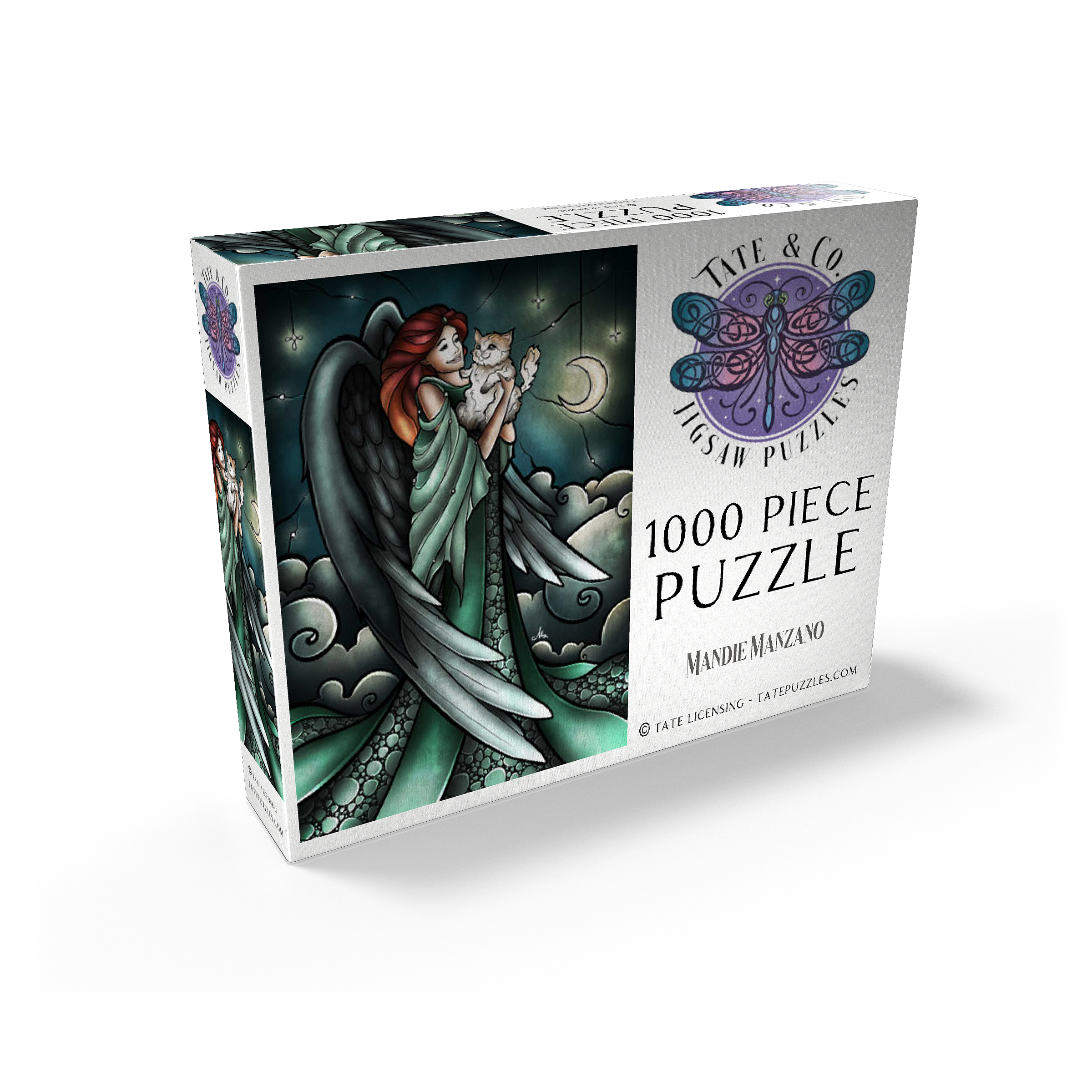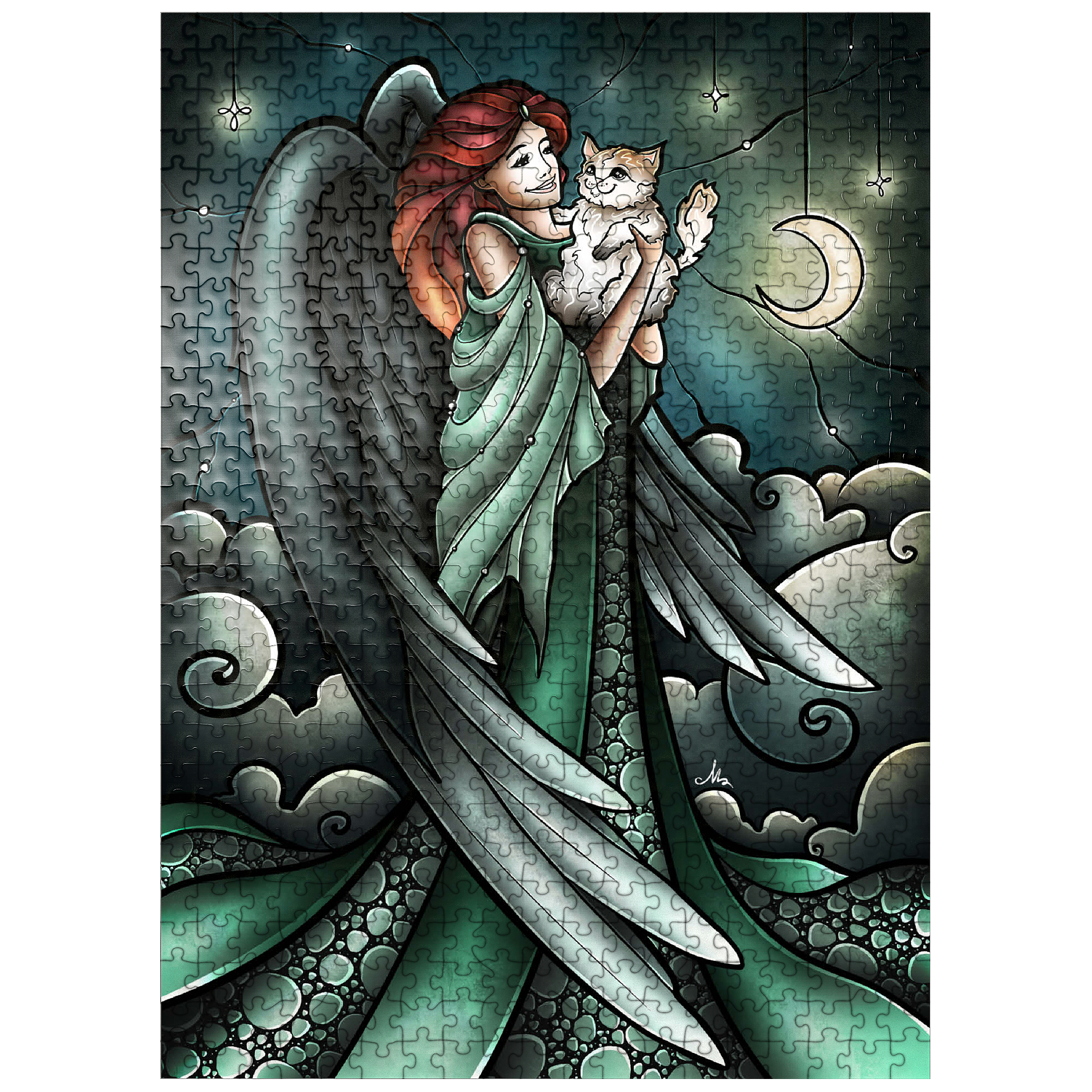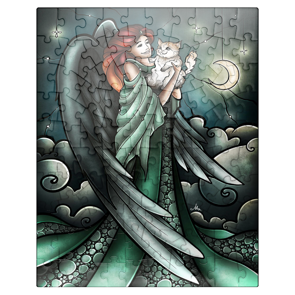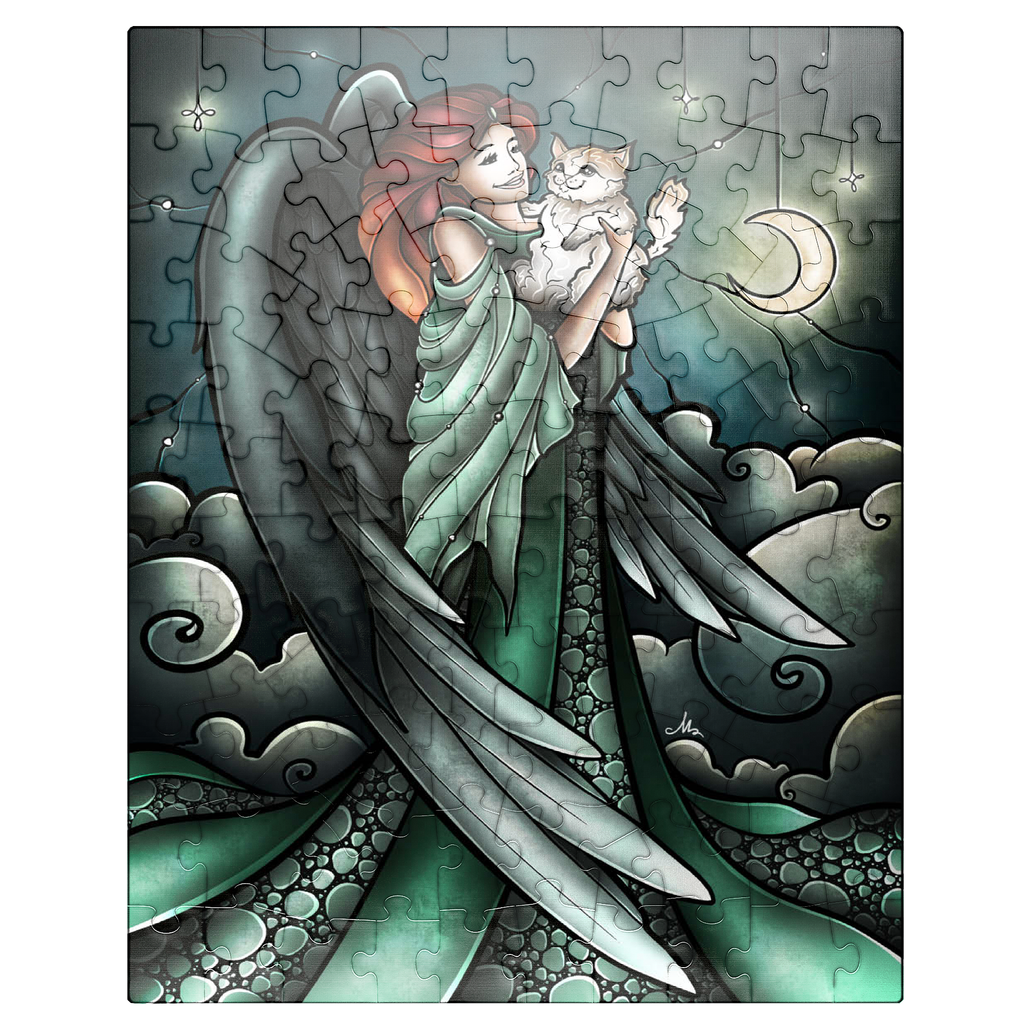 -Unwind and piece together this enchanting painting by Mandie Manzano, a tender depiction of the belief that our beloved feline companions find peace and joy in the afterlife. The overall mood is one of tranquility, comfort, and gentle love, evoking a sense of peace and reassurance about our feline friends. A heartwarming puzzle for cat lovers and dreamers alike.