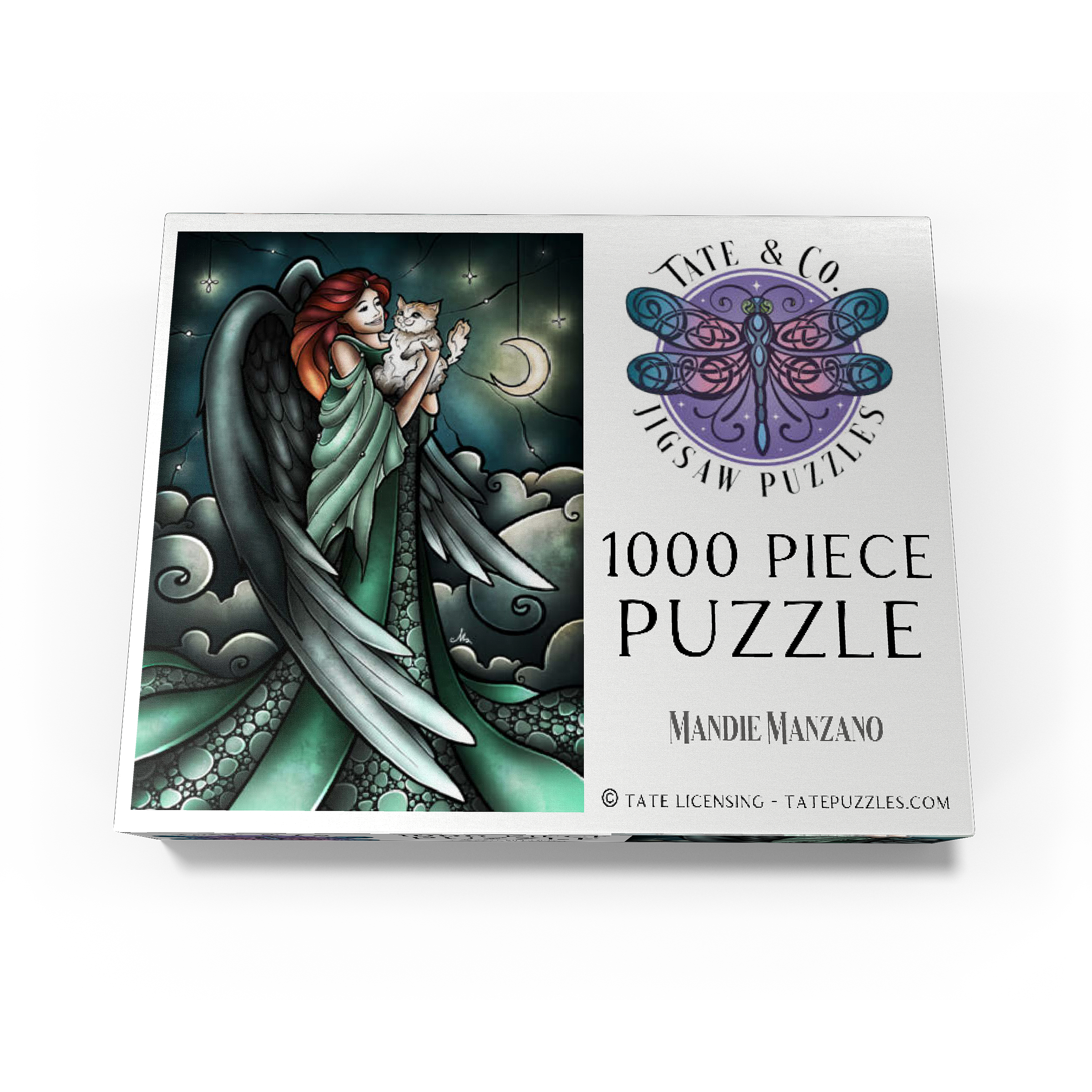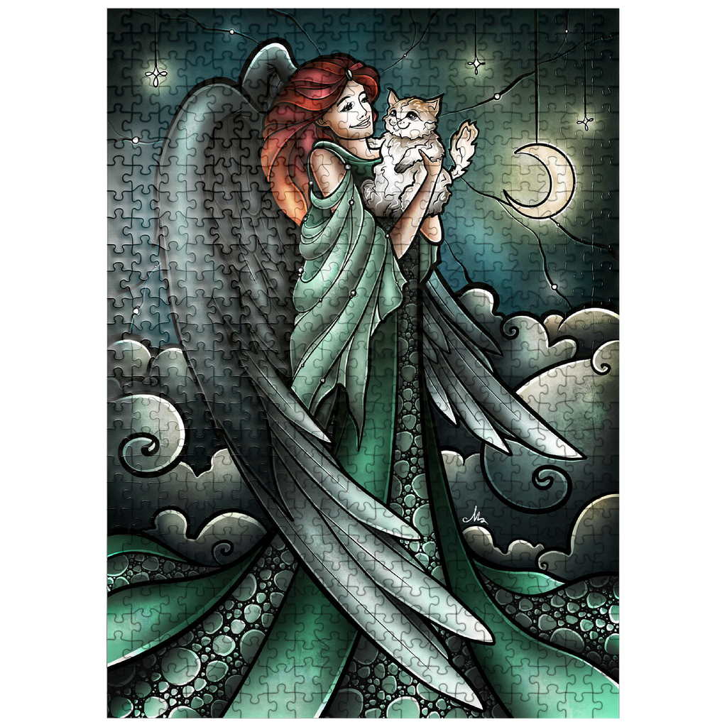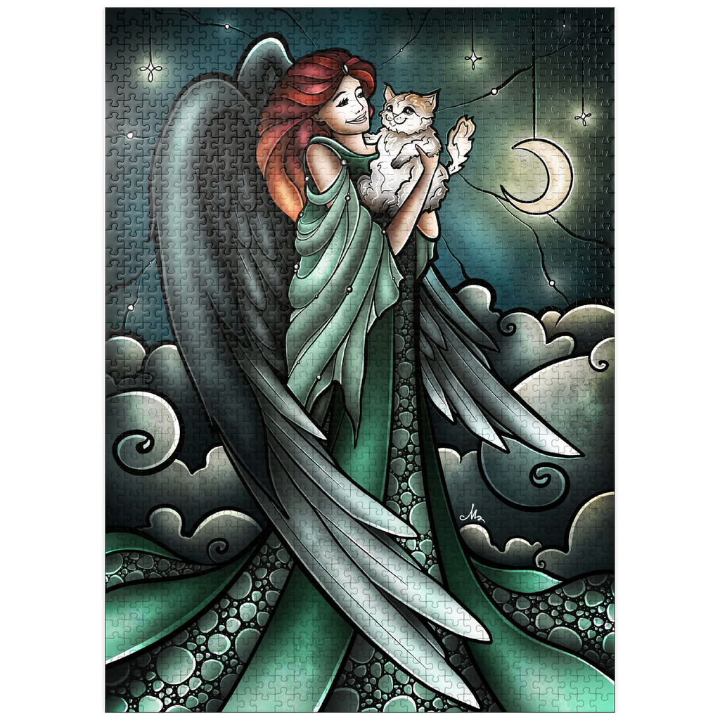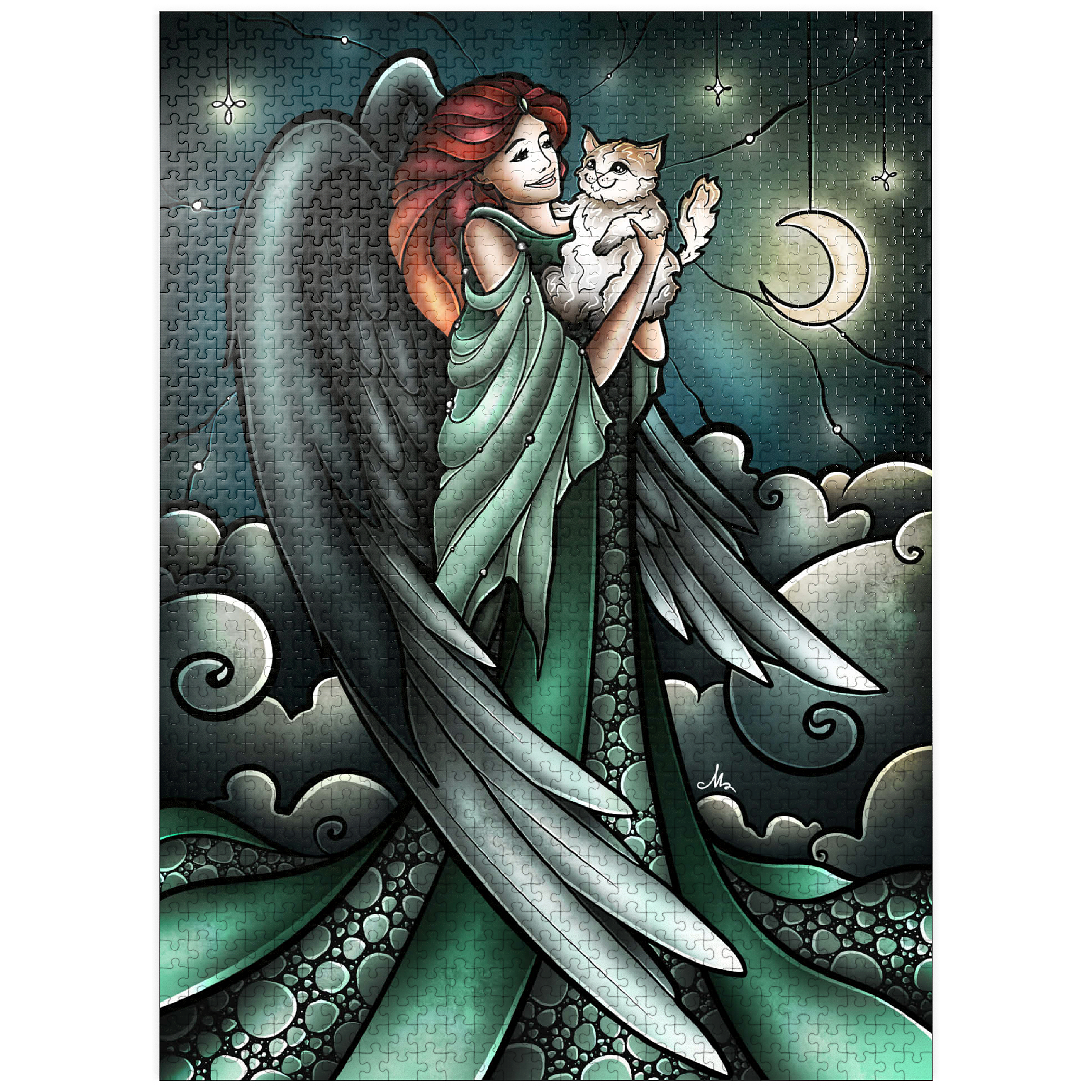 -Unwind and piece together this enchanting painting by Mandie Manzano, a tender depiction of the belief that our beloved feline companions find peace and joy in the afterlife. The overall mood is one of tranquility, comfort, and gentle love, evoking a sense of peace and reassurance about our feline friends. A heartwarming puzzle for cat lovers and dreamers alike.
