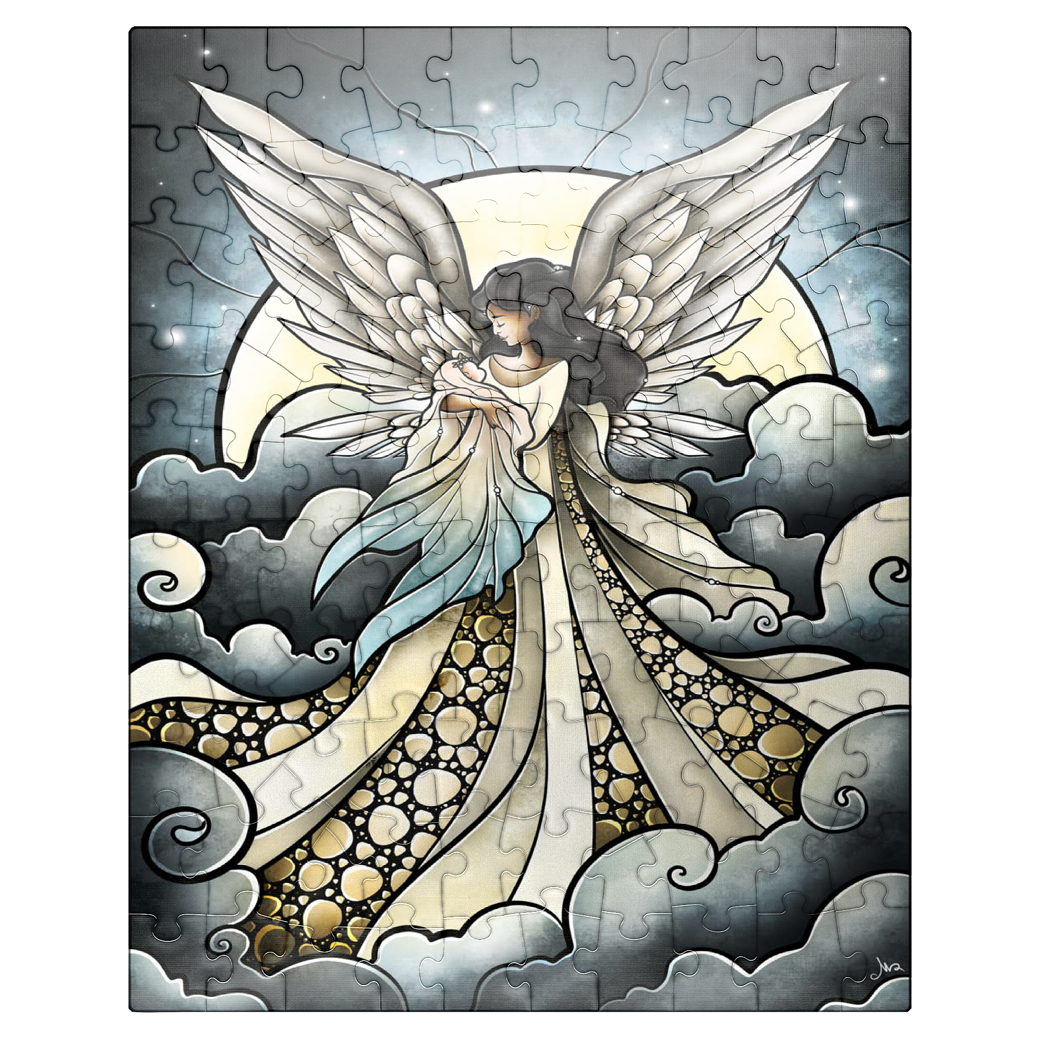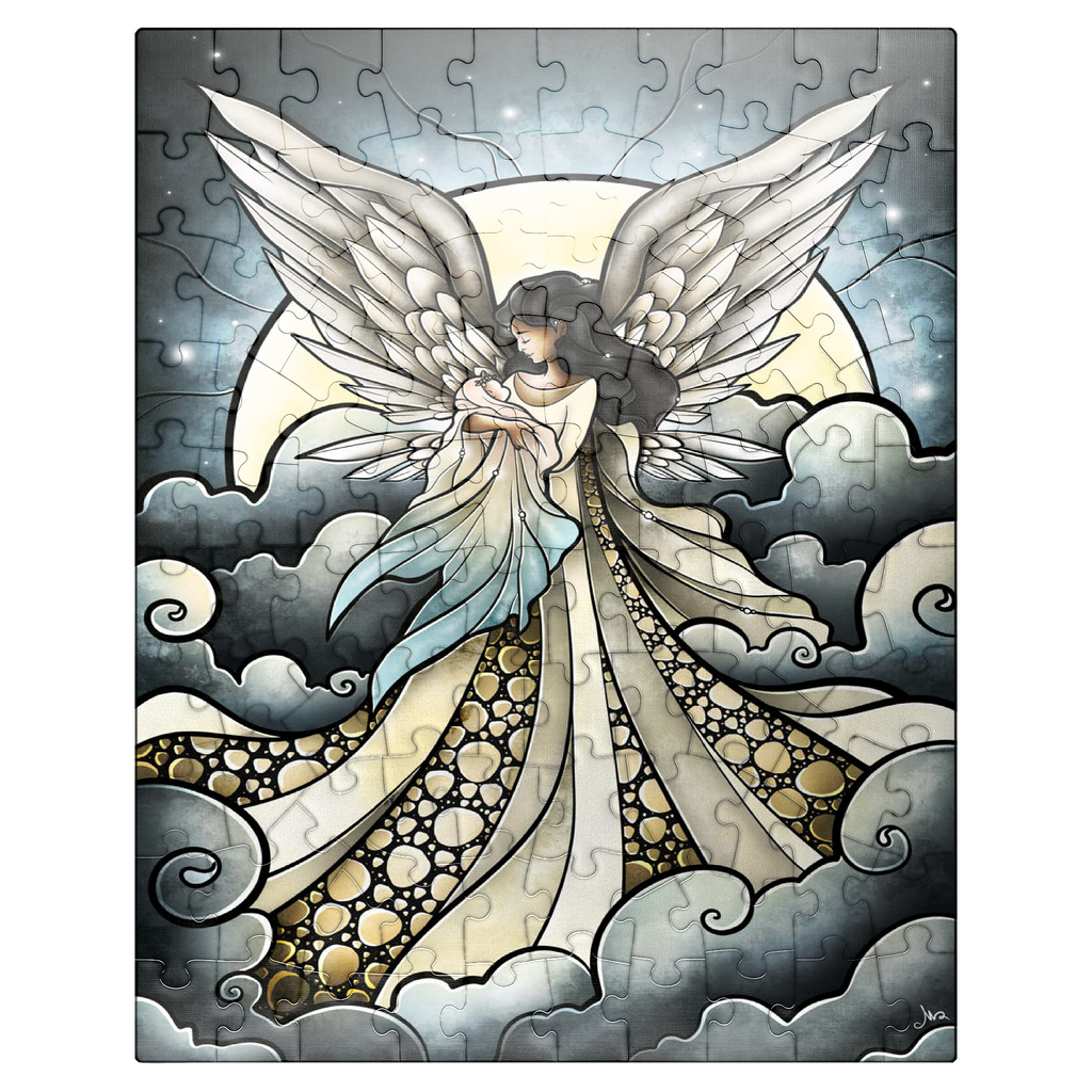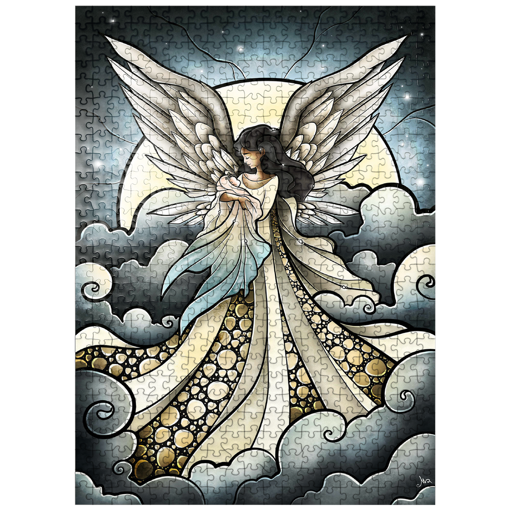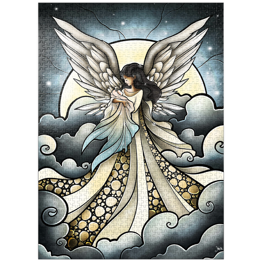 -Find peace a solace in this painting created by artist Mandie Manzano. An ethereal angel with magnificent, guardian wings stands silhouetted against a radiant moon, cradling and welcoming a beautiful delicate baby back into the arms of heavenly love. Swirling clouds create a dreamlike setting, while intricate details in the angel's gown and feathers add depth and wonder. Piece together this serene and detailed artwork and experience a moment of heavenly tranquility and hopefully heal a piece of the heart as well. Carried and loved...-