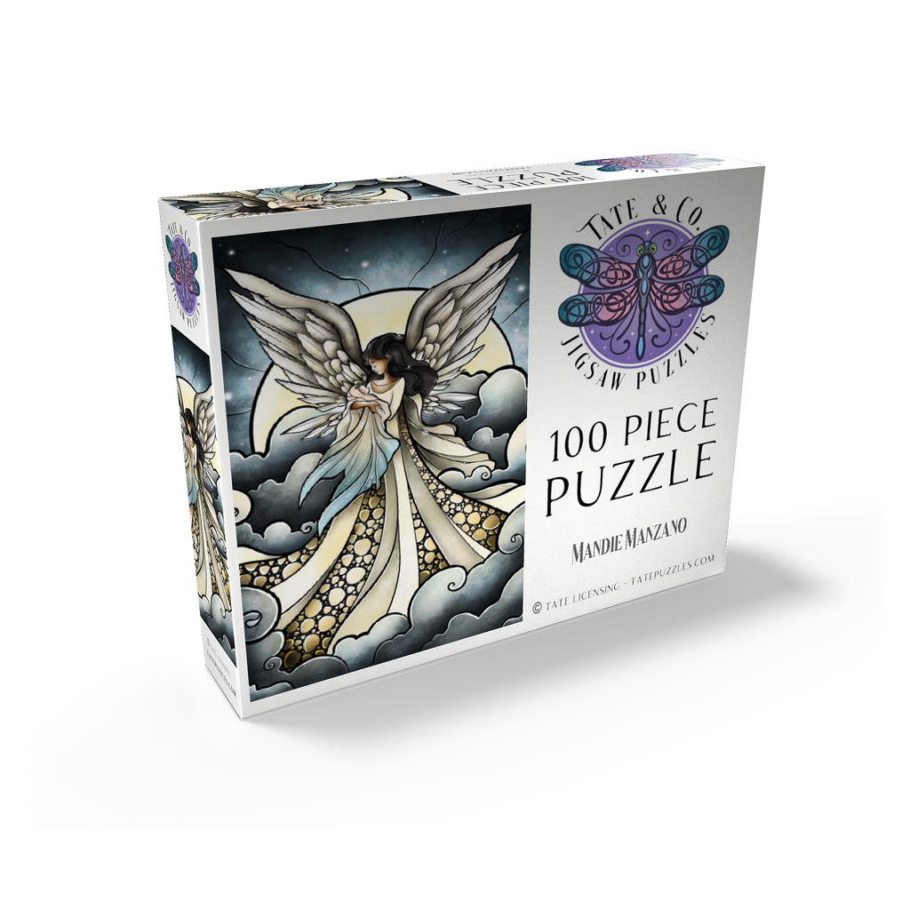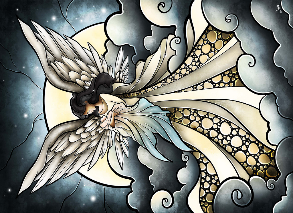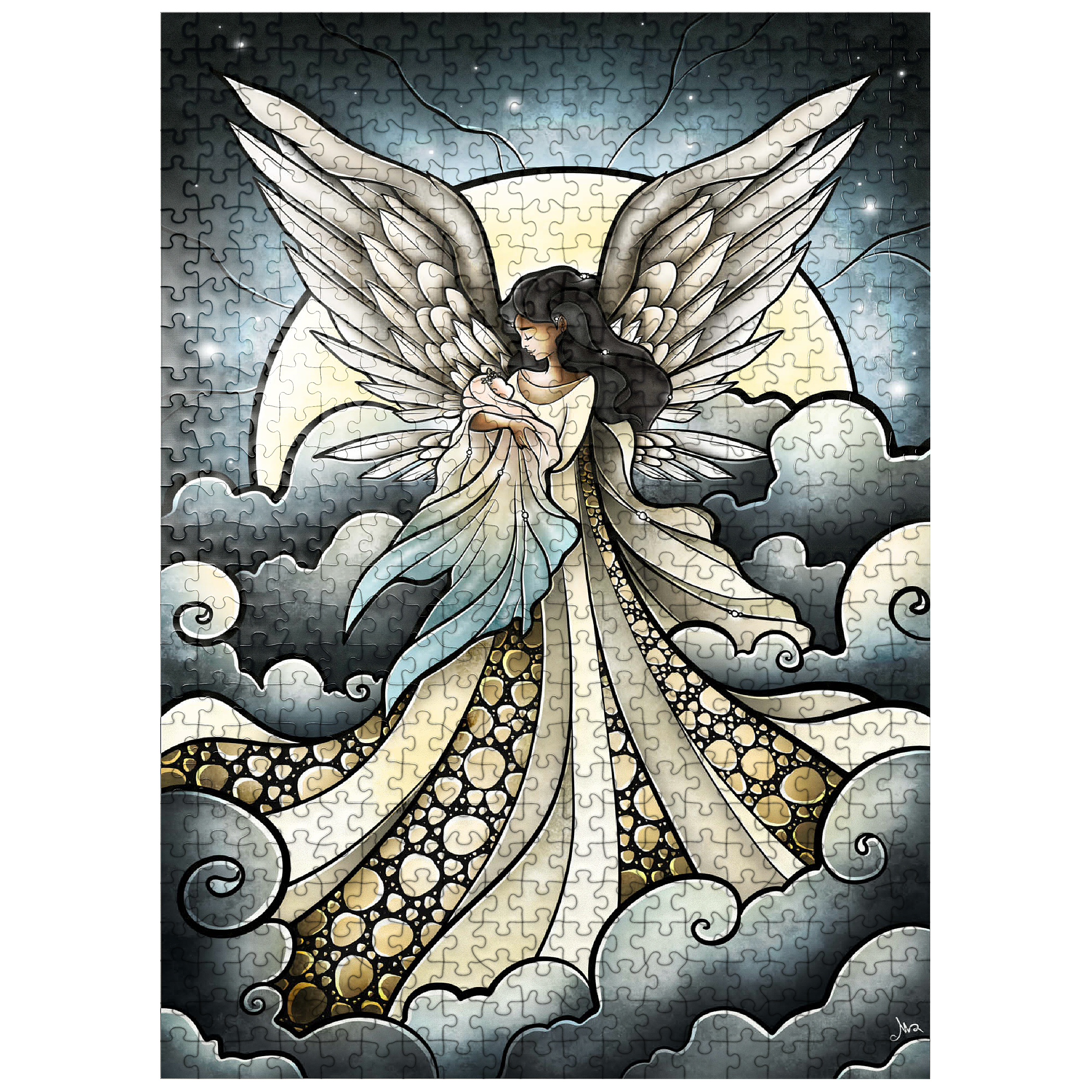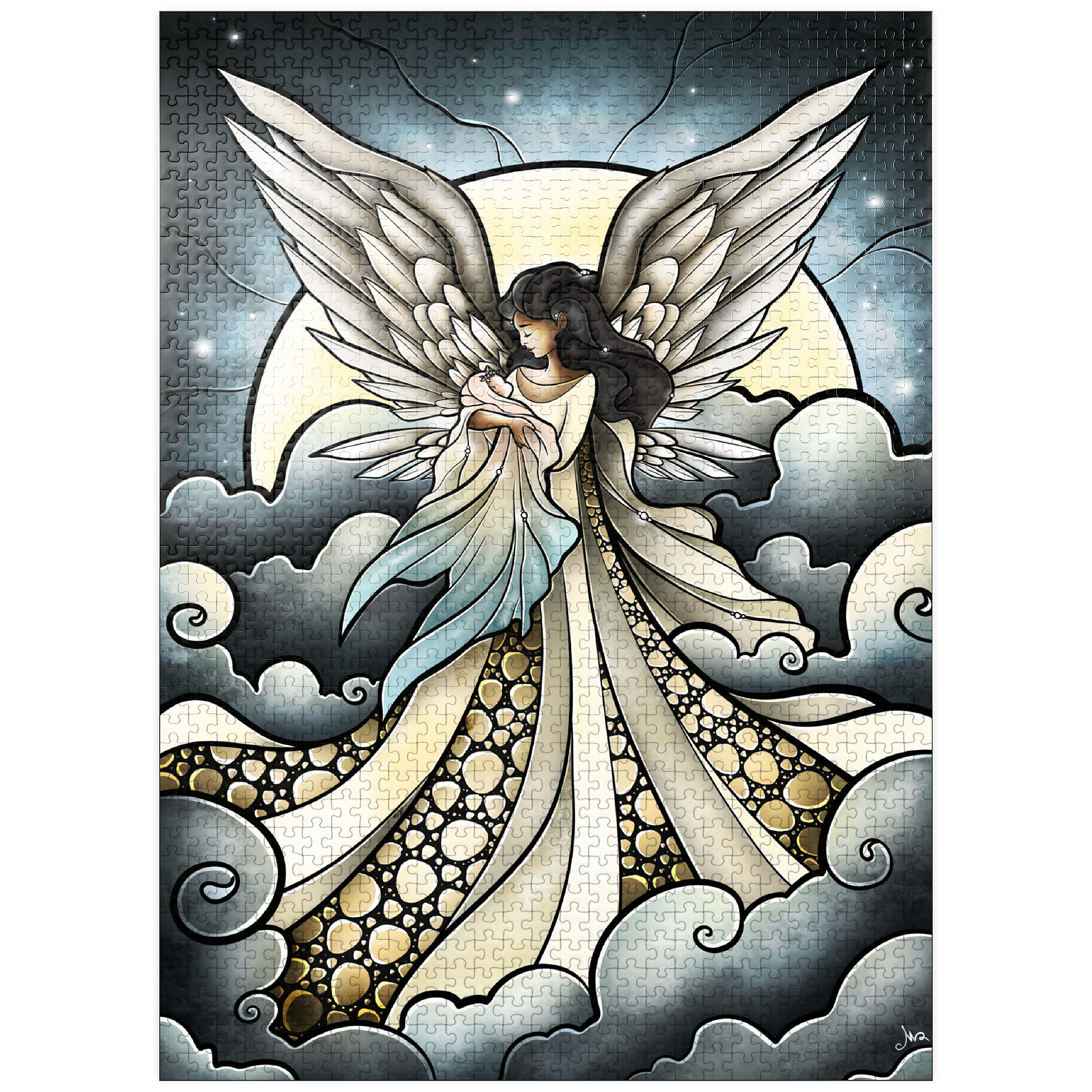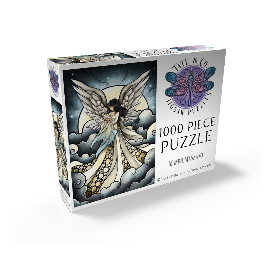 -Find peace a solace in this painting created by artist Mandie Manzano. An ethereal angel with magnificent, guardian wings stands silhouetted against a radiant moon, cradling and welcoming a beautiful delicate baby back into the arms of heavenly love. Swirling clouds create a dreamlike setting, while intricate details in the angel's gown and feathers add depth and wonder. Piece together this serene and detailed artwork and experience a moment of heavenly tranquility and hopefully heal a piece of the heart as well. Carried and loved...-