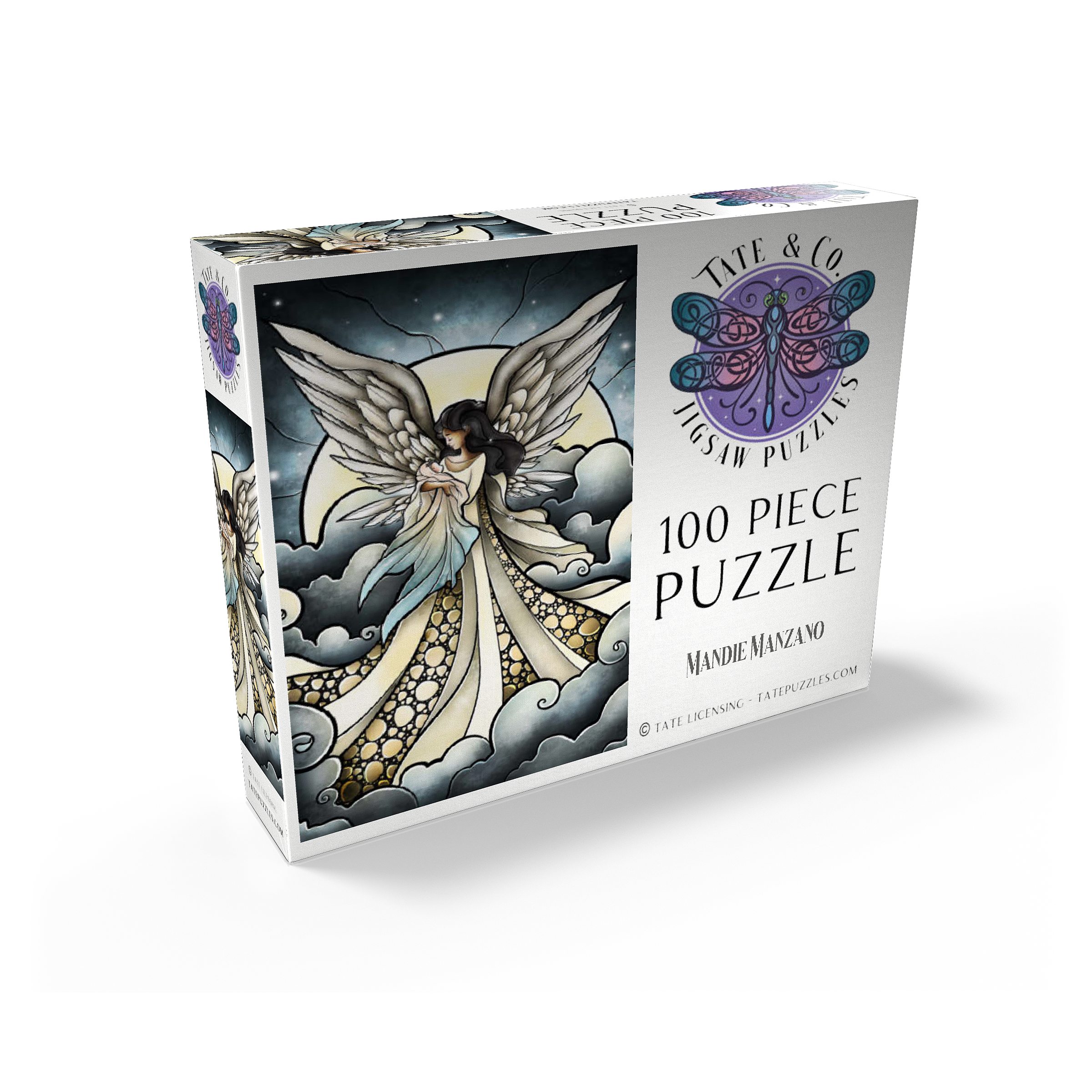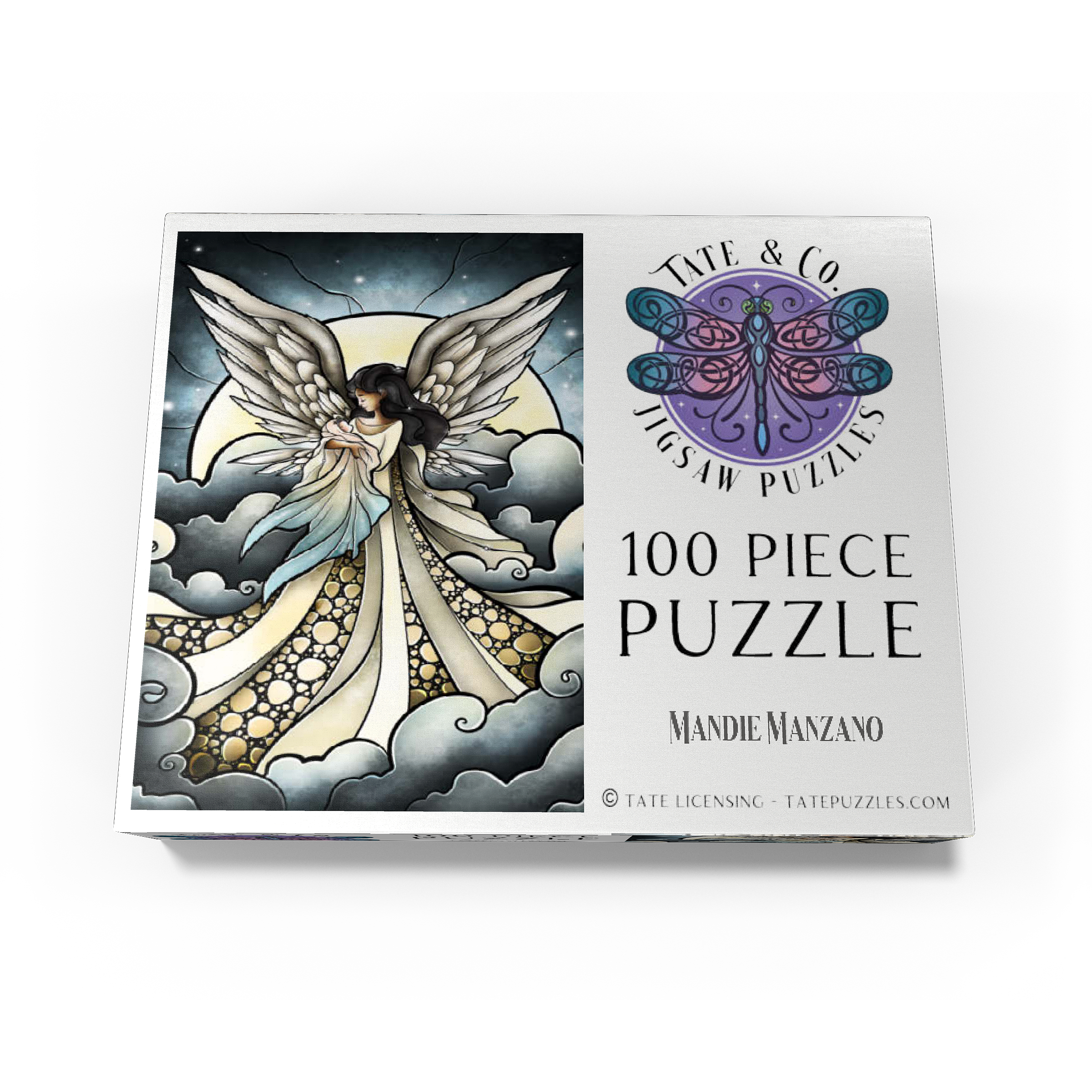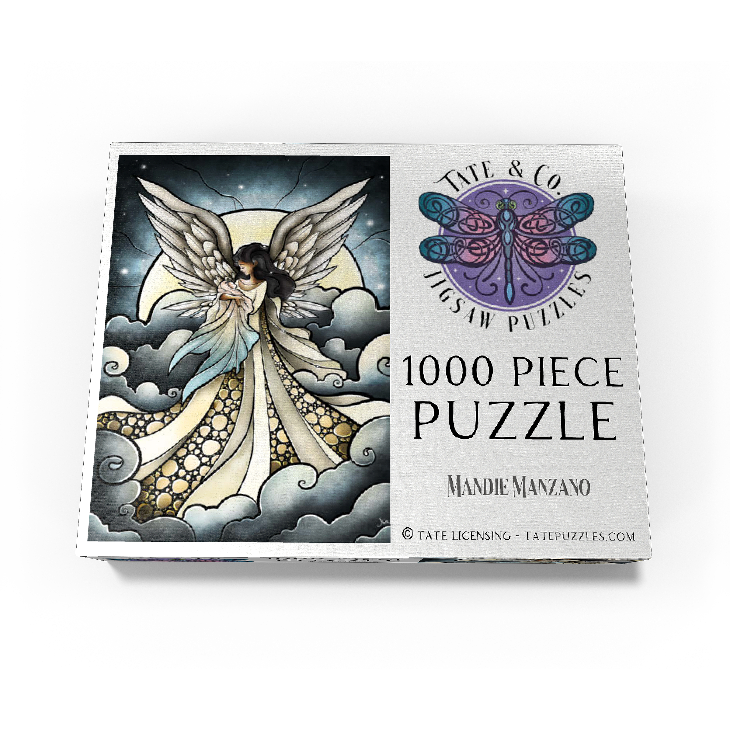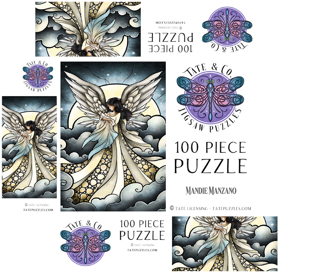 -Find peace a solace in this painting created by artist Mandie Manzano. An ethereal angel with magnificent, guardian wings stands silhouetted against a radiant moon, cradling and welcoming a beautiful delicate baby back into the arms of heavenly love. Swirling clouds create a dreamlike setting, while intricate details in the angel's gown and feathers add depth and wonder. Piece together this serene and detailed artwork and experience a moment of heavenly tranquility and hopefully heal a piece of the heart as well. Carried and loved...-