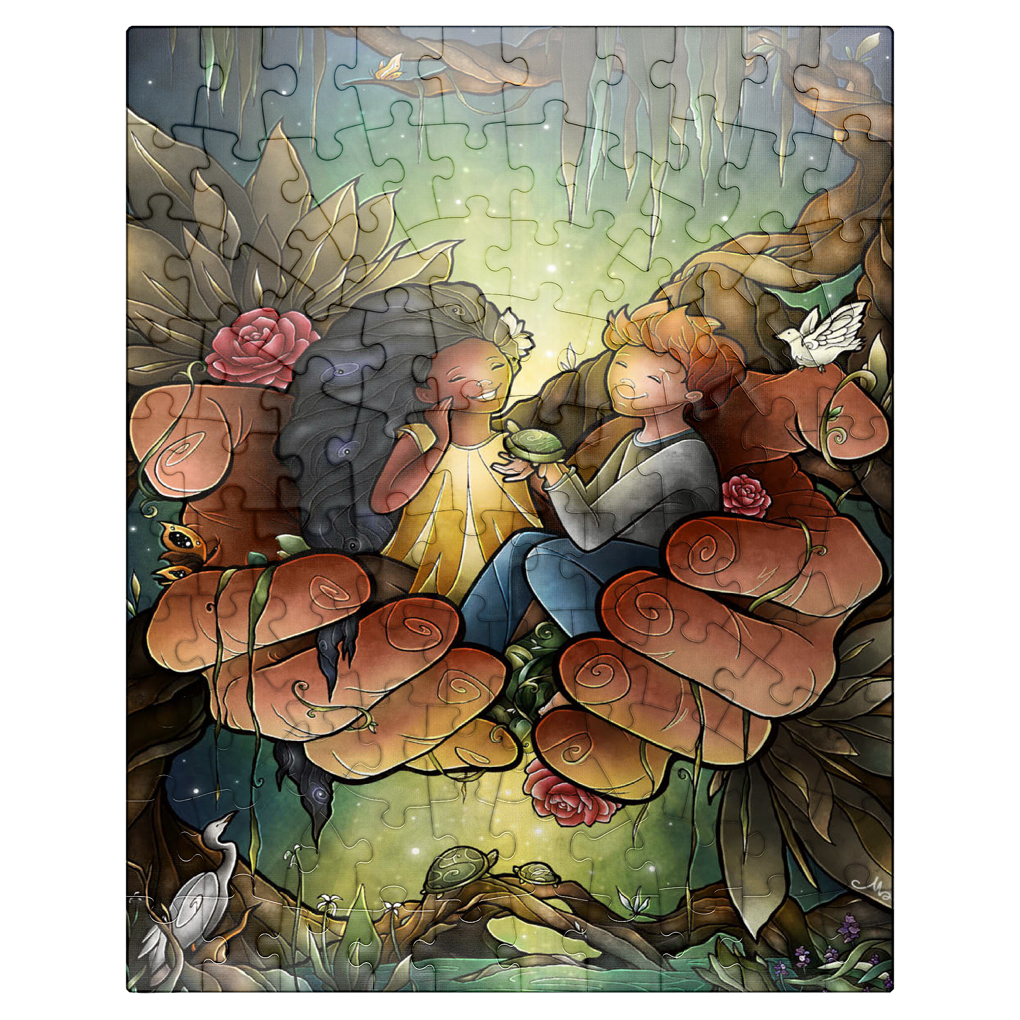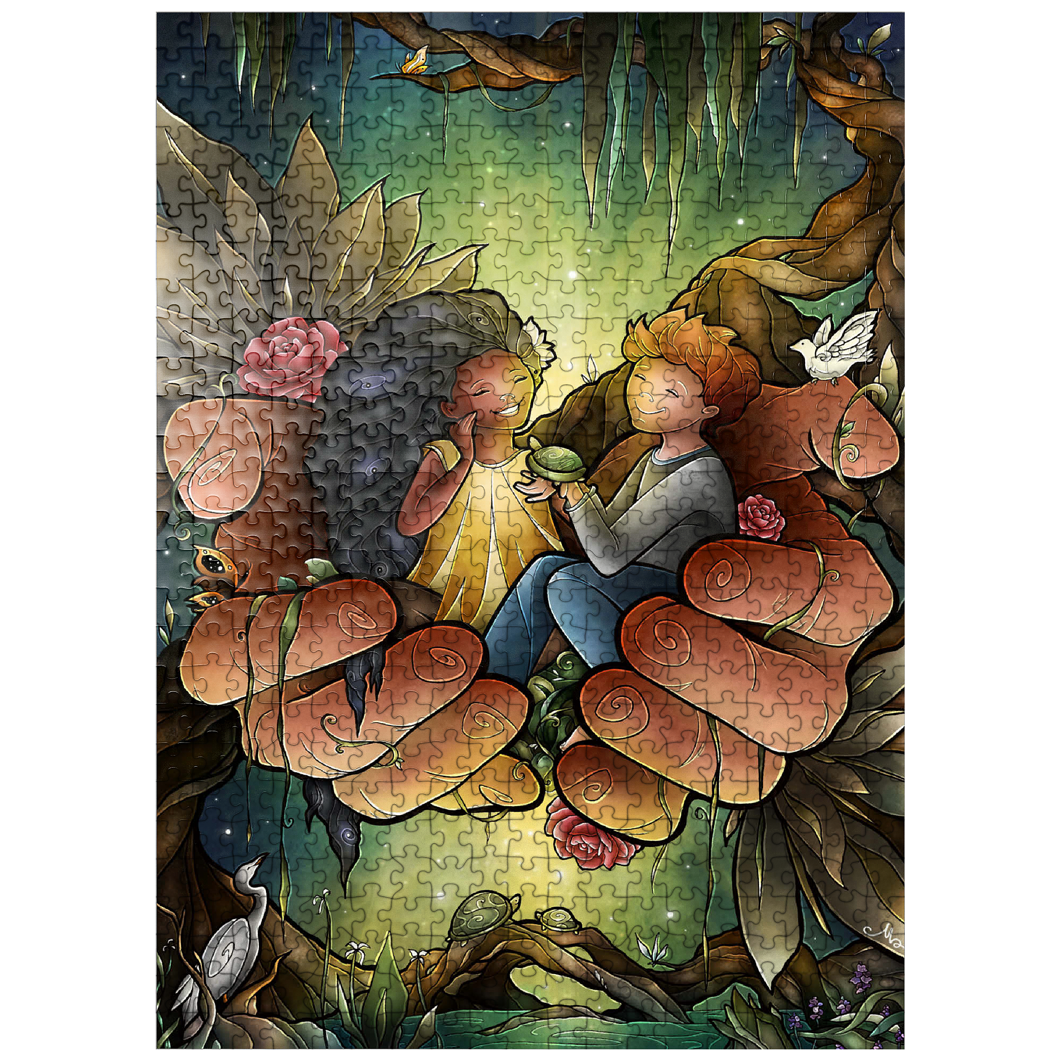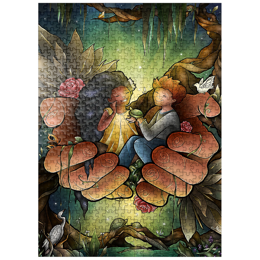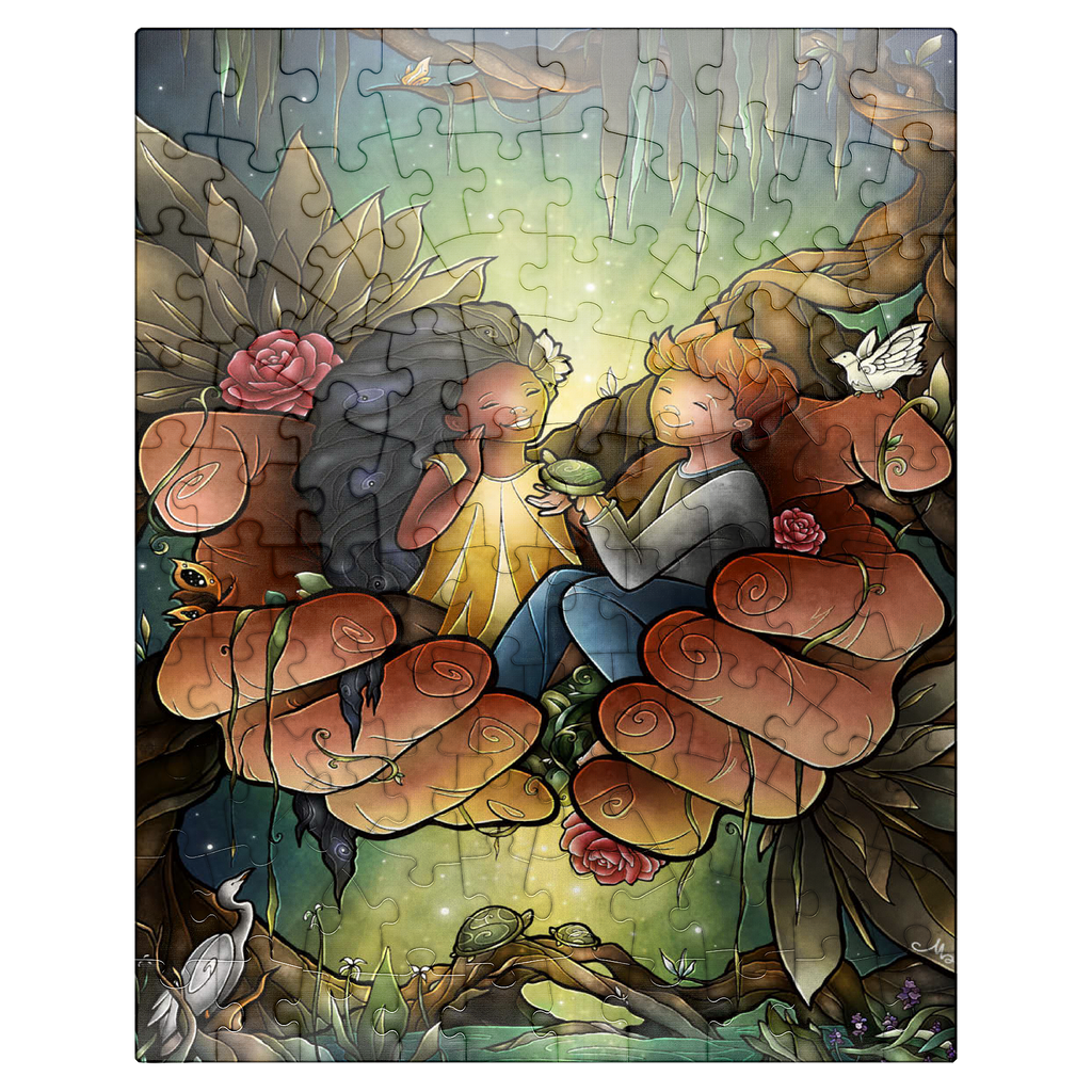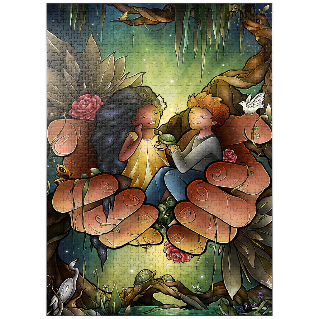 Piece together this heartwarming image of two friends cradled in the hands of the God. The tender scene, surrounded by lush bayou, delicate flowers, and peaceful creatures like turtles and an egret, evokes a sense of care and harmony. The joyful expressions on the children's faces suggest a bond of affection and companionship. Reflect on the theme of -Loving One Another as I have loved you- as you assemble this touching and symbolic puzzle.