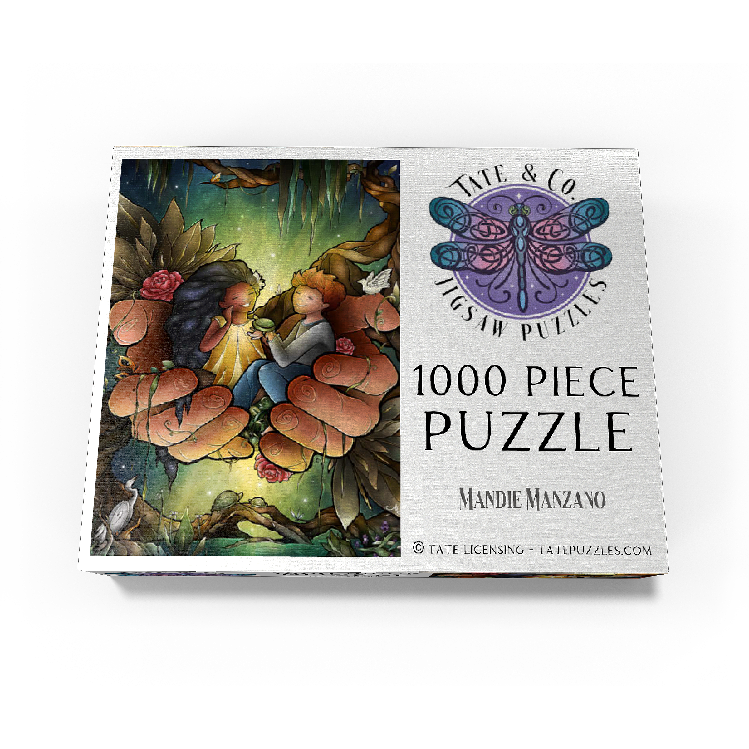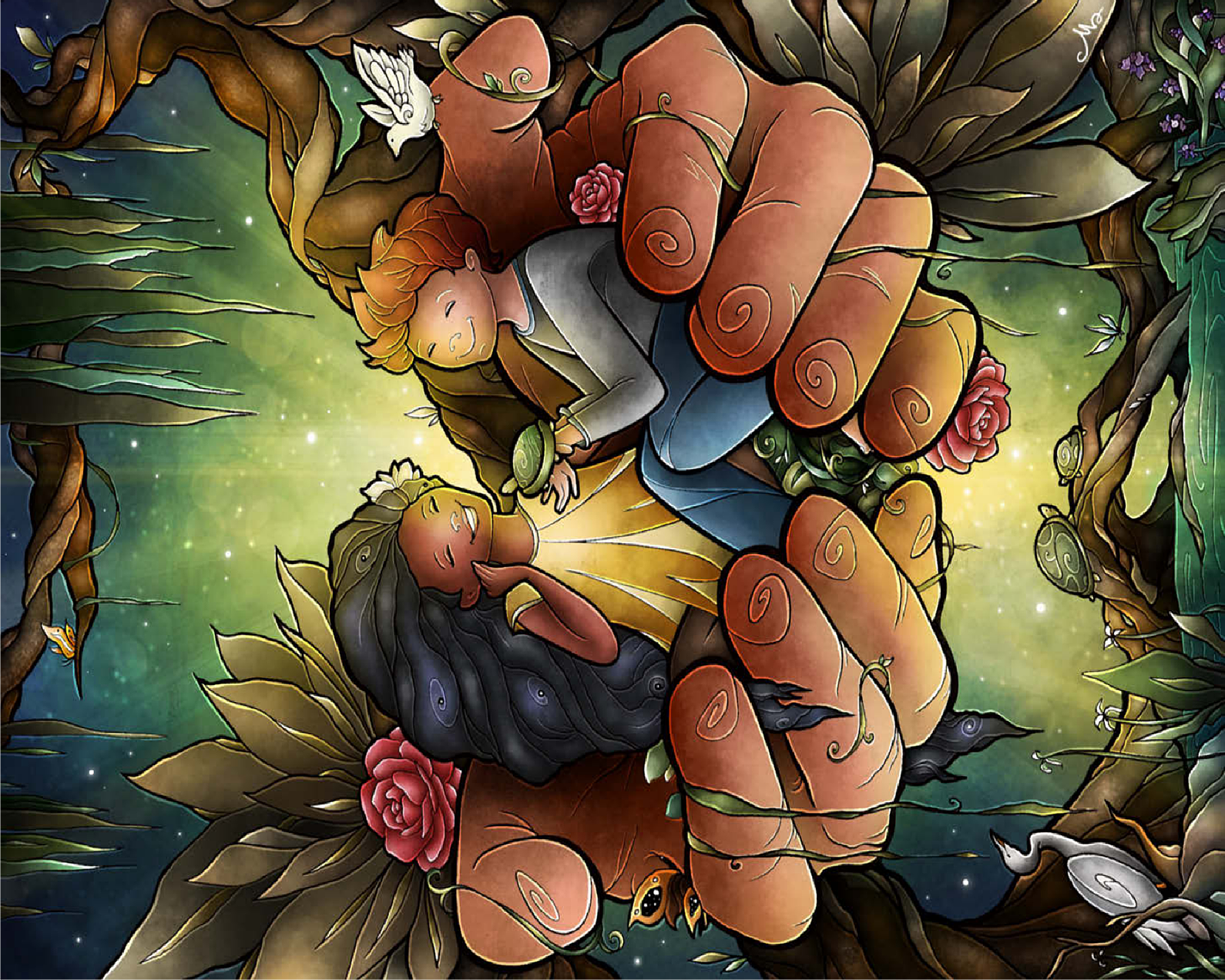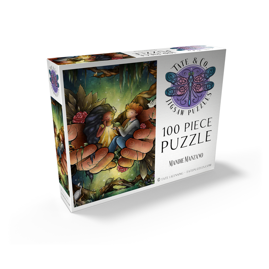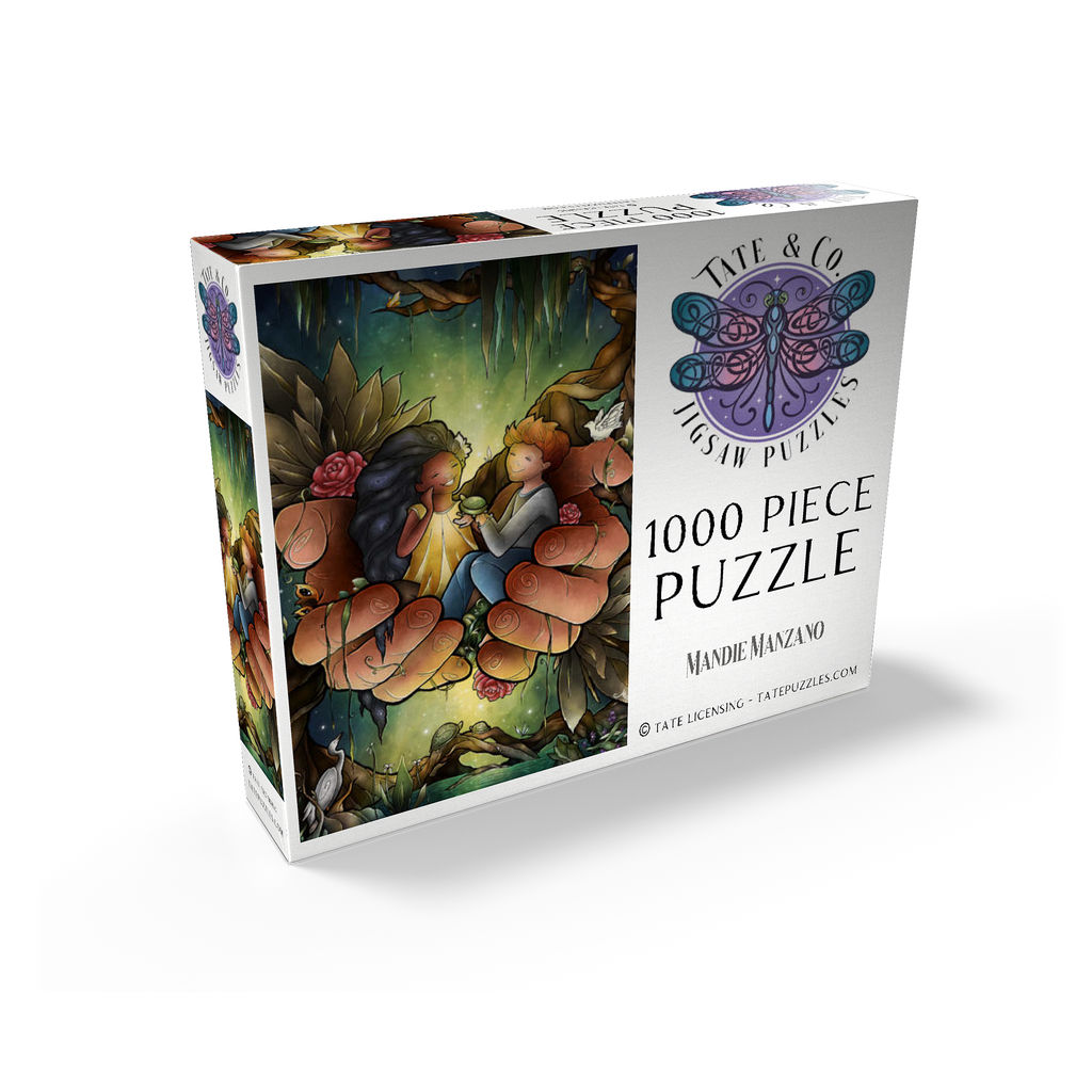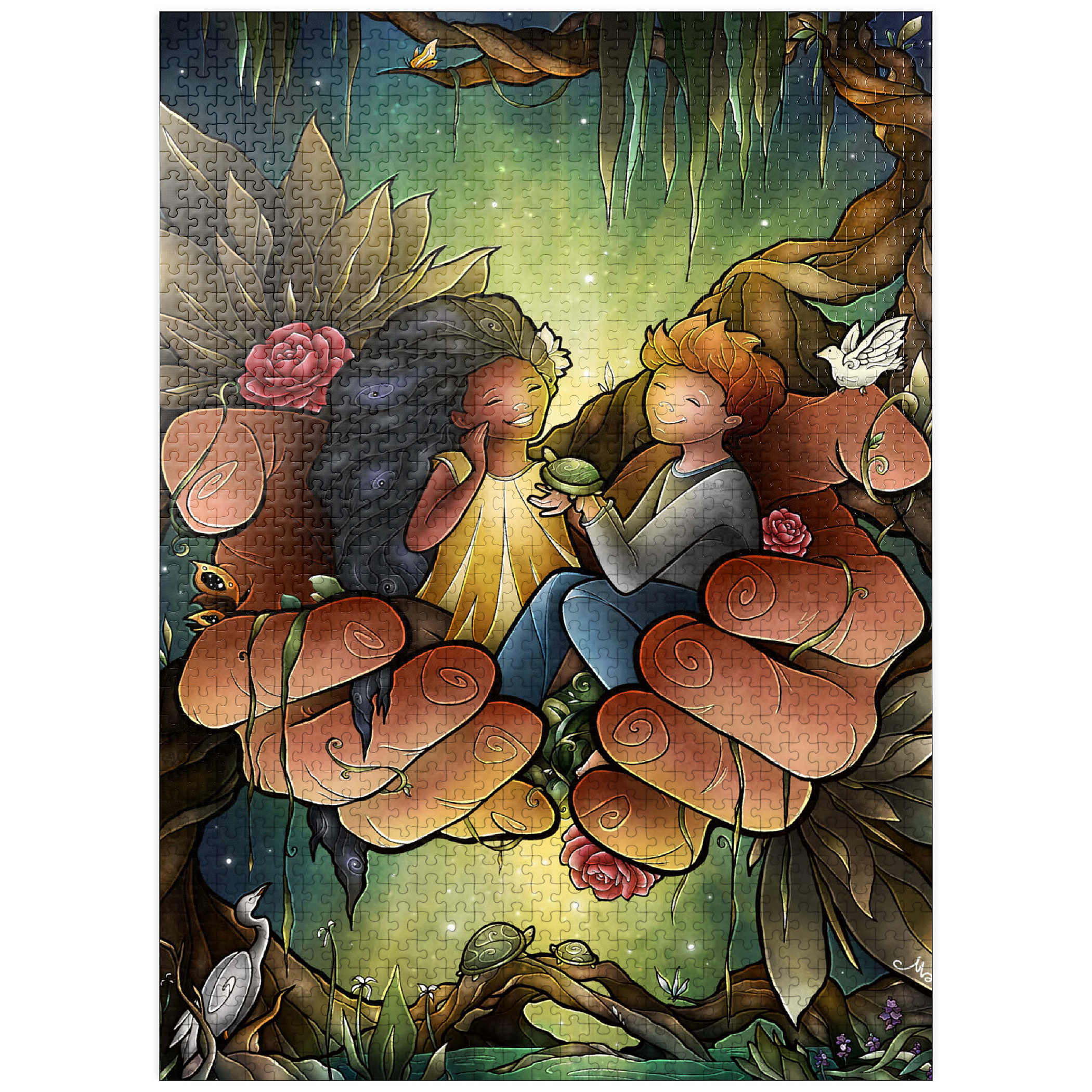 Piece together this heartwarming image of two friends cradled in the hands of the God. The tender scene, surrounded by lush bayou, delicate flowers, and peaceful creatures like turtles and an egret, evokes a sense of care and harmony. The joyful expressions on the children's faces suggest a bond of affection and companionship. Reflect on the theme of -Loving One Another as I have loved you- as you assemble this touching and symbolic puzzle.