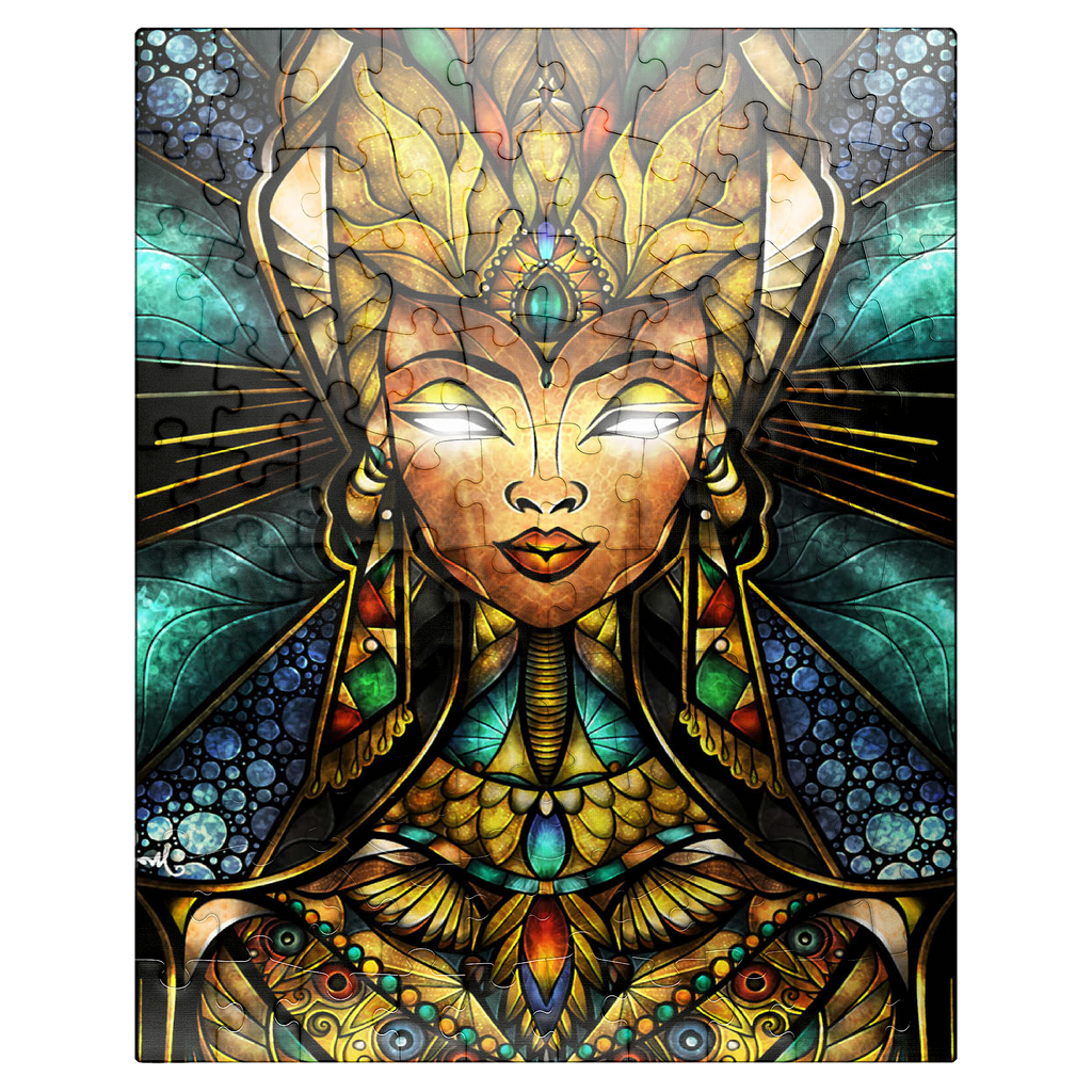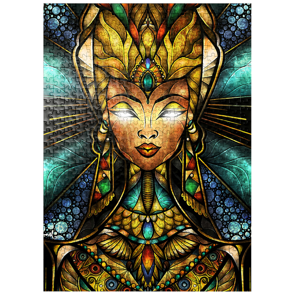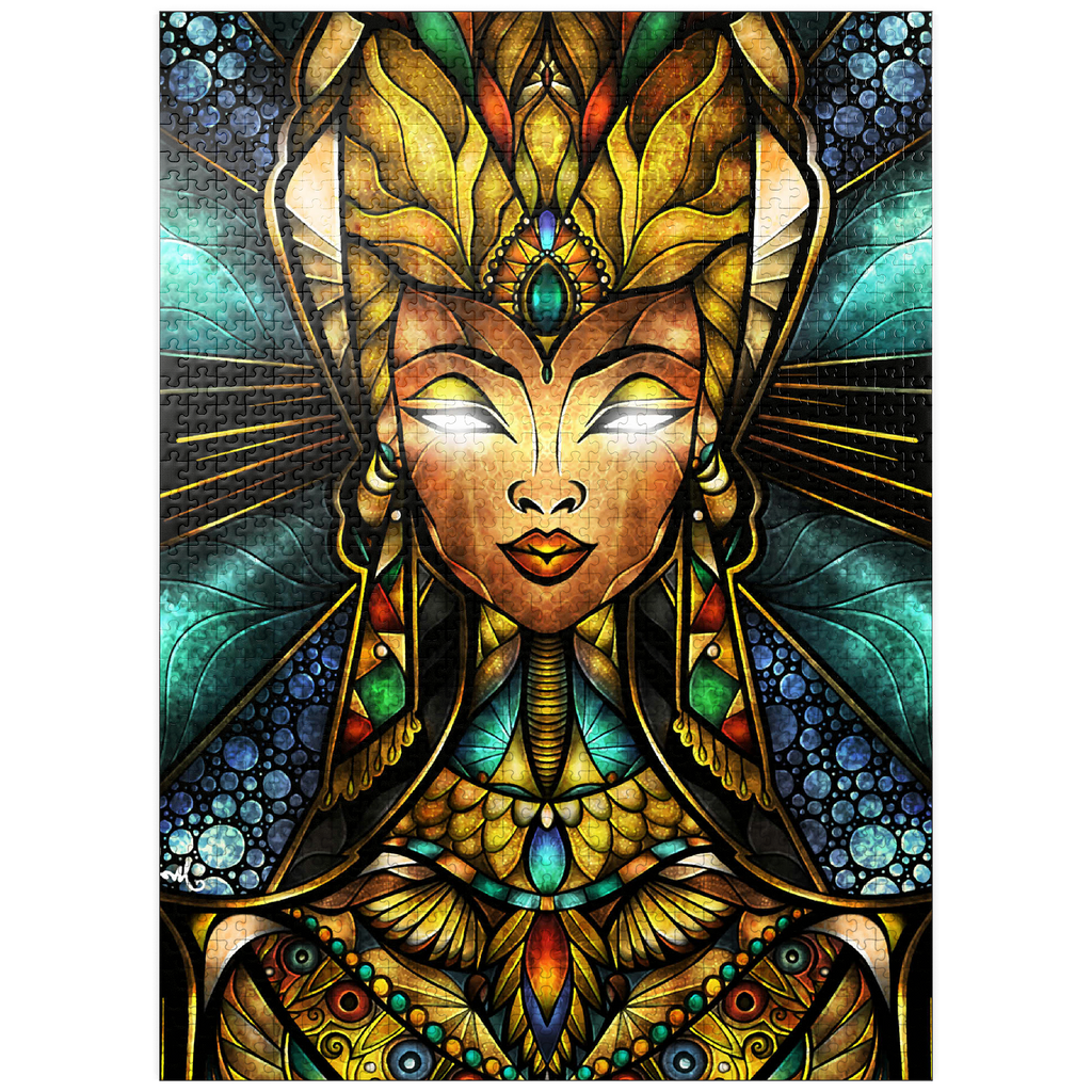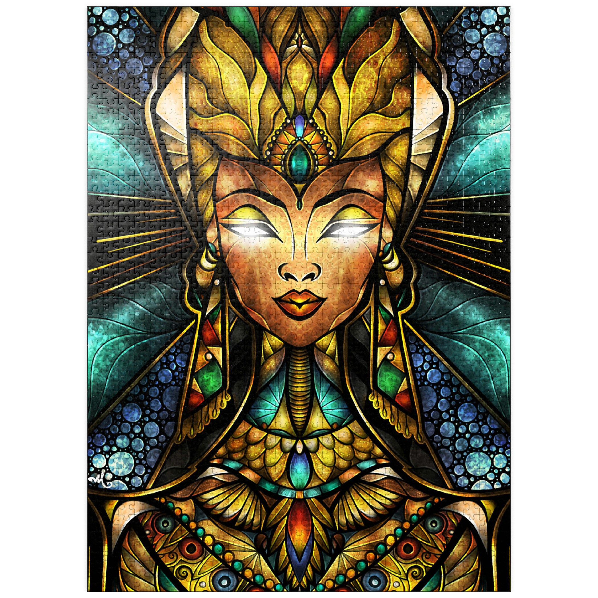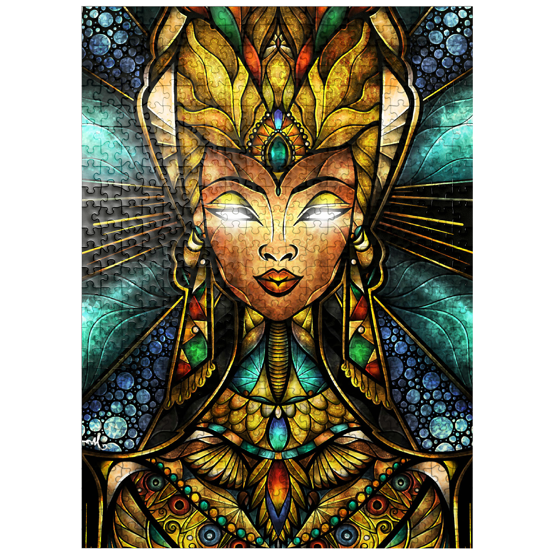 Unveil the regal beauty of Nefertiti! Piece together this striking, stained-glass style portrait of the iconic Egyptian queen. Her serene face, adorned with a magnificent headdress embellished with gold and jewels, commands attention. Intricate patterns in teal, gold, and vibrant hues create a sense of ancient splendor and mystique. Experience the timeless elegance and power of Nefertiti with every uniquely shaped puzzle piece.