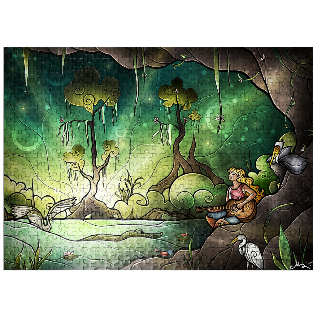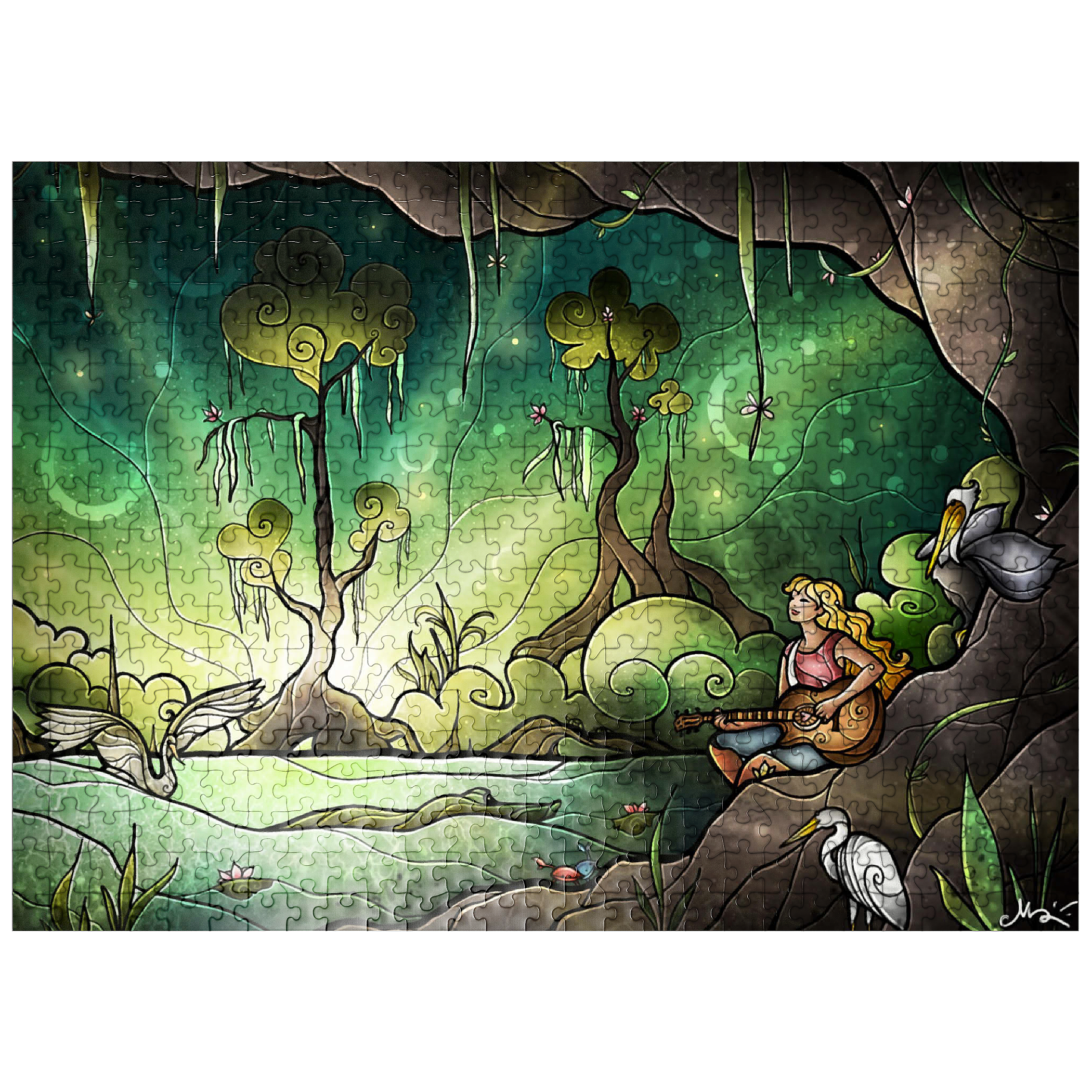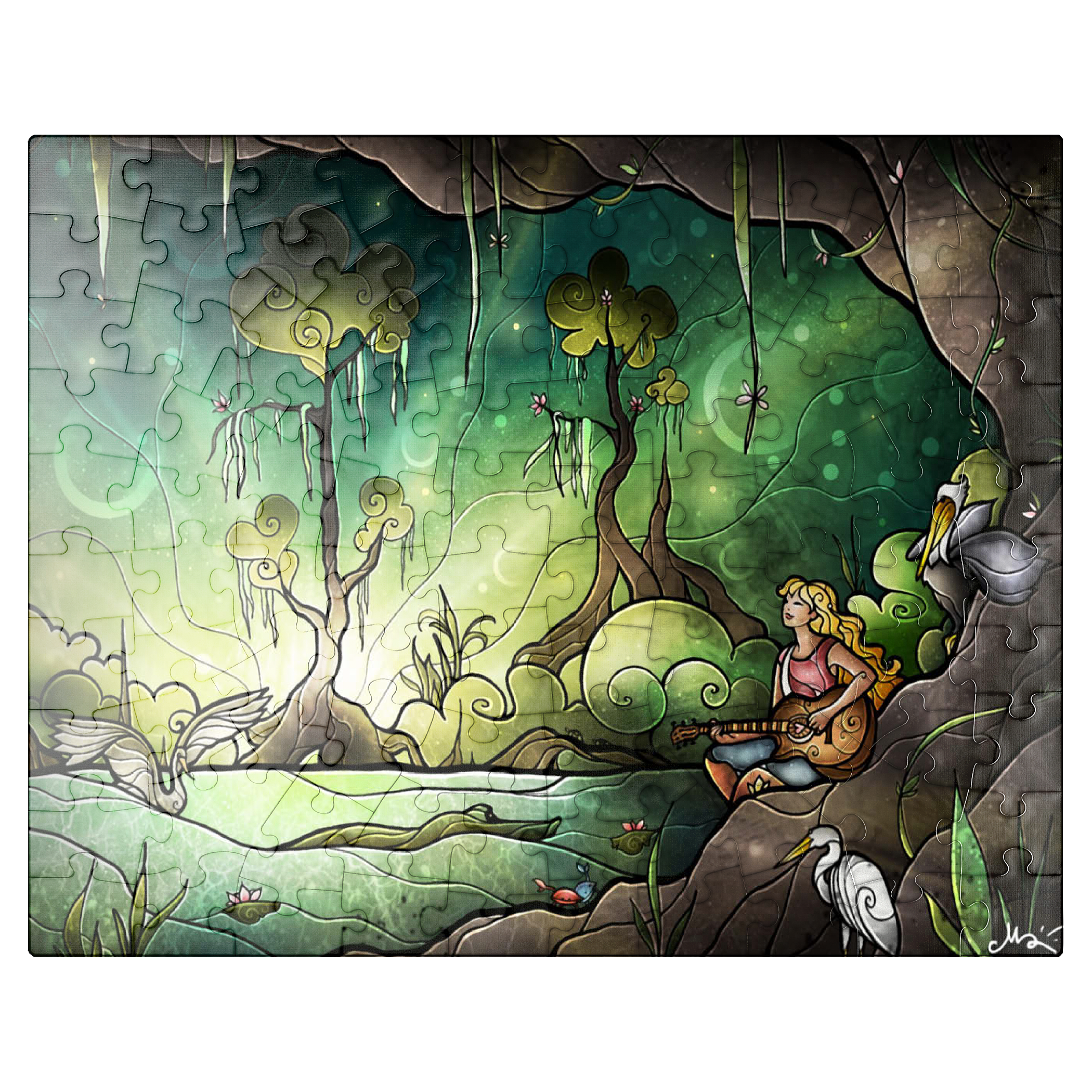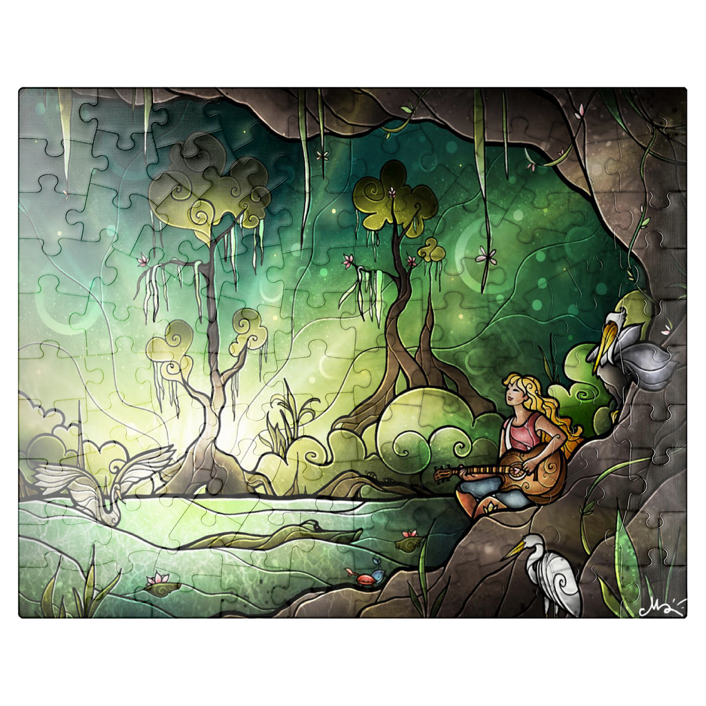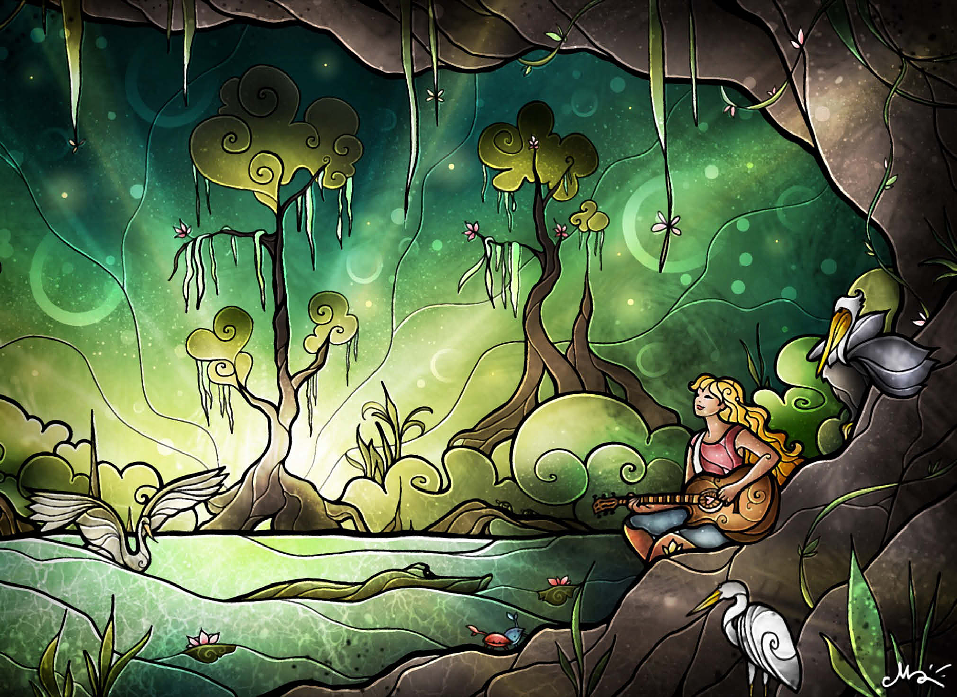 -Dive unto this enchanting bayou scene! A young girl with flowing hair strums her guitar, serenading the diverse creatures of the swamp. Pelicans, egrets, alligators, and fireflies gather to listen amidst the moss-draped trees and still waters. Unravel this peaceful symphony of the Louisiana wetlands.