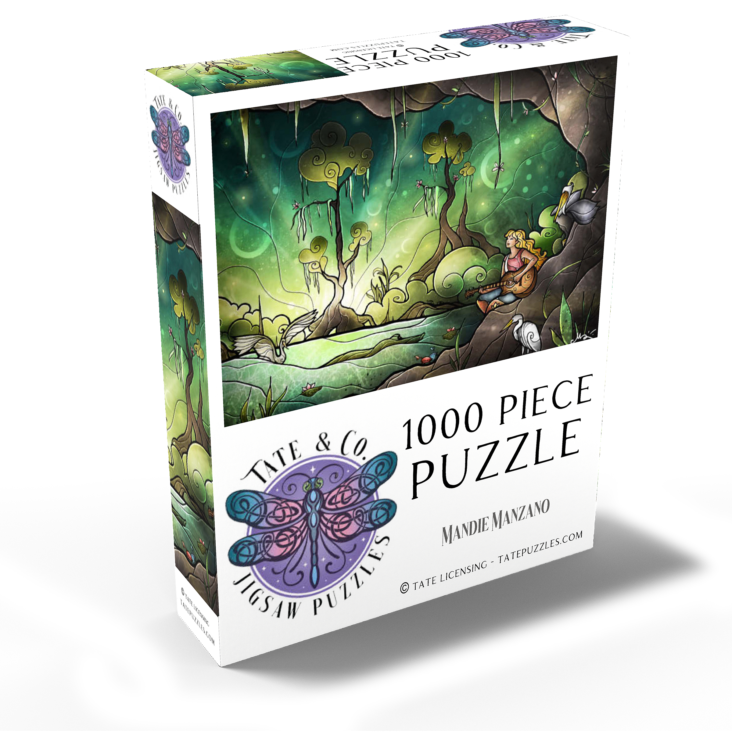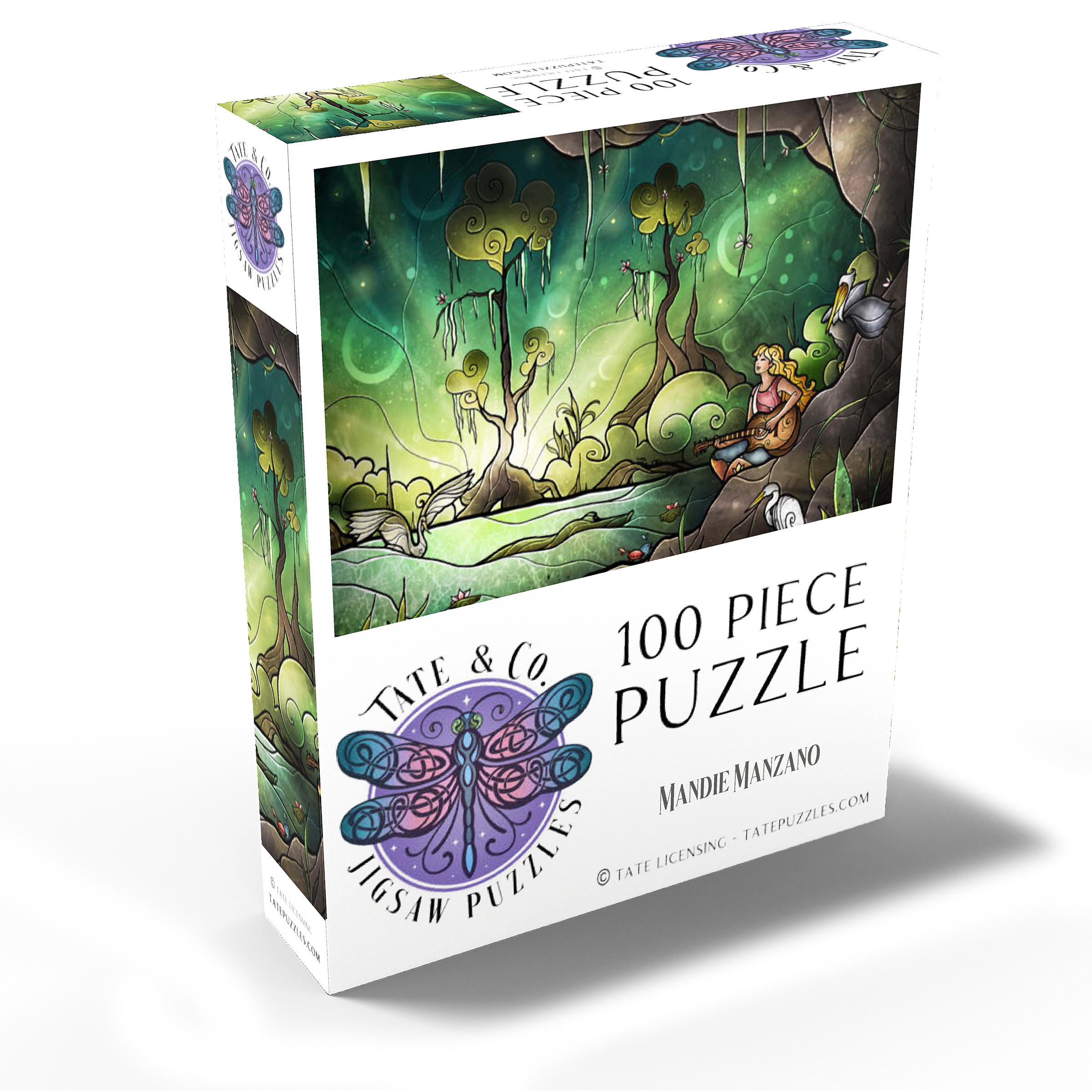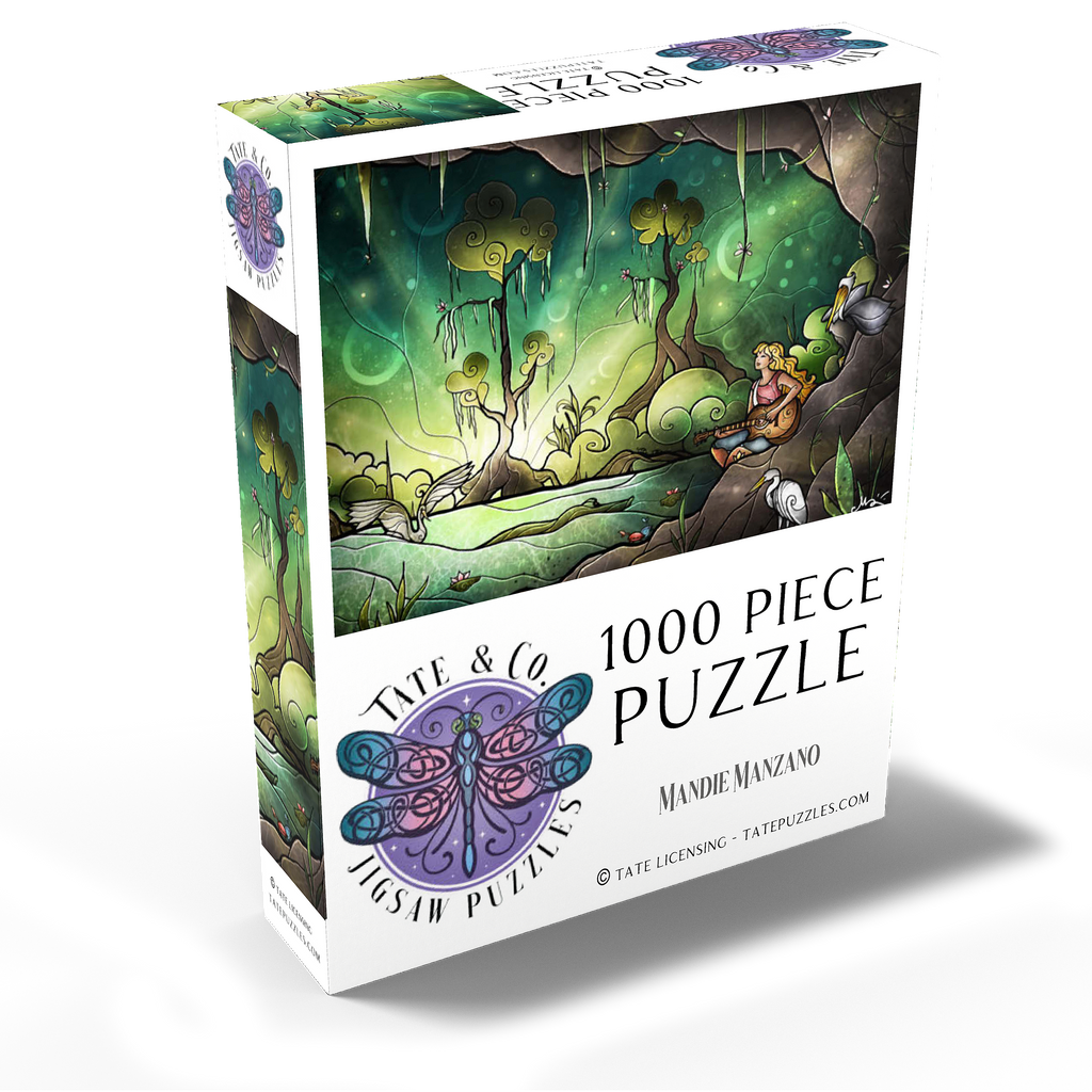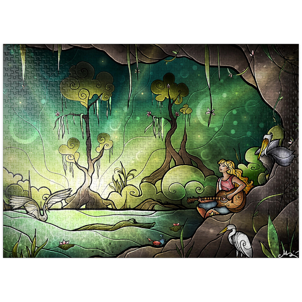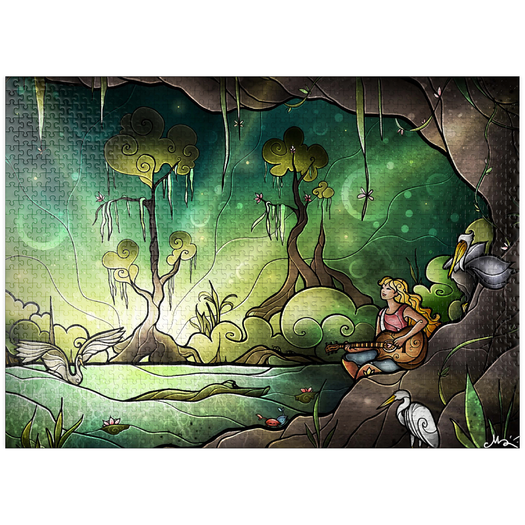 -Dive unto this enchanting bayou scene! A young girl with flowing hair strums her guitar, serenading the diverse creatures of the swamp. Pelicans, egrets, alligators, and fireflies gather to listen amidst the moss-draped trees and still waters. Unravel this peaceful symphony of the Louisiana wetlands.