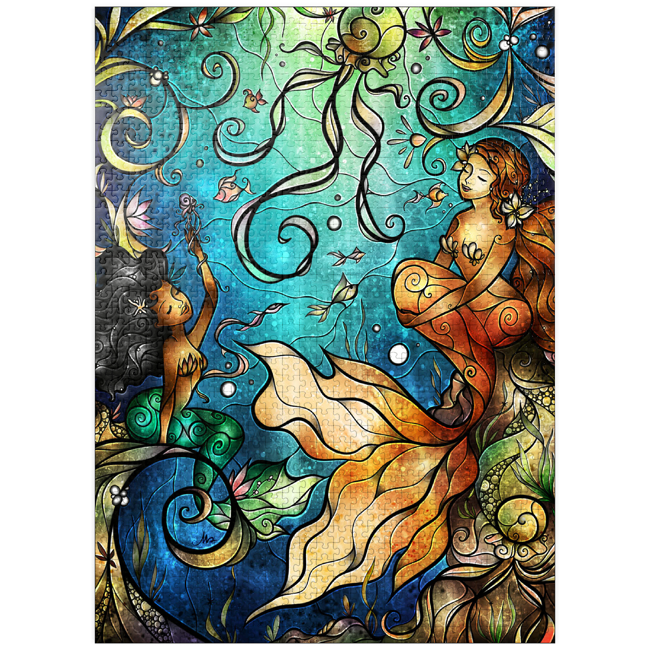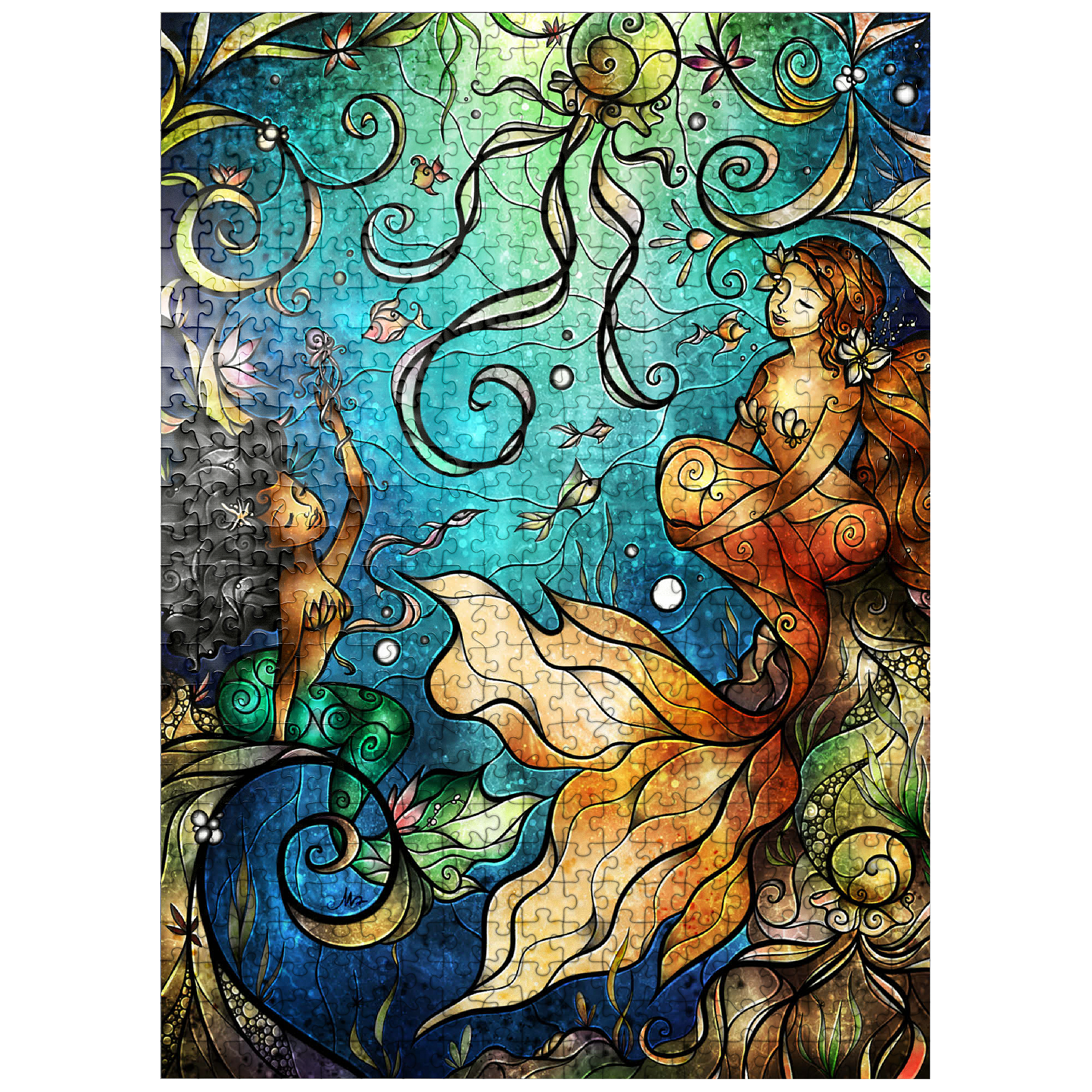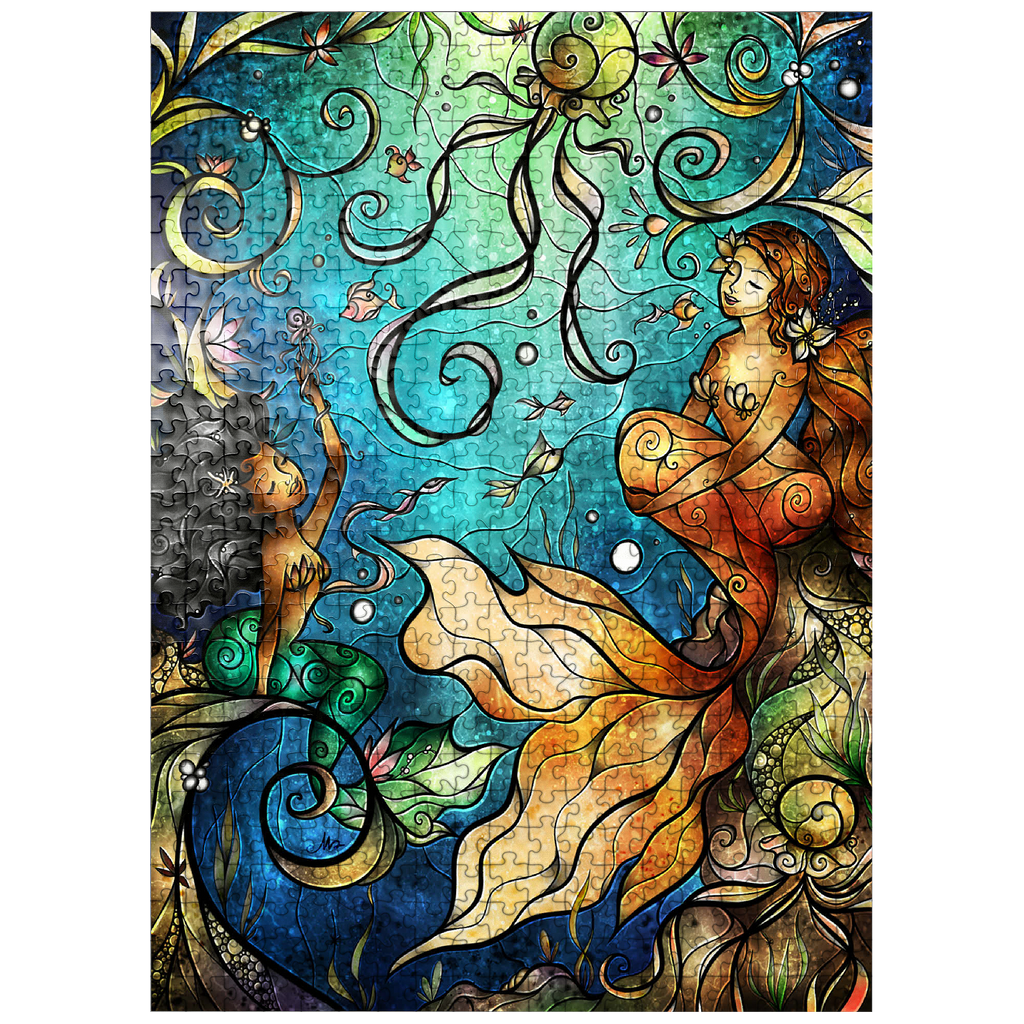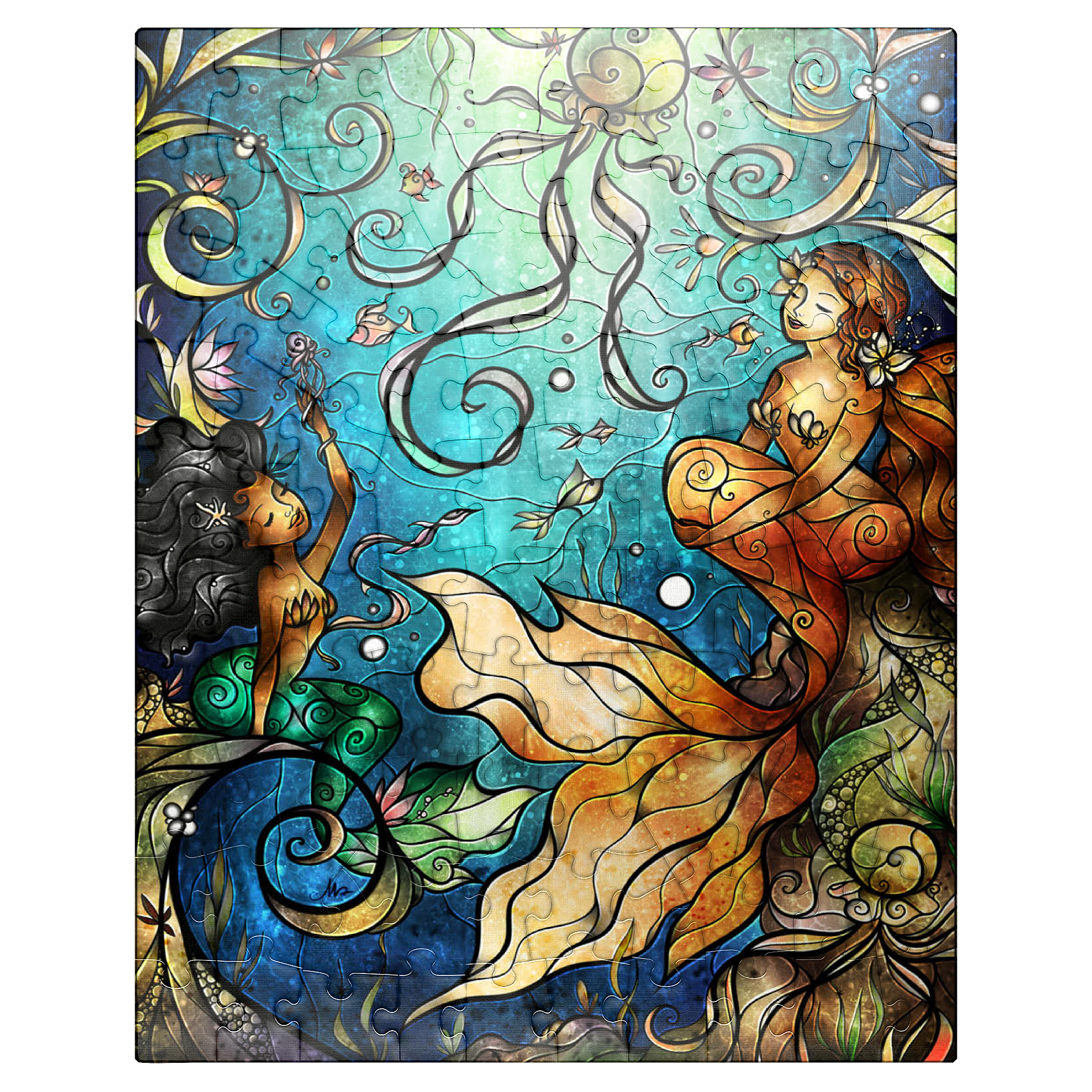 -Assemble this tranquil painting by Mandie Manzano of two mermaid friends immersed in the soothing sounds of the sea. One with flowing dark hair reaches for a delicate jellygish, while the other with warm auburn locks listens peacefully, surrounded by gentle currents, playful fish, and swaying kelp. Discover their serene underwater world.