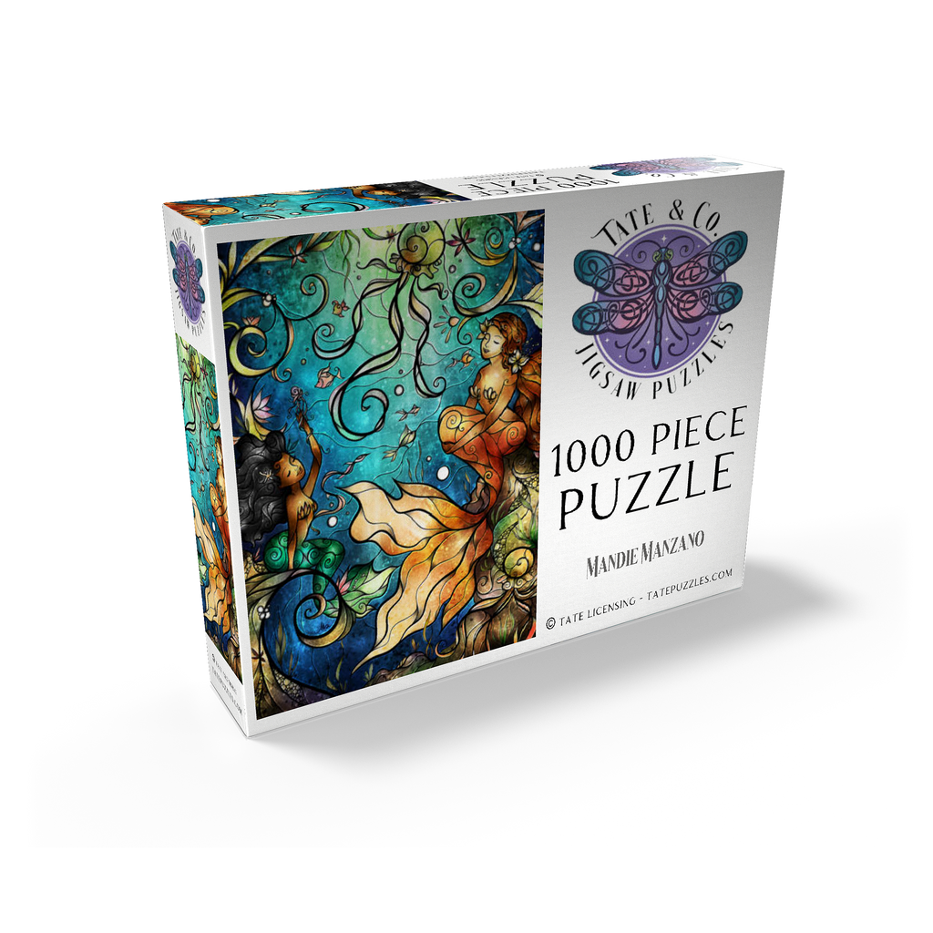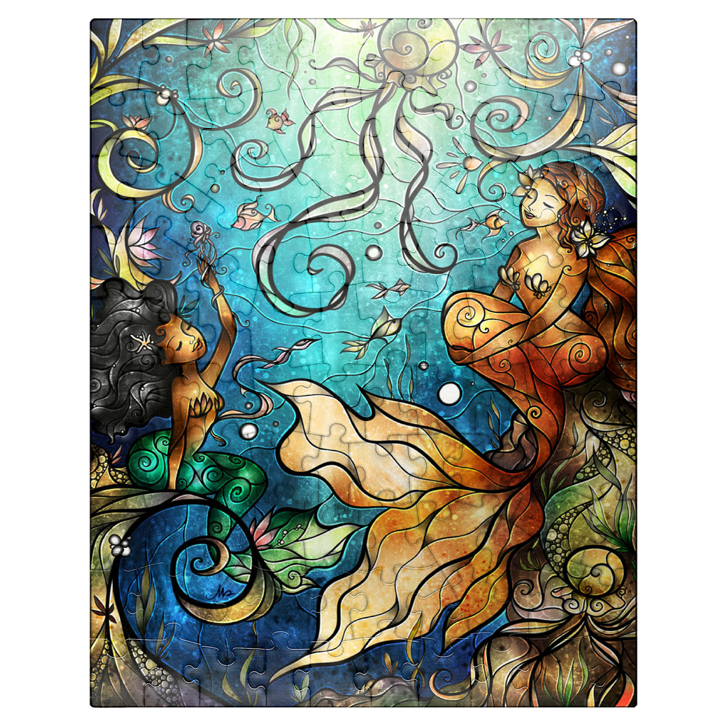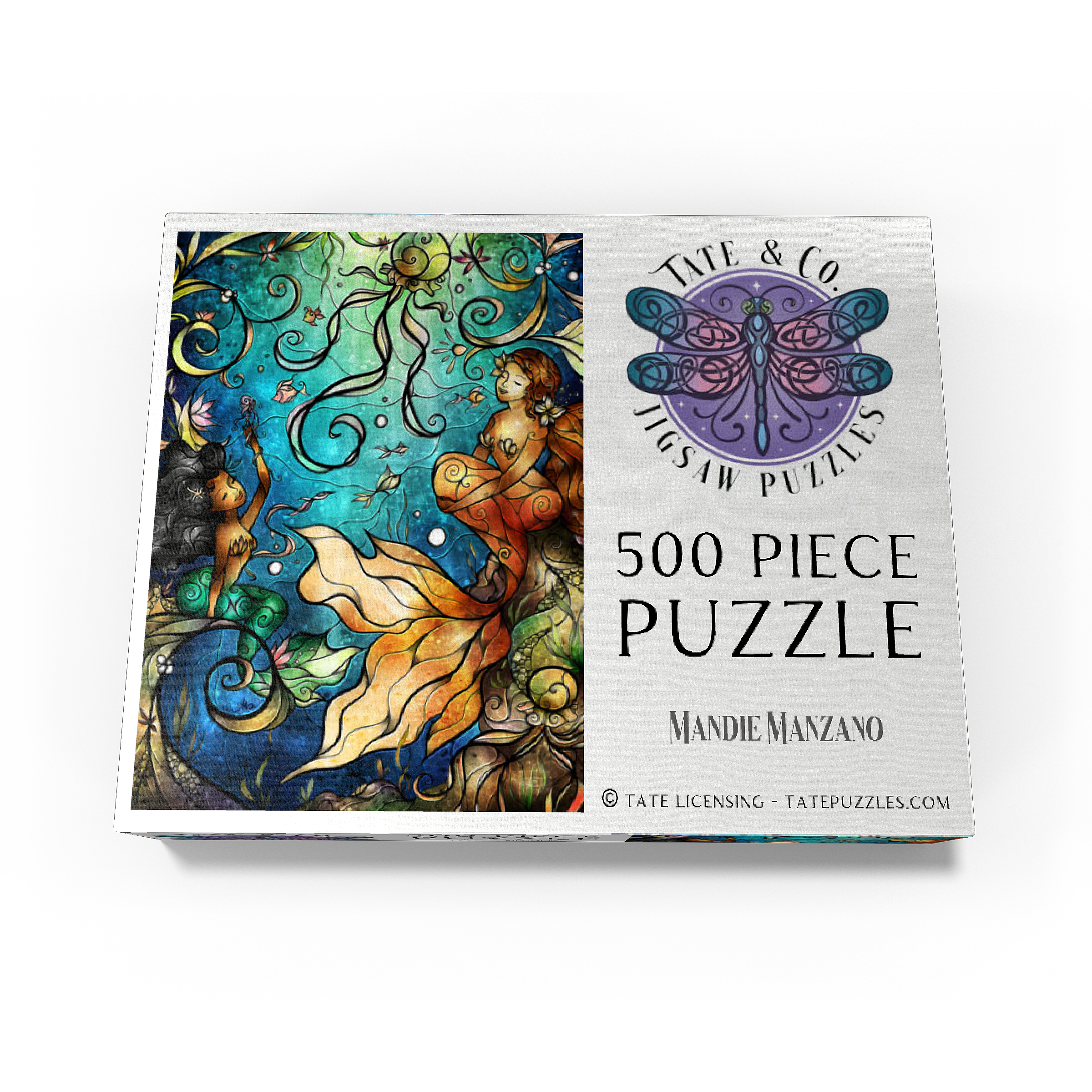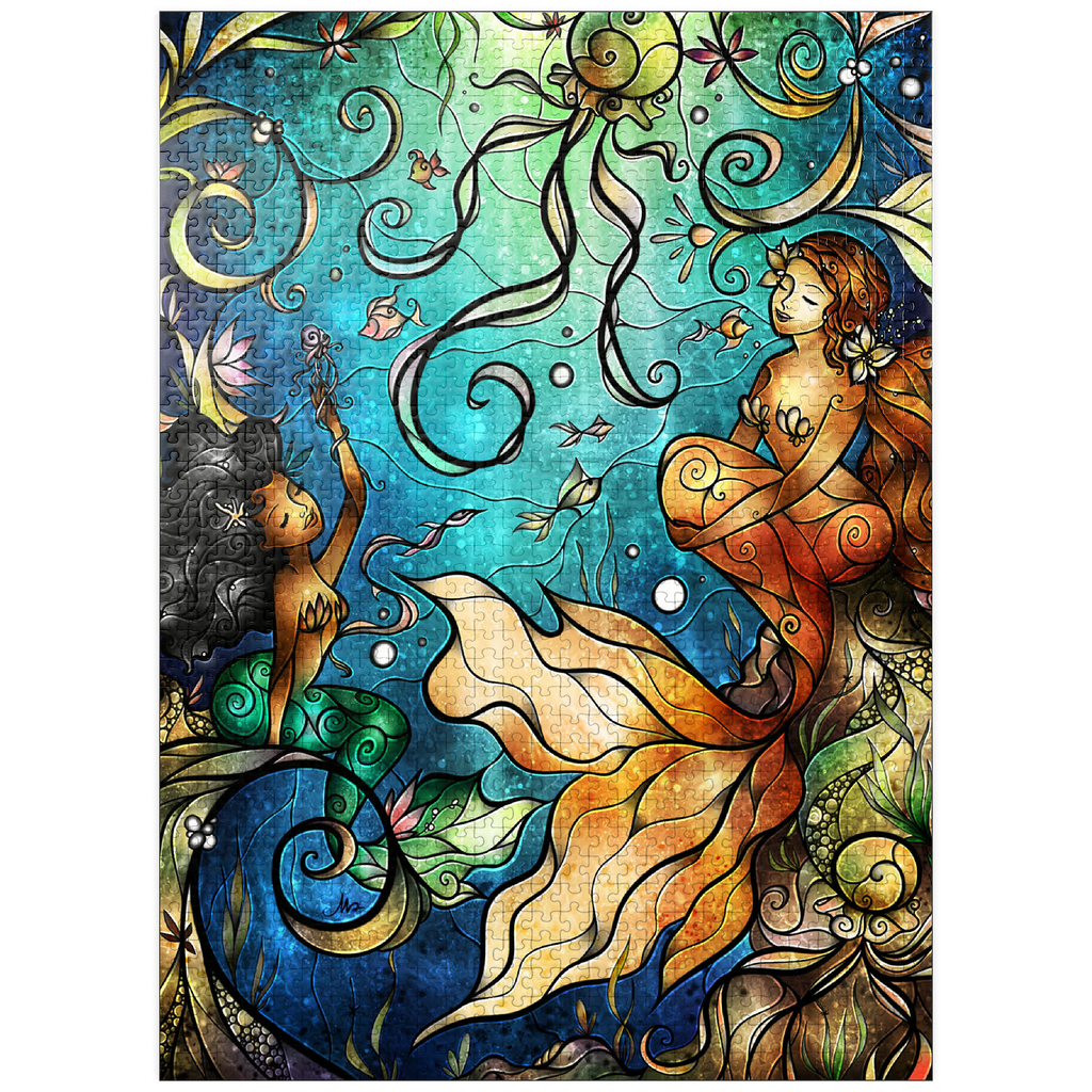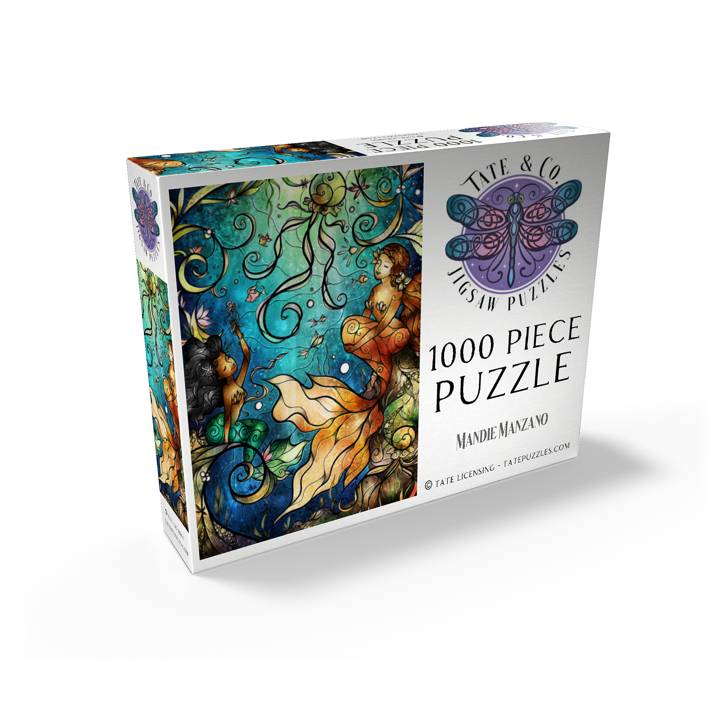 -Assemble this tranquil painting by Mandie Manzano of two mermaid friends immersed in the soothing sounds of the sea. One with flowing dark hair reaches for a delicate jellygish, while the other with warm auburn locks listens peacefully, surrounded by gentle currents, playful fish, and swaying kelp. Discover their serene underwater world.