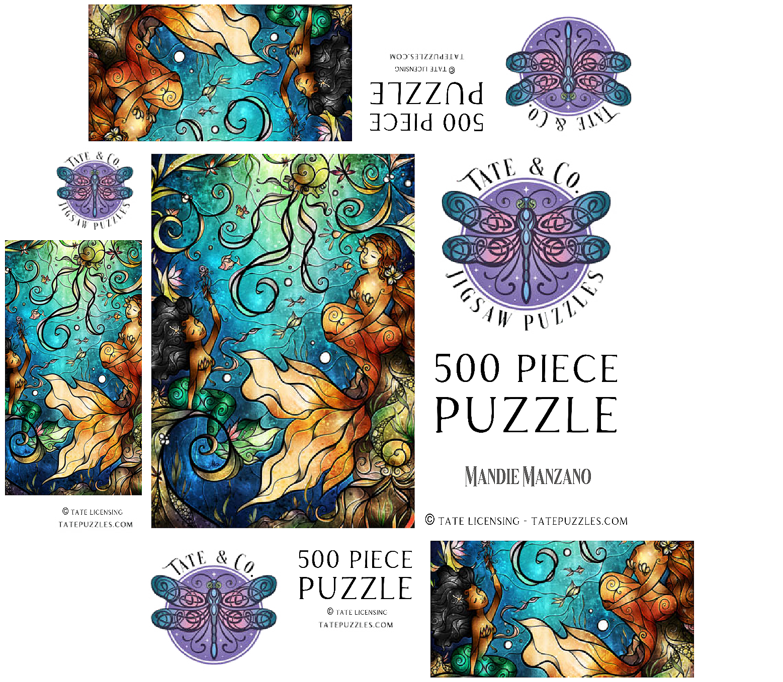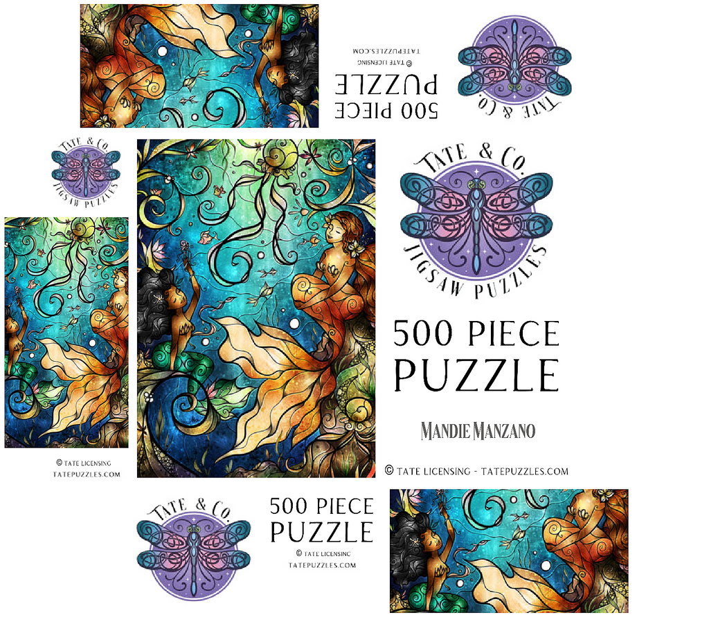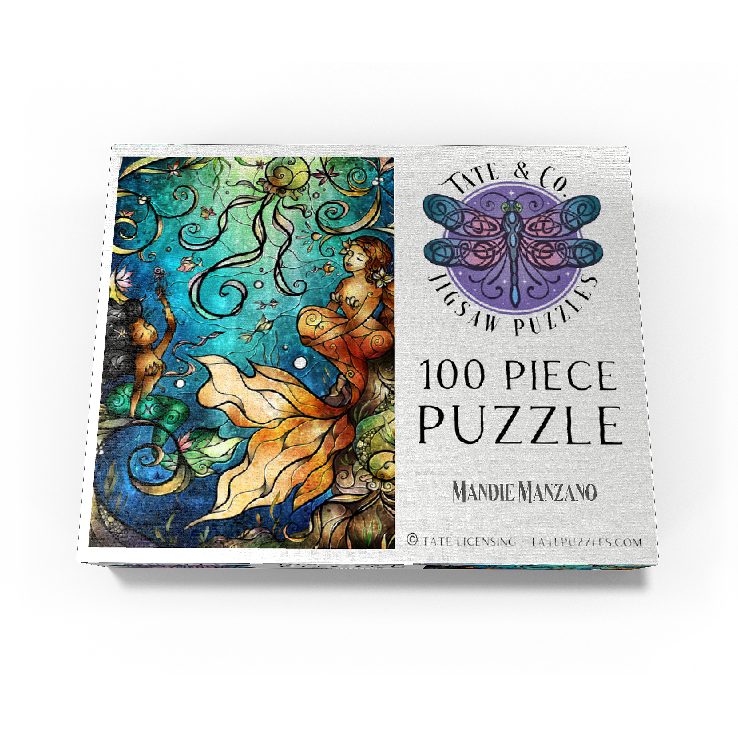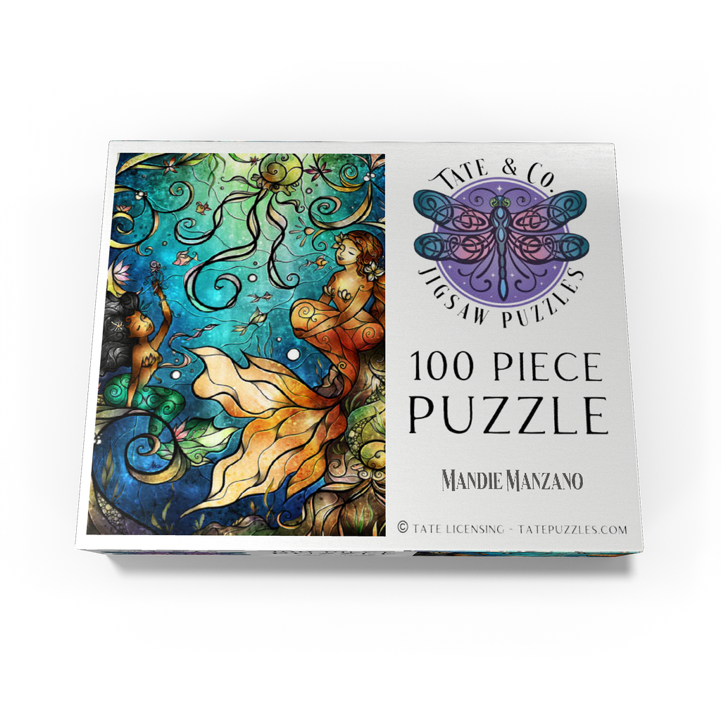 -Assemble this tranquil painting by Mandie Manzano of two mermaid friends immersed in the soothing sounds of the sea. One with flowing dark hair reaches for a delicate jellygish, while the other with warm auburn locks listens peacefully, surrounded by gentle currents, playful fish, and swaying kelp. Discover their serene underwater world.