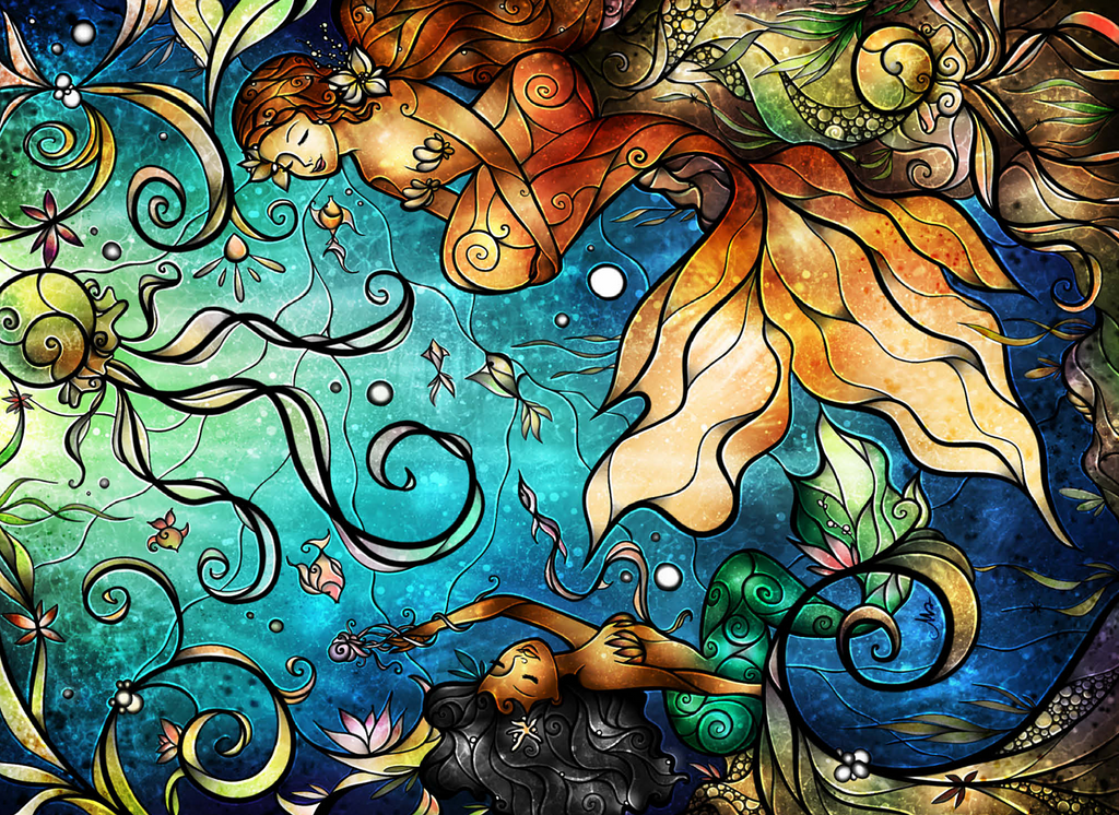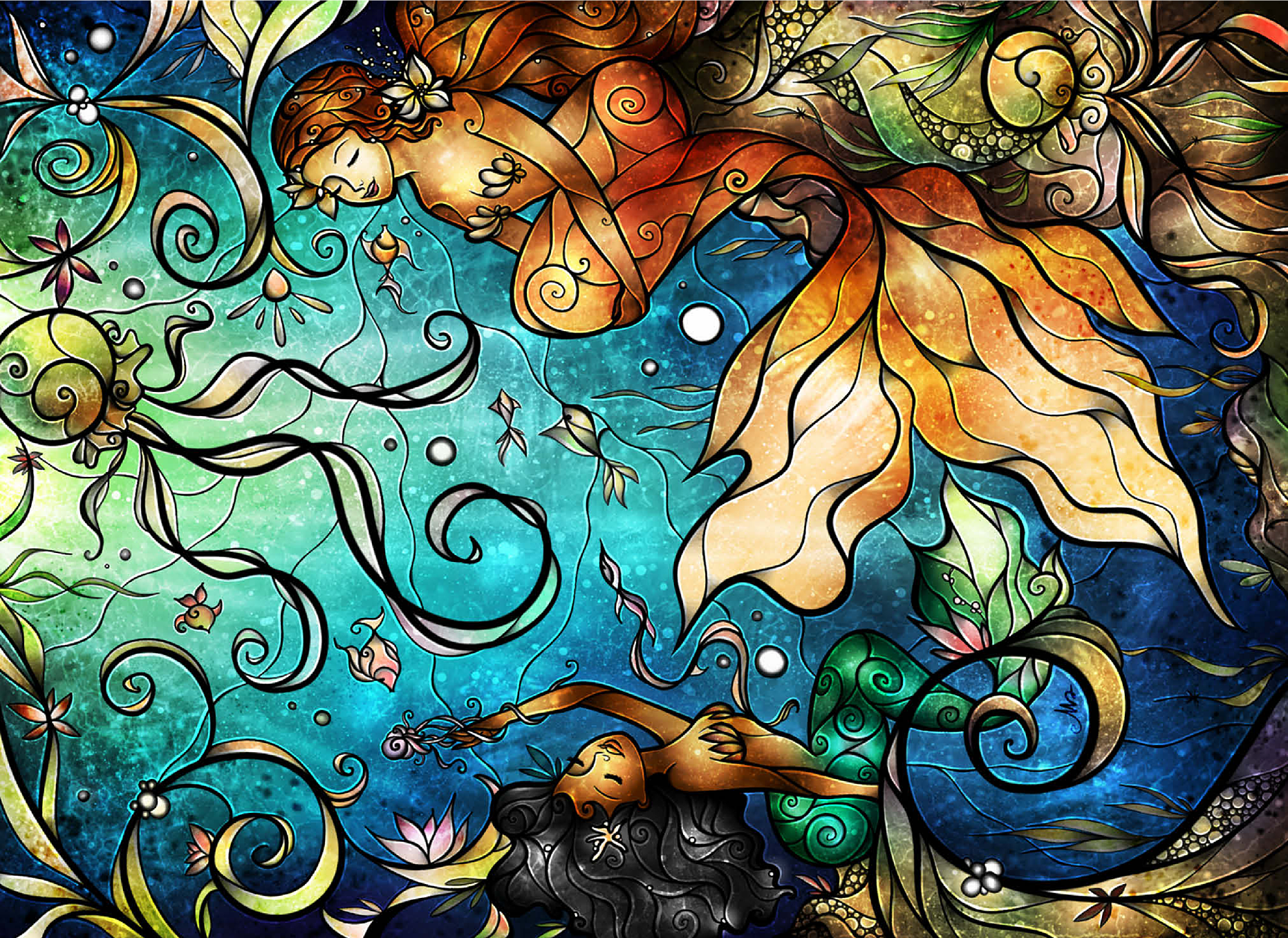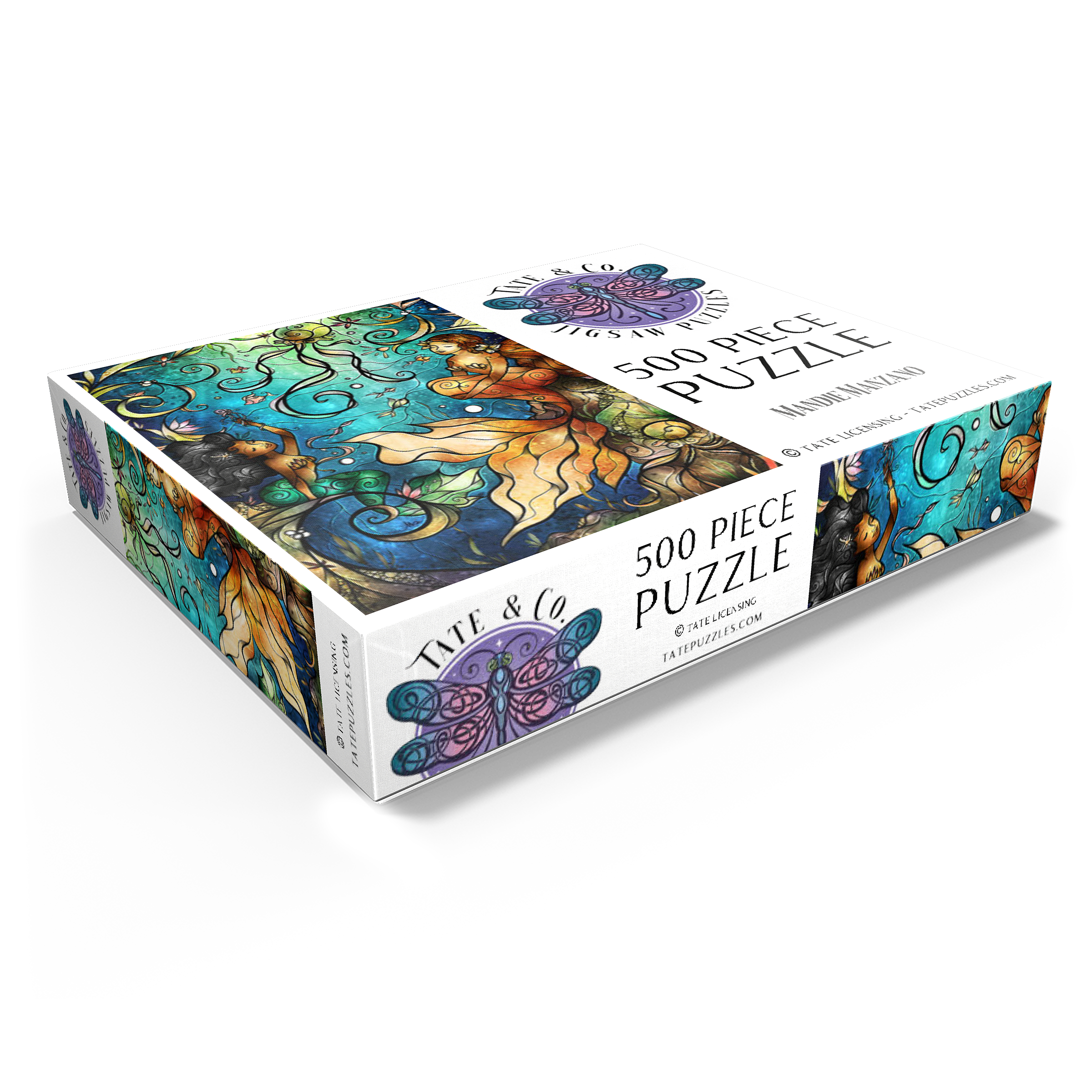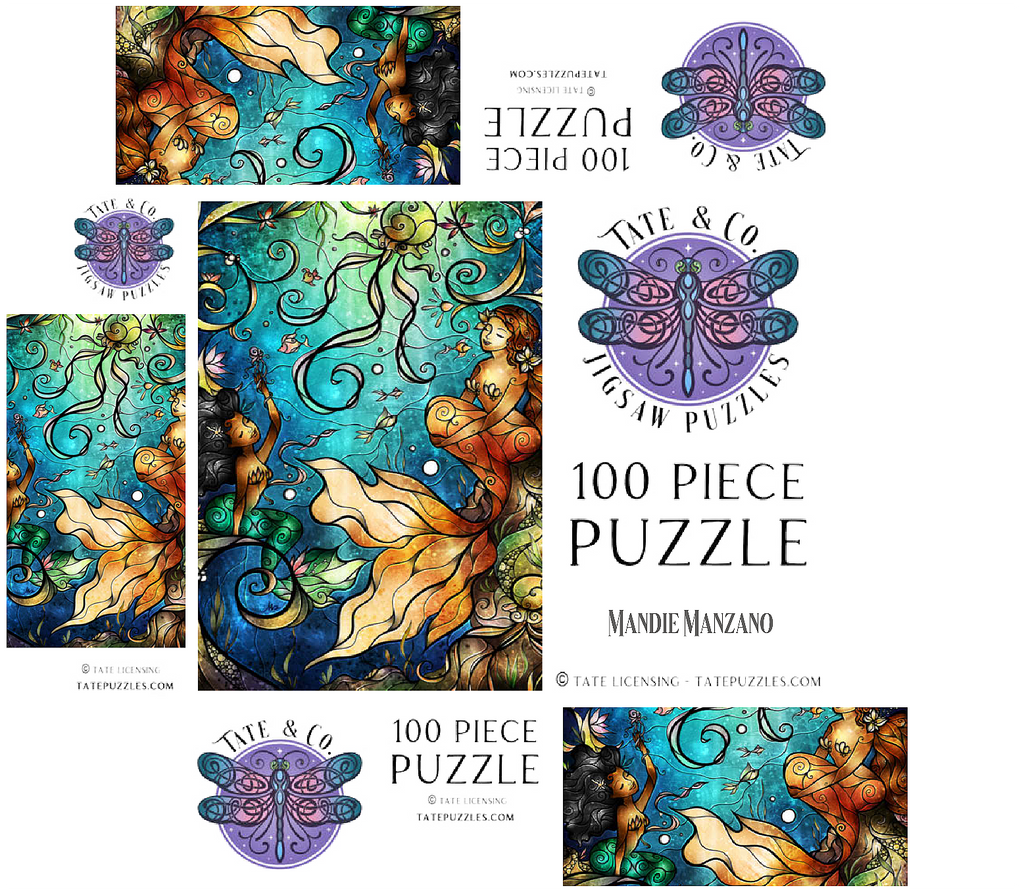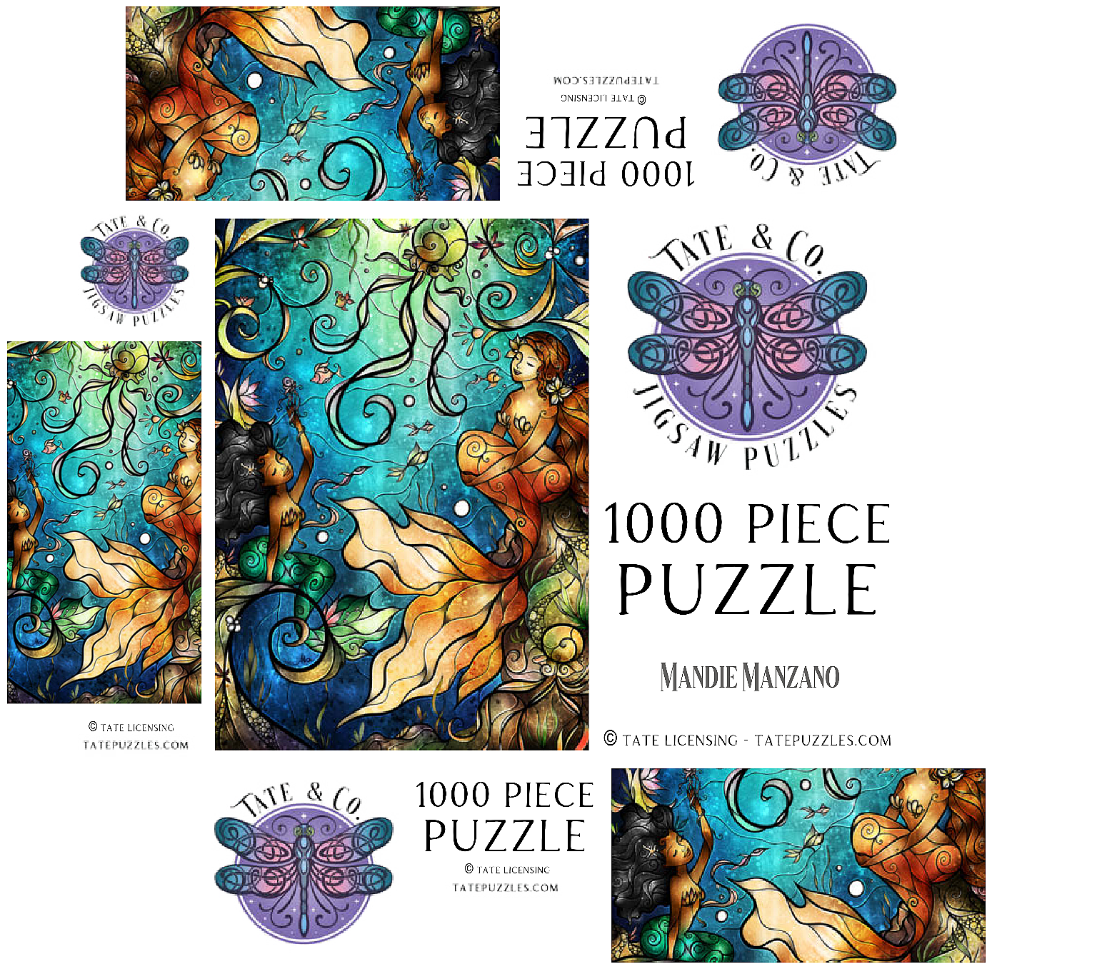 -Assemble this tranquil painting by Mandie Manzano of two mermaid friends immersed in the soothing sounds of the sea. One with flowing dark hair reaches for a delicate jellygish, while the other with warm auburn locks listens peacefully, surrounded by gentle currents, playful fish, and swaying kelp. Discover their serene underwater world.