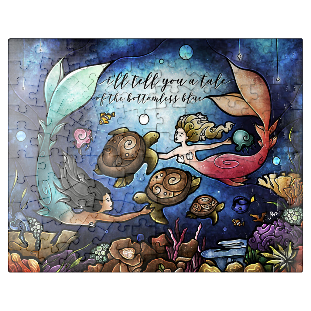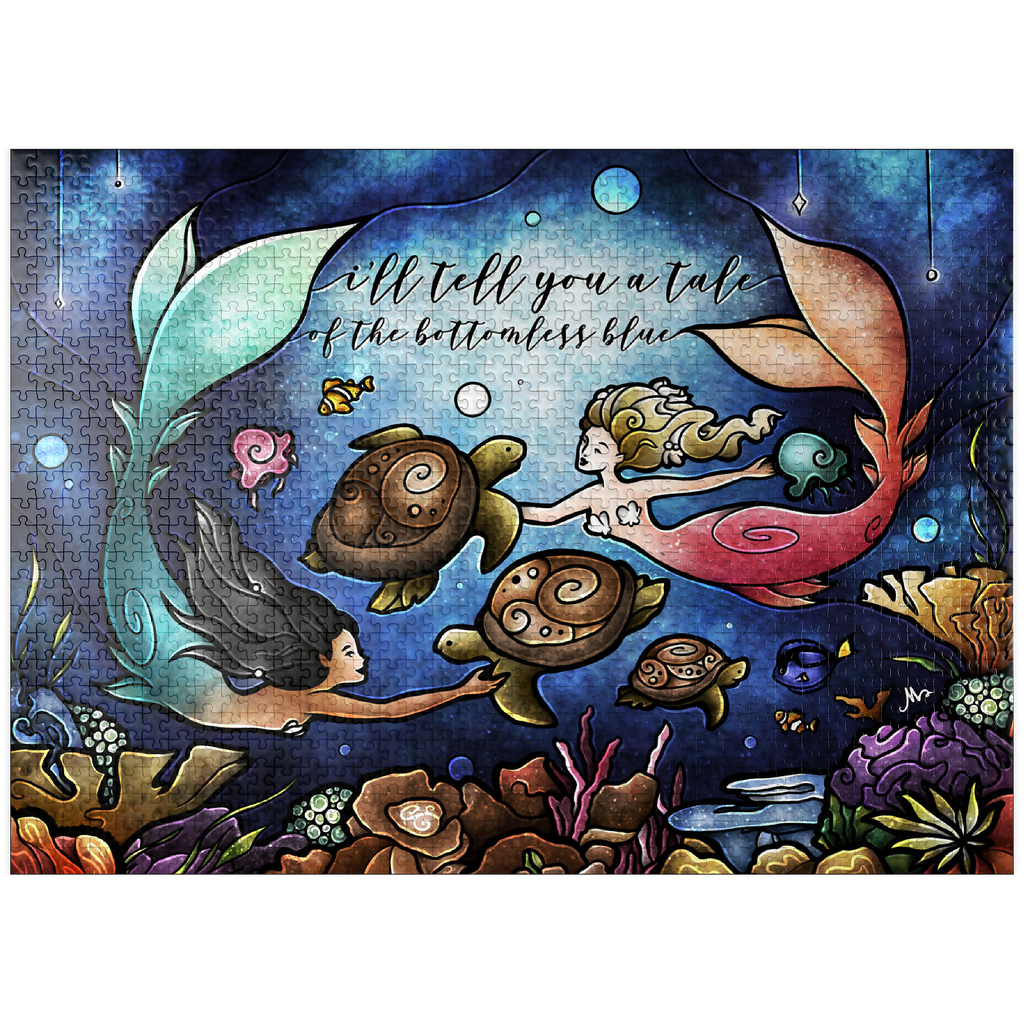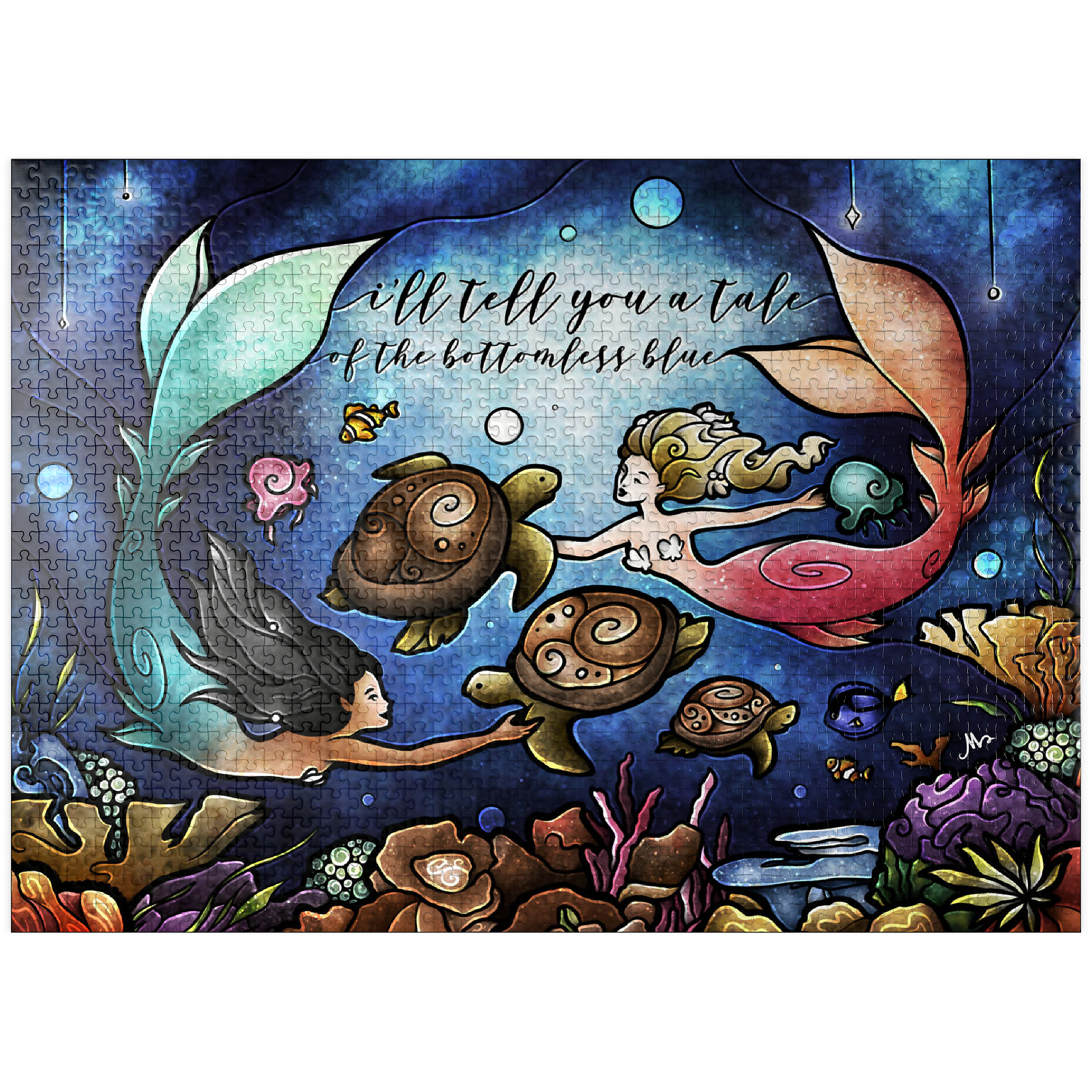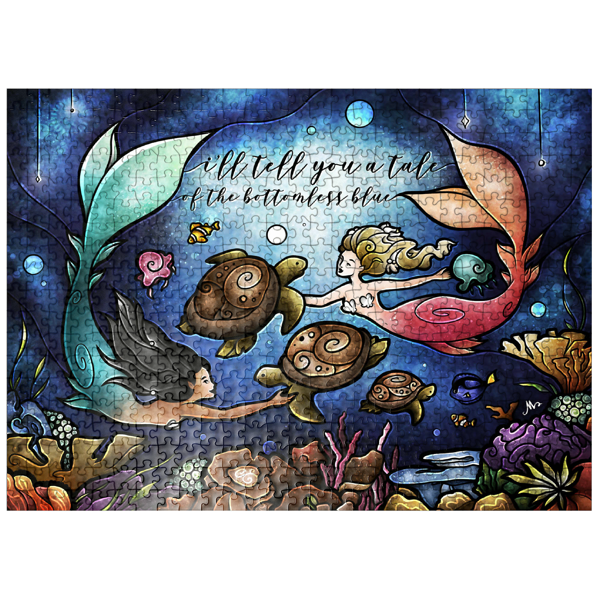 Dive into an enchanting underwater world! Two graceful mermaids, with flowing hair and vibrant tails, prepare to share a tale with their curious turtle friends amidst colorful coral and shimmering waters. Discover the secrets of the deep as you piece together this whimsical scene of friendship and storytelling beneath the waves.